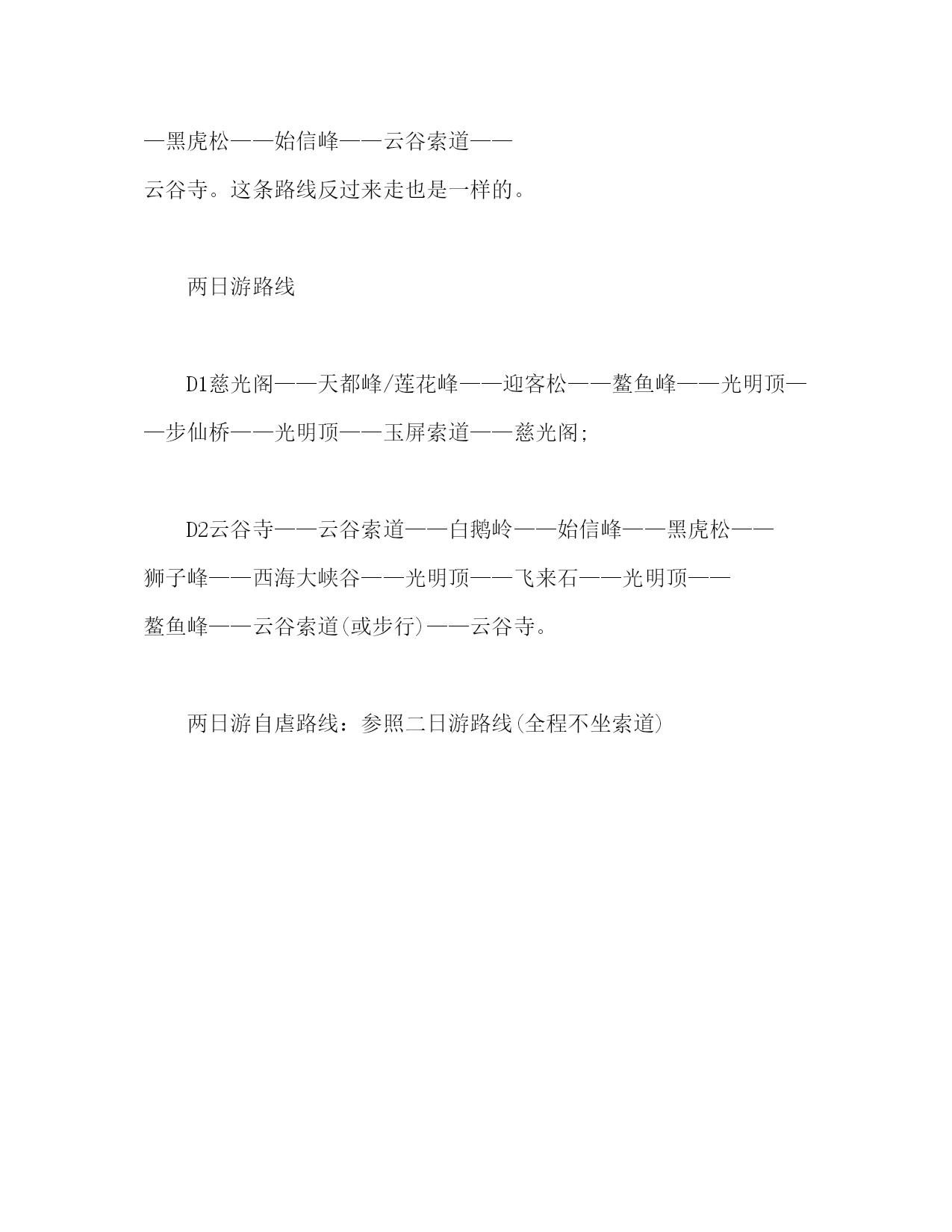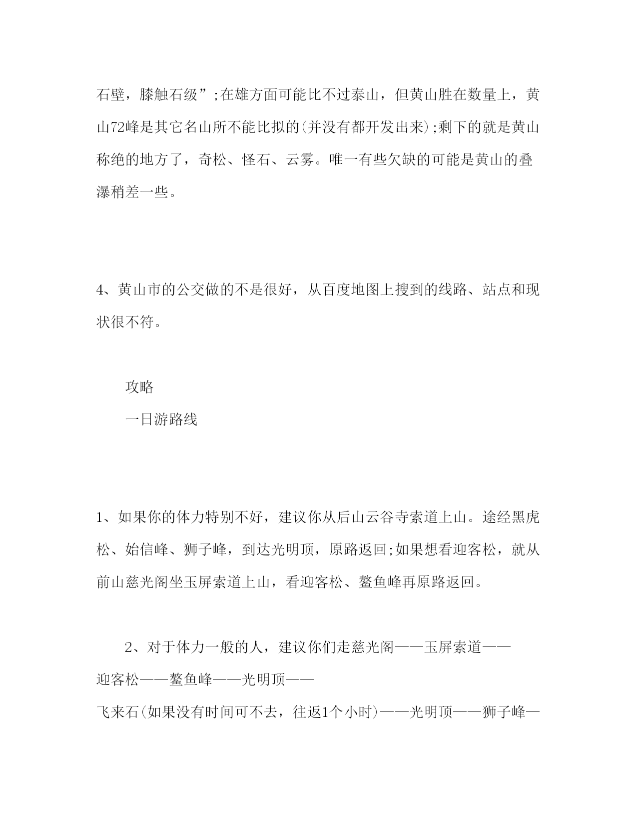 PAGE此资料由网络收集而来,如有侵权请告知上传者立即删除。资料共分享,我们负责传递知识。黄山旅游心得及攻略黄山旅游心得及攻略心得:1、秋季不要来黄山旅游,要么下雨要么大雾,基本上很难看到极致的景色。如果一定要在这个时间来,建议选择在山下住,便宜、条件也不错,在吃饭方面也很方便。在山上住的好处是可以看日出日落,在这点上不要说秋季,即使是在其它季节也是可遇而不可求的。说不定刚才还大雾漫天,一阵风过去拨云见日,刚想找个角度拍照又烟雾弥漫了。2、西海大峡谷的景色还是很不错的,虽然路有一点险。自古胜景出险滩,还是很值得一去的。步仙桥的景色也很不错。而且这2个景点是非常规路线,有时间一定要去。3、古话“五岳归来不看山,黄山归来不看岳”是有道理的。在险方面黄山不输华山,尤其是天都峰、西海大峡谷这两段路,真的是“脸贴石壁,膝触石级”;在雄方面可能比不过泰山,但黄山胜在数量上,黄山72峰是其它名山所不能比拟的(并没有都开发出来);剩下的就是黄山称绝的地方了,奇松、怪石、云雾。唯一有些欠缺的可能是黄山的叠瀑稍差一些。4、黄山市的公交做的不是很好,从百度地图上搜到的线路、站点和现状很不符。攻略一日游路线1、如果你的体力特别不好,建议你从后山云谷寺索道上山。途经黑虎松、始信峰、狮子峰,到达光明顶,原路返回;如果想看迎客松,就从前山慈光阁坐玉屏索道上山,看迎客松、鳌鱼峰再原路返回。2、对于体力一般的人,建议你们走慈光阁——玉屏索道——迎客松——鳌鱼峰——光明顶——飞来石(如果没有时间可不去,往返1个小时)——光明顶——狮子峰——黑虎松——始信峰——云谷索道——云谷寺。这条路线反过来走也是一样的。两日游路线D1慈光阁——天都峰/莲花峰——迎客松——鳌鱼峰——光明顶——步仙桥——光明顶——玉屏索道——慈光阁;D2云谷寺——云谷索道——白鹅岭——始信峰——黑虎松——狮子峰——西海大峡谷——光明顶——飞来石——光明顶——鳌鱼峰——云谷索道(或步行)——云谷寺。两日游自虐路线:参照二日游路线(全程不坐索道)