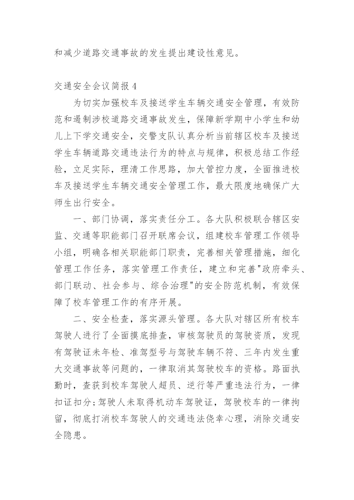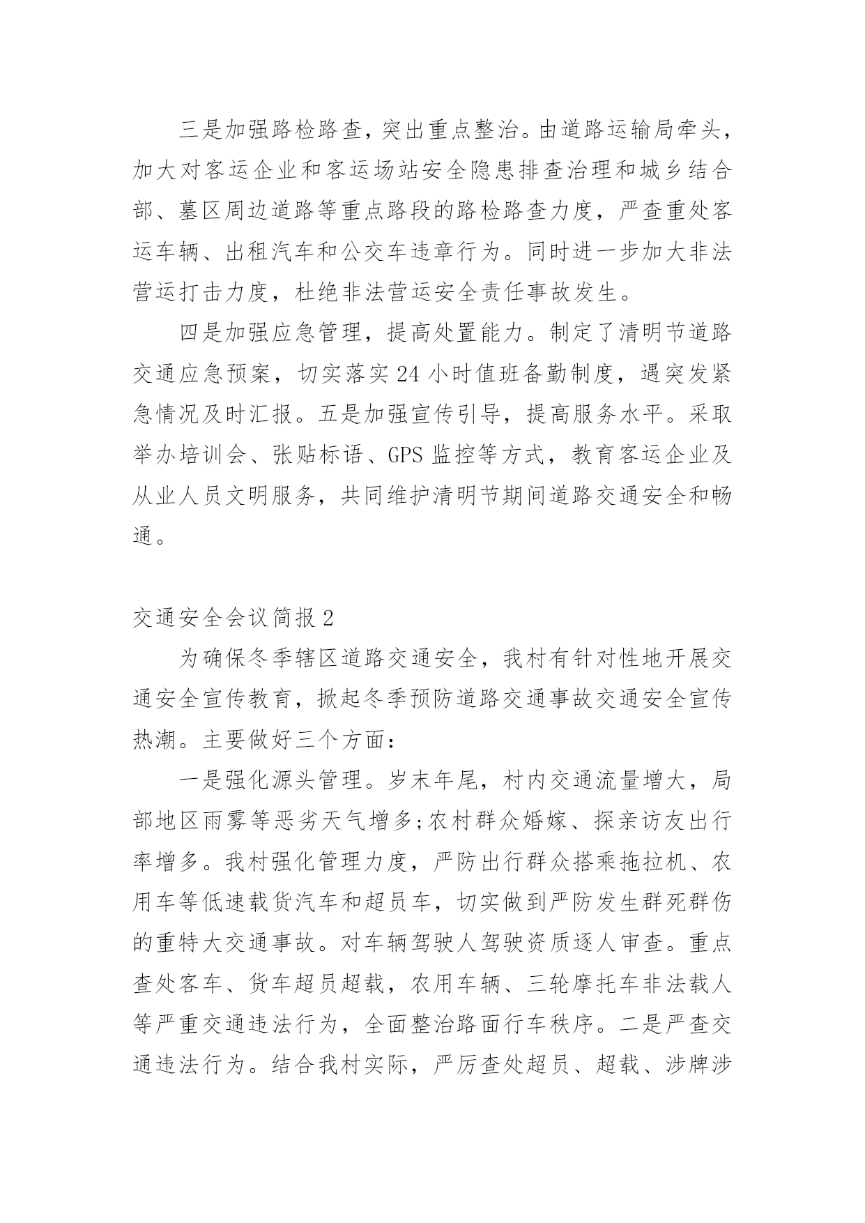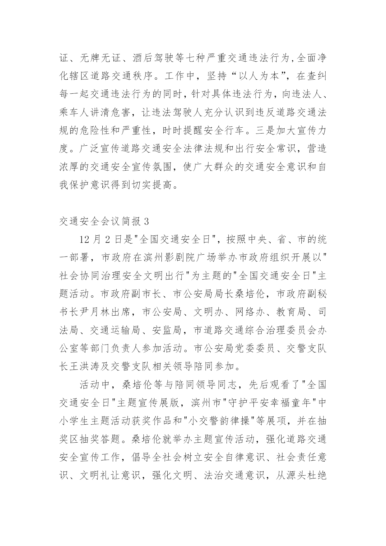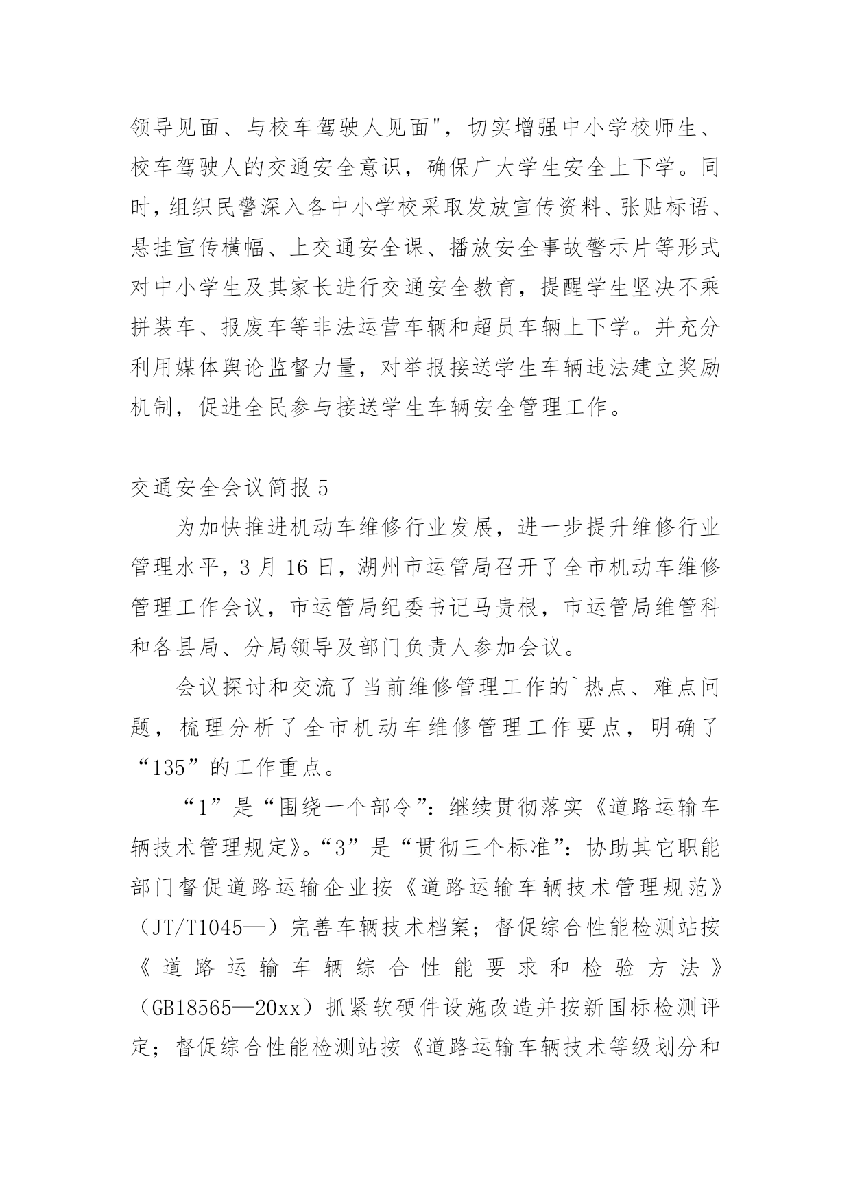 交通安全会议简报在我们平凡的日常里,我们可以接触到简报的地方越来越多,简报不是一种刊物。因为有些简报可装订成一本,像一般“刊物”,更多的是只有一两张纸,几个版面,像一份报纸。还苦于找不到好的简报?下面是小编收集整理的交通安全会议简报,欢迎大家分享。交通安全会议简报1为做好清明节期间道路交通管理工作,严防重特大交通事故发生,织金县交通运输局提前部署清明节期间道路交通安全工作,全力为清明期间群众出行创造安全畅通的交通环境。一是科学分析研判,提早组织部署。针对今年清明假期时间短,群众祭扫、旅游踏青出行集中,特别是4月4日将出现集中出行高峰,县交通运输局科学分析研判,认真总结往年清明期间辖区道路交通流量变化趋势,结合今年可能出现的新情况、新特点,坚决克服麻痹大意思想,提前研判形势,提早组织部署,制定了20xx年清明期间道路交通安全工作方案。二是强化农村公路隐患排查治理,确保农村公路畅通。由农村公路管理所牵头,对全县县乡公路安全隐患进行排查治理,因资金等问题不能及时治理的,设置警示标牌,确保县乡公路安全畅通。三是加强路检路查,突出重点整治。由道路运输局牵头,加大对客运企业和客运场站安全隐患排查治理和城乡结合部、墓区周边道路等重点路段的路检路查力度,严查重处客运车辆、出租汽车和公交车违章行为。同时进一步加大非法营运打击力度,杜绝非法营运安全责任事故发生。四是加强应急管理,提高处置能力。制定了清明节道路交通应急预案,切实落实24小时值班备勤制度,遇突发紧急情况及时汇报。五是加强宣传引导,提高服务水平。采取举办培训会、张贴标语、GPS监控等方式,教育客运企业及从业人员文明服务,共同维护清明节期间道路交通安全和畅通。交通安全会议简报2为确保冬季辖区道路交通安全,我村有针对性地开展交通安全宣传教育,掀起冬季预防道路交通事故交通安全宣传热潮。主要做好三个方面:一是强化源头管理。岁末年尾,村内交通流量增大,局部地区雨雾等恶劣天气增多;农村群众婚嫁、探亲访友出行率增多。我村强化管理力度,严防出行群众搭乘拖拉机、农用车等低速载货汽车和超员车,切实做到严防发生群死群伤的重特大交通事故。对车辆驾驶人驾驶资质逐人审查。重点查处客车、货车超员超载,农用车辆、三轮摩托车非法载人等严重交通违法行为,全面整治路面行车秩序。二是严查交通违法行为。结合我村实际,严厉查处超员、超载、涉牌涉证、无牌无证、酒后驾驶等七种严重交通违法行为,全面净化辖区道路交通秩序。工作中,坚持“以人为本”,在查纠每一起交通违法行为的同时,针对具体违法行为,向违法人、乘车人讲清危害,让违法驾驶人充分认识到违反道路交通法规的危险性和严重性,时时提醒安全行车。三是加大宣传力度。广泛宣传道路交通安全法律法规和出行安全常识,营造浓厚的交通安全宣传氛围,使广大群众的交通安全意识和自我保护意识得到切实提高。交通安全会议简报312月2日是"全国交通安全日",按照中央、省、市的统一部署,市政府在滨州影剧院广场举办市政府组织开展以"社会协同治理安全文明出行"为主题的"全国交通安全日"主题活动。市政府副市长、市公安局局长桑培伦,市政府副秘书长尹月林出席,市公安局、文明办、网络办、教育局、司法局、交通运输局、安监局,市道路交通综合治理委员会办公室等部门负责人参加活动。市公安局党委委员、交警支队长王洪涛及交警支队相关领导陪同参加。活动中,桑培伦等与陪同领导同志,先后观看了"全国交通安全日"主题宣传展版,滨州市"守护平安幸福童年"中小学生主题活动获奖作品和"小交警韵律操"等展项,并在抽奖区抽奖答题。桑培伦就举办主题宣传活动,强化道路交通安全宣传工作,倡导全社会树立安全自律意识、社会责任意识、文明礼让意识,强化文明、法治交通意识,从源头杜绝和减少道路交通事故的发生提出建设性意见。交通安全会议简报4为切实加强校车及接送学生车辆交通安全管理,有效防范和遏制涉校道路交通事故发生,保障新学期中小学生和幼儿上下学交通安全,交警支队认真分析当前辖区校车及接送学生车辆道路交通违法行为的特点与规律,积极总结工作经验,立足实际,理清工作思路,加大管控力度,全面推进校车及接送学生车辆交通安全管理工作,最大限度地确保广大师生出行安全。一、部门协调,落实责任分工。各大队积极联合辖区安监、交通等职能部门召开联席会议,组建校车管理工作领导小组,明确各相关职能部门职责,完善相关管理措施,细化管理工作任务,落实管理工作责任,建立和完善"政府牵头、部门联动、社会参与、综合治理"的安全防范机制,有效保障了校车管理工作的有序开展。二、安全检查,落实源头管理。各大队对辖区所有校车驾驶人进行了全面摸底排查,审核驾驶员的驾驶资质,发现有驾驶证未年检、准驾型号与驾驶车辆不符、三年内发生重大交通事故等问题的,一律取消其驾驶校车的资格。路面执勤时,查获到校车驾驶人超员、