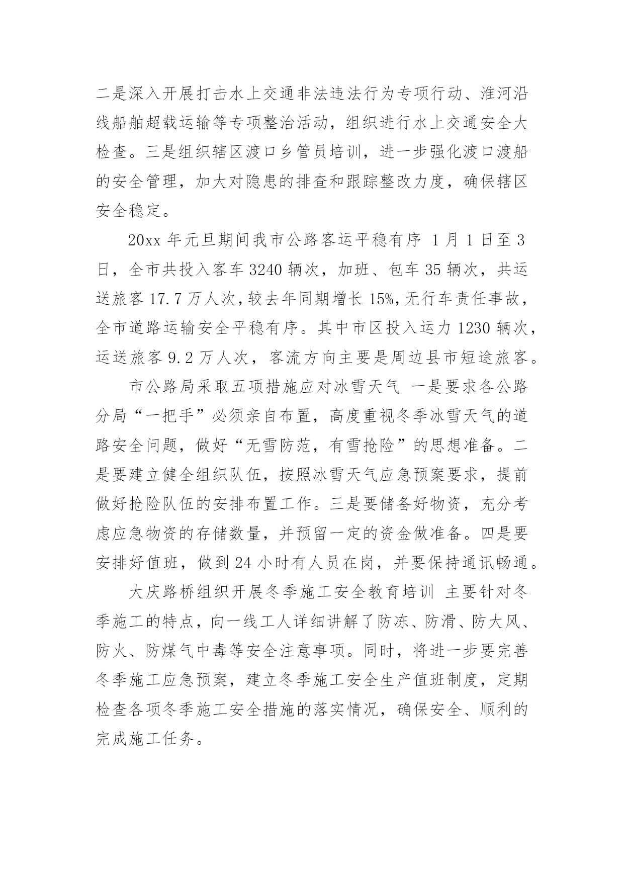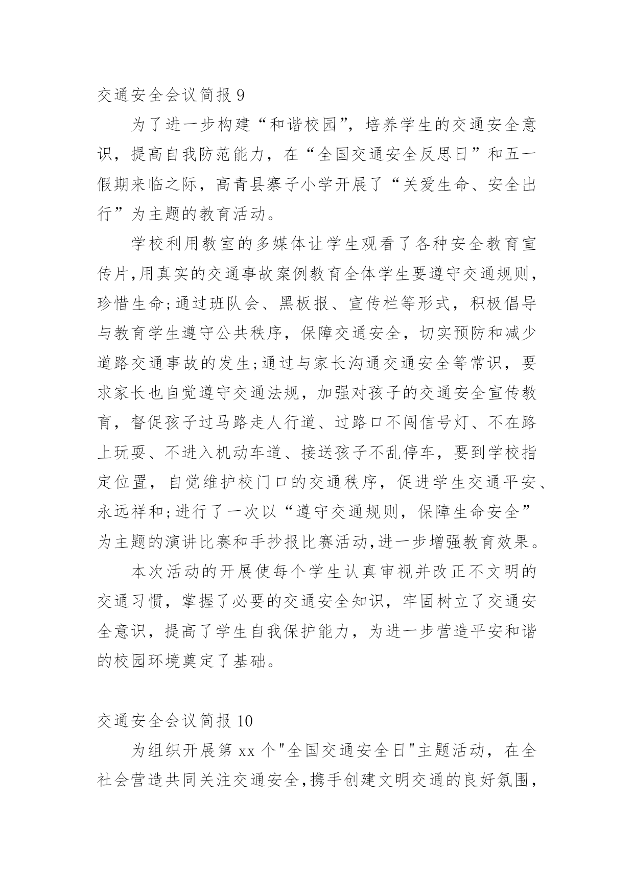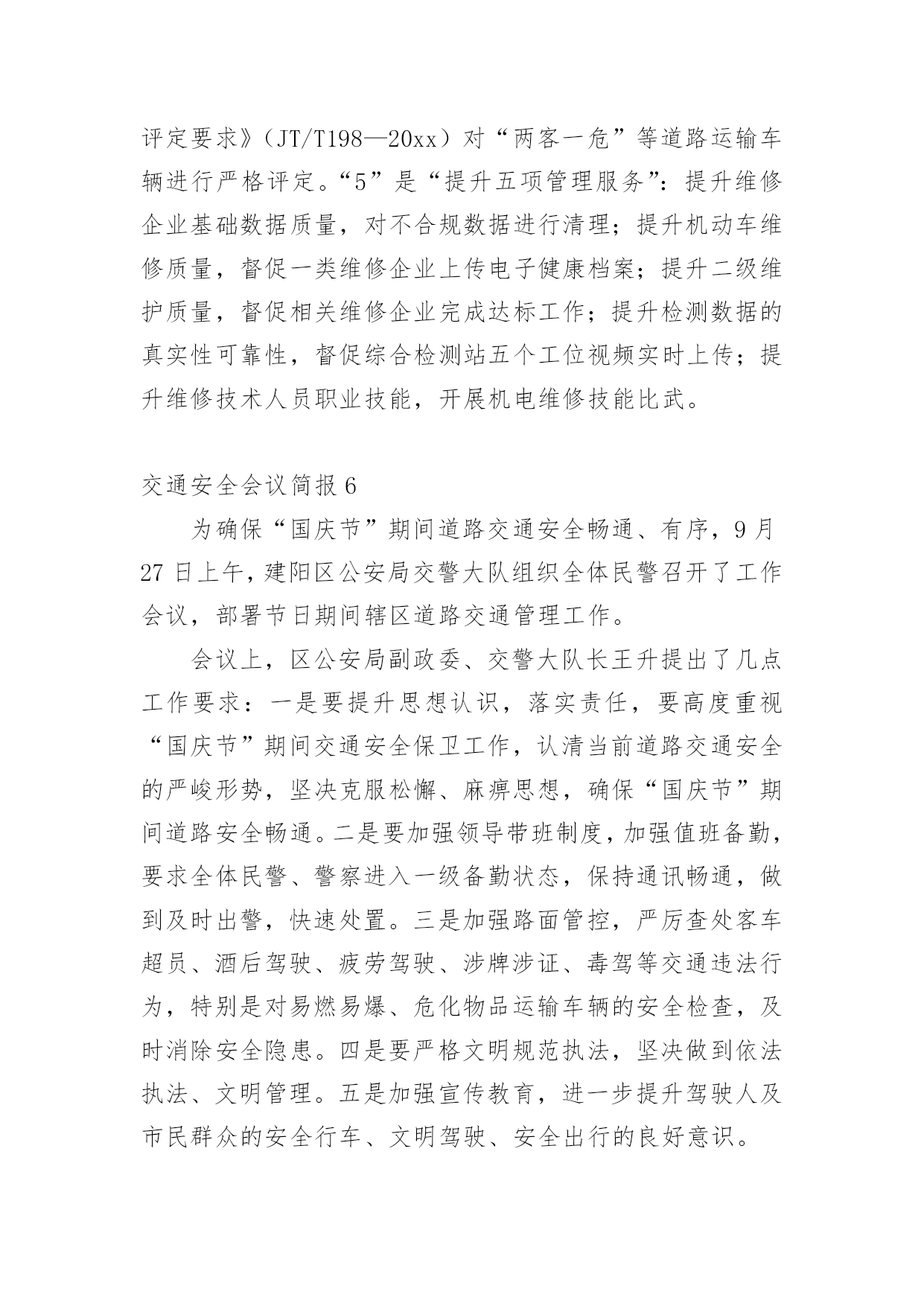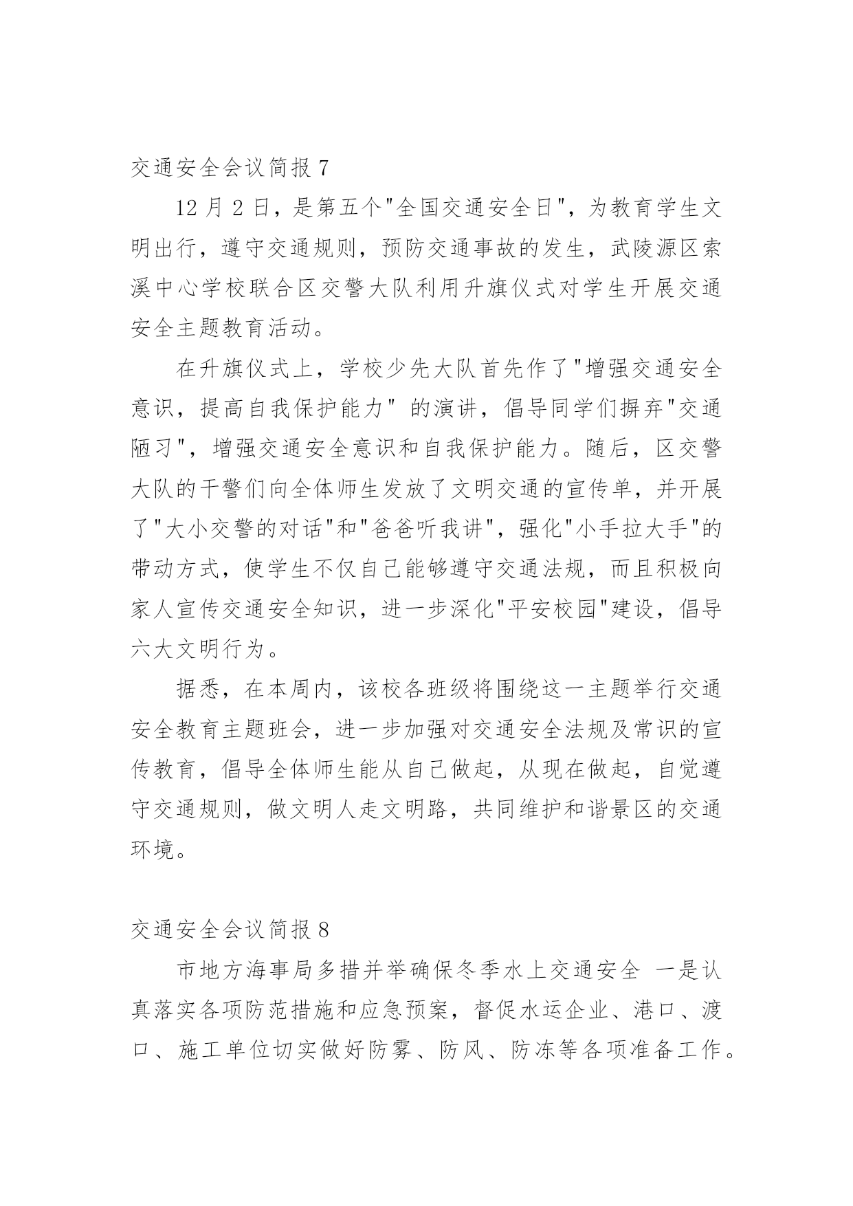 交通安全会议简报在我们平凡的日常里,我们可以接触到简报的地方越来越多,简报不是一种刊物。因为有些简报可装订成一本,像一般“刊物”,更多的是只有一两张纸,几个版面,像一份报纸。还苦于找不到好的简报?下面是小编收集整理的交通安全会议简报,欢迎大家分享。交通安全会议简报1为做好清明节期间道路交通管理工作,严防重特大交通事故发生,织金县交通运输局提前部署清明节期间道路交通安全工作,全力为清明期间群众出行创造安全畅通的交通环境。一是科学分析研判,提早组织部署。针对今年清明假期时间短,群众祭扫、旅游踏青出行集中,特别是4月4日将出现集中出行高峰,县交通运输局科学分析研判,认真总结往年清明期间辖区道路交通流量变化趋势,结合今年可能出现的新情况、新特点,坚决克服麻痹大意思想,提前研判形势,提早组织部署,制定了20xx年清明期间道路交通安全工作方案。二是强化农村公路隐患排查治理,确保农村公路畅通。由农村公路管理所牵头,对全县县乡公路安全隐患进行排查治理,因资金等问题不能及时治理的,设置警示标牌,确保县乡公路安全畅通。三是加强路检路查,突出重点整治。由道路运输局牵头,加大对客运企业和客运场站安全隐患排查治理和城乡结合部、墓区周边道路等重点路段的路检路查力度,严查重处客运车辆、出租汽车和公交车违章行为。同时进一步加大非法营运打击力度,杜绝非法营运安全责任事故发生。四是加强应急管理,提高处置能力。制定了清明节道路交通应急预案,切实落实24小时值班备勤制度,遇突发紧急情况及时汇报。五是加强宣传引导,提高服务水平。采取举办培训会、张贴标语、GPS监控等方式,教育客运企业及从业人员文明服务,共同维护清明节期间道路交通安全和畅通。交通安全会议简报2为确保冬季辖区道路交通安全,我村有针对性地开展交通安全宣传教育,掀起冬季预防道路交通事故交通安全宣传热潮。主要做好三个方面:一是强化源头管理。岁末年尾,村内交通流量增大,局部地区雨雾等恶劣天气增多;农村群众婚嫁、探亲访友出行率增多。我村强化管理力度,严防出行群众搭乘拖拉机、农用车等低速载货汽车和超员车,切实做到严防发生群死群伤的重特大交通事故。对车辆驾驶人驾驶资质逐人审查。重点查处客车、货车超员超载,农用车辆、三轮摩托车非法载人等严重交通违法行为,全面整治路面行车秩序。二是严查交通违法行为。结合我村实际,严厉查处超员、超载、涉牌涉证、无牌无证、酒后驾驶等七种严重交通违法行为,全面净化辖区道路交通秩序。工作中,坚持“以人为本”,在查纠每一起交通违法行为的同时,针对具体违法行为,向违法人、乘车人讲清危害,让违法驾驶人充分认识到违反道路交通法规的危险性和严重性,时时提醒安全行车。三是加大宣传力度。广泛宣传道路交通安全法律法规和出行安全常识,营造浓厚的交通安全宣传氛围,使广大群众的交通安全意识和自我保护意识得到切实提高。交通安全会议简报312月2日是"全国交通安全日",按照中央、省、市的统一部署,市政府在滨州影剧院广场举办市政府组织开展以"社会协同治理安全文明出行"为主题的"全国交通安全日"主题活动。市政府副市长、市公安局局长桑培伦,市政府副秘书长尹月林出席,市公安局、文明办、网络办、教育局、司法局、交通运输局、安监局,市道路交通综合治理委员会办公室等部门负责人参加活动。市公安局党委委员、交警支队长王洪涛及交警支队相关领导陪同参加。活动中,桑培伦等与陪同领导同志,先后观看了"全国交通安全日"主题宣传展版,滨州市"守护平安幸福童年"中小学生主题活动获奖作品和"小交警韵律操"等展项,并在抽奖区抽奖答题。桑培伦就举办主题宣传活动,强化道路交通安全宣传工作,倡导全社会树立安全自律意识、社会责任意识、文明礼让意识,强化文明、法治交通意识,从源头杜绝和减少道路交通事故的发生提出建设性意见。交通安全会议简报4为切实加强校车及接送学生车辆交通安全管理,有效防范和遏制涉校道路交通事故发生,保障新学期中小学生和幼儿上下学交通安全,交警支队认真分析当前辖区校车及接送学生车辆道路交通违法行为的特点与规律,积极总结工作经验,立足实际,理清工作思路,加大管控力度,全面推进校车及接送学生车辆交通安全管理工作,最大限度地确保广大师生出行安全。一、部门协调,落实责任分工。各大队积极联合辖区安监、交通等职能部门召开联席会议,组建校车管理工作领导小组,明确各相关职能部门职责,完善相关管理措施,细化管理工作任务,落实管理工作责任,建立和完善"政府牵头、部门联动、社会参与、综合治理"的安全防范机制,有效保障了校车管理工作的有序开展。二、安全检查,落实源头管理。各大队对辖区所有校车驾驶人进行了全面摸底排查,审核驾驶员的驾驶资质,发现有驾驶证未年检、准驾型号与驾驶车辆不符、三年内发生重大交通事故等问题的,一律取消其驾驶校车的资格。路面执勤时,查获到校车驾驶人超员、