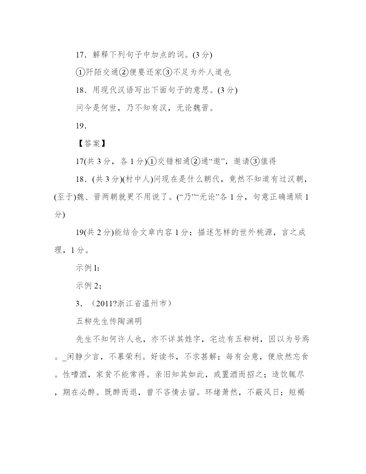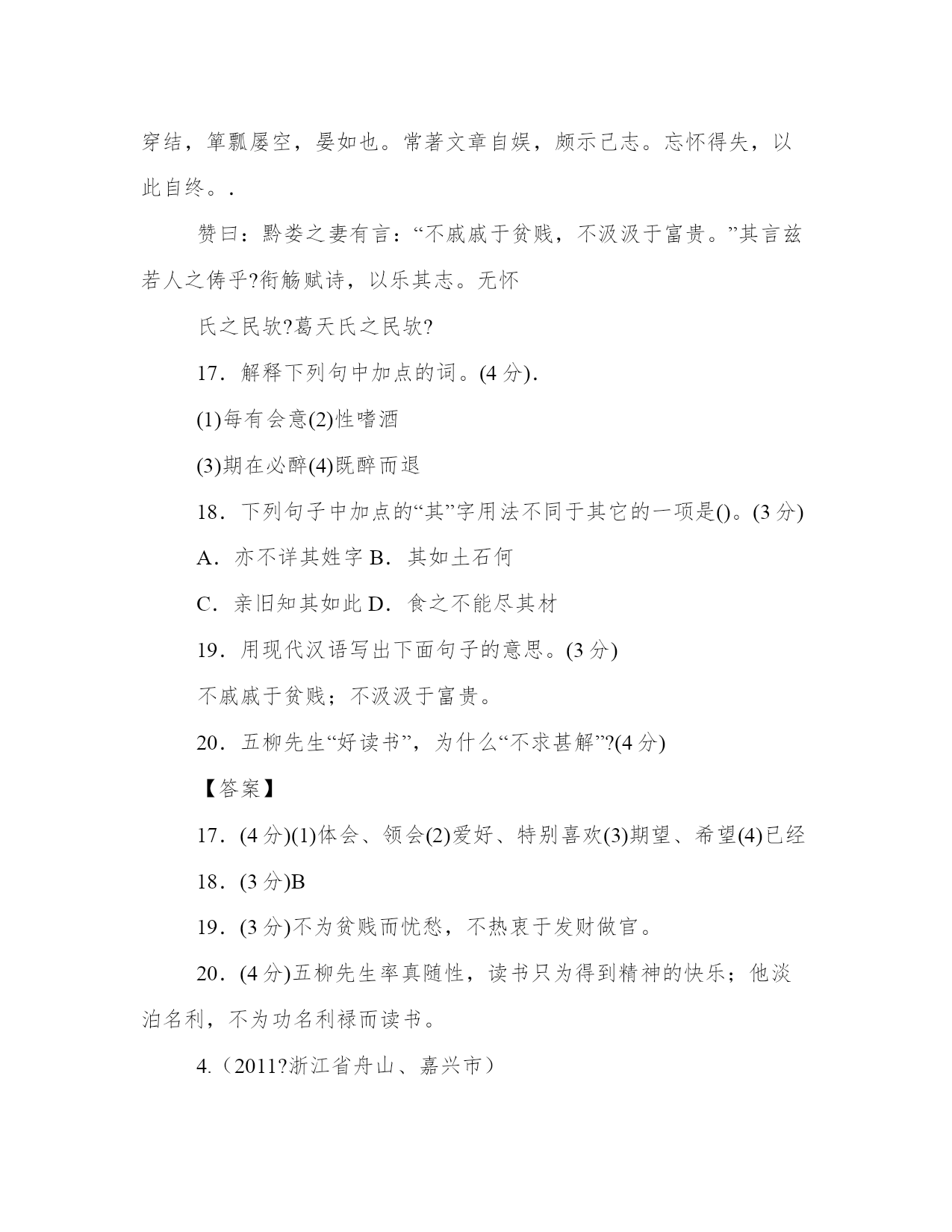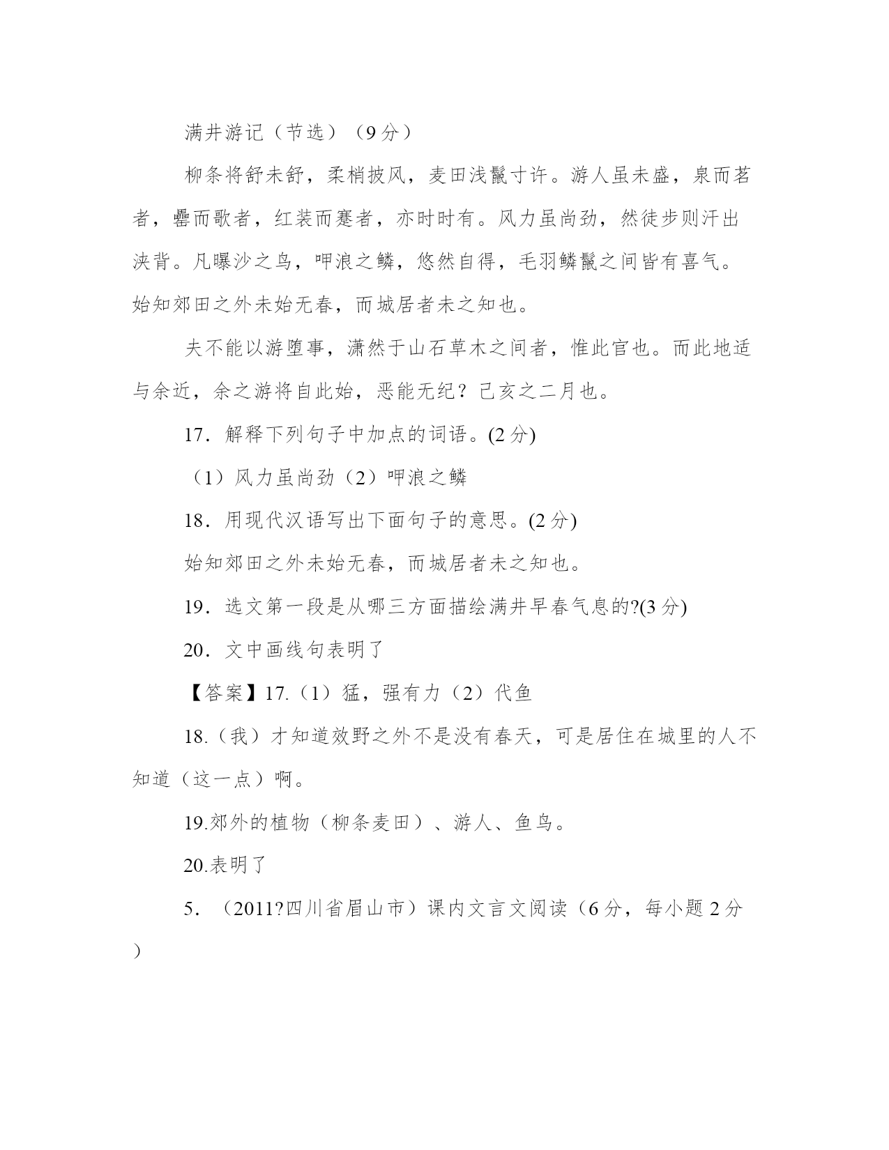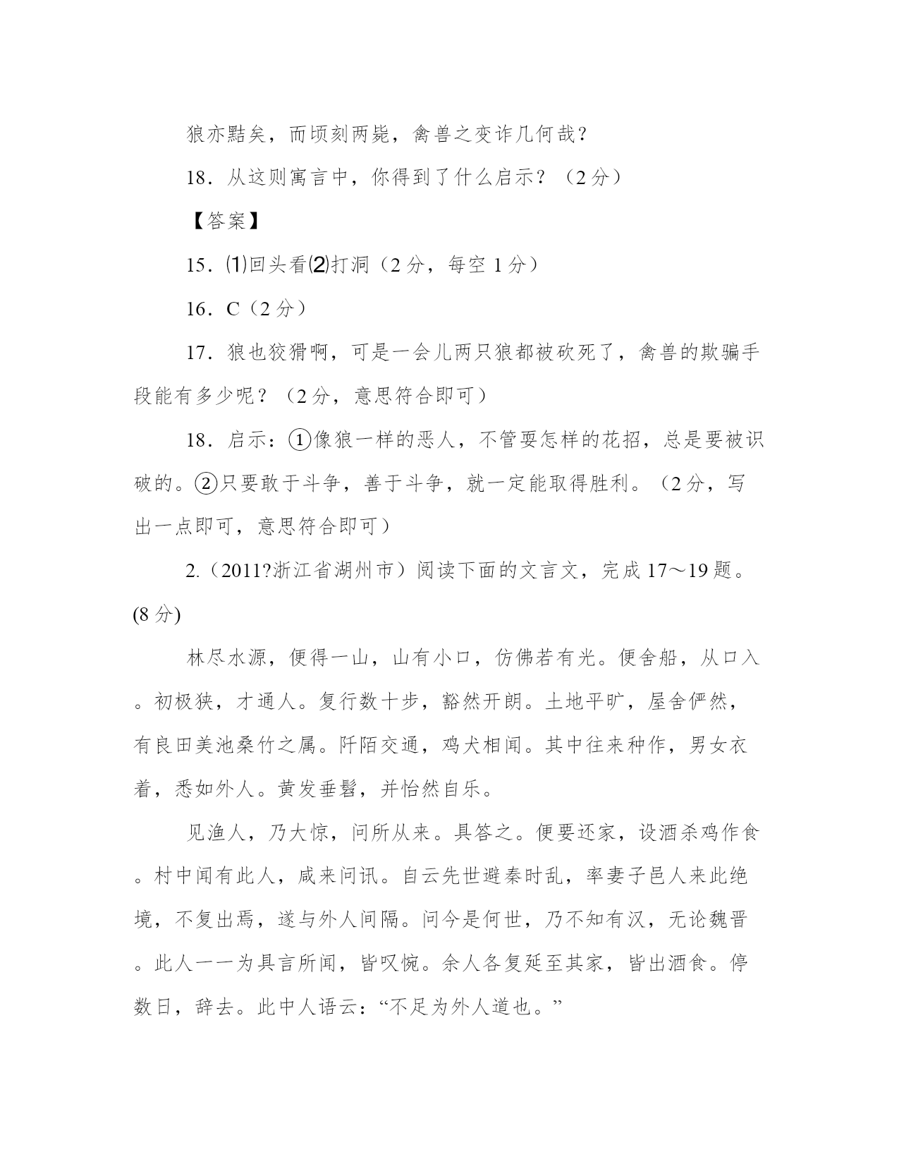 中考文言文习题汇编蒲松龄一屠晚归,担中肉尽,止有剩骨。途中两狼,缀行甚远。屠惧,投以骨。一狼得骨止,一狼仍从。复投之,后狼止而前狼又至。骨已尽矣,而两狼之并驱如故。屠大窘,恐前后受其敌。顾野有麦场,场主积薪其中,苫蔽成丘。屠乃奔倚其下,弛担持刀。狼不敢前,眈眈相向。少时,一狼径去,其一犬坐于前。久之,目似瞑,意暇甚。屠暴起,以刀劈狼首,又数刀毙之。方欲行,转视积薪后,一狼洞其中,意将隧入以攻其后也。身已半入,止露尻尾。屠自后断其股,亦毙之。乃悟前狼假寐,盖以诱敌。狼亦黠矣,而顷刻两毙,禽兽之变诈几何哉?止增笑耳。15.解释下面加点的词。(2分)⑴顾野有麦场:⑵一狼洞其中:16.下列各组句中加点词的意义和用法相同的一项是()(2分)A.以刀劈狼首先帝不以臣卑鄙B.其一犬坐于前皆以美于徐公C.而两狼之并驱如故鸣之而不能通其意D.屠乃奔倚其下安陵君其许寡人17.用现代汉语写出下面句子的意思。(2分)狼亦黠矣,而顷刻两毙,禽兽之变诈几何哉?18.从这则寓言中,你得到了什么启示?(2分)【答案】15.⑴回头看⑵打洞(2分,每空1分)16.C(2分)17.狼也狡猾啊,可是一会儿两只狼都被砍死了,禽兽的欺骗手段能有多少呢?(2分,意思符合即可)18.启示:①像狼一样的恶人,不管耍怎样的花招,总是要被识破的。②只要敢于斗争,善于斗争,就一定能取得胜利。(2分,写出一点即可,意思符合即可)2.(2011?浙江省湖州市)阅读下面的文言文,完成17~19题。(8分)林尽水源,便得一山,山有小口,仿佛若有光。便舍船,从口入。初极狭,才通人。复行数十步,豁然开朗。土地平旷,屋舍俨然,有良田美池桑竹之属。阡陌交通,鸡犬相闻。其中往来种作,男女衣着,悉如外人。黄发垂髫,并怡然自乐。见渔人,乃大惊,问所从来。具答之。便要还家,设酒杀鸡作食。村中闻有此人,咸来问讯。自云先世避秦时乱,率妻子邑人来此绝境,不复出焉,遂与外人间隔。问今是何世,乃不知有汉,无论魏晋。此人一一为具言所闻,皆叹惋。余人各复延至其家,皆出酒食。停数日,辞去。此中人语云:“不足为外人道也。”17.解释下列句子中加点的词。(3分)①阡陌交通②便要还家③不足为外人道也18.用现代汉语写出下面句子的意思。(3分)问今是何世,乃不知有汉,无论魏晋。19.【答案】17(共3分,各1分)①交错相通②通“邀”,邀请③值得18.(共3分)(村中人)问现在是什么朝代,竟然不知道有过汉朝,(至于)魏、晋两朝就更不用说了。(“乃”“无论”各1分,句意正确通顺1分)19(共2分)能结合文章内容1分;描述怎样的世外桃源,言之成理,1分。示例l:示例2;3.(2011?浙江省温州市)五柳先生传陶渊明先生不知何许人也,亦不详其姓字,宅边有五柳树,因以为号焉。_闲静少言,不慕荣利。好读书,不求甚解;每有会意,便欣然忘食。性嗜酒,家贫不能常得。亲旧知其如此,或置酒而招之;造饮辄尽,期在必醉。既醉而退,曾不吝情去留。环堵萧然,不蔽风日;短褐穿结,箪瓢屡空,晏如也。常著文章自娱,颇示己志。忘怀得失,以此自终。.赞曰:黔娄之妻有言:“不戚戚于贫贱,不汲汲于富贵。”其言兹若人之俦乎?衔觞赋诗,以乐其志。无怀氏之民欤?葛天氏之民欤?17.解释下列句中加点的词。(4分).(1)每有会意(2)性嗜酒(3)期在必醉(4)既醉而退18.下列句子中加点的“其”字用法不同于其它的一项是()。(3分)A.亦不详其姓字B.其如土石何C.亲旧知其如此D.食之不能尽其材19.用现代汉语写出下面句子的意思。(3分)不戚戚于贫贱;不汲汲于富贵。20.五柳先生“好读书”,为什么“不求甚解”?(4分)【答案】17.(4分)(1)体会、领会(2)爱好、特别喜欢(3)期望、希望(4)已经18.(3分)B19.(3分)不为贫贱而忧愁,不热衷于发财做官。20.(4分)五柳先生率真随性,读书只为得到精神的快乐;他淡泊名利,不为功名利禄而读书。4.(2011?浙江省舟山、嘉兴市)满井游记(节选)(9分)柳条将舒未舒,柔梢披风,麦田浅鬣寸许。游人虽未盛,泉而茗者,罍而歌者,红装而蹇者,亦时时有。风力虽尚劲,然徒步则汗出浃背。凡曝沙之鸟,呷浪之鳞,悠然自得,毛羽鳞鬣之间皆有喜气。始知郊田之外未始无春,而城居者未之知也。夫不能以游堕事,潇然于山石草木之间者,惟此官也。而此地适与余近,余之游将自此始,恶能无纪?己亥之二月也。17.解释下列句子中加点的词语。(2分)(1)风力虽尚劲(2)呷浪之鳞18.用现代汉语写出下面句子的意思。(2分)始知郊田之外未始无春,而城居者未之知也。19.选文第一段是从哪三方面描绘满井早春气息的?(3分)20.文中画线句表明了【答