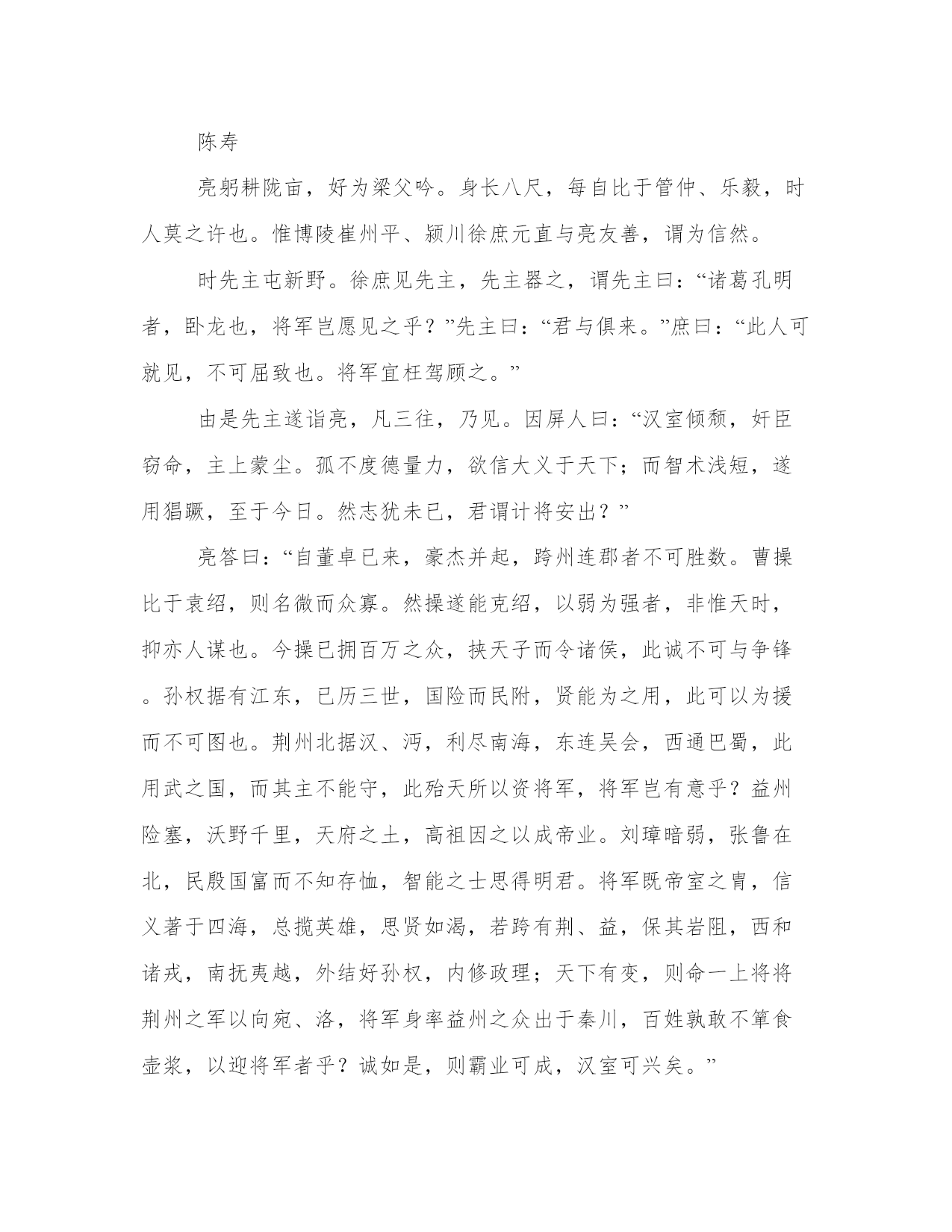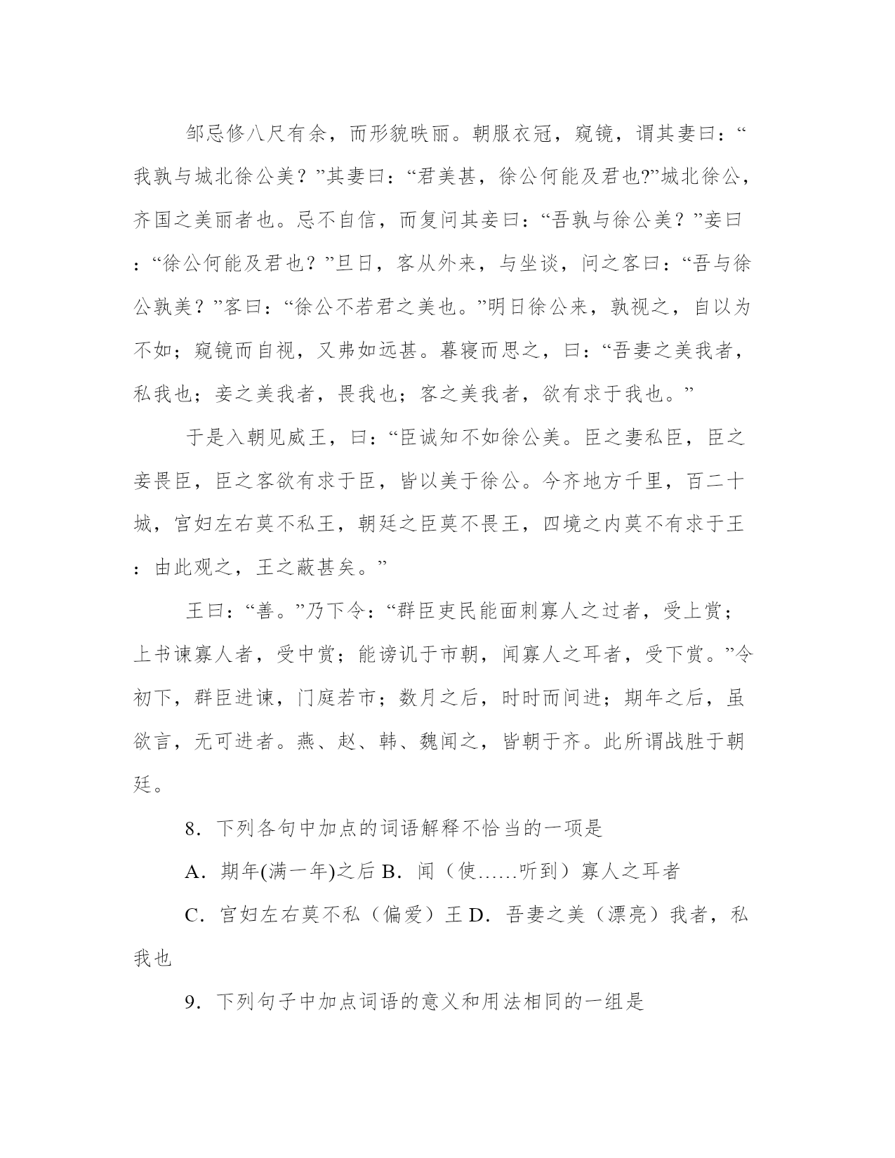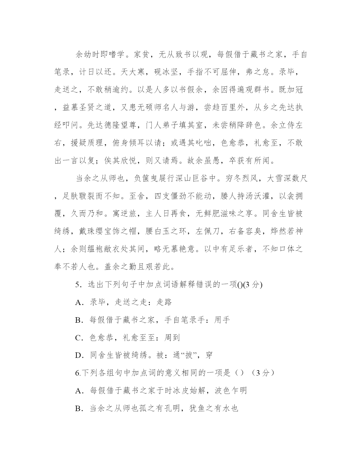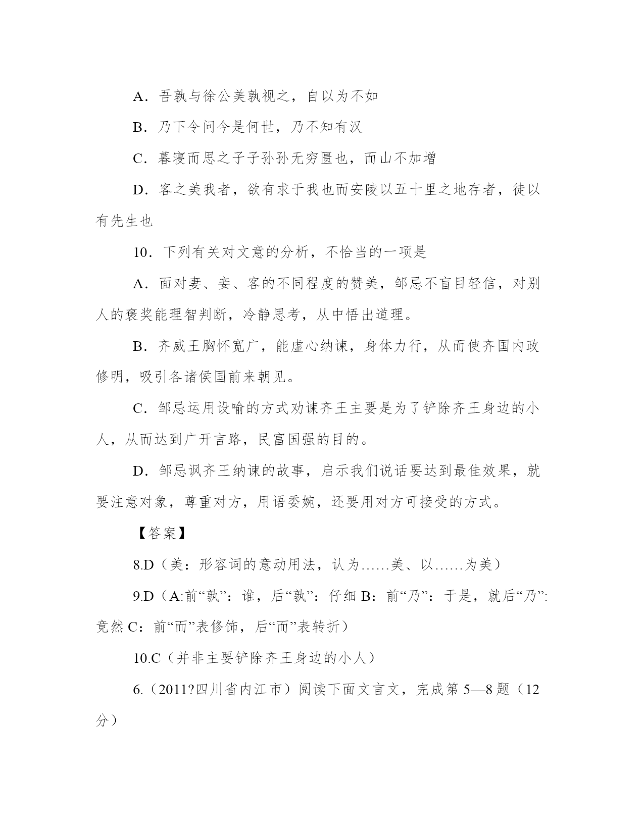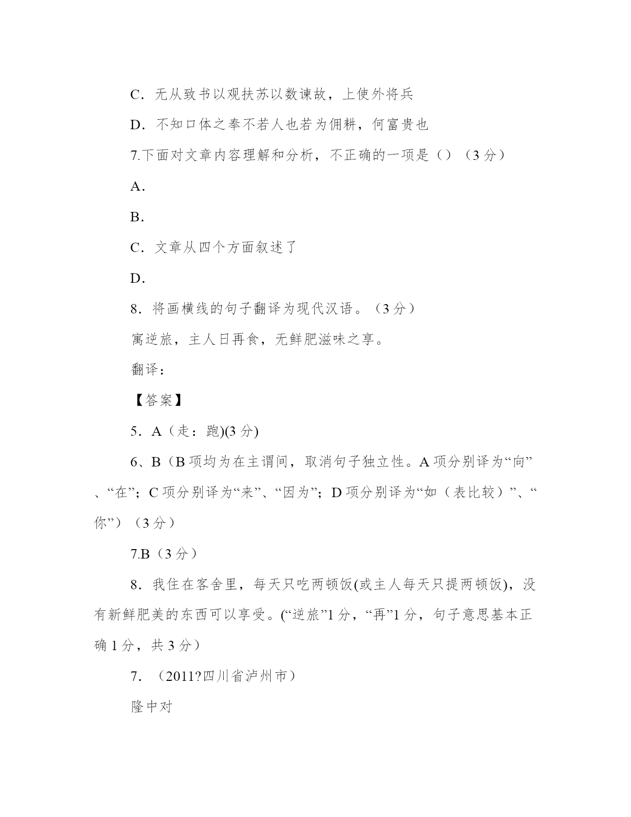 中考文言文习题汇编蒲松龄一屠晚归,担中肉尽,止有剩骨。途中两狼,缀行甚远。屠惧,投以骨。一狼得骨止,一狼仍从。复投之,后狼止而前狼又至。骨已尽矣,而两狼之并驱如故。屠大窘,恐前后受其敌。顾野有麦场,场主积薪其中,苫蔽成丘。屠乃奔倚其下,弛担持刀。狼不敢前,眈眈相向。少时,一狼径去,其一犬坐于前。久之,目似瞑,意暇甚。屠暴起,以刀劈狼首,又数刀毙之。方欲行,转视积薪后,一狼洞其中,意将隧入以攻其后也。身已半入,止露尻尾。屠自后断其股,亦毙之。乃悟前狼假寐,盖以诱敌。狼亦黠矣,而顷刻两毙,禽兽之变诈几何哉?止增笑耳。15.解释下面加点的词。(2分)⑴顾野有麦场:⑵一狼洞其中:16.下列各组句中加点词的意义和用法相同的一项是()(2分)A.以刀劈狼首先帝不以臣卑鄙B.其一犬坐于前皆以美于徐公C.而两狼之并驱如故鸣之而不能通其意D.屠乃奔倚其下安陵君其许寡人17.用现代汉语写出下面句子的意思。(2分)狼亦黠矣,而顷刻两毙,禽兽之变诈几何哉?18.从这则寓言中,你得到了什么启示?(2分)【答案】15.⑴回头看⑵打洞(2分,每空1分)16.C(2分)17.狼也狡猾啊,可是一会儿两只狼都被砍死了,禽兽的欺骗手段能有多少呢?(2分,意思符合即可)18.启示:①像狼一样的恶人,不管耍怎样的花招,总是要被识破的。②只要敢于斗争,善于斗争,就一定能取得胜利。(2分,写出一点即可,意思符合即可)2.(2011?浙江省湖州市)阅读下面的文言文,完成17~19题。(8分)林尽水源,便得一山,山有小口,仿佛若有光。便舍船,从口入。初极狭,才通人。复行数十步,豁然开朗。土地平旷,屋舍俨然,有良田美池桑竹之属。阡陌交通,鸡犬相闻。其中往来种作,男女衣着,悉如外人。黄发垂髫,并怡然自乐。见渔人,乃大惊,问所从来。具答之。便要还家,设酒杀鸡作食。村中闻有此人,咸来问讯。自云先世避秦时乱,率妻子邑人来此绝境,不复出焉,遂与外人间隔。问今是何世,乃不知有汉,无论魏晋。此人一一为具言所闻,皆叹惋。余人各复延至其家,皆出酒食。停数日,辞去。此中人语云:“不足为外人道也。”17.解释下列句子中加点的词。(3分)①阡陌交通②便要还家③不足为外人道也18.用现代汉语写出下面句子的意思。(3分)问今是何世,乃不知有汉,无论魏晋。19.【答案】17(共3分,各1分)①交错相通②通“邀”,邀请③值得18.(共3分)(村中人)问现在是什么朝代,竟然不知道有过汉朝,(至于)魏、晋两朝就更不用说了。(“乃”“无论”各1分,句意正确通顺1分)19(共2分)能结合文章内容1分;描述怎样的世外桃源,言之成理,1分。示例l:示例2;3.(2011?浙江省温州市)五柳先生传陶渊明先生不知何许人也,亦不详其姓字,宅边有五柳树,因以为号焉。_闲静少言,不慕荣利。好读书,不求甚解;每有会意,便欣然忘食。性嗜酒,家贫不能常得。亲旧知其如此,或置酒而招之;造饮辄尽,期在必醉。既醉而退,曾不吝情去留。环堵萧然,不蔽风日;短褐穿结,箪瓢屡空,晏如也。常著文章自娱,颇示己志。忘怀得失,以此自终。.赞曰:黔娄之妻有言:“不戚戚于贫贱,不汲汲于富贵。”其言兹若人之俦乎?衔觞赋诗,以乐其志。无怀氏之民欤?葛天氏之民欤?17.解释下列句中加点的词。(4分).(1)每有会意(2)性嗜酒(3)期在必醉(4)既醉而退18.下列句子中加点的“其”字用法不同于其它的一项是()。(3分)A.亦不详其姓字B.其如土石何C.亲旧知其如此D.食之不能尽其材19.用现代汉语写出下面句子的意思。(3分)不戚戚于贫贱;不汲汲于富贵。20.五柳先生“好读书”,为什么“不求甚解”?(4分)【答案】17.(4分)(1)体会、领会(2)爱好、特别喜欢(3)期望、希望(4)已经18.(3分)B19.(3分)不为贫贱而忧愁,不热衷于发财做官。20.(4分)五柳先生率真随性,读书只为得到精神的快乐;他淡泊名利,不为功名利禄而读书。4.(2011?浙江省舟山、嘉兴市)满井游记(节选)(9分)柳条将舒未舒,柔梢披风,麦田浅鬣寸许。游人虽未盛,泉而茗者,罍而歌者,红装而蹇者,亦时时有。风力虽尚劲,然徒步则汗出浃背。凡曝沙之鸟,呷浪之鳞,悠然自得,毛羽鳞鬣之间皆有喜气。始知郊田之外未始无春,而城居者未之知也。夫不能以游堕事,潇然于山石草木之间者,惟此官也。而此地适与余近,余之游将自此始,恶能无纪?己亥之二月也。17.解释下列句子中加点的词语。(2分)(1)风力虽尚劲(2)呷浪之鳞18.用现代汉语写出下面句子的意思。(2分)始知郊田之外未始无春,而城居者未之知也。19.选文第一段是从哪三方面描绘满井早春气息的?(3分)20.文中画线句表明了【答