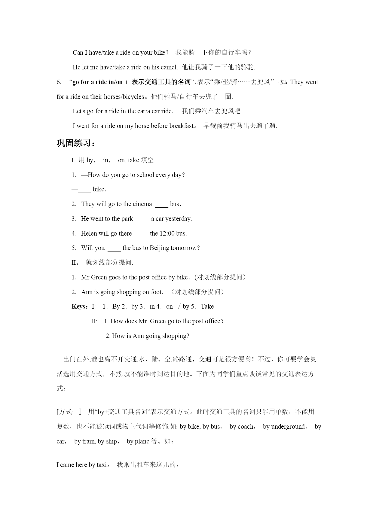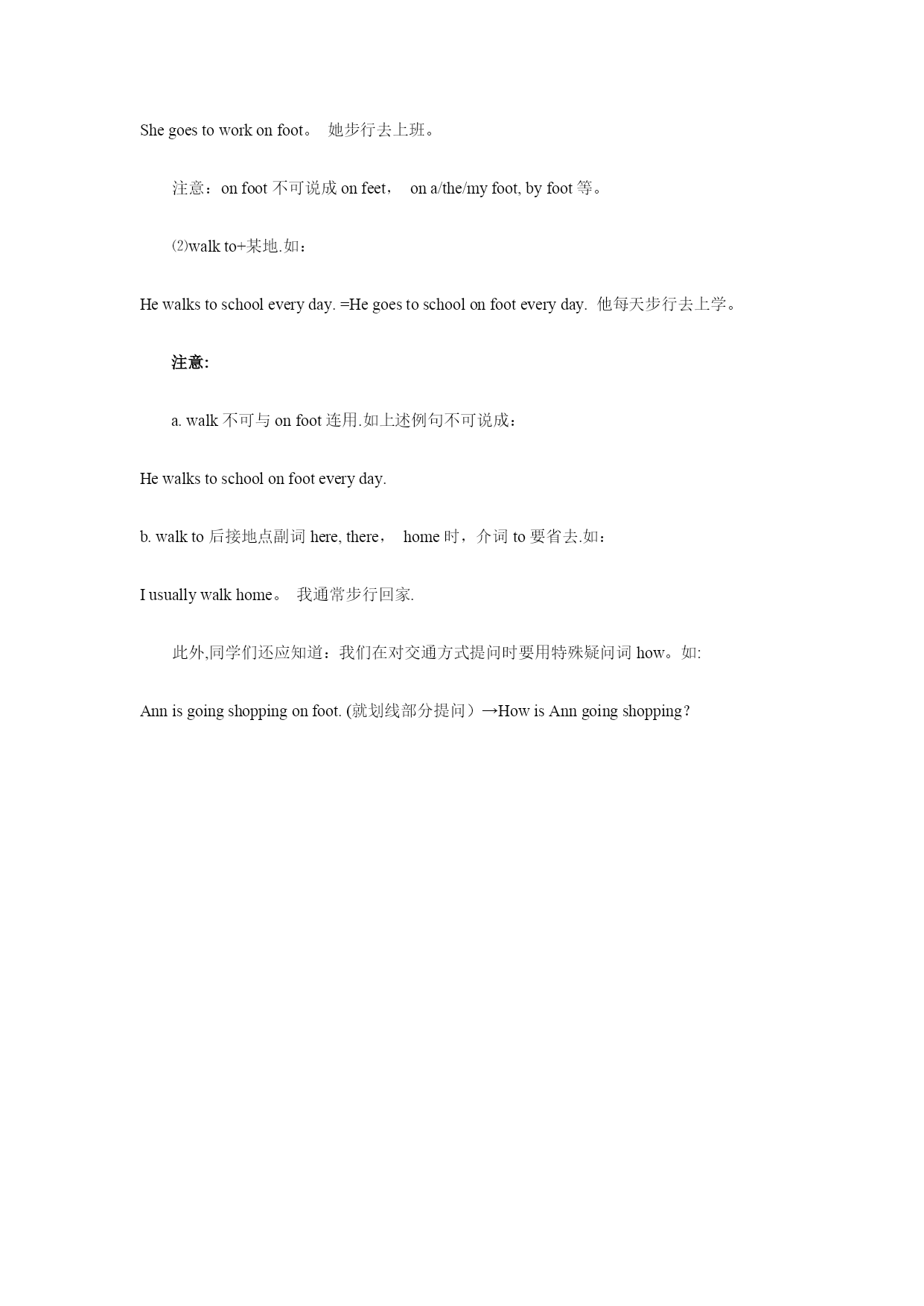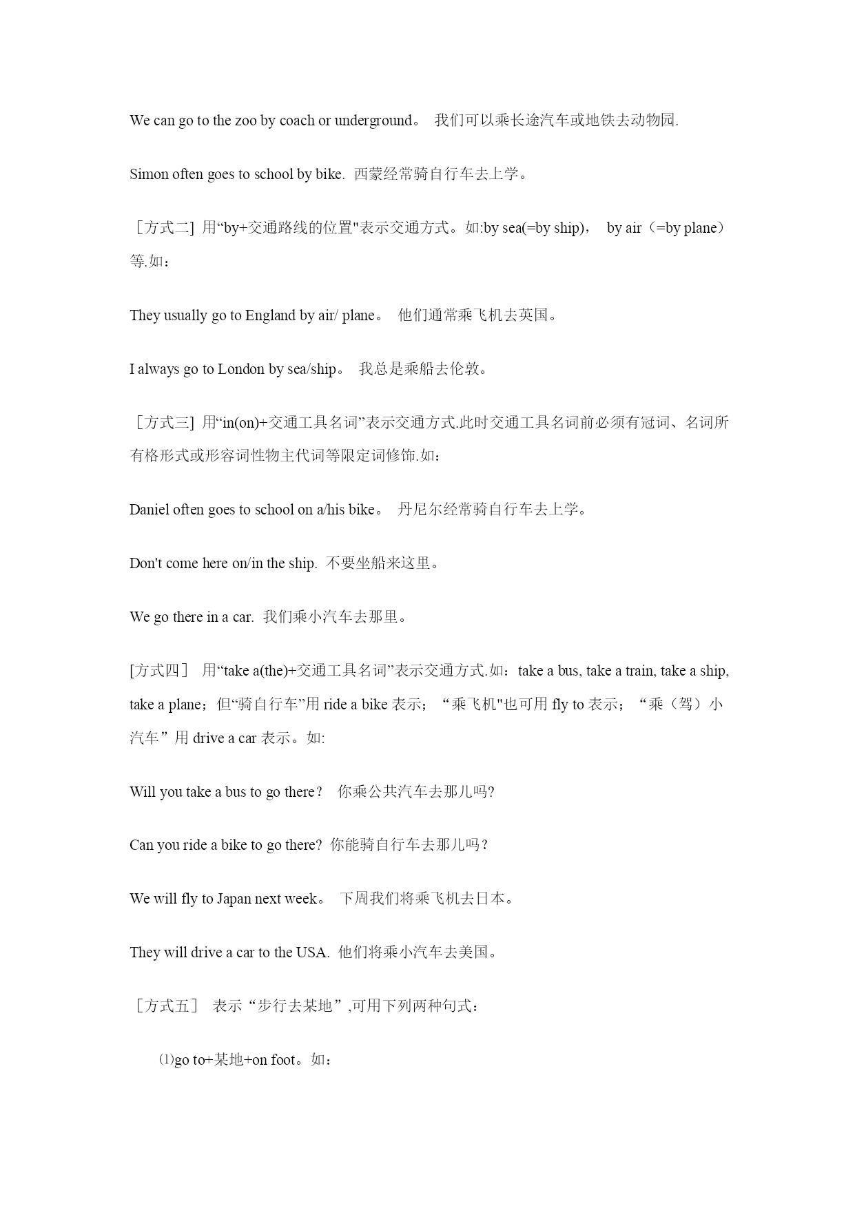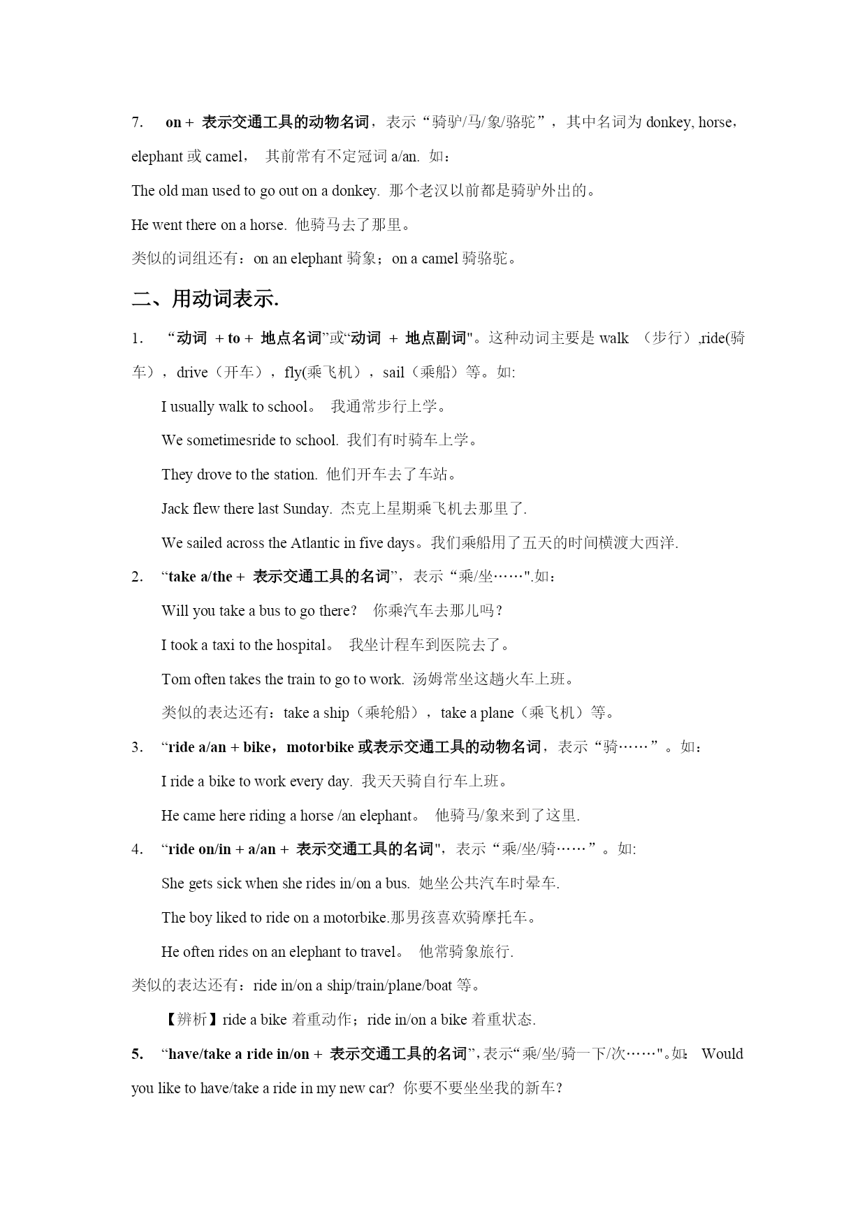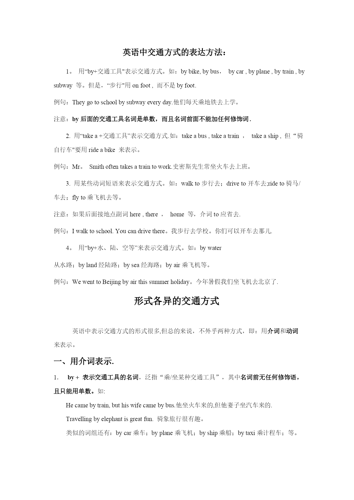 英语中交通方式的表达方法(可以直接使用,可编辑优秀版资料,欢迎下载)英语中交通方式的表达方法:1。用“by+交通工具"表示交通方式。如:bybike,bybus,bycar,byplane,bytrain,bysubway等。但是,“步行"用onfoot,而不是byfoot.例句:Theygotoschoolbysubwayeveryday.他们每天乘地铁去上学。注意:by后面的交通工具名词是单数,而且名词前面不能加任何修饰词.2.用“takea+交通工具”表示交通方式.如:takeabus,takeatrain,takeaship,但“骑自行车"要用rideabike来表示。例句:Mr。Smithoftentakesatraintowork.史密斯先生常坐火车去上班。3.用某些动词短语来表示交通方式。如:walkto步行去;driveto开车去;rideto骑马/车去;flyto乘飞机去等。注意:如果后面接地点副词here,there,home等,介词to应省去.例句:Iwalktoschool.Youcandrivethere。我步行去学校。你们可以开车去那儿.4。用“by+水、陆、空等”来表示交通方式。如:bywater从水路;byland经陆路;bysea经海路;byair乘飞机等。例句:WewenttoBeijingbyairthissummerholiday。今年暑假我们坐飞机去北京了.形式各异的交通方式英语中表示交通方式的形式很多,但总的来说,不外乎两种方式,即:用介词和动词来表示。一、用介词表示.1.by+表示交通工具的名词,泛指“乘/坐某种交通工具”,其中名词前无任何修饰语,且只能用单数。如:Hecamebytrain,buthiswifecamebybus.他坐火车来的,但他妻子坐汽车来的.Travellingbyelephantisgreatfun.骑象旅行很有趣。类似的词组还有:bycar乘车;byplane乘飞机;byship乘船;bytaxi乘计程车;等。2.in/on+表示交通工具的名词,或泛指或特指“乘/坐某种交通工具”,其中名词前常有冠词、物主代词、指示代词或名词所有格等修饰语,名词可以是单数或复数。①bus,train,boat,plane,ship等有厢,有舱的名词前,用介词in或on.如:Wearegoingtherein/onabus.我们将乘公共汽车去那里.(泛指)Don'tcomehereon/intheship.不要坐船来这里。(特指)②bike或motorbike前,只能用介词on。如:Theygotoworkontheirbikes.他们骑自行车上班.(特指)Shewentoutonhernewmotorbike。她骑着她的新摩托车出去了。(特指)③car,taxi前,多用介词in。如:WearegoingtoFranceinJohn'scar。我们将坐约翰的车去法国。(特指)3.by/on+表示交通工具的名词,特指“乘/坐某一趟/辆/艘(车,船等)”,其中名词为单数,其前常有定冠词与数词或具体时刻一起作修饰语。如:Theycamehereby/onthefirstbus。他们是坐头班车来的.Youcangetthereby/ontheNumber10bus/busNo.10。你可以乘10路公共汽车到那里.HewentuptoLondonby/onthe10:30(train)。他是乘10时30分的火车去伦敦的。4.by+表示交通工具的名词,泛指“乘/坐某种档次的交通工具旅行”,其中名词为单数,其前常有表示“等级或档次”的形容词作修饰语。如:Shetravelsbythird—classtrain。她乘三等车旅行.IwillgotoBeijingbythefasttrain。我将乘快车去北京。HeflewtoParisbyfirstclass(plane)。他坐头等舱飞往巴黎。HewenttoTokyobyalargeship.他乘一艘大船去了东京。5.by+表示交通线路或交通线路所经范围的名词,表示“经由陆路/水路/空中等线路旅行或运输”,其中名词为单数或不可数,其前无任何修饰语。如:Shallwegobylandorbysea?我们是由陆路去还是由水路去?Itsavesalotoftimetotravelbyair。乘飞机旅行可以节省许多时间.类似的词组还有:bywater由水路;byroad由公路;byrail由铁路;等。6.on+表示人或动物特定身体部位的名词,表示“步行或骑马/骆驼”,其中名词只能是foot,horseback或camelback,其前无任何修饰语.如:Sheu