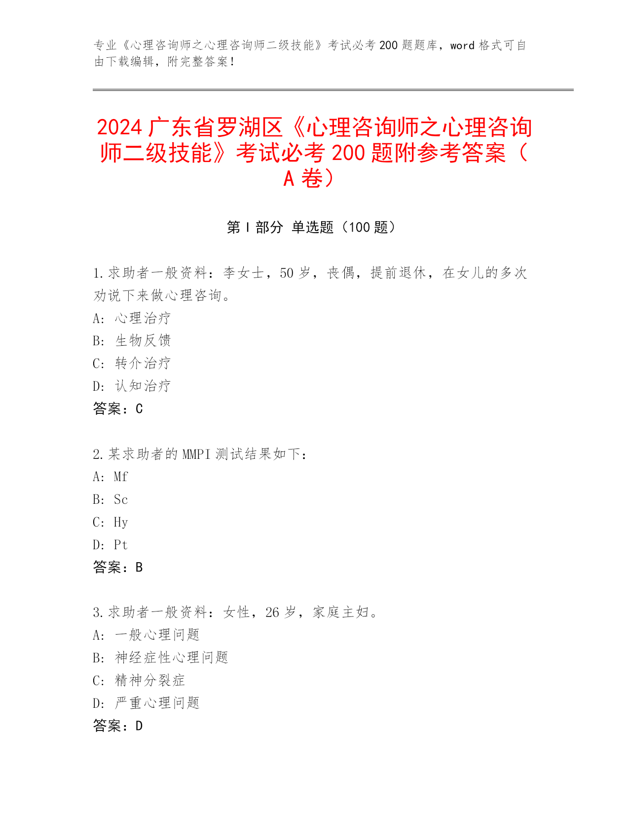 2024广东省罗湖区《心理咨询师之心理咨询师二级技能》考试必考200题附参考答案(A卷)