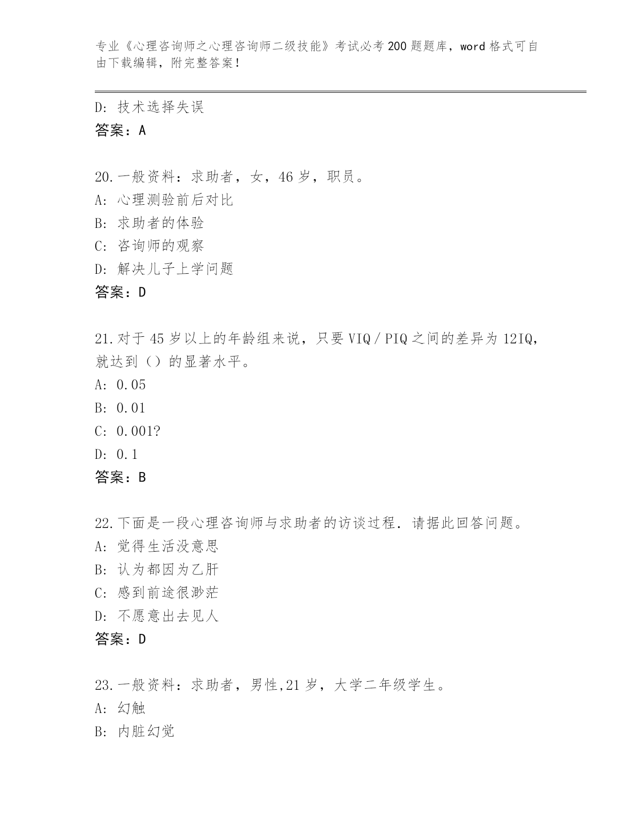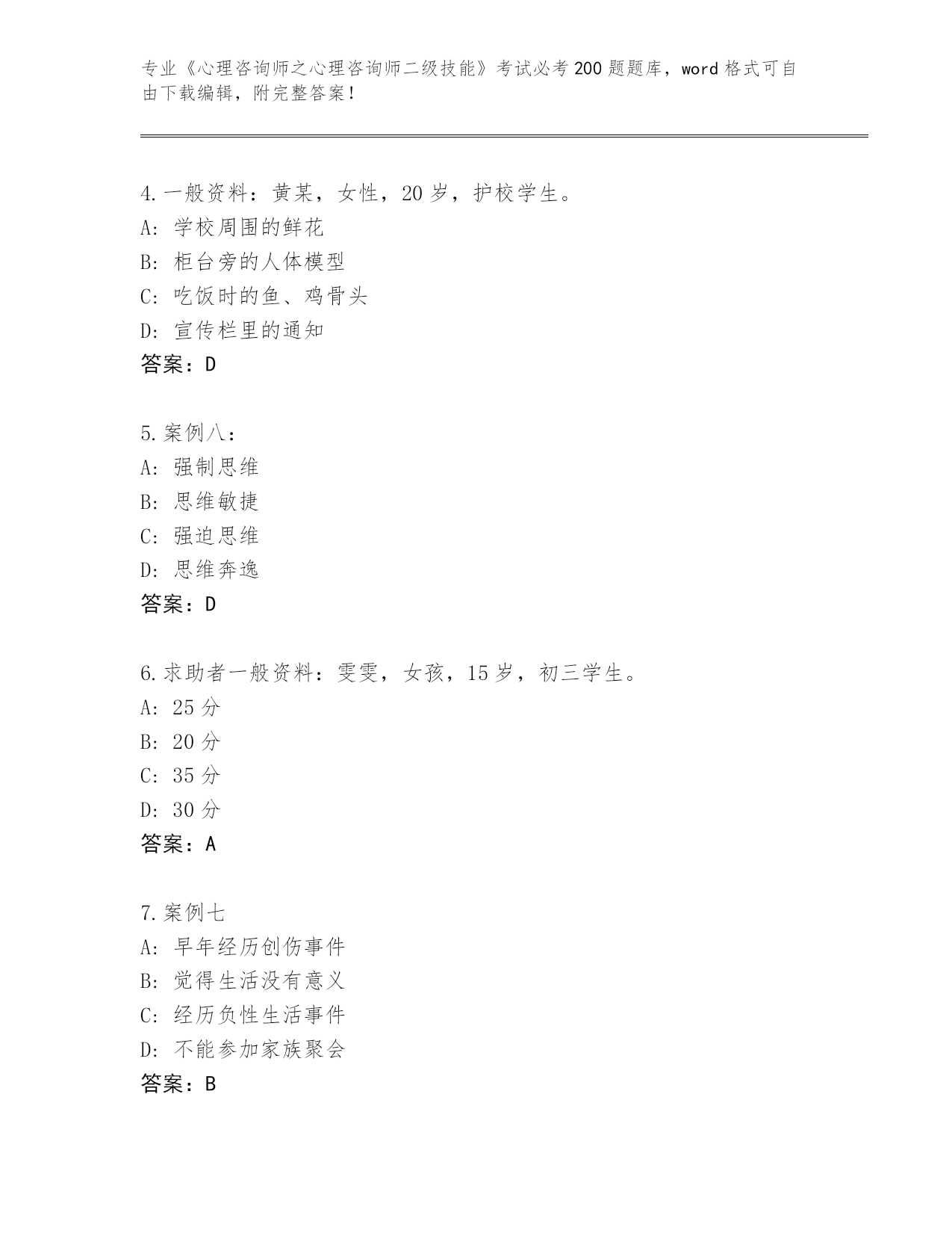 广东省内部使用《心理咨询师之心理咨询师二级技能》考试必考200题真题题库附参考答案(A卷)