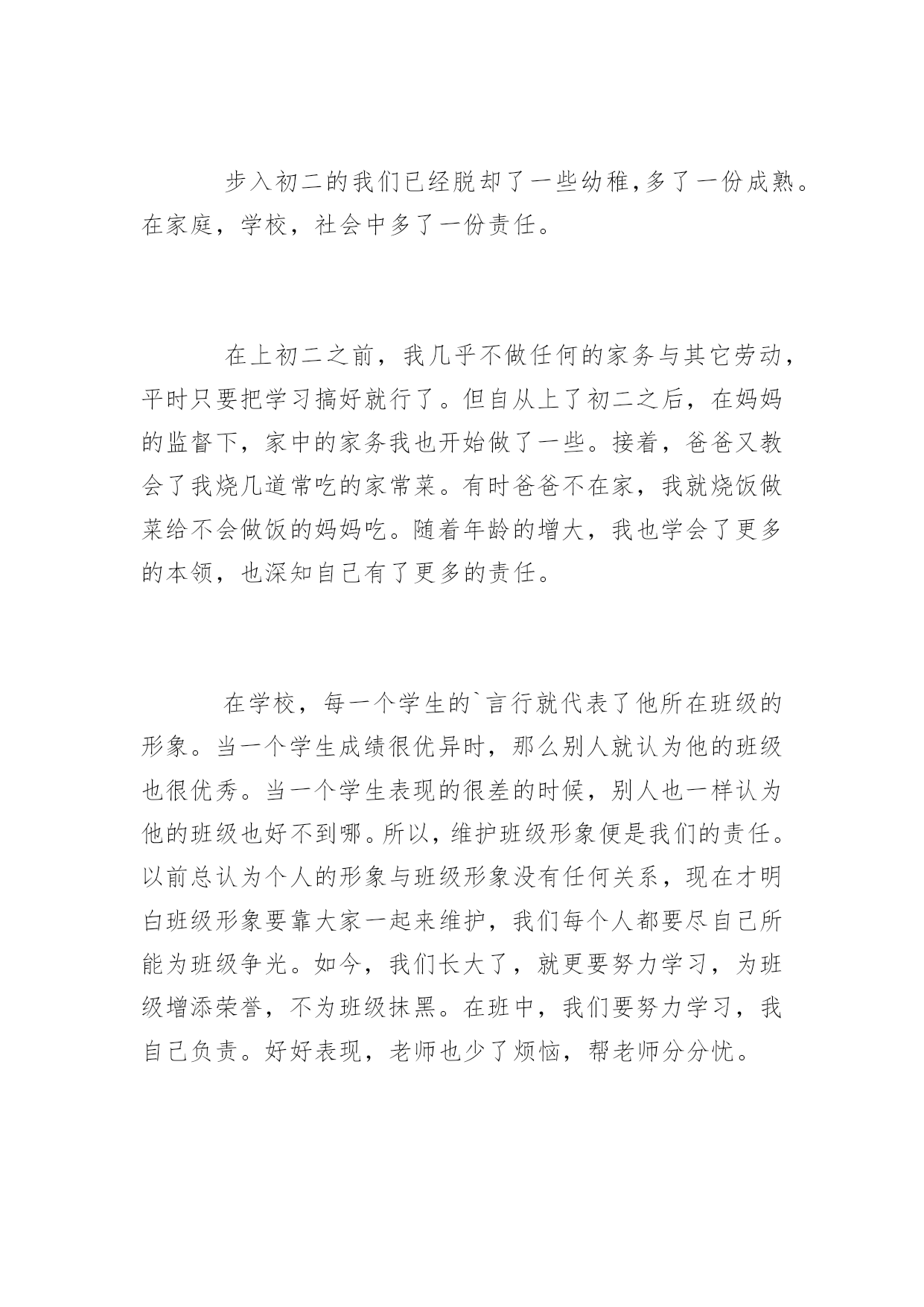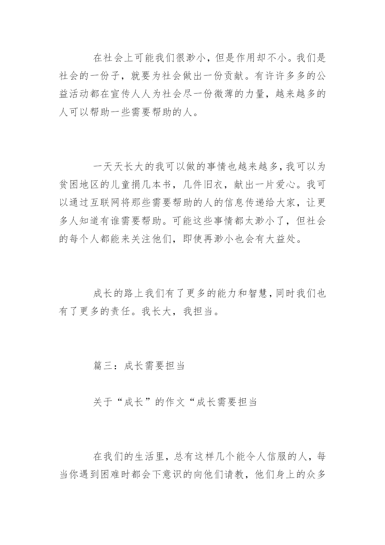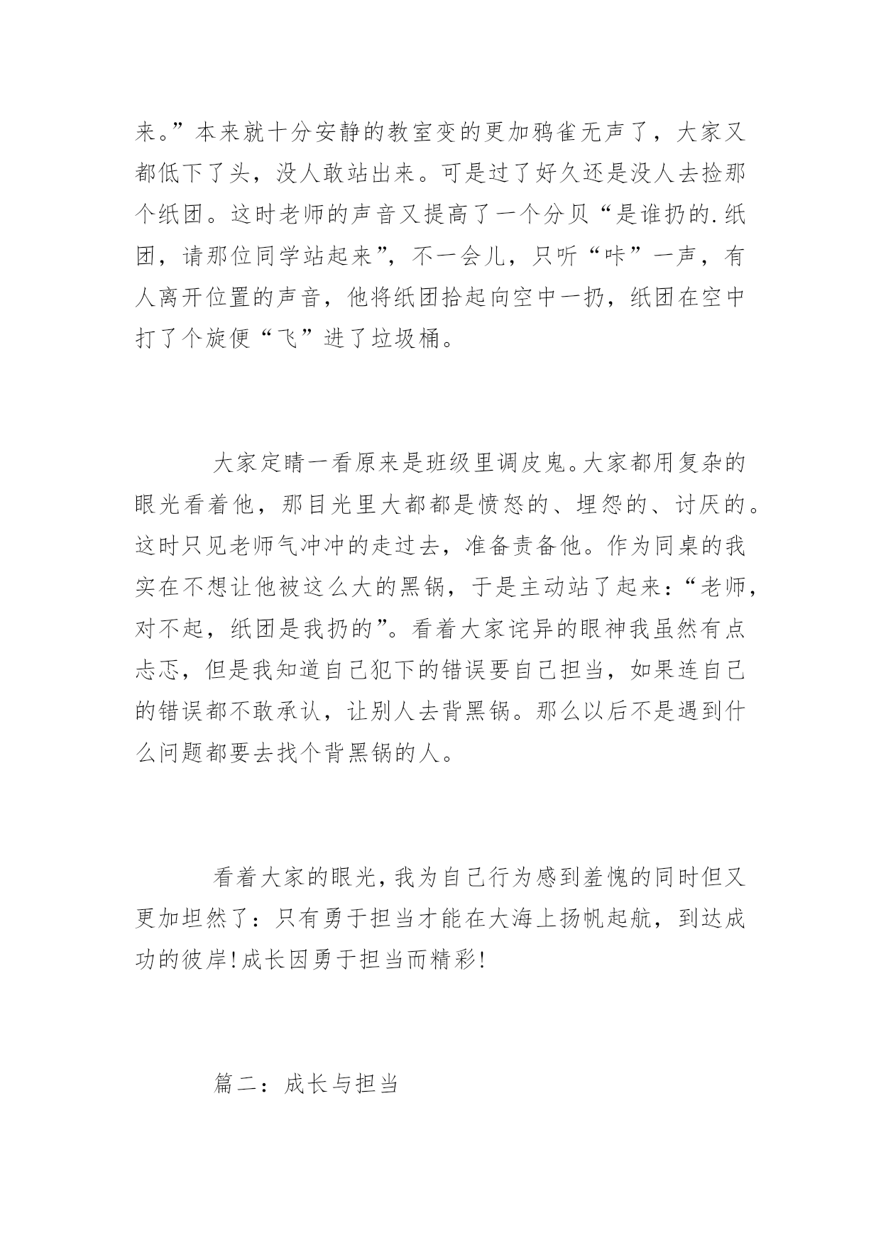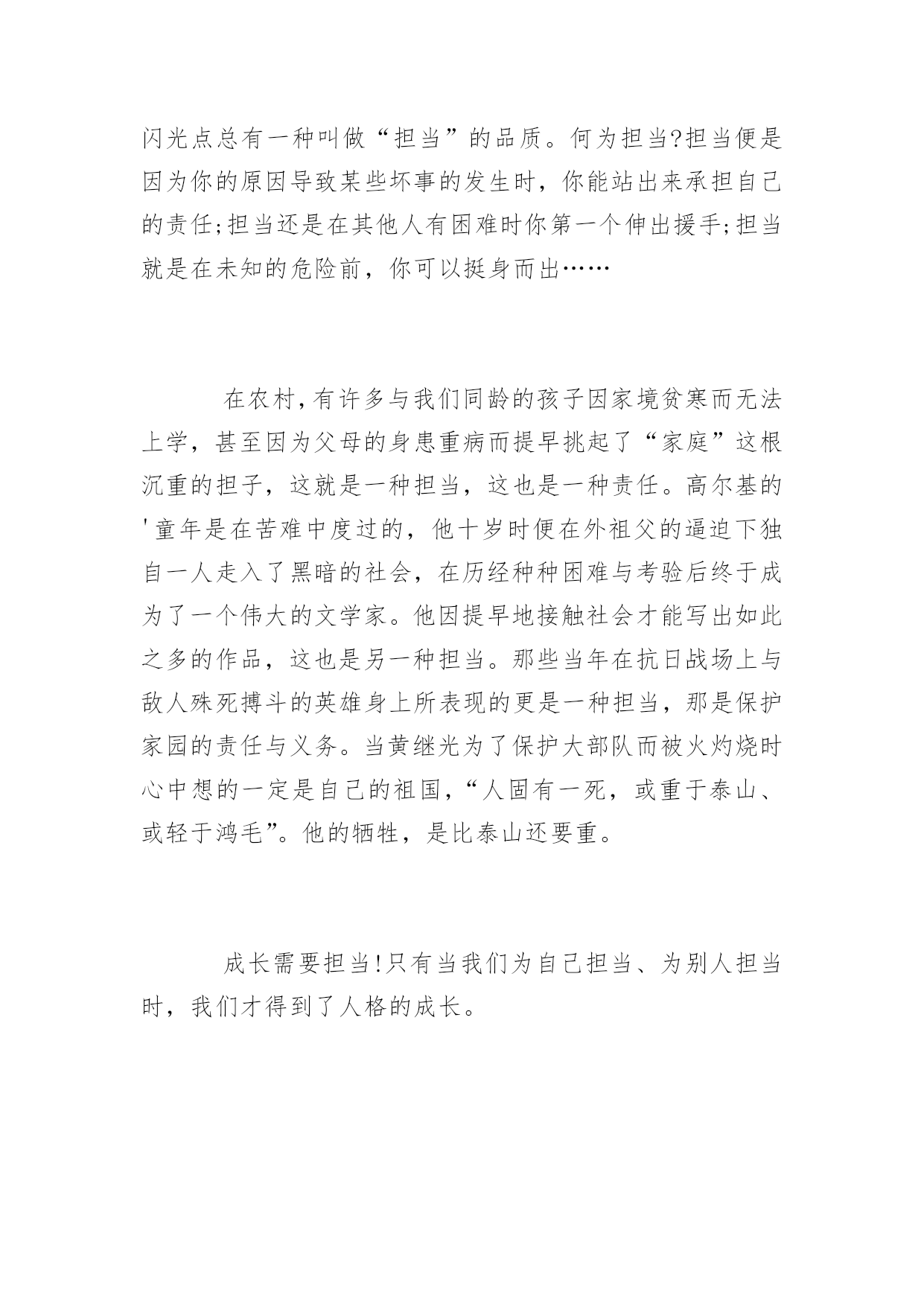中考作文预测:成长与担当2017年中考作文范文预测:成长与担当成长是一段艰辛的历程,担当是一种难得的品质,懂得担当即意味着已经成长。下面是小编整理的资料,欢迎大家阅读!更多相关信息请关注CNFLA的相关栏目!篇一:成长与担当担当是温暖的阳光,融化了那严冬的积雪;担当是春日的生机,孕育了嫩绿的新芽;担当更是一份责任,让你有勇气面对一切的困难和挫折。它会助你走向成功的彼岸,成长需要担当。小学时,在最后一堂自习课时,全班同学都在安静地写作业,班主任很满意地看着这个安静的教室。忽然,一个白色的纸团从老师的眼睛划了过去,“砰”的一声砸在了讲台上。本来大家低下的头,都循声齐刷刷的抬了起来。“是谁,是谁,这是谁干的?”老师的眼睛瞪得十分“凶狠”,严厉的目光扫视着我们。“是谁扔的纸团,请那位同学捡起来。”本来就十分安静的教室变的更加鸦雀无声了,大家又都低下了头,没人敢站出来。可是过了好久还是没人去捡那个纸团。这时老师的声音又提高了一个分贝“是谁扔的.纸团,请那位同学站起来”,不一会儿,只听“咔”一声,有人离开位置的声音,他将纸团拾起向空中一扔,纸团在空中打了个旋便“飞”进了垃圾桶。大家定睛一看原来是班级里调皮鬼。大家都用复杂的眼光看着他,那目光里大都都是愤怒的、埋怨的、讨厌的。这时只见老师气冲冲的走过去,准备责备他。作为同桌的我实在不想让他被这么大的黑锅,于是主动站了起来:“老师,对不起,纸团是我扔的”。看着大家诧异的眼神我虽然有点忐忑,但是我知道自己犯下的错误要自己担当,如果连自己的错误都不敢承认,让别人去背黑锅。那么以后不是遇到什么问题都要去找个背黑锅的人。看着大家的眼光,我为自己行为感到羞愧的同时但又更加坦然了:只有勇于担当才能在大海上扬帆起航,到达成功的彼岸!成长因勇于担当而精彩!篇二:成长与担当步入初二的我们已经脱却了一些幼稚,多了一份成熟。在家庭,学校,社会中多了一份责任。在上初二之前,我几乎不做任何的家务与其它劳动,平时只要把学习搞好就行了。但自从上了初二之后,在妈妈的监督下,家中的家务我也开始做了一些。接着,爸爸又教会了我烧几道常吃的家常菜。有时爸爸不在家,我就烧饭做菜给不会做饭的妈妈吃。随着年龄的增大,我也学会了更多的本领,也深知自己有了更多的责任。在学校,每一个学生的`言行就代表了他所在班级的形象。当一个学生成绩很优异时,那么别人就认为他的班级也很优秀。当一个学生表现的很差的时候,别人也一样认为他的班级也好不到哪。所以,维护班级形象便是我们的责任。以前总认为个人的形象与班级形象没有任何关系,现在才明白班级形象要靠大家一起来维护,我们每个人都要尽自己所能为班级争光。如今,我们长大了,就更要努力学习,为班级增添荣誉,不为班级抹黑。在班中,我们要努力学习,我自己负责。好好表现,老师也少了烦恼,帮老师分分忧。在社会上可能我们很渺小,但是作用却不小。我们是社会的一份子,就要为社会做出一份贡献。有许许多多的公益活动都在宣传人人为社会尽一份微薄的力量,越来越多的人可以帮助一些需要帮助的人。一天天长大的我可以做的事情也越来越多,我可以为贫困地区的儿童捐几本书,几件旧衣,献出一片爱心。我可以通过互联网将那些需要帮助的人的信息传递给大家,让更多人知道有谁需要帮助。可能这些事情都太渺小了,但社会的每个人都能来关注他们,即使再渺小也会有大益处。成长的路上我们有了更多的能力和智慧,同时我们也有了更多的责任。我长大,我担当。篇三:成长需要担当关于“成长”的作文“成长需要担当在我们的生活里,总有这样几个能令人信服的人,每当你遇到困难时都会下意识的向他们请教,他们身上的众多闪光点总有一种叫做“担当”的品质。何为担当?担当便是因为你的原因导致某些坏事的发生时,你能站出来承担自己的责任;担当还是在其他人有困难时你第一个伸出援手;担当就是在未知的危险前,你可以挺身而出……在农村,有许多与我们同龄的孩子因家境贫寒而无法上学,甚至因为父母的身患重病而提早挑起了“家庭”这根沉重的担子,这就是一种担当,这也是一种责任。高尔基的'童年是在苦难中度过的,他十岁时便在外祖父的逼迫下独自一人走入了黑暗的社会,在历经种种困难与考验后终于成为了一个伟大的文学家。他因提早地接触社会才能写出如此之多的作品,这也是另一种担当。那些当年在抗日战场上与敌人殊死搏斗的英雄身上所表现的更是一种担当,那是保护家园的责任与义务。当黄继光为了保护大部队而被火灼烧时心中想的一定是自己的祖国,“人固有一死,或重于泰山、或轻于鸿毛”。他的牺牲,是比泰山还要重。成长需要担当!只有当我们为自己担当、为别人担当时,我们才得到了人格的成长。