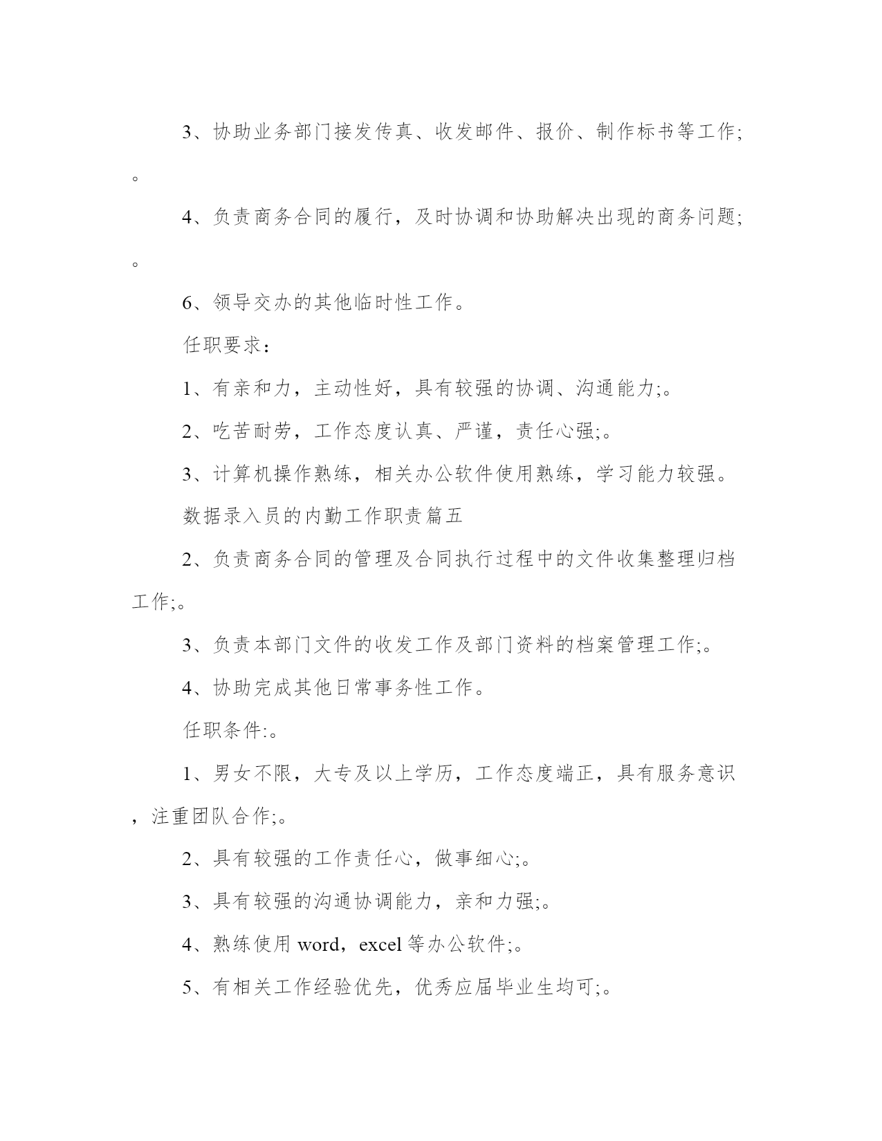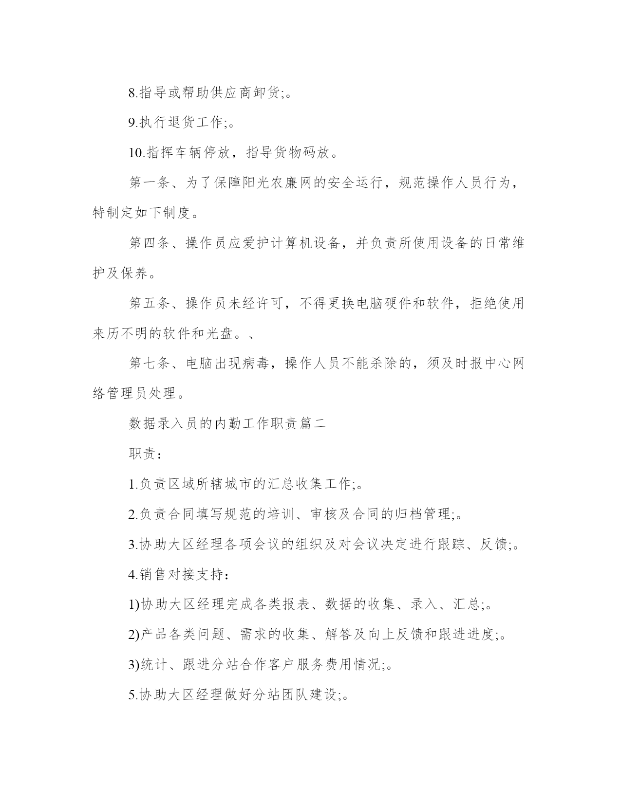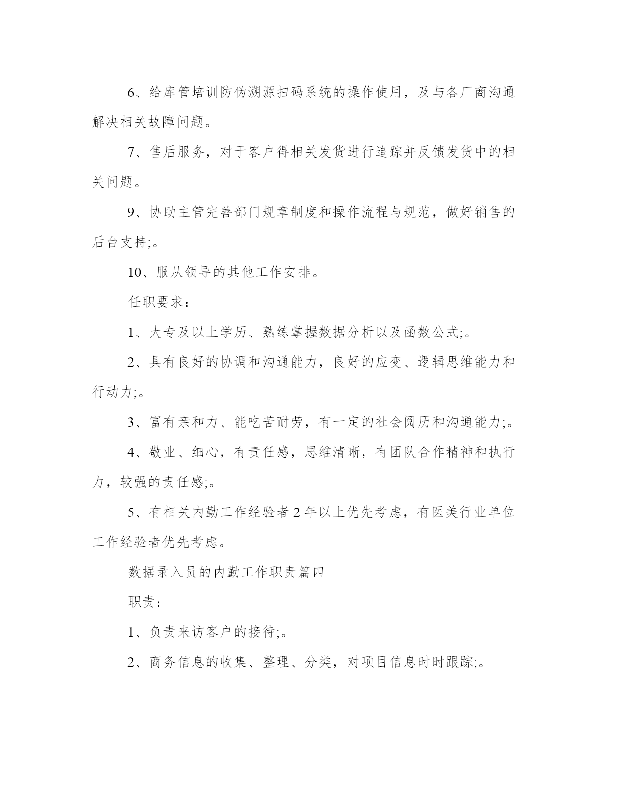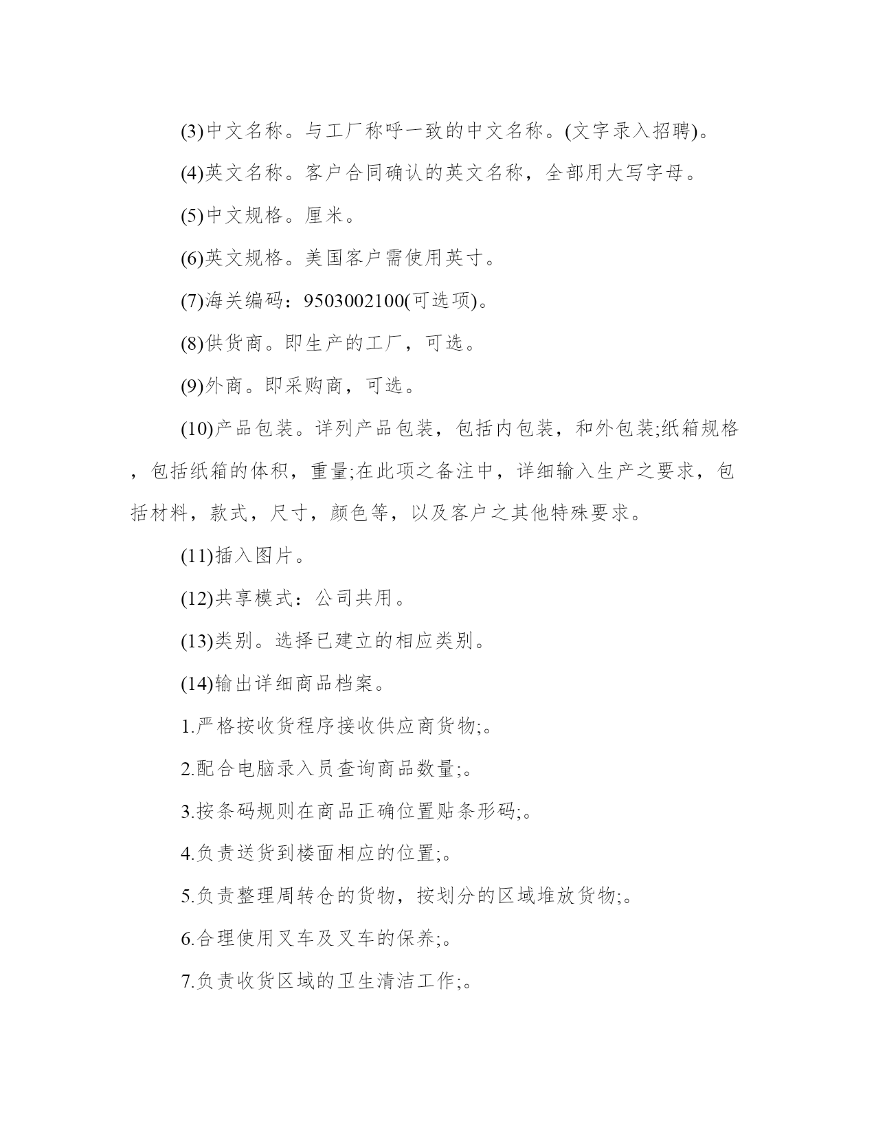数据录入员的内勤工作职责(专业22篇)总结可以帮助我们发现潜在的问题和挑战,从而提前做好准备和应对策略。较为完美的总结应该能够给读者带来启发和思考。总结是一个反思和总结的过程,我们要通过总结来发现问题、解决问题,进一步提高自己的能力和水平。数据录入员的内勤工作职责篇一浅层面来理解数据录入员的职责,那就是把有一些繁杂的数据需要录入整理,想知道更多关于数据录入员的。一、客户、供货商、各类代理信息,以系统要求为准,正确完整录入;。二、商品档案。1、商品的分类。所有商品按外商分类,在外商分类项下,按不同要求进行二级分类,如,美国客户按尺寸分类,其他客户可按年度分类。操作:系统-高级-商品分类。2、商品数据来源。商品数据采集表(附件一,由业务人员和验货人员填写其内容)商品数据录入。3、(1)商品货号。以工厂货号作为商品货号,即公司货号。(2)外商货号。经客户。合同。认可的货号。(3)中文名称。与工厂称呼一致的中文名称。(文字录入招聘)。(4)英文名称。客户合同确认的英文名称,全部用大写字母。(5)中文规格。厘米。(6)英文规格。美国客户需使用英寸。(7)海关编码:9503002100(可选项)。(8)供货商。即生产的工厂,可选。(9)外商。即采购商,可选。(10)产品包装。详列产品包装,包括内包装,和外包装;纸箱规格,包括纸箱的体积,重量;在此项之备注中,详细输入生产之要求,包括材料,款式,尺寸,颜色等,以及客户之其他特殊要求。(11)插入图片。(12)共享模式:公司共用。(13)类别。选择已建立的相应类别。(14)输出详细商品档案。1.严格按收货程序接收供应商货物;。2.配合电脑录入员查询商品数量;。3.按条码规则在商品正确位置贴条形码;。4.负责送货到楼面相应的位置;。5.负责整理周转仓的货物,按划分的区域堆放货物;。6.合理使用叉车及叉车的保养;。7.负责收货区域的卫生清洁工作;。8.指导或帮助供应商卸货;。9.执行退货工作;。10.指挥车辆停放,指导货物码放。第一条、为了保障阳光农廉网的安全运行,规范操作人员行为,特制定如下制度。第四条、操作员应爱护计算机设备,并负责所使用设备的日常维护及保养。第五条、操作员未经许可,不得更换电脑硬件和软件,拒绝使用来历不明的软件和光盘。、第七条、电脑出现病毒,操作人员不能杀除的,须及时报中心网络管理员处理。数据录入员的内勤工作职责篇二职责:1.负责区域所辖城市的汇总收集工作;。2.负责合同填写规范的培训、审核及合同的归档管理;。3.协助大区经理各项会议的组织及对会议决定进行跟踪、反馈;。4.销售对接支持:1)协助大区经理完成各类报表、数据的收集、录入、汇总;。2)产品各类问题、需求的收集、解答及向上反馈和跟进进度;。3)统计、跟进分站合作客户服务费用情况;。5.协助大区经理做好分站团队建设;。6、完成上级领导交办其他事项。任职资格:教育背景:大专以上学历,电子商务、市场营销、企业管理等相关专业优先。工作经验:一年以上工作经验,有销售助理、运营助理、销售外勤岗位经验,有数据处理能力,互联网产品运营经验优先。知识/技能:2、熟练使用打印机等办公设备;。3、具备较强的学习能力和优秀的沟通能力,具有客户服务意识和团队精神;。其他要求:积极主动的工作态度和责任心,做事细心、有条理且富有责任感。数据录入员的内勤工作职责篇三职责:1、订单的处理,协助发货,对于货款,票据的相关处理及台账管理。2、做好销售单据开据,验收,及时反馈客户信息记录客户需求工作;。3、协助财务部进行应收应付款的核对工作;统计上报销售数据督促销售部门业务人员追缴货款等。6、给库管培训防伪溯源扫码系统的操作使用,及与各厂商沟通解决相关故障问题。7、售后服务,对于客户得相关发货进行追踪并反馈发货中的相关问题。9、协助主管完善部门规章制度和操作流程与规范,做好销售的后台支持;。10、服从领导的其他工作安排。任职要求:1、大专及以上学历、熟练掌握数据分析以及函数公式;。2、具有良好的协调和沟通能力,良好的应变、逻辑思维能力和行动力;。3、富有亲和力、能吃苦耐劳,有一定的社会阅历和沟通能力;。4、敬业、细心,有责任感,思维清晰,有团队合作精神和执行力,较强的责任感;。5、有相关内勤工作经验者2年以上优先考虑,有医美行业单位工作经验者优先考虑。数据录入员的内勤工作职责篇四职责:1、负责来访客户的接待;。2、商务信息的收集、整理、分类,对项目信息时时跟踪;。3、协助业务部门接发传真、收发邮件、报价、制作标书等工作;。4、负责商务合同的履行,及时协调和协助解决出现的商务问题;。6、领导交办的其他临