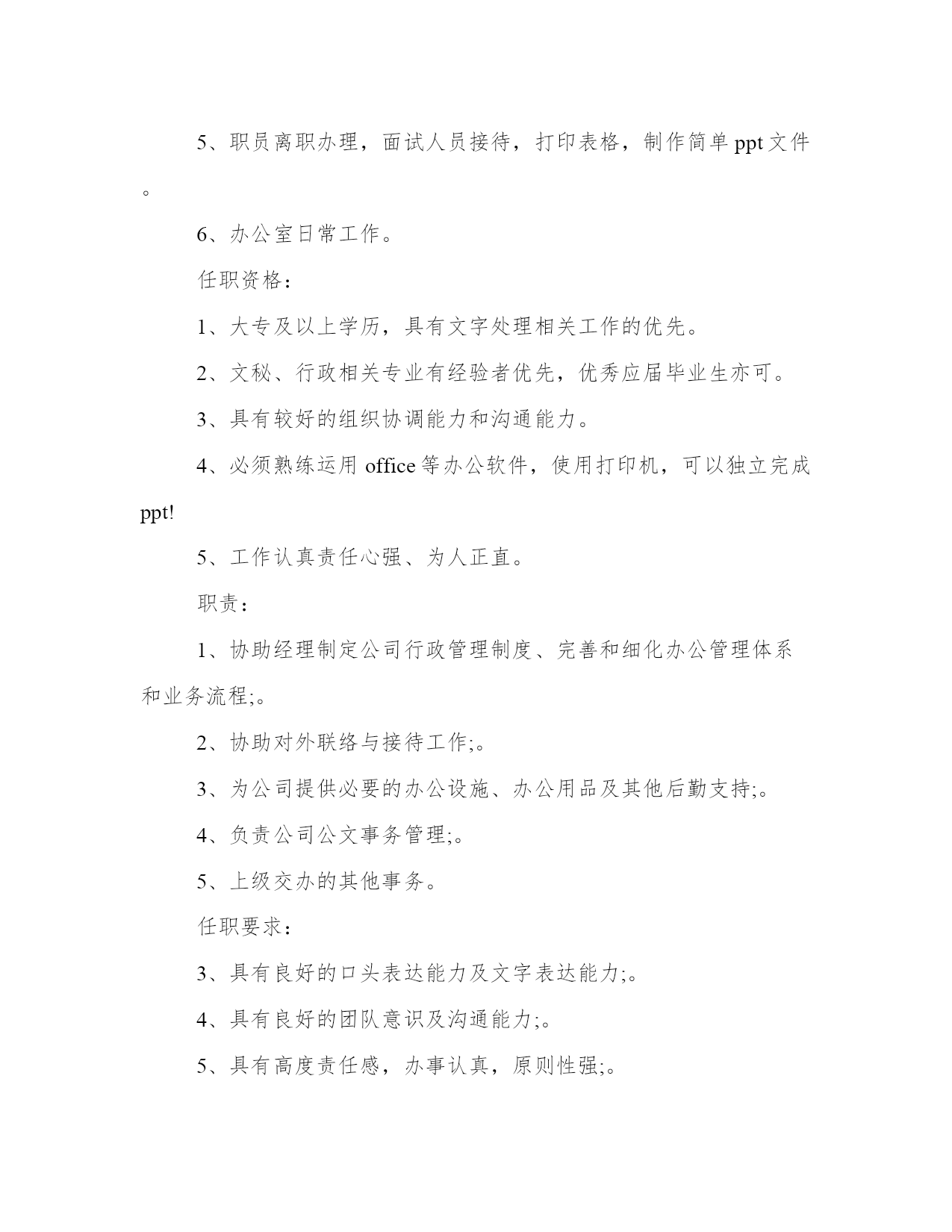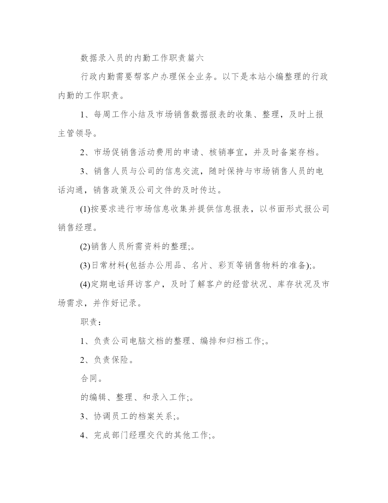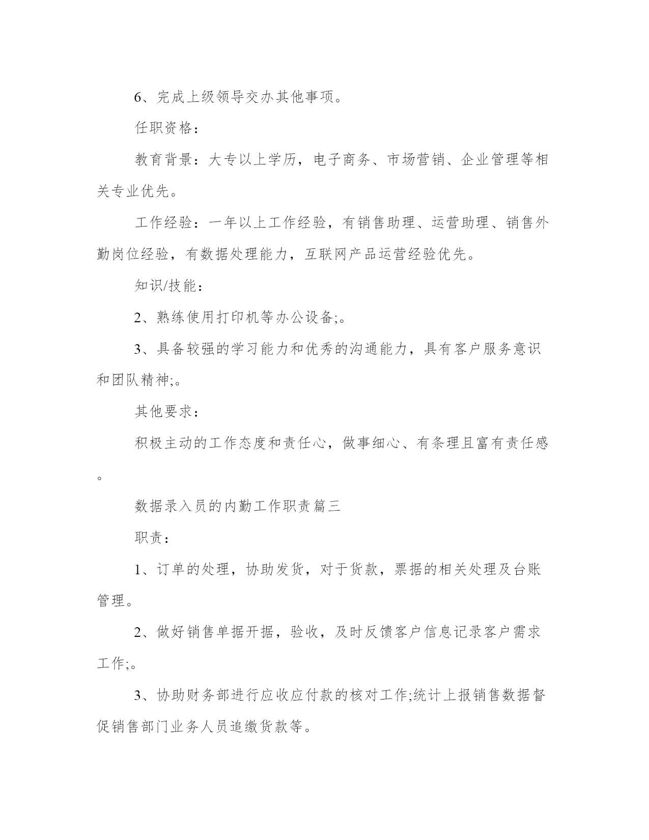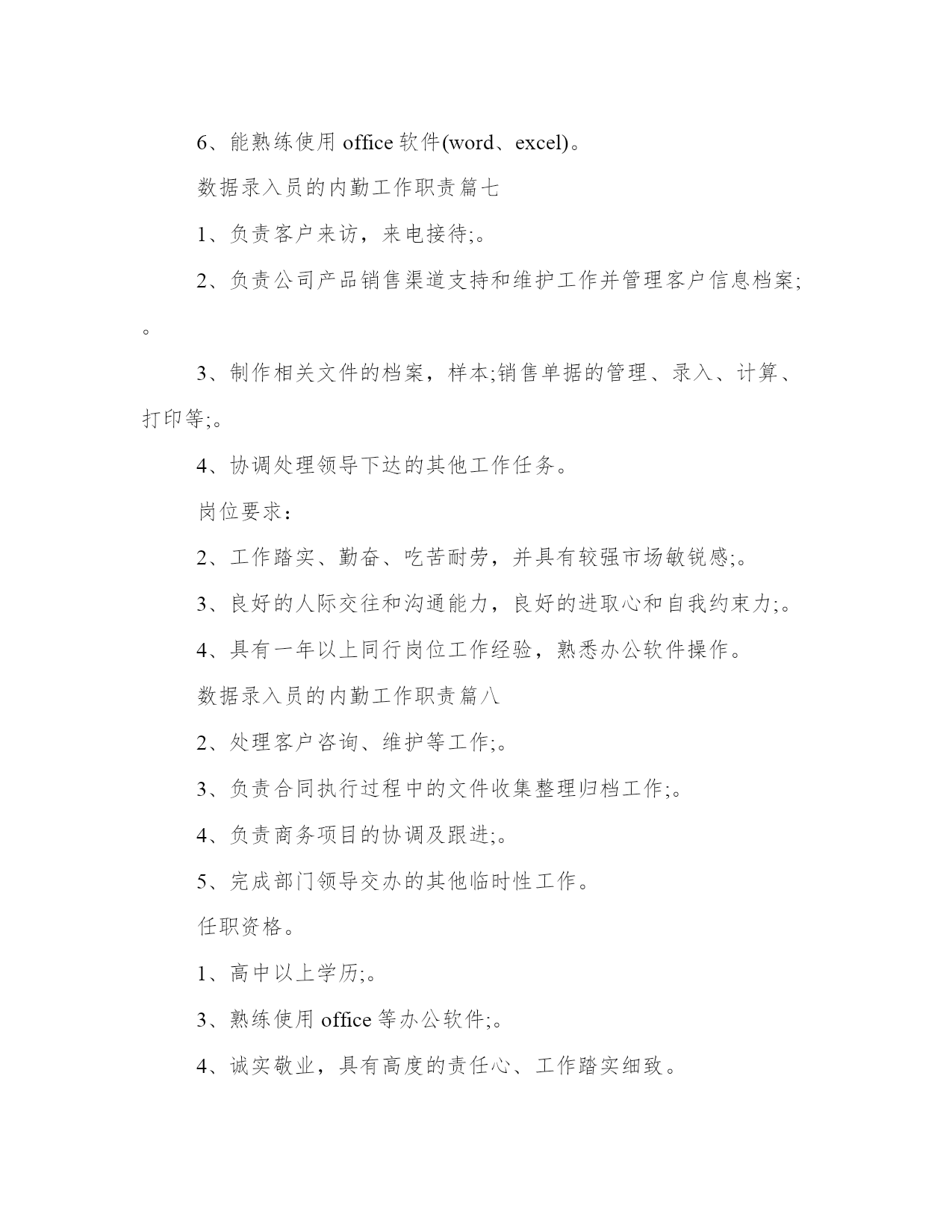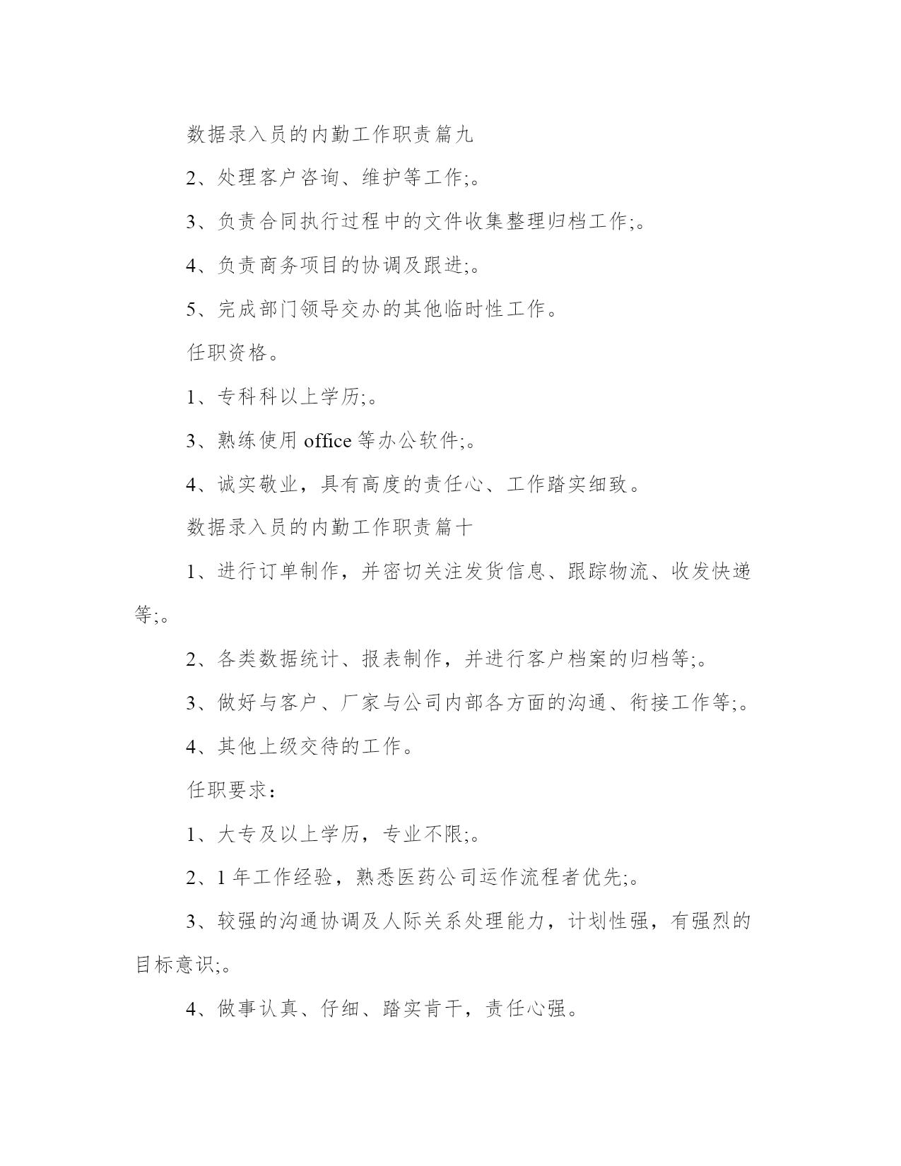 数据录入员的内勤工作职责(专业22篇)总结可以帮助我们发现潜在的问题和挑战,从而提前做好准备和应对策略。较为完美的总结应该能够给读者带来启发和思考。总结是一个反思和总结的过程,我们要通过总结来发现问题、解决问题,进一步提高自己的能力和水平。数据录入员的内勤工作职责篇一浅层面来理解数据录入员的职责,那就是把有一些繁杂的数据需要录入整理,想知道更多关于数据录入员的。一、客户、供货商、各类代理信息,以系统要求为准,正确完整录入;。二、商品档案。1、商品的分类。所有商品按外商分类,在外商分类项下,按不同要求进行二级分类,如,美国客户按尺寸分类,其他客户可按年度分类。操作:系统-高级-商品分类。2、商品数据来源。商品数据采集表(附件一,由业务人员和验货人员填写其内容)商品数据录入。3、(1)商品货号。以工厂货号作为商品货号,即公司货号。(2)外商货号。经客户。合同。认可的货号。(3)中文名称。与工厂称呼一致的中文名称。(文字录入招聘)。(4)英文名称。客户合同确认的英文名称,全部用大写字母。(5)中文规格。厘米。(6)英文规格。美国客户需使用英寸。(7)海关编码:9503002100(可选项)。(8)供货商。即生产的工厂,可选。(9)外商。即采购商,可选。(10)产品包装。详列产品包装,包括内包装,和外包装;纸箱规格,包括纸箱的体积,重量;在此项之备注中,详细输入生产之要求,包括材料,款式,尺寸,颜色等,以及客户之其他特殊要求。(11)插入图片。(12)共享模式:公司共用。(13)类别。选择已建立的相应类别。(14)输出详细商品档案。1.严格按收货程序接收供应商货物;。2.配合电脑录入员查询商品数量;。3.按条码规则在商品正确位置贴条形码;。4.负责送货到楼面相应的位置;。5.负责整理周转仓的货物,按划分的区域堆放货物;。6.合理使用叉车及叉车的保养;。7.负责收货区域的卫生清洁工作;。8.指导或帮助供应商卸货;。9.执行退货工作;。10.指挥车辆停放,指导货物码放。第一条、为了保障阳光农廉网的安全运行,规范操作人员行为,特制定如下制度。第四条、操作员应爱护计算机设备,并负责所使用设备的日常维护及保养。第五条、操作员未经许可,不得更换电脑硬件和软件,拒绝使用来历不明的软件和光盘。、第七条、电脑出现病毒,操作人员不能杀除的,须及时报中心网络管理员处理。数据录入员的内勤工作职责篇二职责:1.负责区域所辖城市的汇总收集工作;。2.负责合同填写规范的培训、审核及合同的归档管理;。3.协助大区经理各项会议的组织及对会议决定进行跟踪、反馈;。4.销售对接支持:1)协助大区经理完成各类报表、数据的收集、录入、汇总;。2)产品各类问题、需求的收集、解答及向上反馈和跟进进度;。3)统计、跟进分站合作客户服务费用情况;。5.协助大区经理做好分站团队建设;。6、完成上级领导交办其他事项。任职资格:教育背景:大专以上学历,电子商务、市场营销、企业管理等相关专业优先。工作经验:一年以上工作经验,有销售助理、运营助理、销售外勤岗位经验,有数据处理能力,互联网产品运营经验优先。知识/技能:2、熟练使用打印机等办公设备;。3、具备较强的学习能力和优秀的沟通能力,具有客户服务意识和团队精神;。其他要求:积极主动的工作态度和责任心,做事细心、有条理且富有责任感。数据录入员的内勤工作职责篇三职责:1、订单的处理,协助发货,对于货款,票据的相关处理及台账管理。2、做好销售单据开据,验收,及时反馈客户信息记录客户需求工作;。3、协助财务部进行应收应付款的核对工作;统计上报销售数据督促销售部门业务人员追缴货款等。6、给库管培训防伪溯源扫码系统的操作使用,及与各厂商沟通解决相关故障问题。7、售后服务,对于客户得相关发货进行追踪并反馈发货中的相关问题。9、协助主管完善部门规章制度和操作流程与规范,做好销售的后台支持;。10、服从领导的其他工作安排。任职要求:1、大专及以上学历、熟练掌握数据分析以及函数公式;。2、具有良好的协调和沟通能力,良好的应变、逻辑思维能力和行动力;。3、富有亲和力、能吃苦耐劳,有一定的社会阅历和沟通能力;。4、敬业、细心,有责任感,思维清晰,有团队合作精神和执行力,较强的责任感;。5、有相关内勤工作经验者2年以上优先考虑,有医美行业单位工作经验者优先考虑。数据录入员的内勤工作职责篇四职责:1、负责来访客户的接待;。2、商务信息的收集、整理、分类,对项目信息时时跟踪;。3、协助业务部门接发传真、收发邮件、报价、制作标书等工作;。4、负责商务合同的履行,及时协调和协助解决出现的商务问题;。6、领导交办的其他临