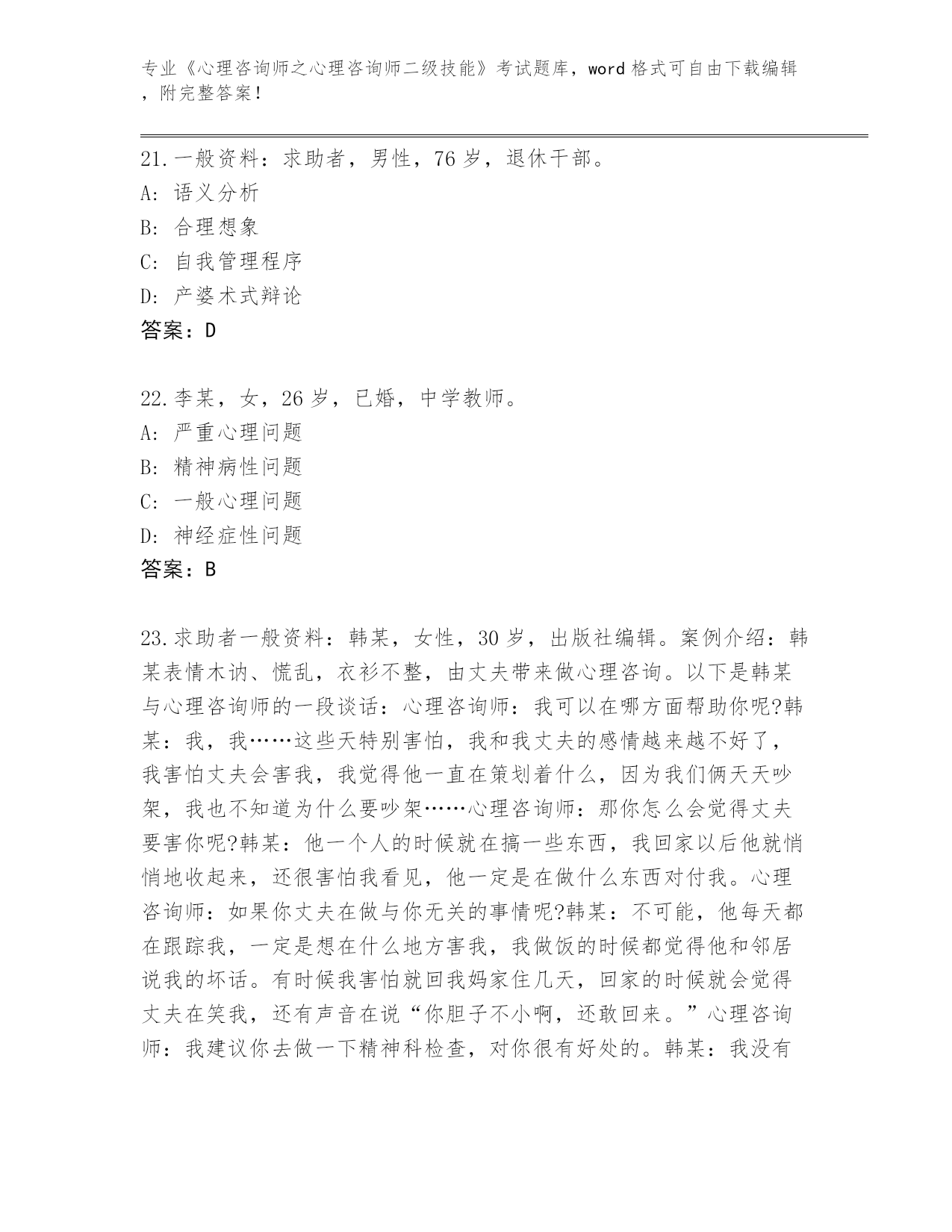 河北省沧县2024《心理咨询师之心理咨询师二级技能》考试必刷200题大全及答案(各地真题)