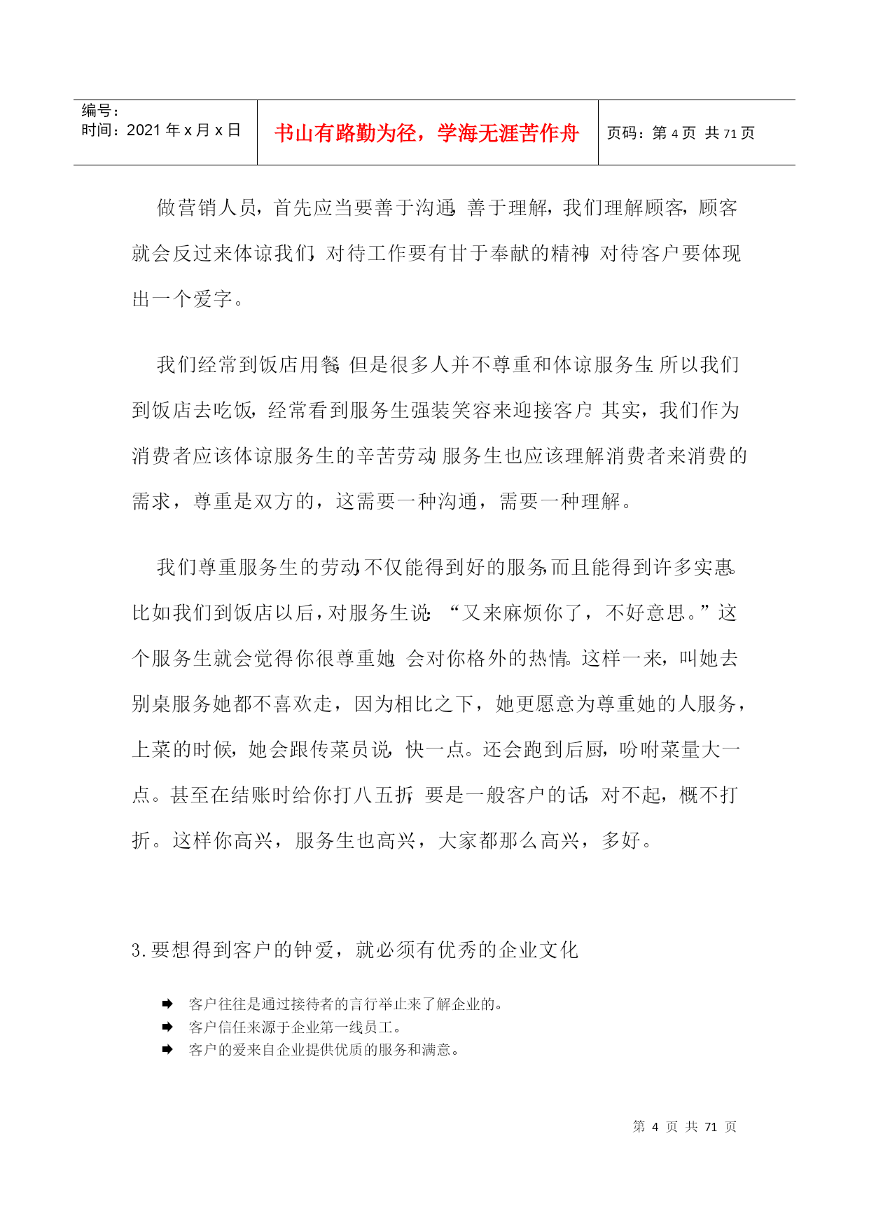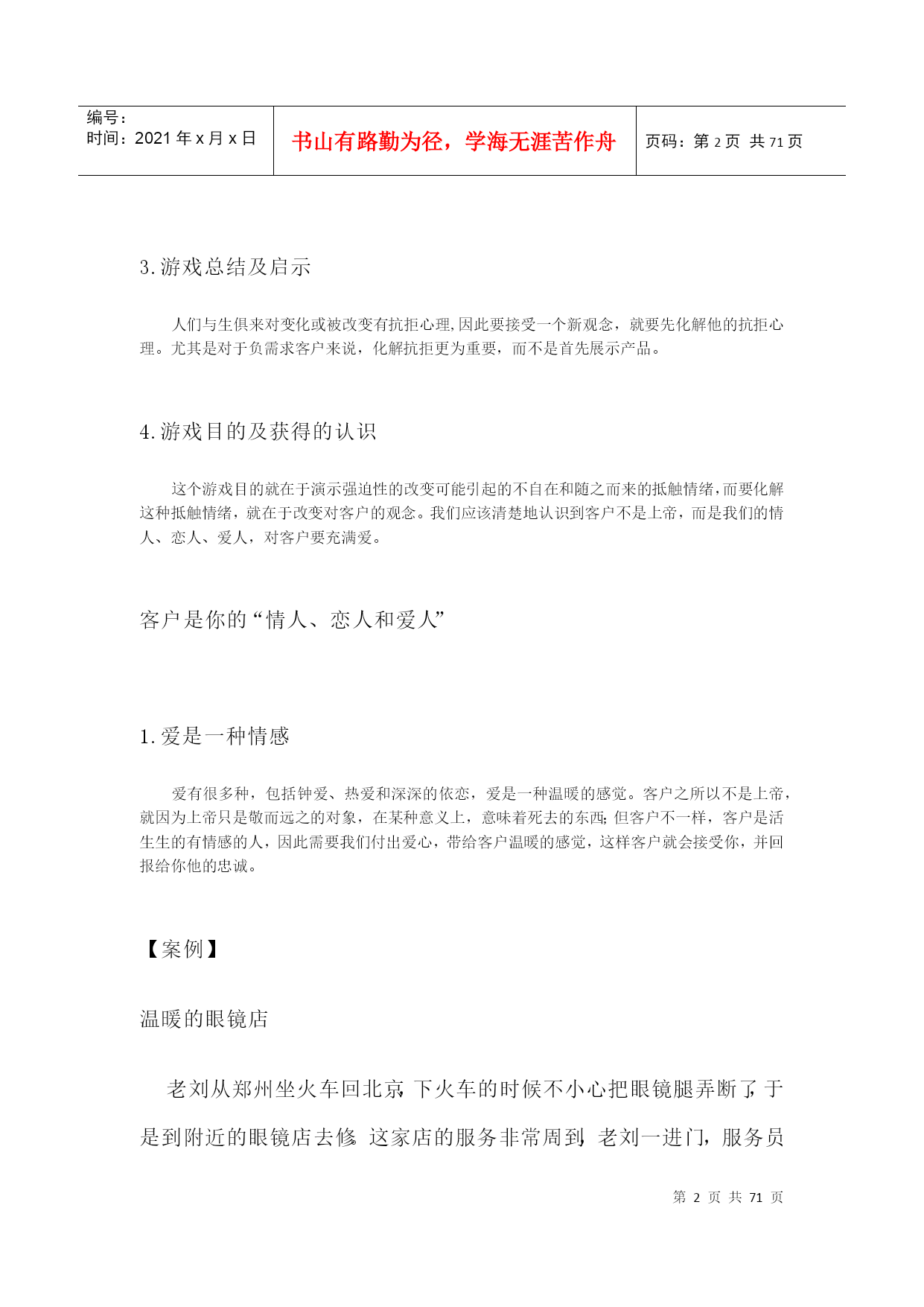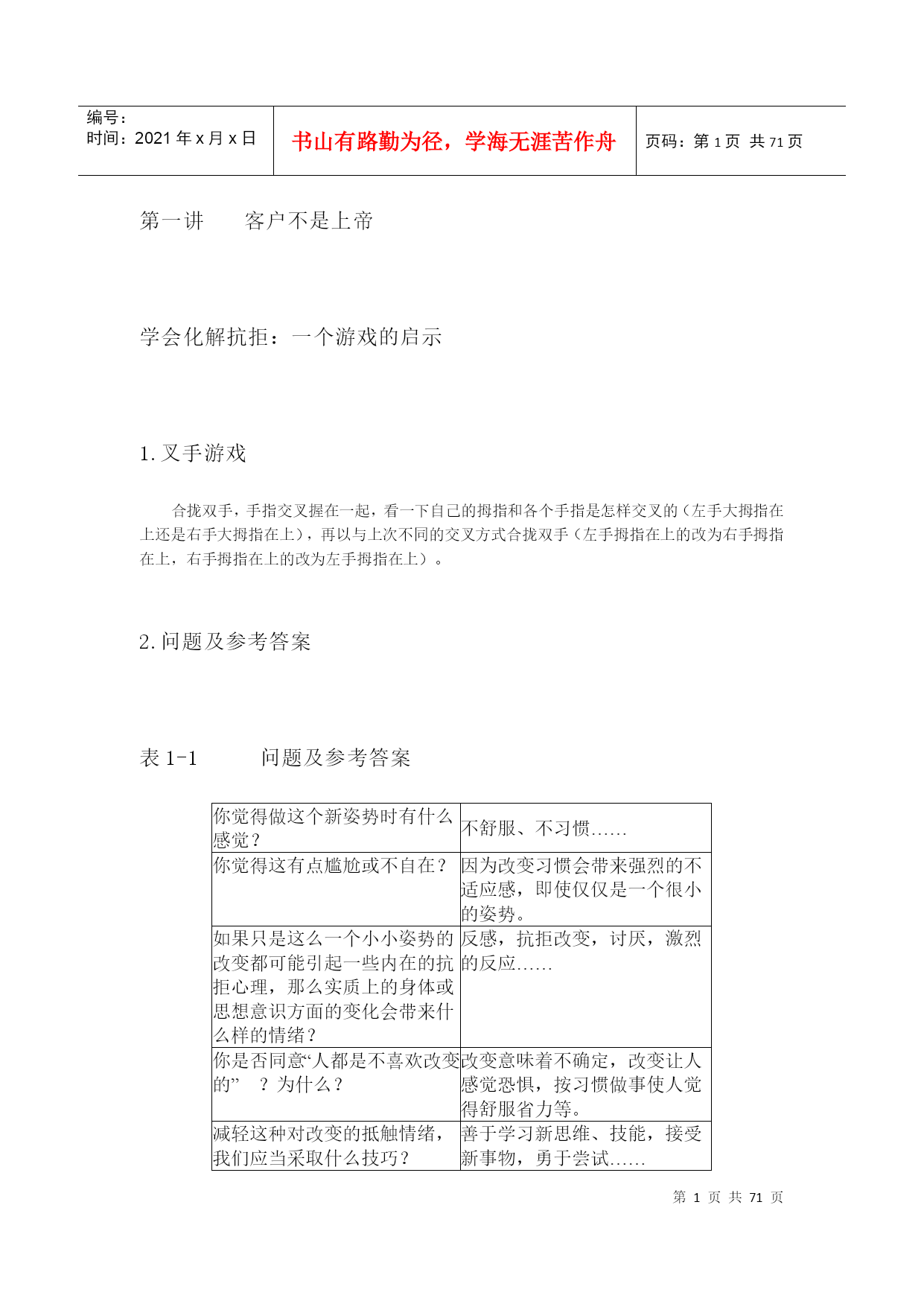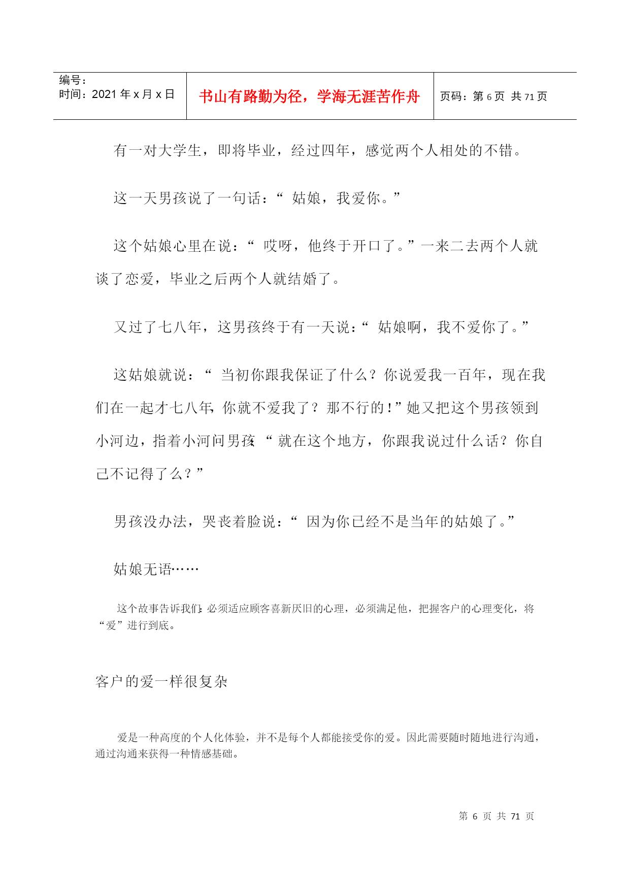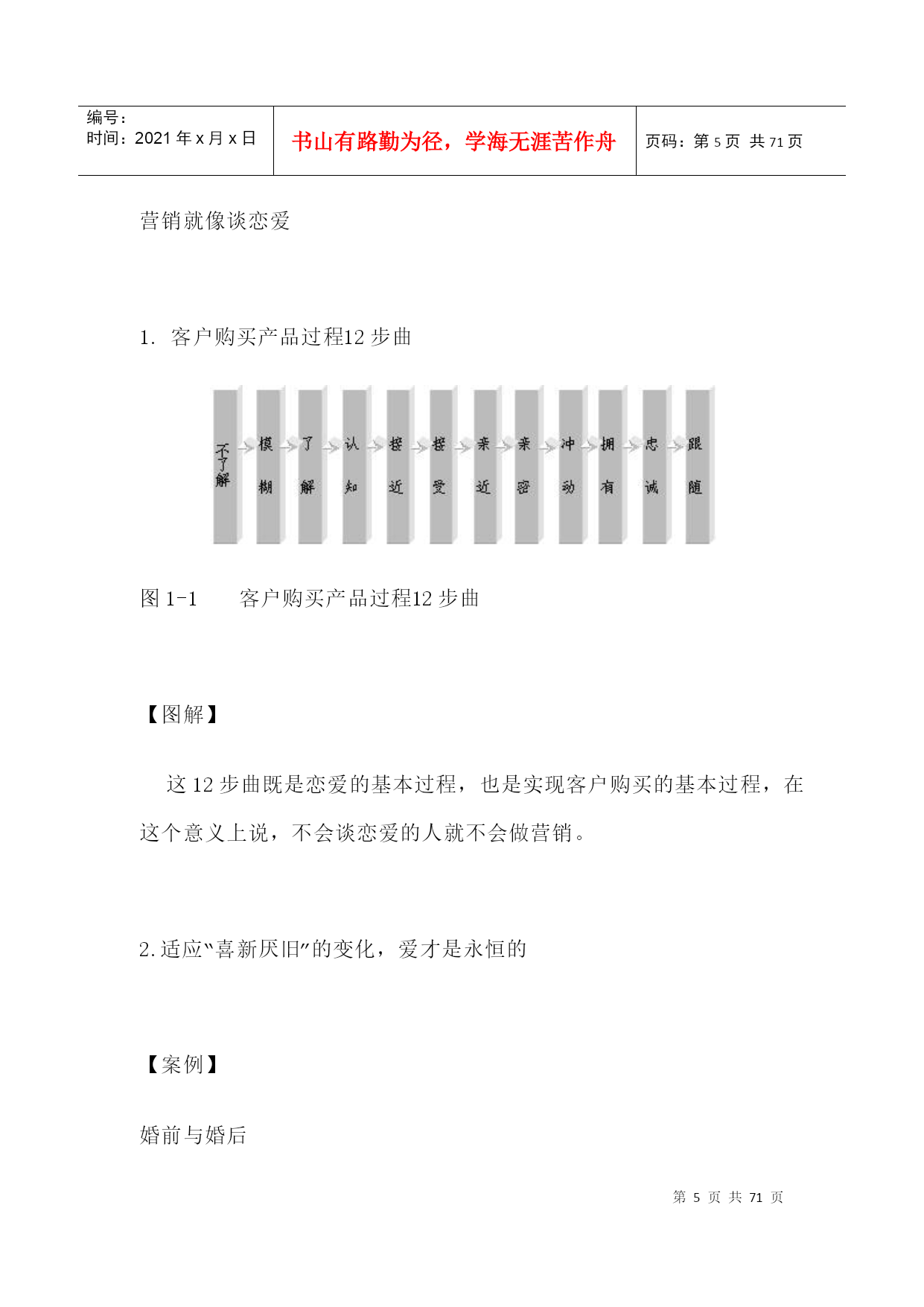 编号:时间:2021年x月x日书山有路勤为径,学海无涯苦作舟页码:第PAGE71页共NUMPAGES71页第PAGE\*MERGEFORMAT71页共NUMPAGES\*MERGEFORMAT71页第一讲客户不是上帝学会化解抗拒:一个游戏的启示1.叉手游戏合拢双手,手指交叉握在一起,看一下自己的拇指和各个手指是怎样交叉的(左手大拇指在上还是右手大拇指在上),再以与上次不同的交叉方式合拢双手(左手拇指在上的改为右手拇指在上,右手拇指在上的改为左手拇指在上)。2.问题及参考答案表1-1问题及参考答案你觉得做这个新姿势时有什么感觉?不舒服、不习惯……你觉得这有点尴尬或不自在?因为改变习惯会带来强烈的不适应感,即使仅仅是一个很小的姿势。如果只是这么一个小小姿势的改变都可能引起一些内在的抗拒心理,那么实质上的身体或思想意识方面的变化会带来什么样的情绪?反感,抗拒改变,讨厌,激烈的反应……你是否同意“人都是不喜欢改变的”?为什么?改变意味着不确定,改变让人感觉恐惧,按习惯做事使人觉得舒服省力等。减轻这种对改变的抵触情绪,我们应当采取什么技巧?善于学习新思维、技能,接受新事物,勇于尝试……3.游戏总结及启示人们与生俱来对变化或被改变有抗拒心理,因此要接受一个新观念,就要先化解他的抗拒心理。尤其是对于负需求客户来说,化解抗拒更为重要,而不是首先展示产品。4.游戏目的及获得的认识这个游戏目的就在于演示强迫性的改变可能引起的不自在和随之而来的抵触情绪,而要化解这种抵触情绪,就在于改变对客户的观念。我们应该清楚地认识到客户不是上帝,而是我们的情人、恋人、爱人,对客户要充满爱。客户是你的“情人、恋人和爱人”1.爱是一种情感爱有很多种,包括钟爱、热爱和深深的依恋,爱是一种温暖的感觉。客户之所以不是上帝,就因为上帝只是敬而远之的对象,在某种意义上,意味着死去的东西;但客户不一样,客户是活生生的有情感的人,因此需要我们付出爱心,带给客户温暖的感觉,这样客户就会接受你,并回报给你他的忠诚。【案例】温暖的眼镜店老刘从郑州坐火车回北京,下火车的时候不小心把眼镜腿弄断了,于是到附近的眼镜店去修。这家店的服务非常周到,老刘一进门,服务员就马上请他坐下,并递上一杯水,担心老刘等待的时候寂寞,又陪着老刘聊天,几分钟修好以后,老刘戴了戴,还是有点不舒服,就再次拿去修……就这样反复戴,反复修,大概有四五次,最后修好了,一戴很合适,老刘心里很高兴,心想这家店的服务很周到,一定很贵吧?一问,人家却说免费。这样的服务居然免费?老刘突然感觉外面下了那么大雪,心里却暖乎乎的,因为这种服务会让每一位顾客都很满意。老刘带了20多年眼镜,第一次享受这种免费服务,这种感觉就和平常很不一样,这家眼镜店给了老刘很好的印象。后来老刘向很多人介绍这家店,推荐这家店的服务,而且老刘觉得以后要再买眼镜的时候,首先要到这家店里去买,要把这个人情还回去。这种感情,这种温暖,使老刘感觉到他们把顾客就当成亲人。其实,只要营造出温暖的氛围,客户就会喜欢来。要相信爱,就算你的爱碰到了麻烦,也要一如既往地去爱。对爱的信心会帮助我们渡过一切难关,让你直达成功的彼岸。如果我们能从爱的角度去处理客户关系,就不会被客户冷落,就能充分享受服务的乐趣,有时甚至还能感受到客户的忠诚。2.营销是一种沟通,爱是一种奉献和理解【案例】尊重饭店服务生做营销人员,首先应当要善于沟通,善于理解,我们理解顾客,顾客就会反过来体谅我们,对待工作要有甘于奉献的精神,对待客户要体现出一个爱字。我们经常到饭店用餐,但是很多人并不尊重和体谅服务生,所以我们到饭店去吃饭,经常看到服务生强装笑容来迎接客户。其实,我们作为消费者应该体谅服务生的辛苦劳动,服务生也应该理解消费者来消费的需求,尊重是双方的,这需要一种沟通,需要一种理解。我们尊重服务生的劳动,不仅能得到好的服务,而且能得到许多实惠。比如我们到饭店以后,对服务生说:“又来麻烦你了,不好意思。”这个服务生就会觉得你很尊重她,会对你格外的热情。这样一来,叫她去别桌服务她都不喜欢走,因为相比之下,她更愿意为尊重她的人服务,上菜的时候,她会跟传菜员说,快一点。还会跑到后厨,吩咐菜量大一点。甚至在结账时给你打八五折,要是一般客户的话,对不起,概不打折。这样你高兴,服务生也高兴,大家都那么高兴,多好。3.要想得到客户的钟爱,就必须有优秀的企业文化客户往往是通过接待者的言行举止来了解企业的。客户信任来源于企业第一线员工。客户的爱来自企业提供优质的服务和满意。营销就像谈恋爱1.客户购买产品过程12步曲图1-1客户购买产品过程12步曲【图解】这12步曲既是恋爱的基本过程,也是实现客户购