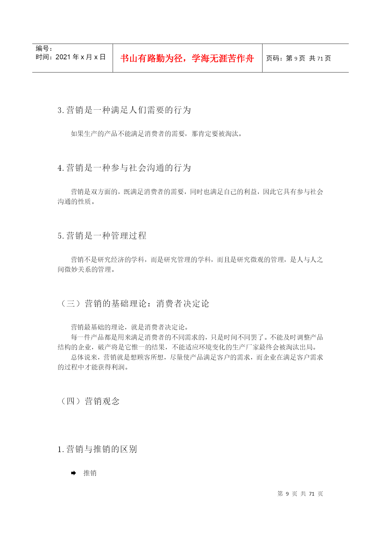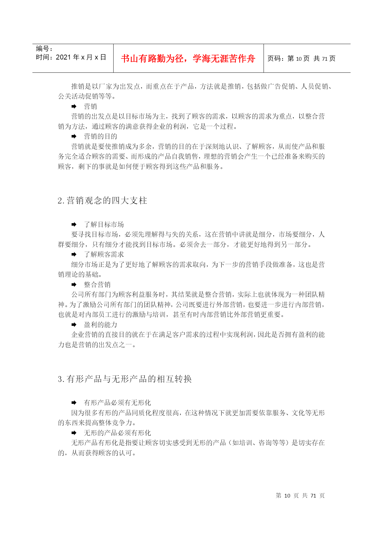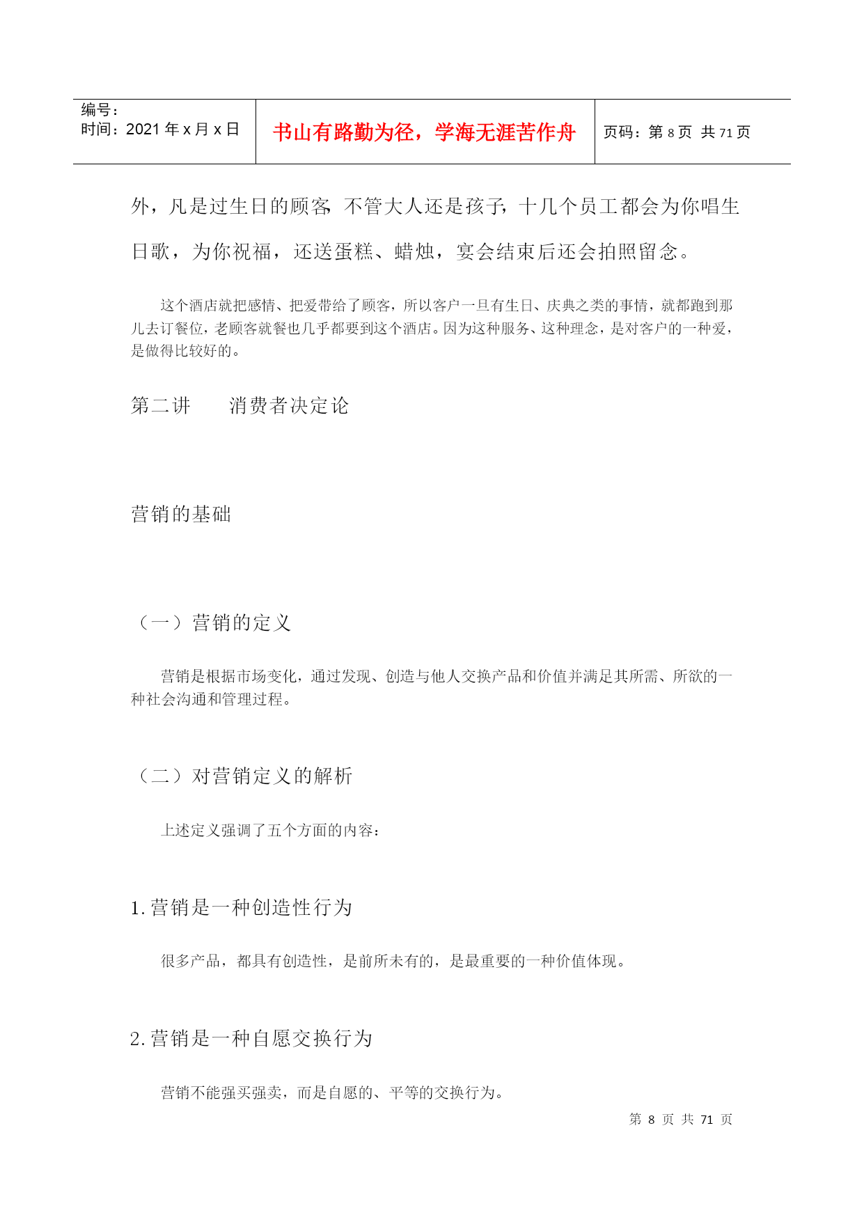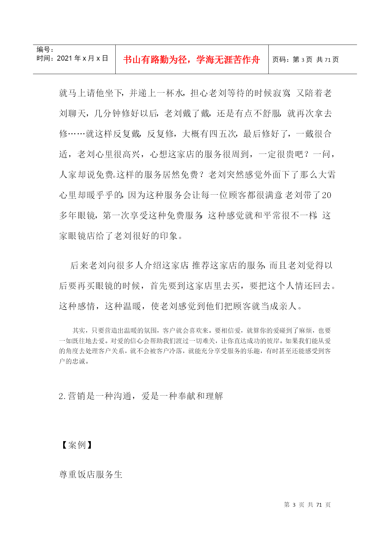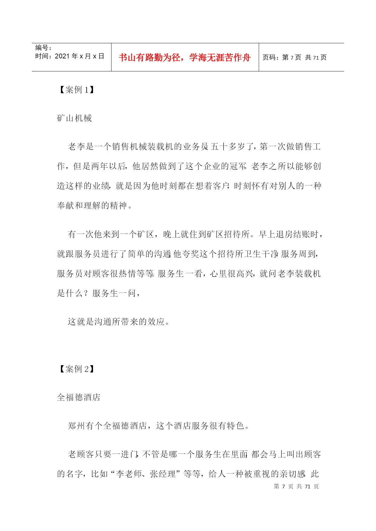 编号:时间:2021年x月x日书山有路勤为径,学海无涯苦作舟页码:第PAGE71页共NUMPAGES71页第PAGE\*MERGEFORMAT71页共NUMPAGES\*MERGEFORMAT71页第一讲客户不是上帝学会化解抗拒:一个游戏的启示1.叉手游戏合拢双手,手指交叉握在一起,看一下自己的拇指和各个手指是怎样交叉的(左手大拇指在上还是右手大拇指在上),再以与上次不同的交叉方式合拢双手(左手拇指在上的改为右手拇指在上,右手拇指在上的改为左手拇指在上)。2.问题及参考答案表1-1问题及参考答案你觉得做这个新姿势时有什么感觉?不舒服、不习惯……你觉得这有点尴尬或不自在?因为改变习惯会带来强烈的不适应感,即使仅仅是一个很小的姿势。如果只是这么一个小小姿势的改变都可能引起一些内在的抗拒心理,那么实质上的身体或思想意识方面的变化会带来什么样的情绪?反感,抗拒改变,讨厌,激烈的反应……你是否同意“人都是不喜欢改变的”?为什么?改变意味着不确定,改变让人感觉恐惧,按习惯做事使人觉得舒服省力等。减轻这种对改变的抵触情绪,我们应当采取什么技巧?善于学习新思维、技能,接受新事物,勇于尝试……3.游戏总结及启示人们与生俱来对变化或被改变有抗拒心理,因此要接受一个新观念,就要先化解他的抗拒心理。尤其是对于负需求客户来说,化解抗拒更为重要,而不是首先展示产品。4.游戏目的及获得的认识这个游戏目的就在于演示强迫性的改变可能引起的不自在和随之而来的抵触情绪,而要化解这种抵触情绪,就在于改变对客户的观念。我们应该清楚地认识到客户不是上帝,而是我们的情人、恋人、爱人,对客户要充满爱。客户是你的“情人、恋人和爱人”1.爱是一种情感爱有很多种,包括钟爱、热爱和深深的依恋,爱是一种温暖的感觉。客户之所以不是上帝,就因为上帝只是敬而远之的对象,在某种意义上,意味着死去的东西;但客户不一样,客户是活生生的有情感的人,因此需要我们付出爱心,带给客户温暖的感觉,这样客户就会接受你,并回报给你他的忠诚。【案例】温暖的眼镜店老刘从郑州坐火车回北京,下火车的时候不小心把眼镜腿弄断了,于是到附近的眼镜店去修。这家店的服务非常周到,老刘一进门,服务员就马上请他坐下,并递上一杯水,担心老刘等待的时候寂寞,又陪着老刘聊天,几分钟修好以后,老刘戴了戴,还是有点不舒服,就再次拿去修……就这样反复戴,反复修,大概有四五次,最后修好了,一戴很合适,老刘心里很高兴,心想这家店的服务很周到,一定很贵吧?一问,人家却说免费。这样的服务居然免费?老刘突然感觉外面下了那么大雪,心里却暖乎乎的,因为这种服务会让每一位顾客都很满意。老刘带了20多年眼镜,第一次享受这种免费服务,这种感觉就和平常很不一样,这家眼镜店给了老刘很好的印象。后来老刘向很多人介绍这家店,推荐这家店的服务,而且老刘觉得以后要再买眼镜的时候,首先要到这家店里去买,要把这个人情还回去。这种感情,这种温暖,使老刘感觉到他们把顾客就当成亲人。其实,只要营造出温暖的氛围,客户就会喜欢来。要相信爱,就算你的爱碰到了麻烦,也要一如既往地去爱。对爱的信心会帮助我们渡过一切难关,让你直达成功的彼岸。如果我们能从爱的角度去处理客户关系,就不会被客户冷落,就能充分享受服务的乐趣,有时甚至还能感受到客户的忠诚。2.营销是一种沟通,爱是一种奉献和理解【案例】尊重饭店服务生做营销人员,首先应当要善于沟通,善于理解,我们理解顾客,顾客就会反过来体谅我们,对待工作要有甘于奉献的精神,对待客户要体现出一个爱字。我们经常到饭店用餐,但是很多人并不尊重和体谅服务生,所以我们到饭店去吃饭,经常看到服务生强装笑容来迎接客户。其实,我们作为消费者应该体谅服务生的辛苦劳动,服务生也应该理解消费者来消费的需求,尊重是双方的,这需要一种沟通,需要一种理解。我们尊重服务生的劳动,不仅能得到好的服务,而且能得到许多实惠。比如我们到饭店以后,对服务生说:“又来麻烦你了,不好意思。”这个服务生就会觉得你很尊重她,会对你格外的热情。这样一来,叫她去别桌服务她都不喜欢走,因为相比之下,她更愿意为尊重她的人服务,上菜的时候,她会跟传菜员说,快一点。还会跑到后厨,吩咐菜量大一点。甚至在结账时给你打八五折,要是一般客户的话,对不起,概不打折。这样你高兴,服务生也高兴,大家都那么高兴,多好。3.要想得到客户的钟爱,就必须有优秀的企业文化客户往往是通过接待者的言行举止来了解企业的。客户信任来源于企业第一线员工。客户的爱来自企业提供优质的服务和满意。营销就像谈恋爱1.客户购买产品过程12步曲图1-1客户购买产品过程12步曲【图解】这12步曲既是恋爱的基本过程,也是实现客户购