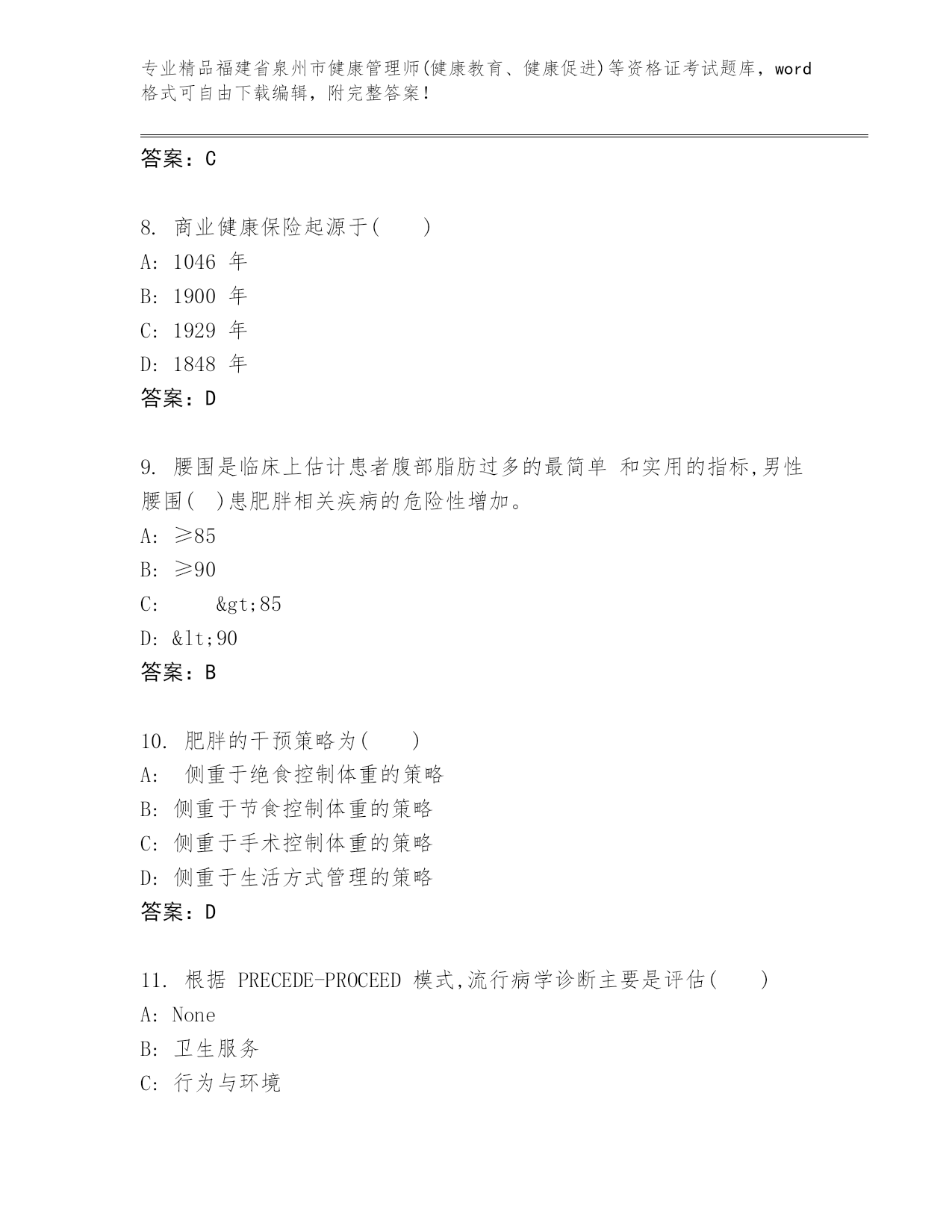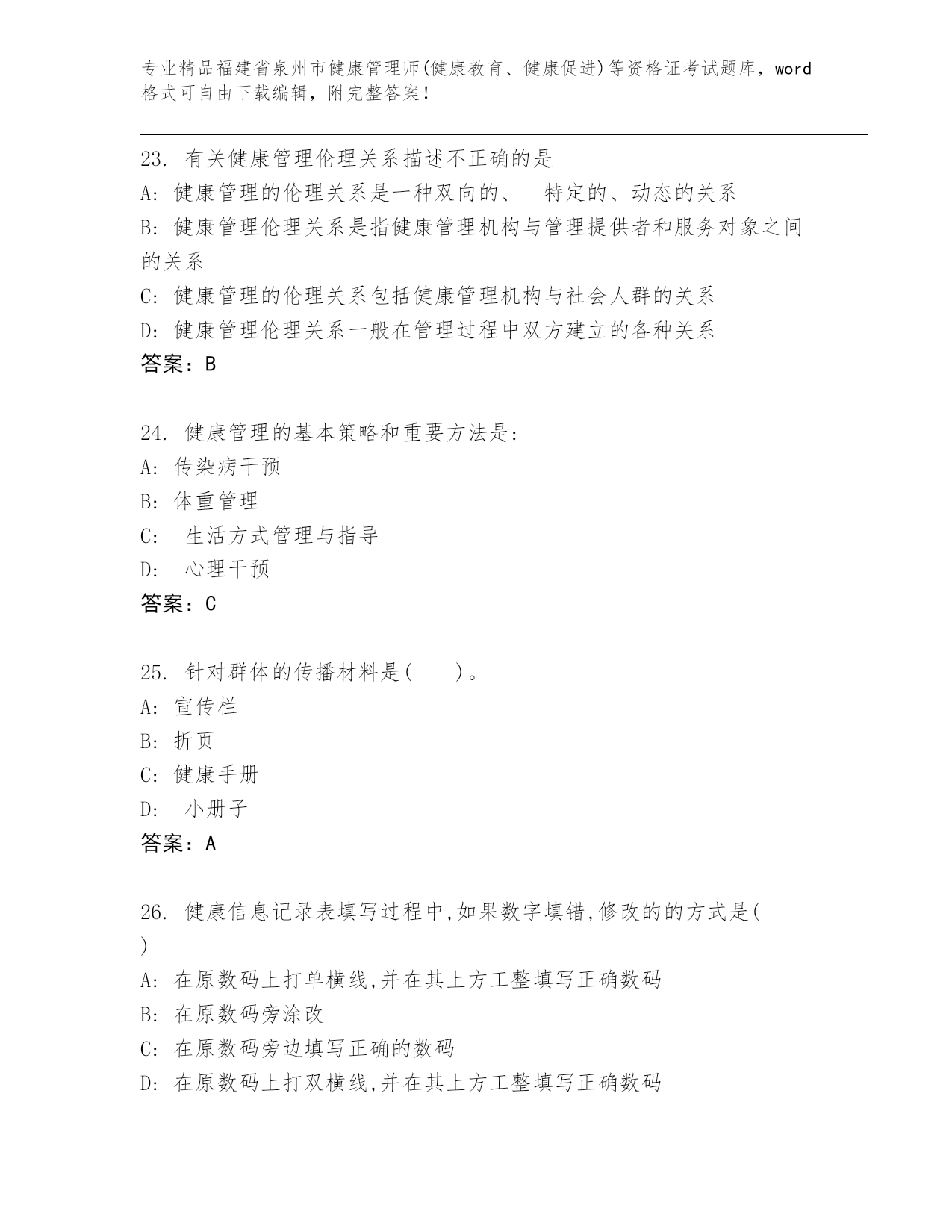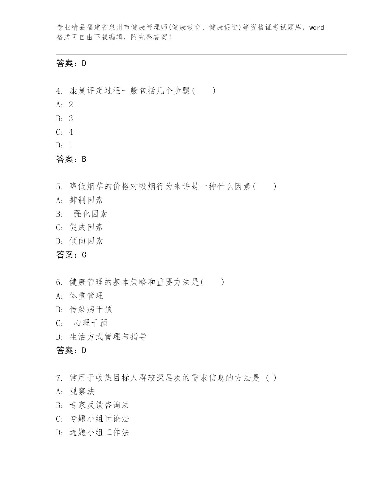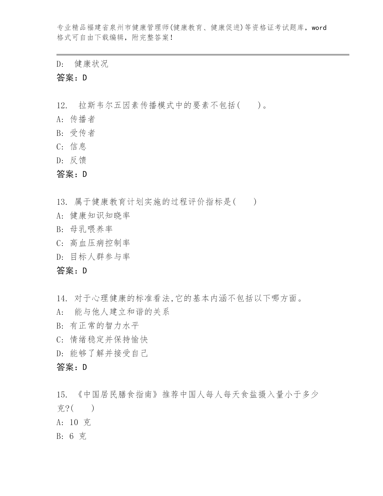 精品福建省泉州市健康管理师(健康教育、健康促进)等资格证考试通用题库【精选题】