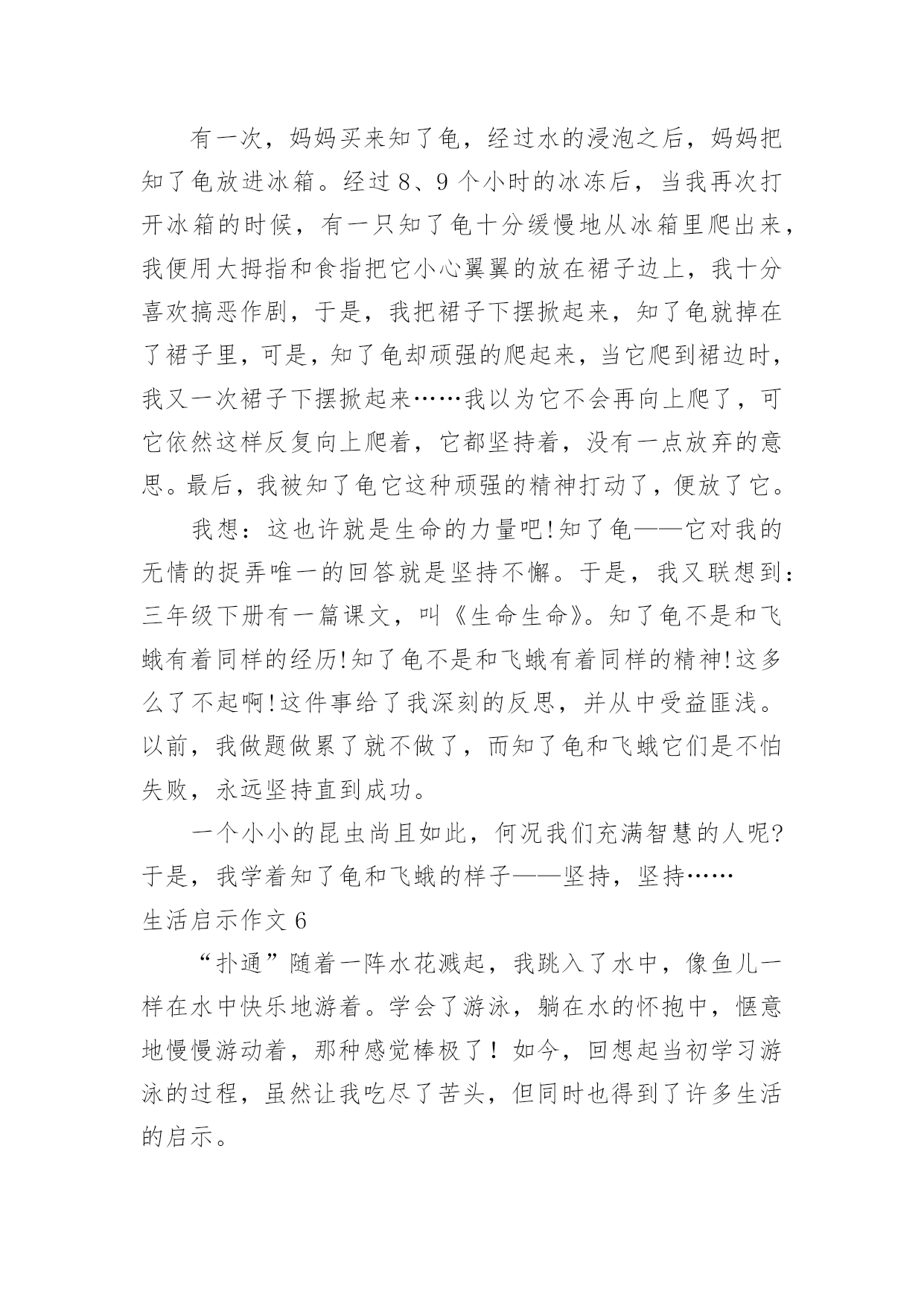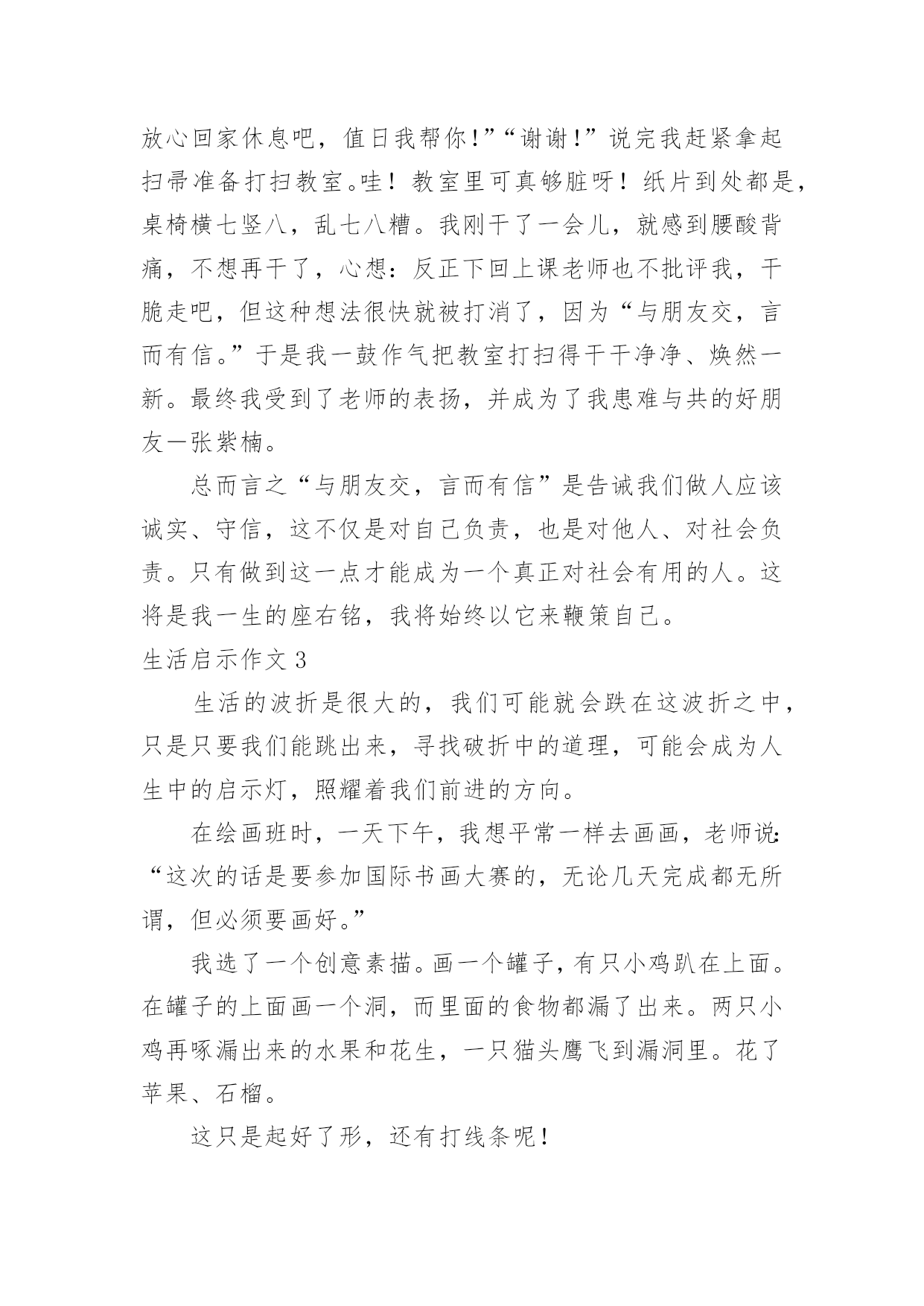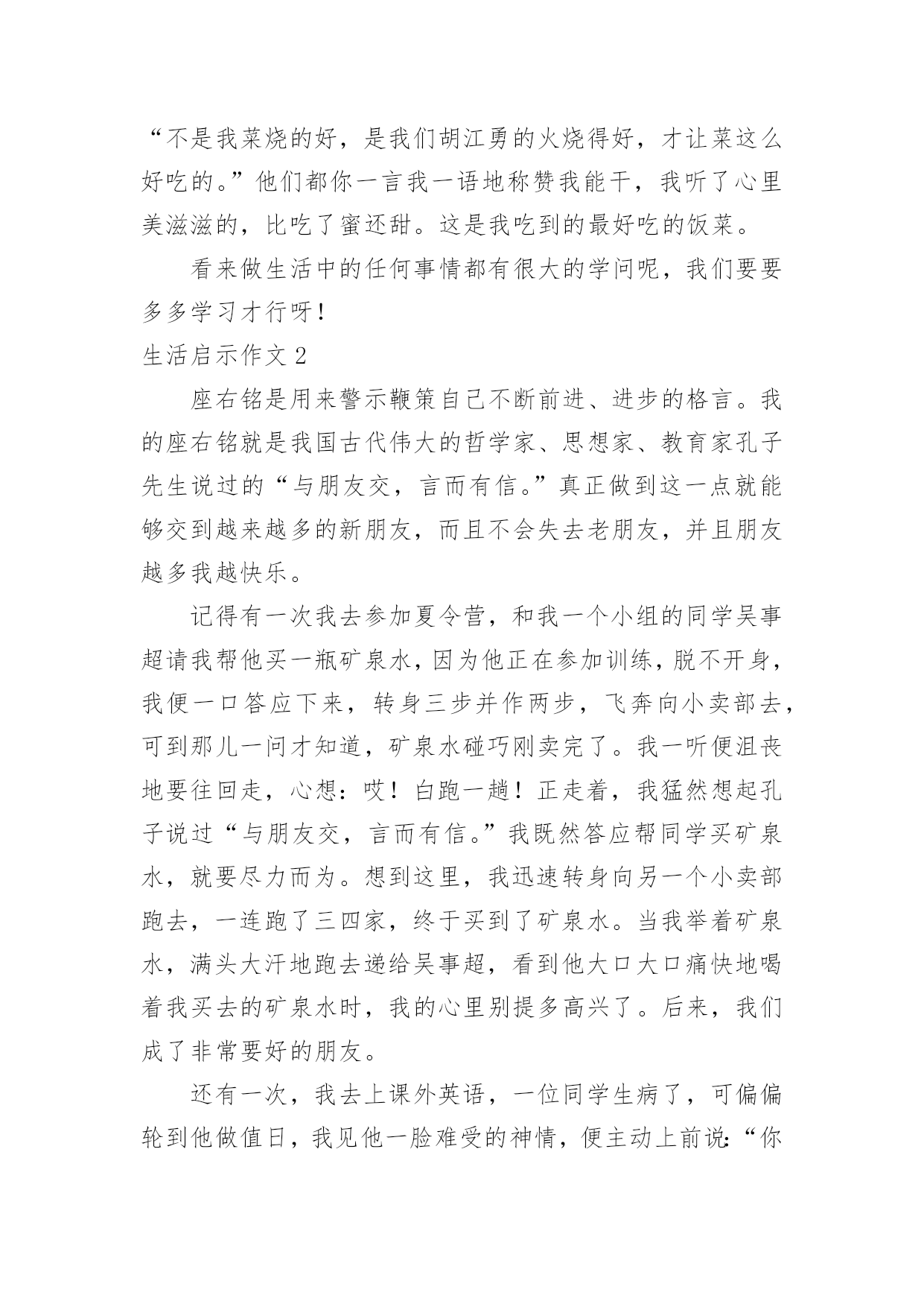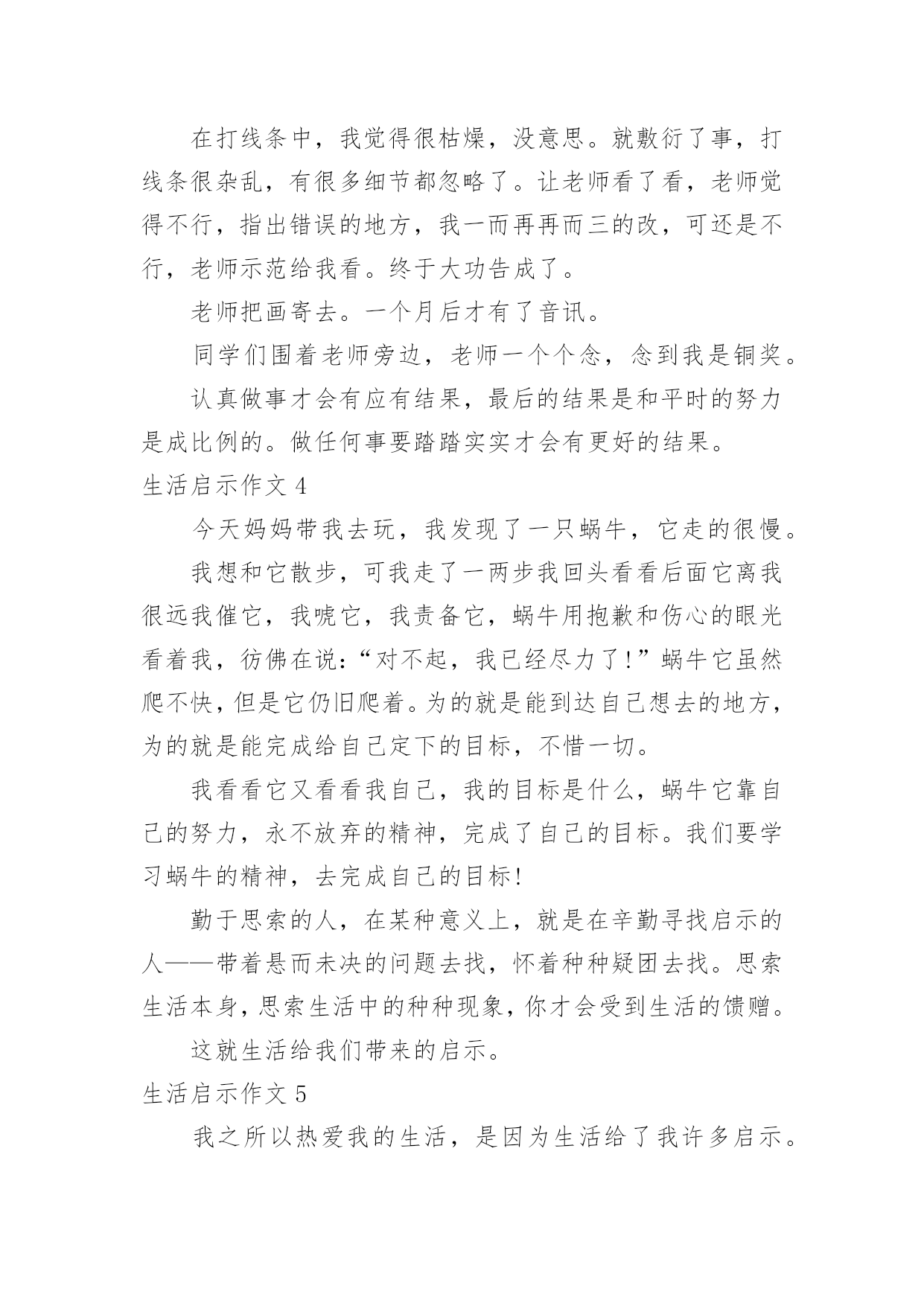 生活启示作文生活启示作文生活启示作文1要过年,一家人都很忙。爸爸他们在搬家具,整理房屋。妈妈在烧年夜饭。我自告奋勇去帮忙,对妈妈说:“妈妈,你炒菜,我来帮你烧火吧!”妈妈高兴地说:“好呀,我正缺个帮手呢。”看到火不是很旺,我不停地把柴火往灶肚里塞,一下子把灶嘴堵满了,火快要灭了,烟不停地往外冒,把我呛得眼泪直流,不断咳嗽。妈妈看了看,对我说:“你是把柴火放得太多。柴放多了,就像人嘴里多吃了东西一样,拌不过来,当然也嚼不动,更不容易消化呀!你应该等一些柴火烧完了,再放一些进去。并且要把柴火底下挖空,这样它才能充分燃烧,火才会旺。”说着,就帮我把多余的柴火取了出来,还把剩下的柴火下面拨空。果然,不一会儿,火又旺了起来。原来,烧火还有这么多学问呢!真让我大开眼界。我学着妈妈的方法做,火一直烧得很旺。要炒花生米了,妈妈对我说:“炒花生米的时候,火不能太大,要不然会把花生米烧焦的,这样就不好吃了。”我照妈妈说的去做,少放了一些柴火,火烧得正好。妈妈炒了很多菜。吃晚饭时,一家人都夸妈妈的菜烧得好。妈妈笑着说:“不是我菜烧的好,是我们胡江勇的火烧得好,才让菜这么好吃的。”他们都你一言我一语地称赞我能干,我听了心里美滋滋的,比吃了蜜还甜。这是我吃到的最好吃的饭菜。看来做生活中的任何事情都有很大的学问呢,我们要要多多学习才行呀!生活启示作文2座右铭是用来警示鞭策自己不断前进、进步的格言。我的座右铭就是我国古代伟大的哲学家、思想家、教育家孔子先生说过的“与朋友交,言而有信。”真正做到这一点就能够交到越来越多的新朋友,而且不会失去老朋友,并且朋友越多我越快乐。记得有一次我去参加夏令营,和我一个小组的同学吴事超请我帮他买一瓶矿泉水,因为他正在参加训练,脱不开身,我便一口答应下来,转身三步并作两步,飞奔向小卖部去,可到那儿一问才知道,矿泉水碰巧刚卖完了。我一听便沮丧地要往回走,心想:哎!白跑一趟!正走着,我猛然想起孔子说过“与朋友交,言而有信。”我既然答应帮同学买矿泉水,就要尽力而为。想到这里,我迅速转身向另一个小卖部跑去,一连跑了三四家,终于买到了矿泉水。当我举着矿泉水,满头大汗地跑去递给吴事超,看到他大口大口痛快地喝着我买去的矿泉水时,我的心里别提多高兴了。后来,我们成了非常要好的朋友。还有一次,我去上课外英语,一位同学生病了,可偏偏轮到他做值日,我见他一脸难受的神情,便主动上前说:“你放心回家休息吧,值日我帮你!”“谢谢!”说完我赶紧拿起扫帚准备打扫教室。哇!教室里可真够脏呀!纸片到处都是,桌椅横七竖八,乱七八糟。我刚干了一会儿,就感到腰酸背痛,不想再干了,心想:反正下回上课老师也不批评我,干脆走吧,但这种想法很快就被打消了,因为“与朋友交,言而有信。”于是我一鼓作气把教室打扫得干干净净、焕然一新。最终我受到了老师的表扬,并成为了我患难与共的好朋友-张紫楠。总而言之“与朋友交,言而有信”是告诫我们做人应该诚实、守信,这不仅是对自己负责,也是对他人、对社会负责。只有做到这一点才能成为一个真正对社会有用的人。这将是我一生的座右铭,我将始终以它来鞭策自己。生活启示作文3生活的波折是很大的,我们可能就会跌在这波折之中,只是只要我们能跳出来,寻找破折中的道理,可能会成为人生中的启示灯,照耀着我们前进的方向。在绘画班时,一天下午,我想平常一样去画画,老师说:“这次的话是要参加国际书画大赛的,无论几天完成都无所谓,但必须要画好。”我选了一个创意素描。画一个罐子,有只小鸡趴在上面。在罐子的上面画一个洞,而里面的食物都漏了出来。两只小鸡再啄漏出来的水果和花生,一只猫头鹰飞到漏洞里。花了苹果、石榴。这只是起好了形,还有打线条呢!在打线条中,我觉得很枯燥,没意思。就敷衍了事,打线条很杂乱,有很多细节都忽略了。让老师看了看,老师觉得不行,指出错误的地方,我一而再再而三的改,可还是不行,老师示范给我看。终于大功告成了。老师把画寄去。一个月后才有了音讯。同学们围着老师旁边,老师一个个念,念到我是铜奖。认真做事才会有应有结果,最后的结果是和平时的努力是成比例的。做任何事要踏踏实实才会有更好的结果。生活启示作文4今天妈妈带我去玩,我发现了一只蜗牛,它走的很慢。我想和它散步,可我走了一两步我回头看看后面它离我很远我催它,我唬它,我责备它,蜗牛用抱歉和伤心的眼光看着我,彷佛在说:“对不起,我已经尽力了!”蜗牛它虽然爬不快,但是它仍旧爬着。为的就是能到达自己想去的地方,为的就是能完成给自己定下的目标,不惜一切。我看看它又看看我自己,我的目标是什么,蜗牛它靠自己的努力,永不放弃的精神,完成了自己的目标。我们要学习蜗牛的精神,去完成自己的目标!勤于思索的人,在某种意义上,就是在辛勤寻找启示的人——带着悬而未决的问题去找,怀着种种疑团去找。思索生活本身,思索生活中的种种现象,你才会受到
