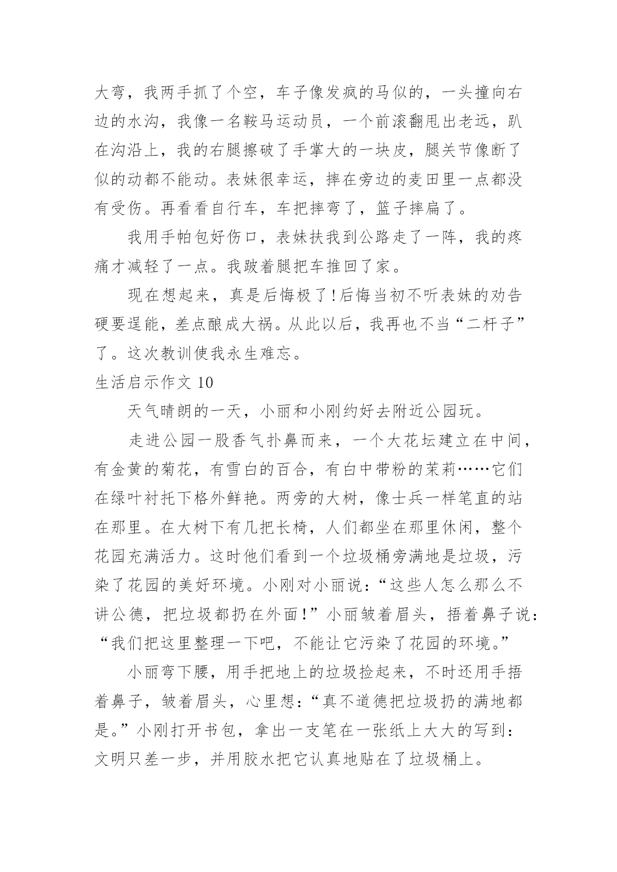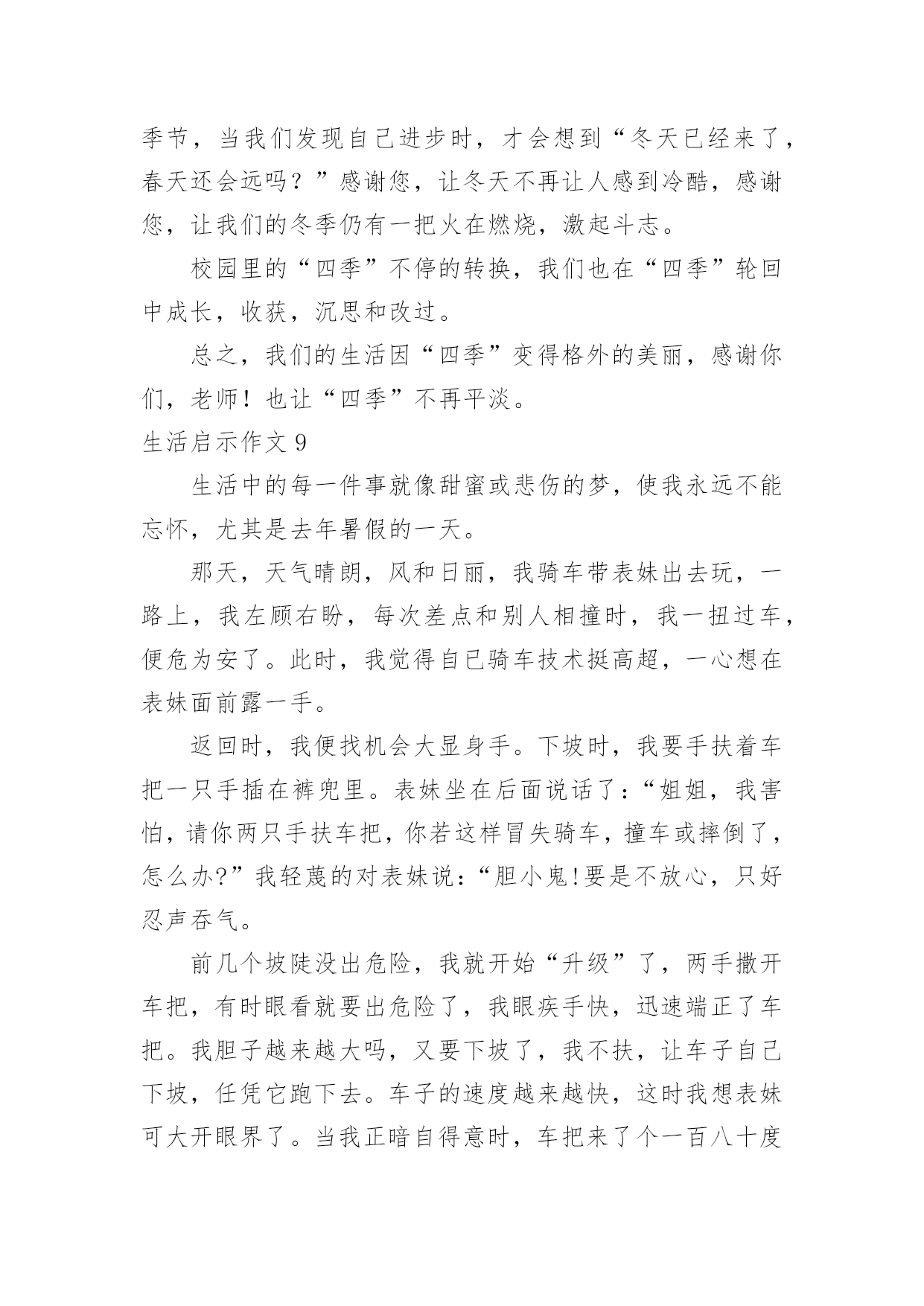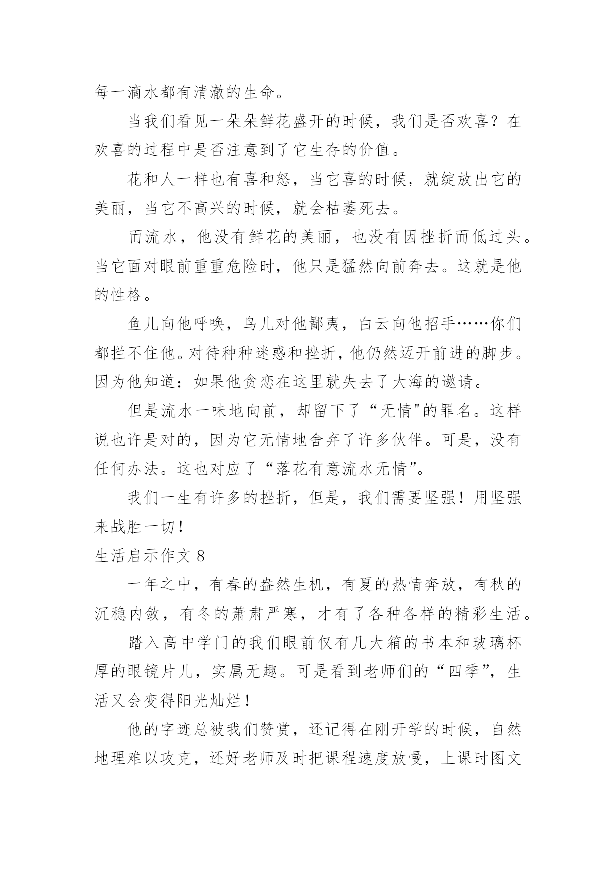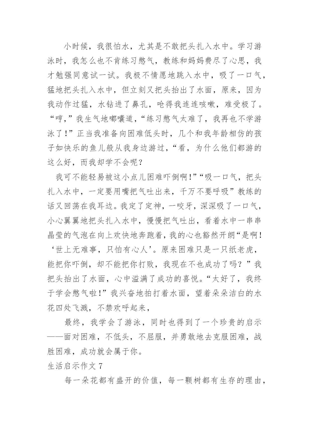 生活启示作文生活启示作文生活启示作文1要过年,一家人都很忙。爸爸他们在搬家具,整理房屋。妈妈在烧年夜饭。我自告奋勇去帮忙,对妈妈说:“妈妈,你炒菜,我来帮你烧火吧!”妈妈高兴地说:“好呀,我正缺个帮手呢。”看到火不是很旺,我不停地把柴火往灶肚里塞,一下子把灶嘴堵满了,火快要灭了,烟不停地往外冒,把我呛得眼泪直流,不断咳嗽。妈妈看了看,对我说:“你是把柴火放得太多。柴放多了,就像人嘴里多吃了东西一样,拌不过来,当然也嚼不动,更不容易消化呀!你应该等一些柴火烧完了,再放一些进去。并且要把柴火底下挖空,这样它才能充分燃烧,火才会旺。”说着,就帮我把多余的柴火取了出来,还把剩下的柴火下面拨空。果然,不一会儿,火又旺了起来。原来,烧火还有这么多学问呢!真让我大开眼界。我学着妈妈的方法做,火一直烧得很旺。要炒花生米了,妈妈对我说:“炒花生米的时候,火不能太大,要不然会把花生米烧焦的,这样就不好吃了。”我照妈妈说的去做,少放了一些柴火,火烧得正好。妈妈炒了很多菜。吃晚饭时,一家人都夸妈妈的菜烧得好。妈妈笑着说:“不是我菜烧的好,是我们胡江勇的火烧得好,才让菜这么好吃的。”他们都你一言我一语地称赞我能干,我听了心里美滋滋的,比吃了蜜还甜。这是我吃到的最好吃的饭菜。看来做生活中的任何事情都有很大的学问呢,我们要要多多学习才行呀!生活启示作文2座右铭是用来警示鞭策自己不断前进、进步的格言。我的座右铭就是我国古代伟大的哲学家、思想家、教育家孔子先生说过的“与朋友交,言而有信。”真正做到这一点就能够交到越来越多的新朋友,而且不会失去老朋友,并且朋友越多我越快乐。记得有一次我去参加夏令营,和我一个小组的同学吴事超请我帮他买一瓶矿泉水,因为他正在参加训练,脱不开身,我便一口答应下来,转身三步并作两步,飞奔向小卖部去,可到那儿一问才知道,矿泉水碰巧刚卖完了。我一听便沮丧地要往回走,心想:哎!白跑一趟!正走着,我猛然想起孔子说过“与朋友交,言而有信。”我既然答应帮同学买矿泉水,就要尽力而为。想到这里,我迅速转身向另一个小卖部跑去,一连跑了三四家,终于买到了矿泉水。当我举着矿泉水,满头大汗地跑去递给吴事超,看到他大口大口痛快地喝着我买去的矿泉水时,我的心里别提多高兴了。后来,我们成了非常要好的朋友。还有一次,我去上课外英语,一位同学生病了,可偏偏轮到他做值日,我见他一脸难受的神情,便主动上前说:“你放心回家休息吧,值日我帮你!”“谢谢!”说完我赶紧拿起扫帚准备打扫教室。哇!教室里可真够脏呀!纸片到处都是,桌椅横七竖八,乱七八糟。我刚干了一会儿,就感到腰酸背痛,不想再干了,心想:反正下回上课老师也不批评我,干脆走吧,但这种想法很快就被打消了,因为“与朋友交,言而有信。”于是我一鼓作气把教室打扫得干干净净、焕然一新。最终我受到了老师的表扬,并成为了我患难与共的好朋友-张紫楠。总而言之“与朋友交,言而有信”是告诫我们做人应该诚实、守信,这不仅是对自己负责,也是对他人、对社会负责。只有做到这一点才能成为一个真正对社会有用的人。这将是我一生的座右铭,我将始终以它来鞭策自己。生活启示作文3生活的波折是很大的,我们可能就会跌在这波折之中,只是只要我们能跳出来,寻找破折中的道理,可能会成为人生中的启示灯,照耀着我们前进的方向。在绘画班时,一天下午,我想平常一样去画画,老师说:“这次的话是要参加国际书画大赛的,无论几天完成都无所谓,但必须要画好。”我选了一个创意素描。画一个罐子,有只小鸡趴在上面。在罐子的上面画一个洞,而里面的食物都漏了出来。两只小鸡再啄漏出来的水果和花生,一只猫头鹰飞到漏洞里。花了苹果、石榴。这只是起好了形,还有打线条呢!在打线条中,我觉得很枯燥,没意思。就敷衍了事,打线条很杂乱,有很多细节都忽略了。让老师看了看,老师觉得不行,指出错误的地方,我一而再再而三的改,可还是不行,老师示范给我看。终于大功告成了。老师把画寄去。一个月后才有了音讯。同学们围着老师旁边,老师一个个念,念到我是铜奖。认真做事才会有应有结果,最后的结果是和平时的努力是成比例的。做任何事要踏踏实实才会有更好的结果。生活启示作文4今天妈妈带我去玩,我发现了一只蜗牛,它走的很慢。我想和它散步,可我走了一两步我回头看看后面它离我很远我催它,我唬它,我责备它,蜗牛用抱歉和伤心的眼光看着我,彷佛在说:“对不起,我已经尽力了!”蜗牛它虽然爬不快,但是它仍旧爬着。为的就是能到达自己想去的地方,为的就是能完成给自己定下的目标,不惜一切。我看看它又看看我自己,我的目标是什么,蜗牛它靠自己的努力,永不放弃的精神,完成了自己的目标。我们要学习蜗牛的精神,去完成自己的目标!勤于思索的人,在某种意义上,就是在辛勤寻找启示的人——带着悬而未决的问题去找,怀着种种疑团去找。思索生活本身,思索生活中的种种现象,你才会受到
