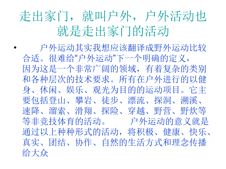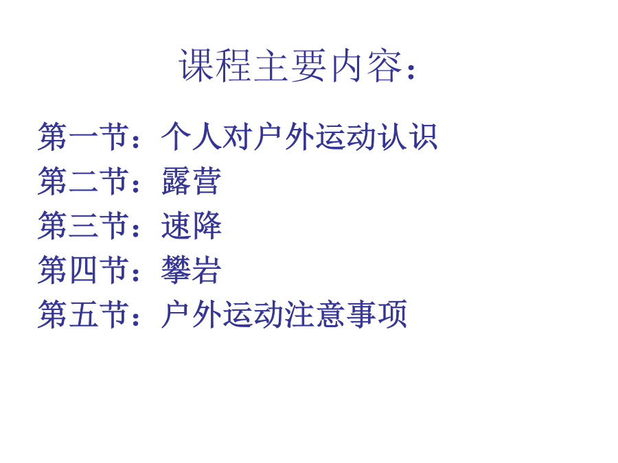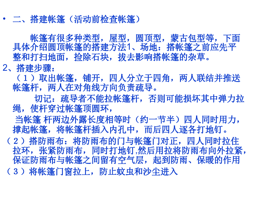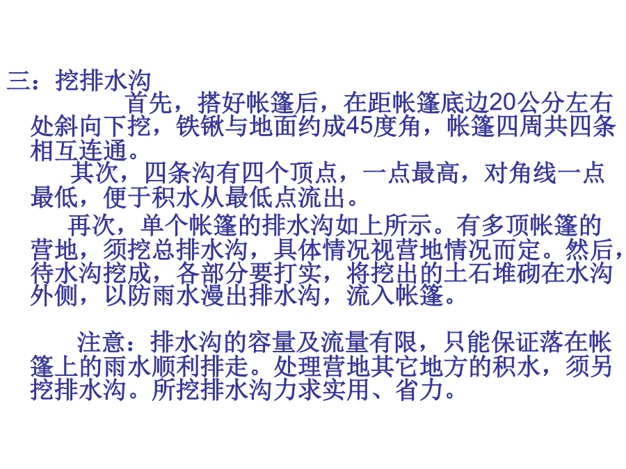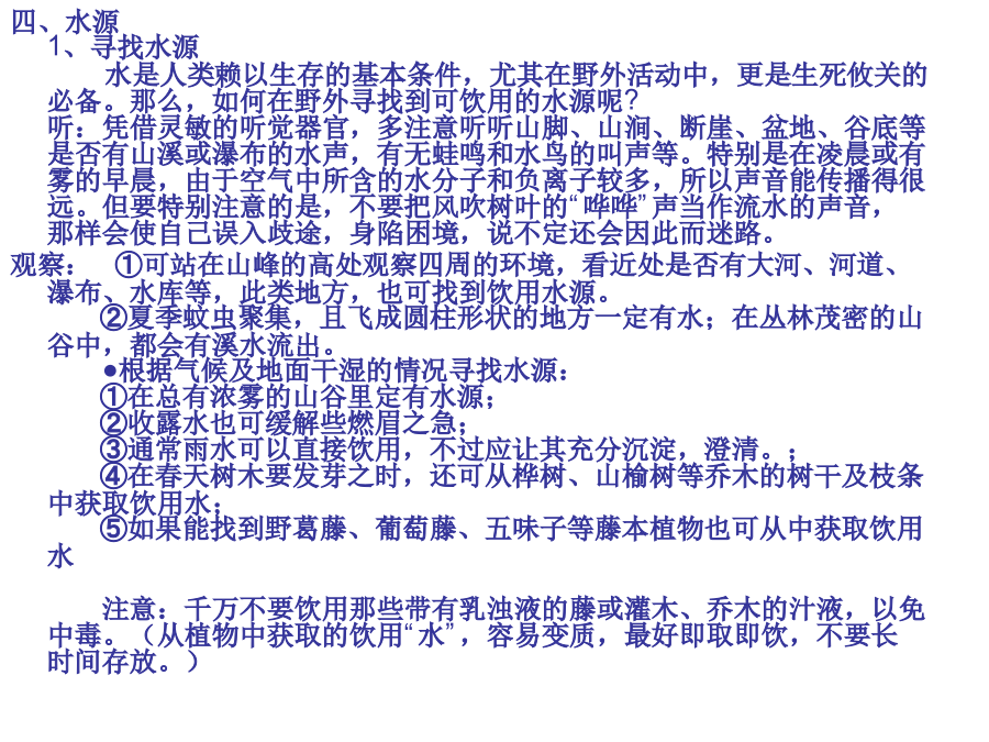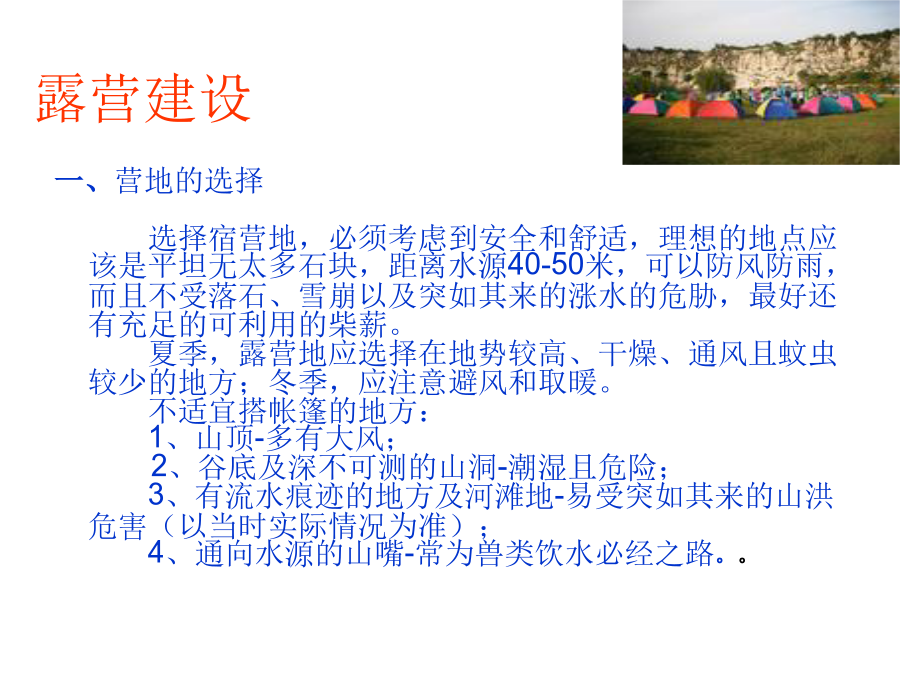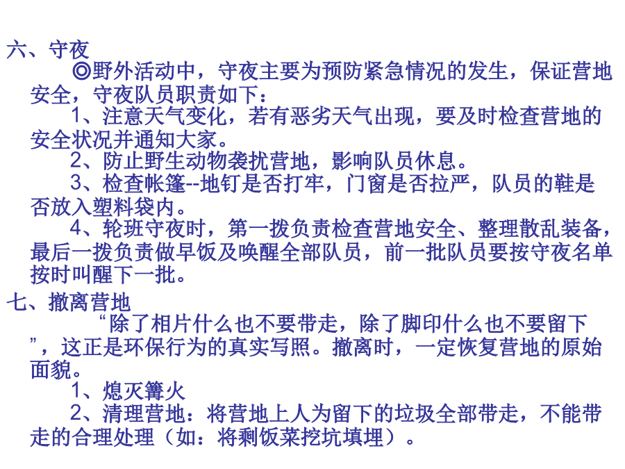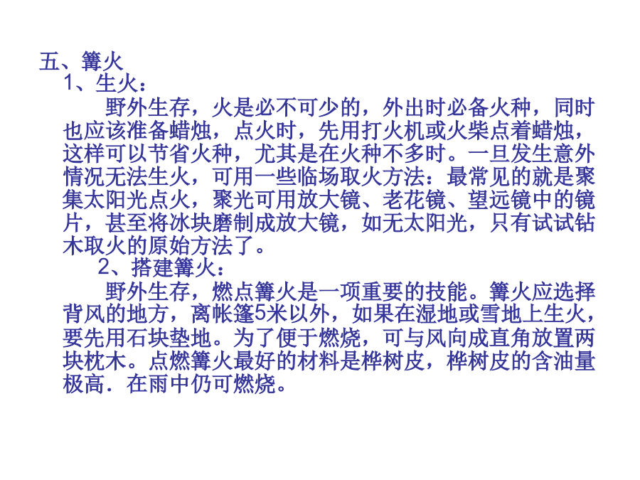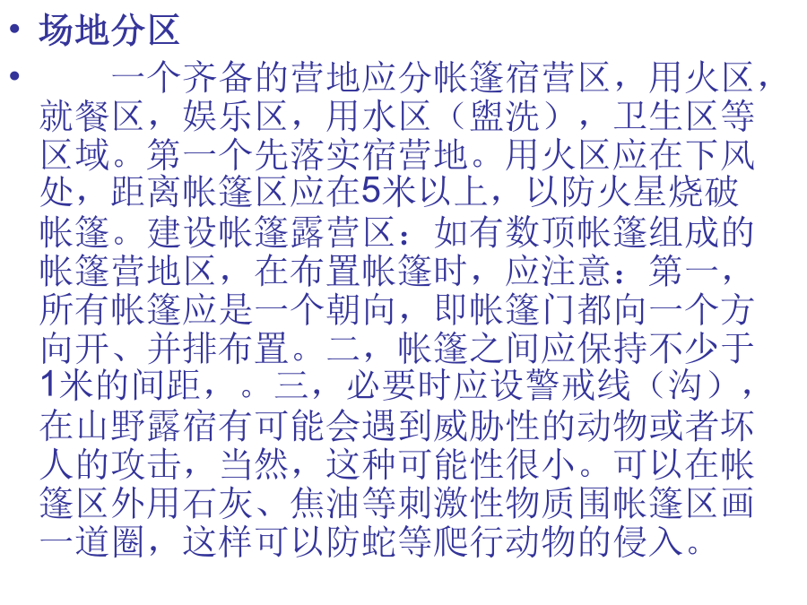 野外生存知识讲座Fieldsurvivaloftheknowledgeacademicchair课程主要内容:走出家门,就叫户外,户外活动也就是走出家门的活动露营建设场地分区一个齐备的营地应分帐篷宿营区,用火区,就餐区,娱乐区,用水区(盥洗),卫生区等区域。第一个先落实宿营地。用火区应在下风处,距离帐篷区应在5米以上,以防火星烧破帐篷。建设帐篷露营区:如有数顶帐篷组成的帐篷营地区,在布置帐篷时,应注意:第一,所有帐篷应是一个朝向,即帐篷门都向一个方向开、并排布置。二,帐篷之间应保持不少于1米的间距,。三,必要时应设警戒线(沟),在山野露宿有可能会遇到威胁性的动物或者坏人的攻击,当然,这种可能性很小。可以在帐篷区外用石灰、焦油等刺激性物质围帐篷区画一道圈,这样可以防蛇等爬行动物的侵入。二、搭建帐篷(活动前检查帐篷)帐篷有很多种类型,屋型,圆顶型,蒙古包型等,下面具体介绍圆顶帐篷的搭建方法1、场地:搭帐篷之前应先平整和打扫地面,捡除石块,拔去影响搭帐篷的杂草。2、搭建步骤:(1)取出帐篷,铺开,四人分立于四角,两人联结并推送帐篷杆,两人在对角线方向负责疏导。切记:疏导者不能拉帐篷杆,否则可能损坏其中弹力拉绳,使杆穿过帐篷顶圆环,当帐篷杆两边外露长度相等时(约一节半)四人同时用力,撑起帐篷,将帐篷杆插入内孔中,而后四人逐各打地钉。(2)搭防雨布:将防雨布的门与帐篷门对正,四人同时拉住拉环,张紧防雨布,同时打地钉,然后用拉将防雨布向外拉紧,保证防雨布与帐篷之间留有空气层,起到防雨、保暖的作用(3)将帐篷门窗拉上,防止蚊虫和沙尘进入三:挖排水沟首先,搭好帐篷后,在距帐篷底边20公分左右处斜向下挖,铁锹与地面约成45度角,帐篷四周共四条相互连通。其次,四条沟有四个顶点,一点最高,对角线一点最低,便于积水从最低点流出。再次,单个帐篷的排水沟如上所示。有多顶帐篷的营地,须挖总排水沟,具体情况视营地情况而定。然后,待水沟挖成,各部分要打实,将挖出的土石堆砌在水沟外侧,以防雨水漫出排水沟,流入帐篷。注意:排水沟的容量及流量有限,只能保证落在帐篷上的雨水顺利排走。处理营地其它地方的积水,须另挖排水沟。所挖排水沟力求实用、省力。四、水源1、寻找水源水是人类赖以生存的基本条件,尤其在野外活动中,更是生死攸关的必备。那么,如何在野外寻找到可饮用的水源呢?听:凭借灵敏的听觉器官,多注意听听山脚、山涧、断崖、盆地、谷底等是否有山溪或瀑布的水声,有无蛙鸣和水鸟的叫声等。特别是在凌晨或有雾的早晨,由于空气中所含的水分子和负离子较多,所以声音能传播得很远。但要特别注意的是,不要把风吹树叶的“哗哗”声当作流水的声音,那样会使自己误入歧途,身陷困境,说不定还会因此而迷路。观察:①可站在山峰的高处观察四周的环境,看近处是否有大河、河道、瀑布、水库等,此类地方,也可找到饮用水源。②夏季蚊虫聚集,且飞成圆柱形状的地方一定有水;在丛林茂密的山谷中,都会有溪水流出。●根据气候及地面干湿的情况寻找水源:①在总有浓雾的山谷里定有水源;②收露水也可缓解些燃眉之急;③通常雨水可以直接饮用,不过应让其充分沉淀,澄清。;④在春天树木要发芽之时,还可从桦树、山榆树等乔木的树干及枝条中获取饮用水;⑤如果能找到野葛藤、葡萄藤、五味子等藤本植物也可从中获取饮用水注意:千万不要饮用那些带有乳浊液的藤或灌木、乔木的汁液,以免中毒。(从植物中获取的饮用“水”,容易变质,最好即取即饮,不要长时间存放。)五、篝火1、生火:野外生存,火是必不可少的,外出时必备火种,同时也应该准备蜡烛,点火时,先用打火机或火柴点着蜡烛,这样可以节省火种,尤其是在火种不多时。一旦发生意外情况无法生火,可用一些临场取火方法:最常见的就是聚集太阳光点火,聚光可用放大镜、老花镜、望远镜中的镜片,甚至将冰块磨制成放大镜,如无太阳光,只有试试钻木取火的原始方法了。2、搭建篝火:野外生存,燃点篝火是一项重要的技能。篝火应选择背风的地方,离帐篷5米以外,如果在湿地或雪地上生火,要先用石块垫地。为了便于燃烧,可与风向成直角放置两块枕木。点燃篝火最好的材料是桦树皮,桦树皮的含油量极高.在雨中仍可燃烧。六、守夜◎野外活动中,守夜主要为预防紧急情况的发生,保证营地安全,守夜队员职责如下:1、注意天气变化,若有恶劣天气出现,要及时检查营地的安全状况并通知大家。2、防止野生动物袭扰营地,影响队员休息。3、检查帐篷--地钉是否打牢,门窗是否拉严,队员的鞋是否放入塑料袋内。4、轮班守夜时,第一拨负责检查营地安全、整理散乱装备,最后一拨负责做早饭及唤醒全部队员,前一批队员要按守夜名单按时叫醒下一批。七、撤离营地“除了相片什么也不要带走,除了脚印什么也不要留下”,这正是环保行为的真实写照。撤离时,一定恢复营地的原始面貌。1、熄灭篝火2、清