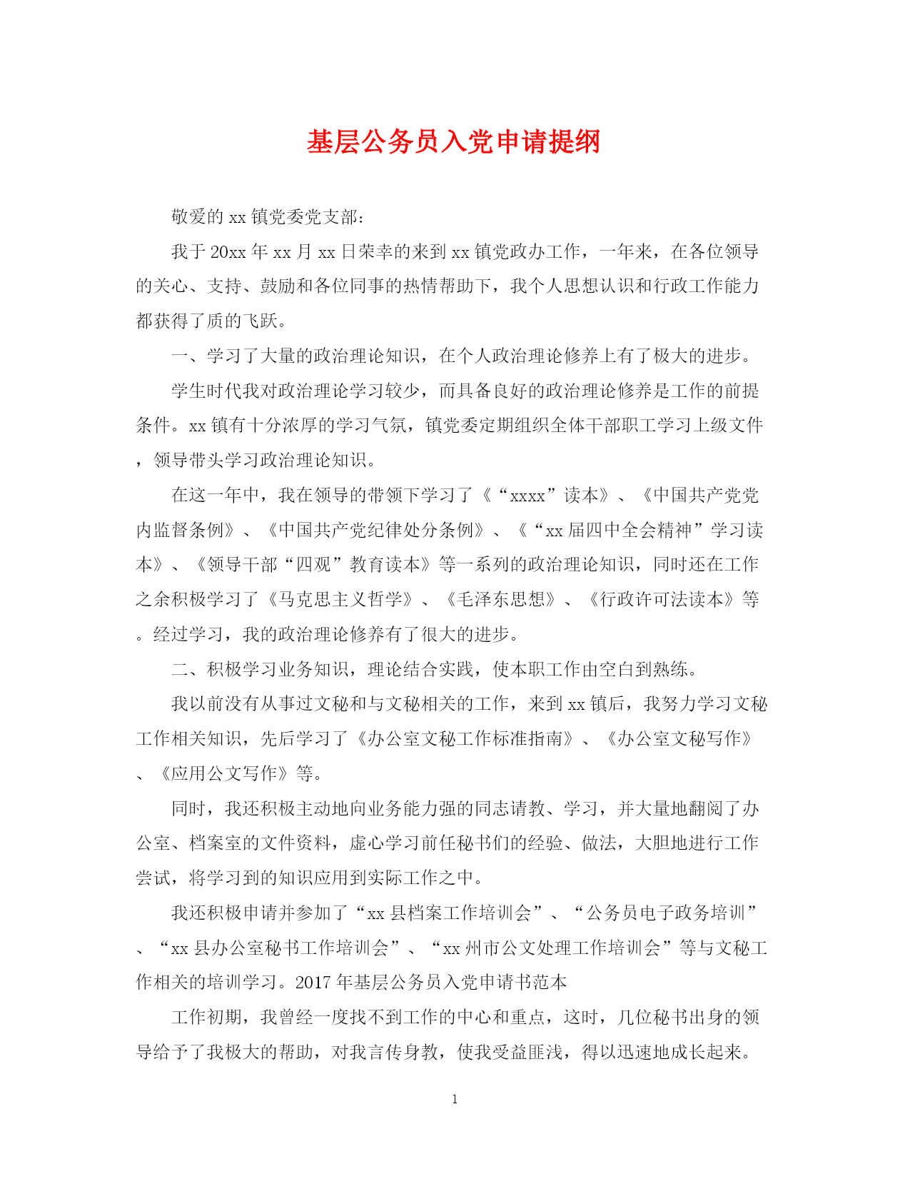 此资料由网络收集而来,如有侵权请告知上传者立即删除。资料共分享,我们负责传递知识。PAGEPAGE2基层公务员入党申请提纲敬爱的xx镇党委党支部:我于20xx年xx月xx日荣幸的来到xx镇党政办工作,一年来,在各位领导的关心、支持、鼓励和各位同事的热情帮助下,我个人思想认识和行政工作能力都获得了质的飞跃。一、学习了大量的政治理论知识,在个人政治理论修养上有了极大的进步。学生时代我对政治理论学习较少,而具备良好的政治理论修养是工作的前提条件。xx镇有十分浓厚的学习气氛,镇党委定期组织全体干部职工学习上级文件,领导带头学习政治理论知识。在这一年中,我在领导的带领下学习了《“xxxx”读本》、《中国共产党党内监督条例》、《中国共产党纪律处分条例》、《“xx届四中全会精神”学习读本》、《领导干部“四观”教育读本》等一系列的政治理论知识,同时还在工作之余积极学习了《马克思主义哲学》、《毛泽东思想》、《行政许可法读本》等。经过学习,我的政治理论修养有了很大的进步。二、积极学习业务知识,理论结合实践,使本职工作由空白到熟练。我以前没有从事过文秘和与文秘相关的工作,来到xx镇后,我努力学习文秘工作相关知识,先后学习了《办公室文秘工作标准指南》、《办公室文秘写作》、《应用公文写作》等。同时,我还积极主动地向业务能力强的同志请教、学习,并大量地翻阅了办公室、档案室的文件资料,虚心学习前任秘书们的经验、做法,大胆地进行工作尝试,将学习到的知识应用到实际工作之中。我还积极申请并参加了“xx县档案工作培训会”、“公务员电子政务培训”、“xx县办公室秘书工作培训会”、“xx州市公文处理工作培训会”等与文秘工作相关的培训学习。2017年基层公务员入党申请书范本工作初期,我曾经一度找不到工作的中心和重点,这时,几位秘书出身的领导给予了我极大的帮助,对我言传身教,使我受益匪浅,得以迅速地成长起来。通过学习和实践,我的业务素质得到了极大的提高,办公室日常工作也较为熟练了,全年共撰写各类文稿四十多份,并在同事们的支持下建立起了xx镇200x年至20xx年的文件资料档案。从今往后,我会更加努力地学习和工作,认真学习当得路线、方针、政策及决议、学习当得基本知识等,努力提高为人民服务的本领。时刻以党的思想规范自己的行为,坚持党和人民的利益高于一切,个人利益服从党和人民的利益,自觉遵守党的纪律和国家的法律,严格保守党和国家的秘密,执行党的决定,服从组织分配,积极完成党的任务。我个人深知作为一名共产党员,不仅需要实事求是,解放思想,更需要树立正确的世界观,人生观,价值观。助人为乐,待人真诚,有责任心,有上进心是本人的优点,但同时也存在许多缺点,性格倔强,不够果断,缺少主见,不敢面对挫折,理论水平不高,农村工作经验和方法与实际工作要求还有一定的距离等等。然而,请组织相信我,我一定会尽我所能认真改正,努力提高自身素质,锻炼为村民服务的本领。同时,也希望组织给予指导和帮助。今后,我要用党员标准更加严格要求自己,自觉接受党员和群众的帮助与监督,以身边优秀的共产党员为榜样,努力克服自己的缺点和不足。如果党组织能批准我的请求,我一定拥护党的纲领,遵守党的章程,履行党员义务,执行党的决定,严守党的机密,对党忠诚,此刻本人向党组织提出转正申请,知道自身有很多不足,所以本人更希望党组织严格要求本人,使本人有更大的进步。本人也会用党员标准要求自己,努力克服缺点,认真学习xx大精神和党章,争取早日加入党组织。请党组织在实践中考验我!此致敬礼!申请人:xxx