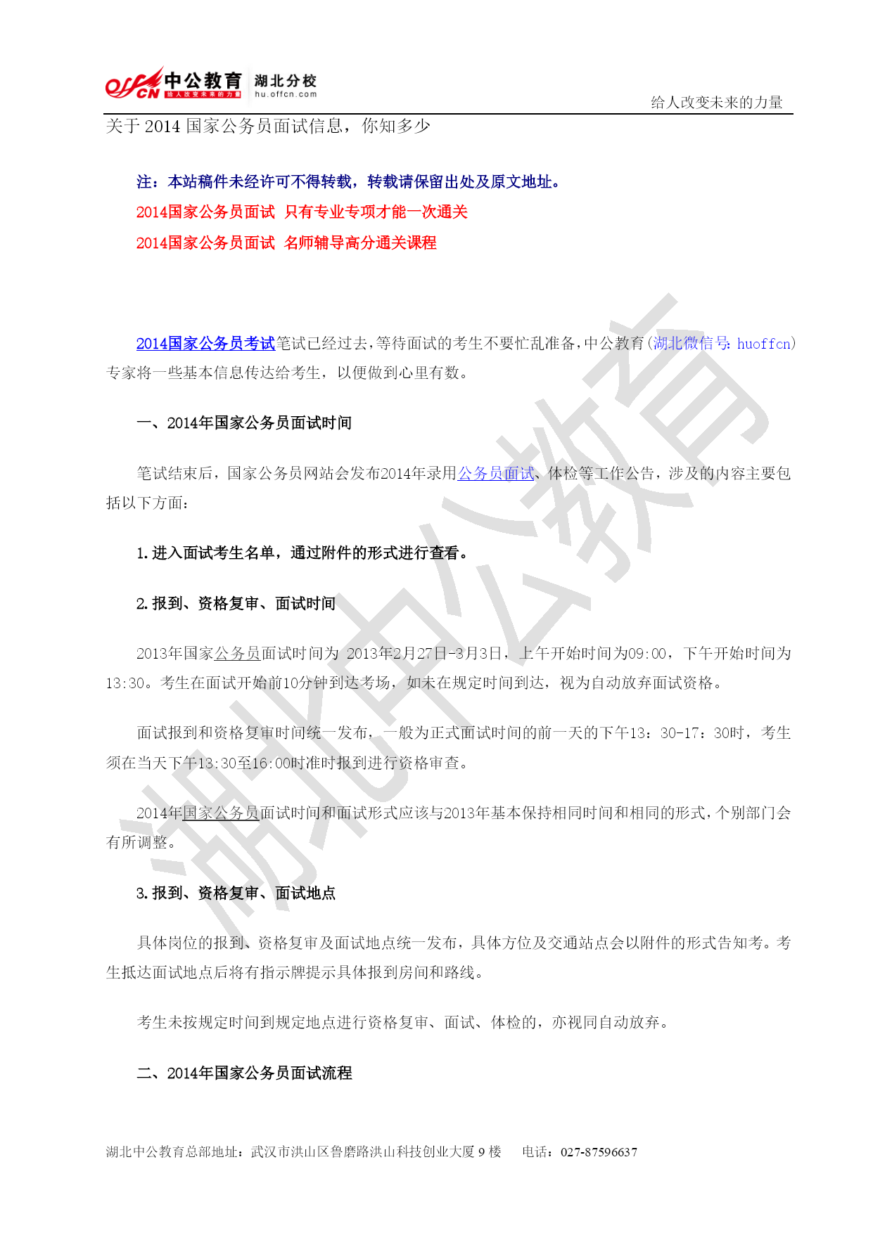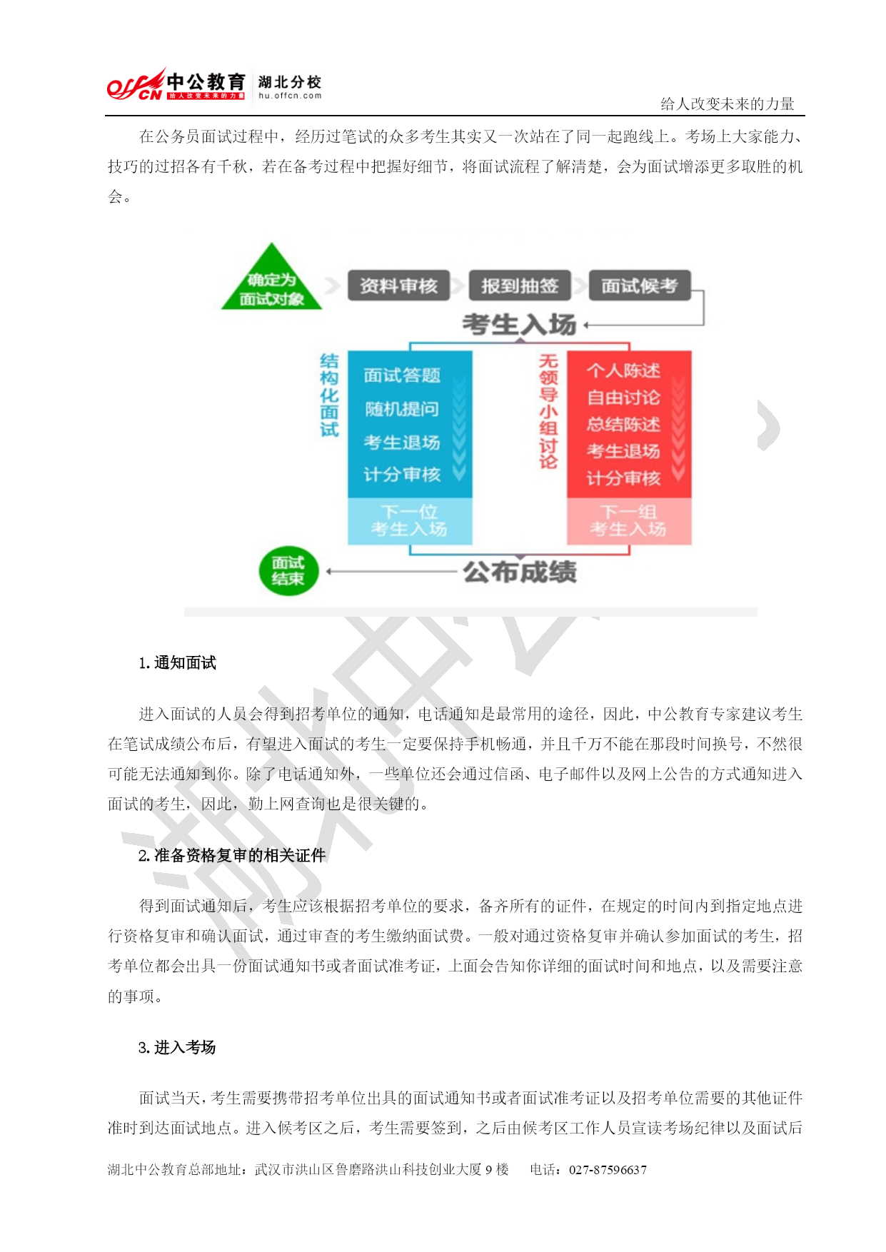 给人改变未来的力量湖北中公教育总部地址:武汉市洪山区鲁磨路洪山科技创业大厦9楼电话:027-87596637关于2014国家公务员面试信息,你知多少注:本站稿件未经许可不得转载,转载请保留出处及原文地址。HYPERLINK"http://www.offcn.com/zg/2014zyzxms/"2014国家公务员面试只有专业专项才能一次通关HYPERLINK"http://edu.offcn.com/bkzt/2014gkms/"2014国家公务员面试名师辅导高分通关课程HYPERLINK"http://hu.offcn.com/html/guojiagongwuyuan/"2014国家公务员考试笔试已经过去,等待面试的考生不要忙乱准备,中公教育(湖北微信号:huoffcn)专家将一些基本信息传达给考生,以便做到心里有数。一、2014年国家公务员面试时间笔试结束后,国家公务员网站会发布2014年录用HYPERLINK"http://hu.offcn.com/html/guojiagongwuyuan/"公务员面试、体检等工作公告,涉及的内容主要包括以下方面:1.进入面试考生名单,通过附件的形式进行查看。2.报到、资格复审、面试时间2013年国家HYPERLINK"http://hu.offcn.com/"公务员面试时间为2013年2月27日-3月3日,上午开始时间为09:00,下午开始时间为13:30。考生在面试开始前10分钟到达考场,如未在规定时间到达,视为自动放弃面试资格。面试报到和资格复审时间统一发布,一般为正式面试时间的前一天的下午13:30-17:30时,考生须在当天下午13:30至16:00时准时报到进行资格审查。2014年HYPERLINK"http://www.offcn.com/gjgwy/"国家公务员面试时间和面试形式应该与2013年基本保持相同时间和相同的形式,个别部门会有所调整。3.报到、资格复审、面试地点具体岗位的报到、资格复审及面试地点统一发布,具体方位及交通站点会以附件的形式告知考。考生抵达面试地点后将有指示牌提示具体报到房间和路线。考生未按规定时间到规定地点进行资格复审、面试、体检的,亦视同自动放弃。二、2014年国家公务员面试流程在公务员面试过程中,经历过笔试的众多考生其实又一次站在了同一起跑线上。考场上大家能力、技巧的过招各有千秋,若在备考过程中把握好细节,将面试流程了解清楚,会为面试增添更多取胜的机会。1.通知面试进入面试的人员会得到招考单位的通知,电话通知是最常用的途径,因此,中公教育专家建议考生在笔试成绩公布后,有望进入面试的考生一定要保持手机畅通,并且千万不能在那段时间换号,不然很可能无法通知到你。除了电话通知外,一些单位还会通过信函、电子邮件以及网上公告的方式通知进入面试的考生,因此,勤上网查询也是很关键的。2.准备资格复审的相关证件得到面试通知后,考生应该根据招考单位的要求,备齐所有的证件,在规定的时间内到指定地点进行资格复审和确认面试,通过审查的考生缴纳面试费。一般对通过资格复审并确认参加面试的考生,招考单位都会出具一份面试通知书或者面试准考证,上面会告知你详细的面试时间和地点,以及需要注意的事项。3.进入考场面试当天,考生需要携带招考单位出具的面试通知书或者面试准考证以及招考单位需要的其他证件准时到达面试地点。进入候考区之后,考生需要签到,之后由候考区工作人员宣读考场纪律以及面试后成绩的公布和体检的安排等工作,宣读完毕之后,各考生要上交自己的通讯工具等物品。4.抽签准备就绪之后,便是组织考生进行面试顺序的抽签。抽签确定分组和进场顺序,有的地区是先抽分组签,再抽顺序签,有的地区是一次抽取确定分组和顺序,如:三(1),表示第三组第1个进场。5.候考抽到第一的考生将由工作人员带到面试区进行面试,其他考生在候考区内候考。候考区和面试区是完全隔离的,候考的考生无法得知前面进行面试的考生的任何情况。候考区内,将有工作人员通知即将进行面试的考生做准备。即1号考生在进行面试时,2号考生会安排在考场门外候考,其他人在候考室等待,以此类推。6.面试开始面试区一般由主考官、考官,记分员、计时员、监督员,核分员组成,坐在中间的为主考官。考生一般是正坐在主考官的对面,保证双方可以对视。待考生坐定后,主考官将向考生宣读面试规则,然后让你抽取面试题目。当然,也有不需要抽取的情况。从目前的情况看,一般报考相同职位的考生的面试题目都是一样的。另外,考生在面试时不得向考官介绍自己的姓名、工作单位等相关信息,任何涉及个人情况的信息都不得泄漏,以确保面试公正,否则取消面试资格。7.计分面试结束后,考生到