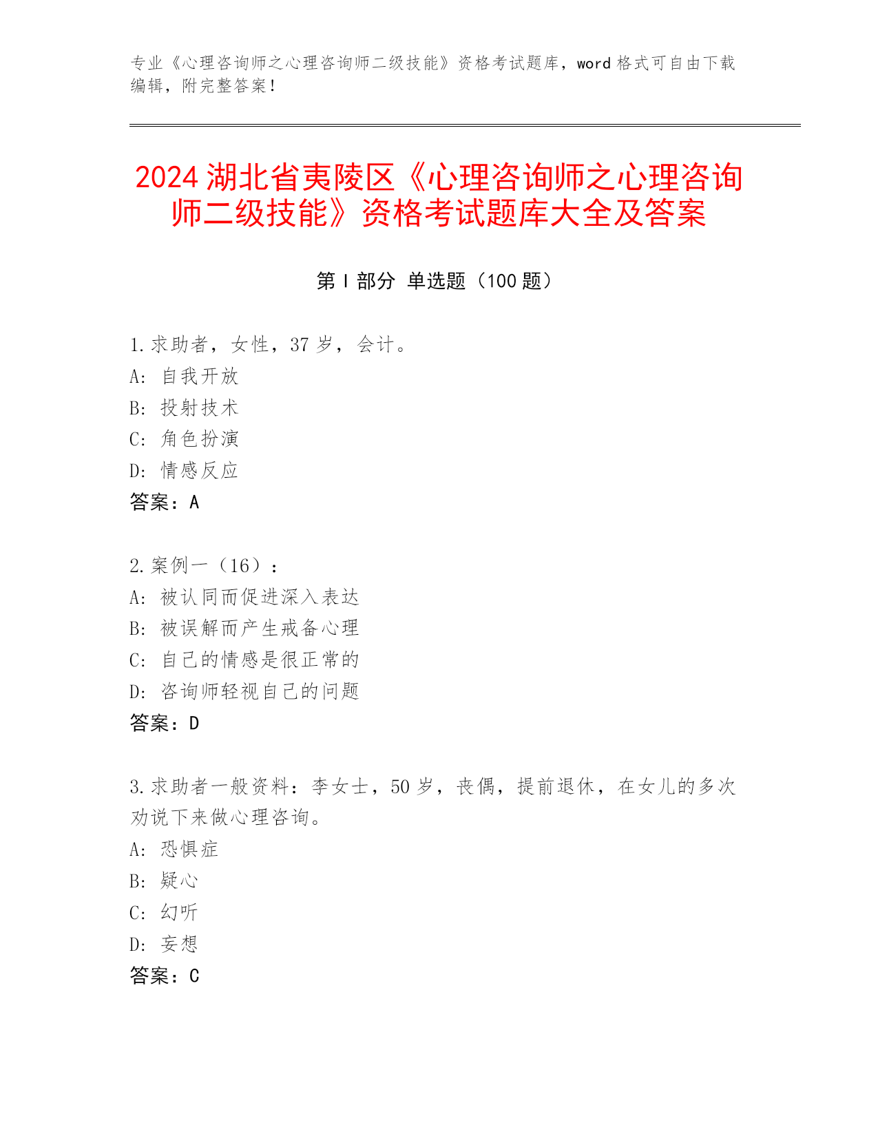 2024湖北省夷陵区《心理咨询师之心理咨询师二级技能》资格考试题库大全及答案