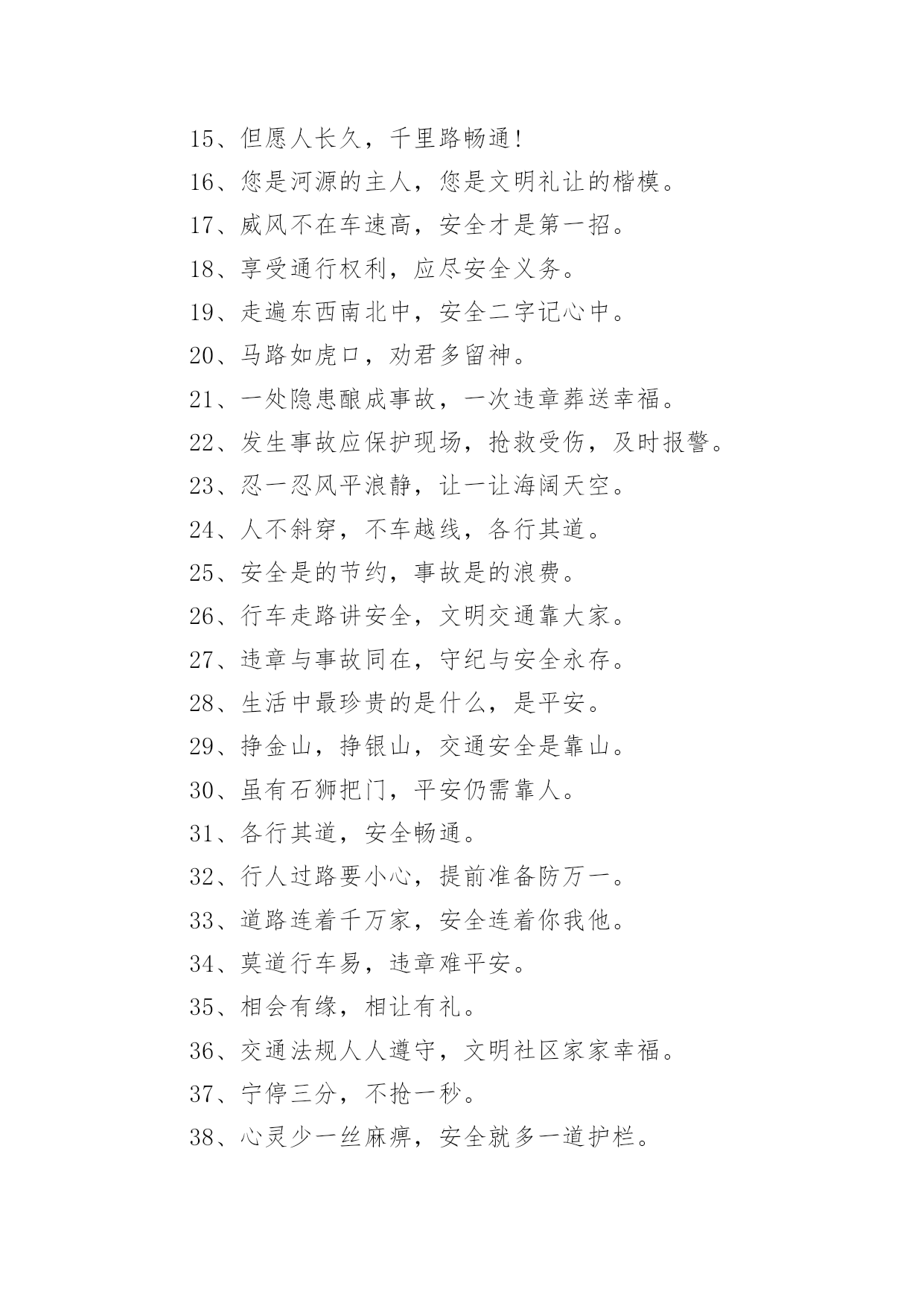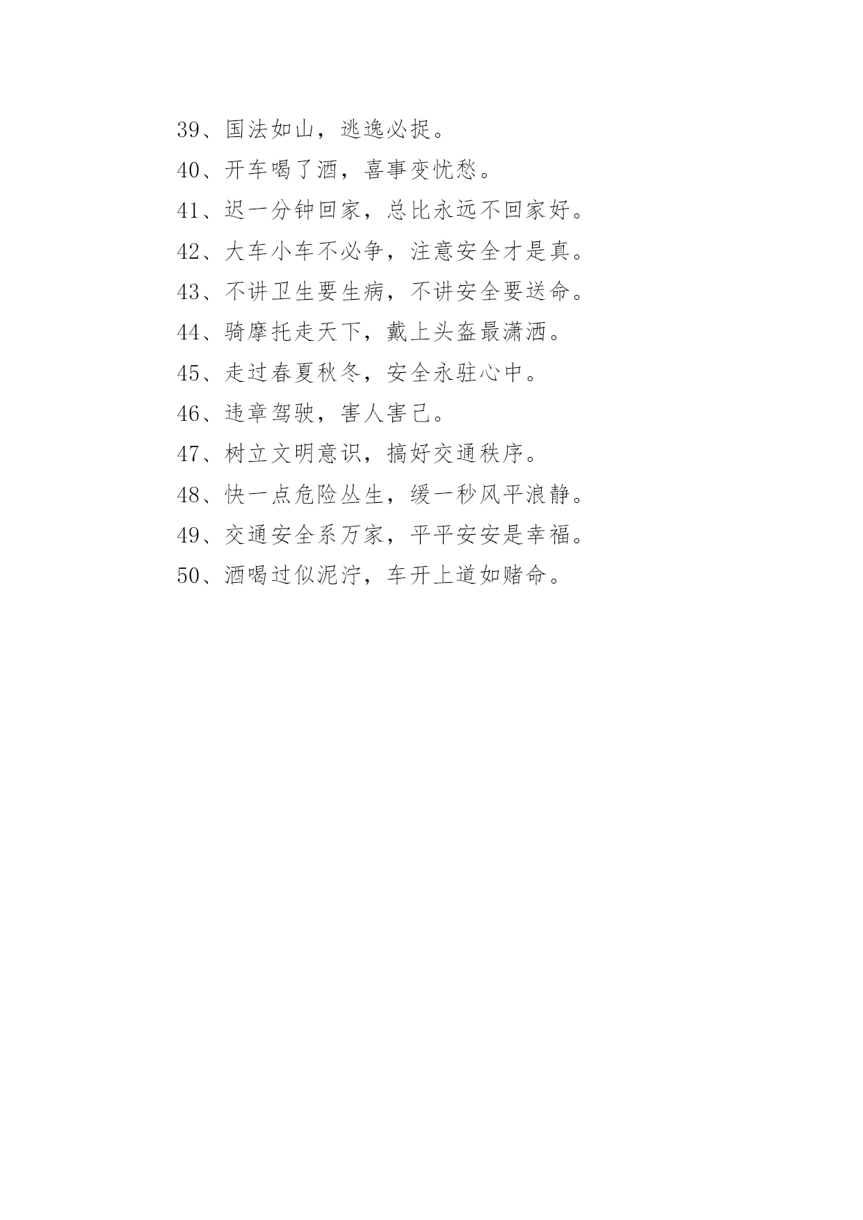 交通安全的标语宣传语交通安全的标语宣传语(精选50句)在不断进步的社会中,大家总免不了要接触或使用宣传语吧,宣传语是用简短文字写出的有宣传鼓动作用的口号,对文化起到一定的宣传作用。你还在找寻优秀经典的宣传语吗?下面是小编帮大家整理的交通安全的标语宣传语(精选50句),欢迎阅读与收藏。1、谨慎驾驶一帆风顺,遵纪守法十分安全。2、车好、路好,安全。3、中速行驶,安全礼让。4、心无交规,路有坎坷。5、一日千里不是难,千金难买是安全。6、珍惜生命,拒绝违章。7、一人安全,全家幸福。8、为了您和他人的..幸福,请自觉遵守交通法规。9、文明交通安全在,留住生命留住爱。10、侥幸躲过千次,出事就在一次。11、让一让道路通畅,让一让安全有保障,让一让心情更舒畅。12、让道于人,安全于己。13、红灯亮时,管好你的脚步;绿灯亮时,管好你的速度。14、处罚违章不留情,看似无情最深情。15、但愿人长久,千里路畅通!16、您是河源的主人,您是文明礼让的楷模。17、威风不在车速高,安全才是第一招。18、享受通行权利,应尽安全义务。19、走遍东西南北中,安全二字记心中。20、马路如虎口,劝君多留神。21、一处隐患酿成事故,一次违章葬送幸福。22、发生事故应保护现场,抢救受伤,及时报警。23、忍一忍风平浪静,让一让海阔天空。24、人不斜穿,不车越线,各行其道。25、安全是的节约,事故是的浪费。26、行车走路讲安全,文明交通靠大家。27、违章与事故同在,守纪与安全永存。28、生活中最珍贵的是什么,是平安。29、挣金山,挣银山,交通安全是靠山。30、虽有石狮把门,平安仍需靠人。31、各行其道,安全畅通。32、行人过路要小心,提前准备防万一。33、道路连着千万家,安全连着你我他。34、莫道行车易,违章难平安。35、相会有缘,相让有礼。36、交通法规人人遵守,文明社区家家幸福。37、宁停三分,不抢一秒。38、心灵少一丝麻痹,安全就多一道护栏。39、国法如山,逃逸必捉。40、开车喝了酒,喜事变忧愁。41、迟一分钟回家,总比永远不回家好。42、大车小车不必争,注意安全才是真。43、不讲卫生要生病,不讲安全要送命。44、骑摩托走天下,戴上头盔最潇洒。45、走过春夏秋冬,安全永驻心中。46、违章驾驶,害人害己。47、树立文明意识,搞好交通秩序。48、快一点危险丛生,缓一秒风平浪静。49、交通安全系万家,平平安安是幸福。50、酒喝过似泥泞,车开上道如赌命。