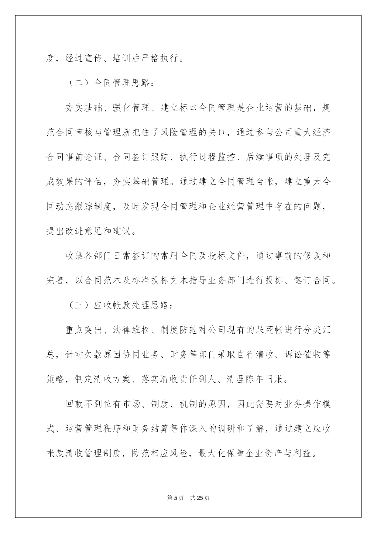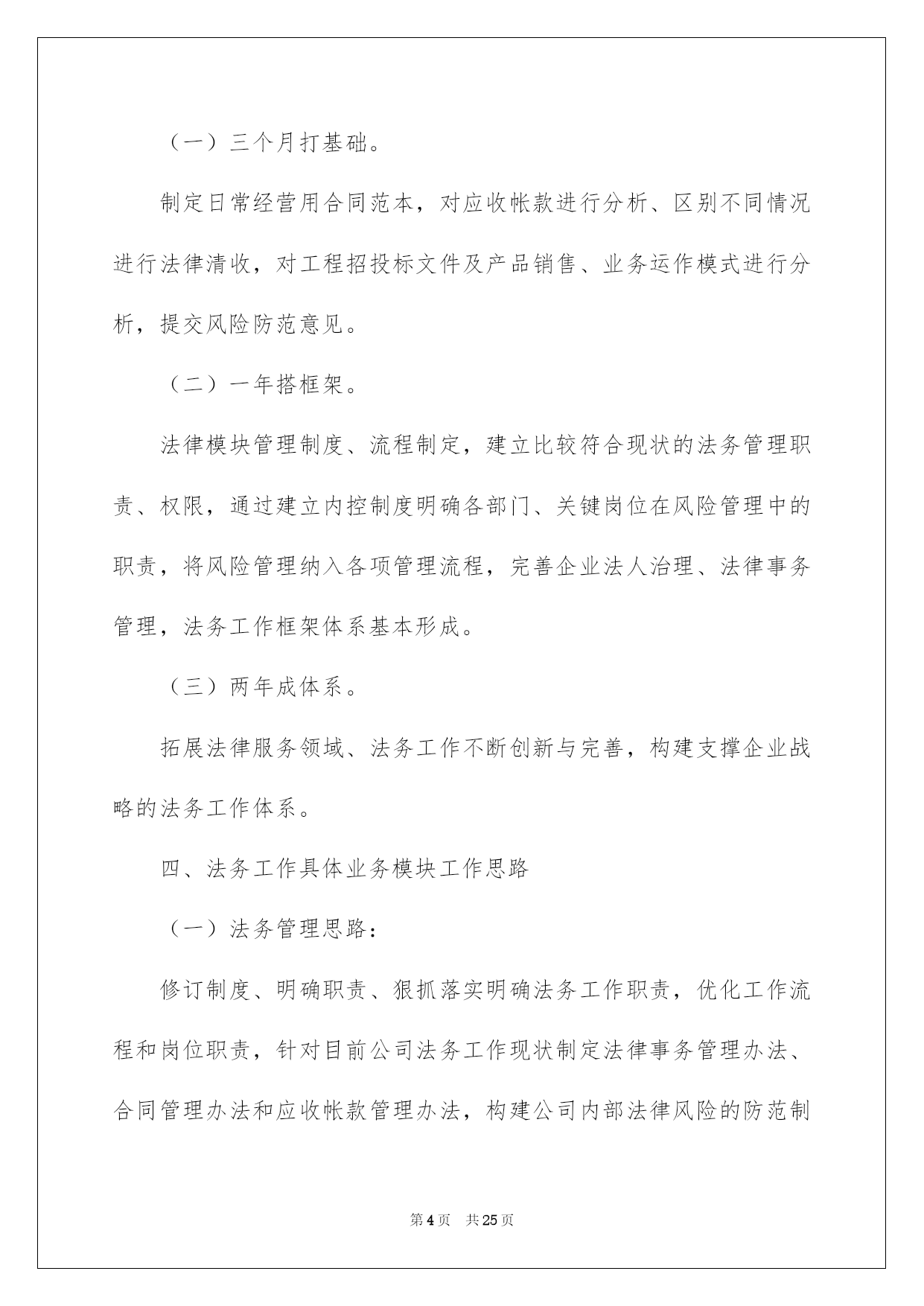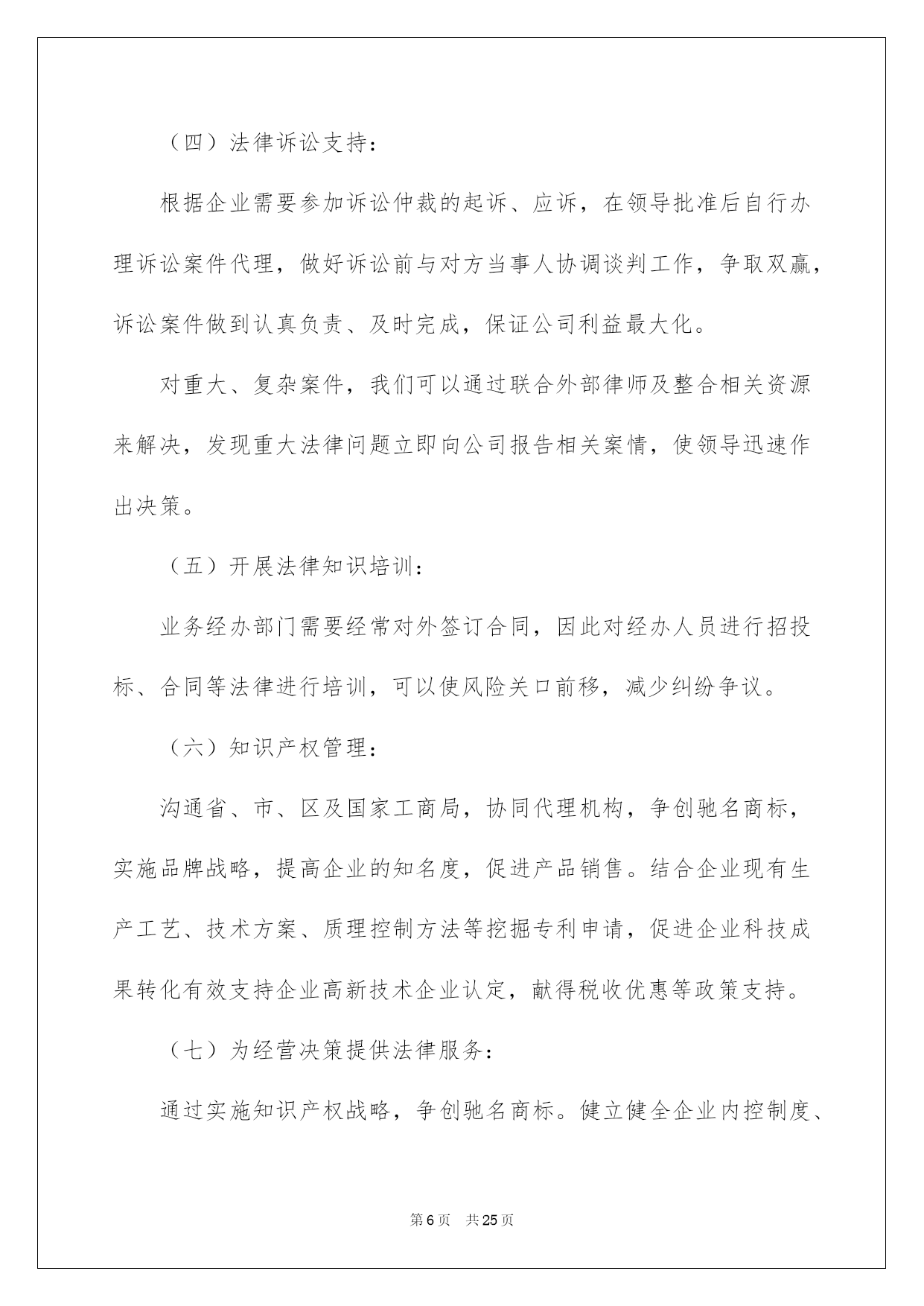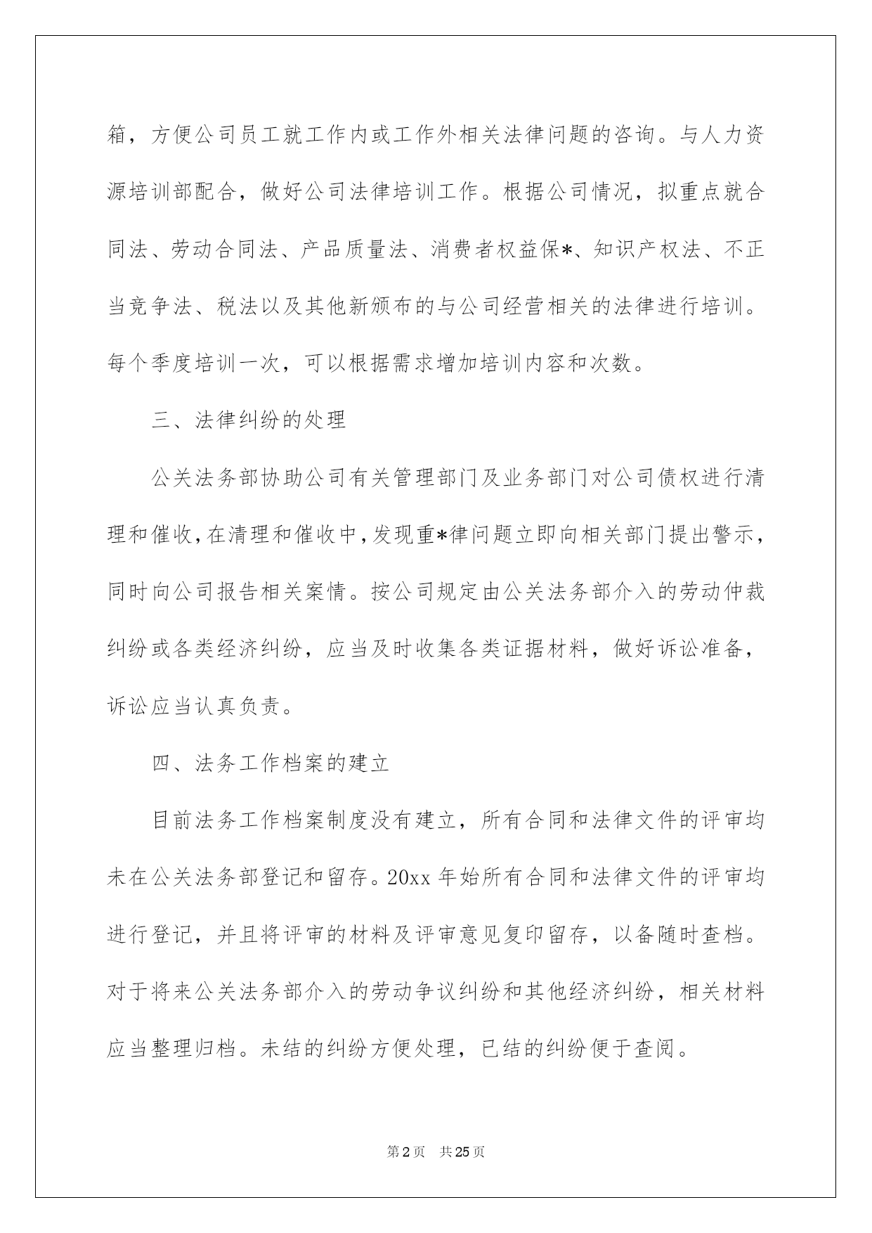第PAGE\*Arabic\*MERGEFORMAT25页共NUMPAGES\*Arabic\*MERGEFORMAT25页第PAGE\*MERGEFORMAT25页共NUMPAGES\*MERGEFORMAT25页第PAGE\*MERGEFORMAT25页共NUMPAGES\*MERGEFORMAT25页第PAGE\*MERGEFORMAT25页共NUMPAGES\*MERGEFORMAT25页第PAGE\*MERGEFORMAT25页共NUMPAGES\*MERGEFORMAT25页第PAGE\*MERGEFORMAT25页共NUMPAGES\*MERGEFORMAT25页第PAGE\*MERGEFORMAT25页共NUMPAGES\*MERGEFORMAT25页第PAGE\*MERGEFORMAT25页共NUMPAGES\*MERGEFORMAT25页第PAGE\*MERGEFORMAT25页共NUMPAGES\*MERGEFORMAT25页第PAGE\*MERGEFORMAT25页共NUMPAGES\*MERGEFORMAT25页第PAGE\*MERGEFORMAT25页共NUMPAGES\*MERGEFORMAT25页2022公司法务工作计划公司法务工作计划日子在弹指一挥间就毫无声息的流逝,相信大家对即将到来的工作生活满心期待吧!该好好计划一下接下来的工作了!什么样的计划才是好的计划呢?以下是我收集整理的公司法务工作计划,欢迎阅读与收藏。公司法务工作计划1一、合同及法律文件的审查合同及法律文件的审查是一项日常性工作,合同及其他法律文件审查保持自收到文本x小时内审核完毕,并提出相应的书面法律意见或进行相应的修改;根据目前情况,对经济合同制度中的合同评审内容进行调整,计划20xx年x月前完成。对格式合同进行常规修改,使其更符合实际操作和公司利益。在第二季度内完成。二、法律咨询与培训工作时间内随时接受各部门的法律咨询,并及时给予答复。对于咨询情况予以登记。计划与信息部联系,开通一个专门的法律咨询邮箱,方便公司员工就工作内或工作外相关法律问题的咨询。与人力资源培训部配合,做好公司法律培训工作。根据公司情况,拟重点就合同法、劳动合同法、产品质量法、消费者权益保*、知识产权法、不正当竞争法、税法以及其他新颁布的与公司经营相关的法律进行培训。每个季度培训一次,可以根据需求增加培训内容和次数。三、法律纠纷的处理公关法务部协助公司有关管理部门及业务部门对公司债权进行清理和催收,在清理和催收中,发现重*律问题立即向相关部门提出警示,同时向公司报告相关案情。按公司规定由公关法务部介入的劳动仲裁纠纷或各类经济纠纷,应当及时收集各类证据材料,做好诉讼准备,诉讼应当认真负责。四、法务工作档案的建立目前法务工作档案制度没有建立,所有合同和法律文件的评审均未在公关法务部登记和留存。20xx年始所有合同和法律文件的评审均进行登记,并且将评审的材料及评审意见复印留存,以备随时查档。对于将来公关法务部介入的劳动争议纠纷和其他经济纠纷,相关材料应当整理归档。未结的纠纷方便处理,已结的纠纷便于查阅。六、自身素质的提高加强学习新知识,吸收新知识,争取机会参与业务培训和同行交流。公司法务工作计划2在公司领导和同事的关心支持下,经过近两天对公司制度、文件的学习,走访车间并沟通各部门负责人,征集法律服务与支持意见,针对以上信息资料现提出以下法务工作思路,请领导作出批示。我将按领导要求,开展具体工作,为企业发展提供法律支持与保障。一、法务工作现状分析现阶段法务工作基础薄弱、法务制度流程不够健全,公司现有业务模式存在工程质量、应收帐款等经营风险。企业现有风险管理、控制机制需要加强,人员对法务工作的认识理解与支持需要一个过程。二、工作定位以服务企业发展为中心,突出法律支持与服务,防范和化解法律风险,构建以事先防范和过程控制为主、事后救济为辅的企业法律风险防范机制。三、工作目标(一)三个月打基础。制定日常经营用合同范本,对应收帐款进行分析、区别不同情况进行法律清收,对工程招投标文件及产品销售、业务运作模式进行分析,提交风险防范意见。(二)一年搭框架。法律模块管理制度、流程制定,建立比较符合现状的法务管理职责、权限,通过建立内控制度明确各部门、关键岗位在风险管理中的职责,将风险管理纳入各项管理流程,完善企业法人治理、法律事务管理,法务工作框架体系基本形成。(三)两年成体系。拓展法律服务领域、法务工作不断创新与完善,构建支撑企业战略的法务工作体系。四、法务工作具体业务模块工作思路(一)法务管理思路:修订制度、明确职责、狠抓