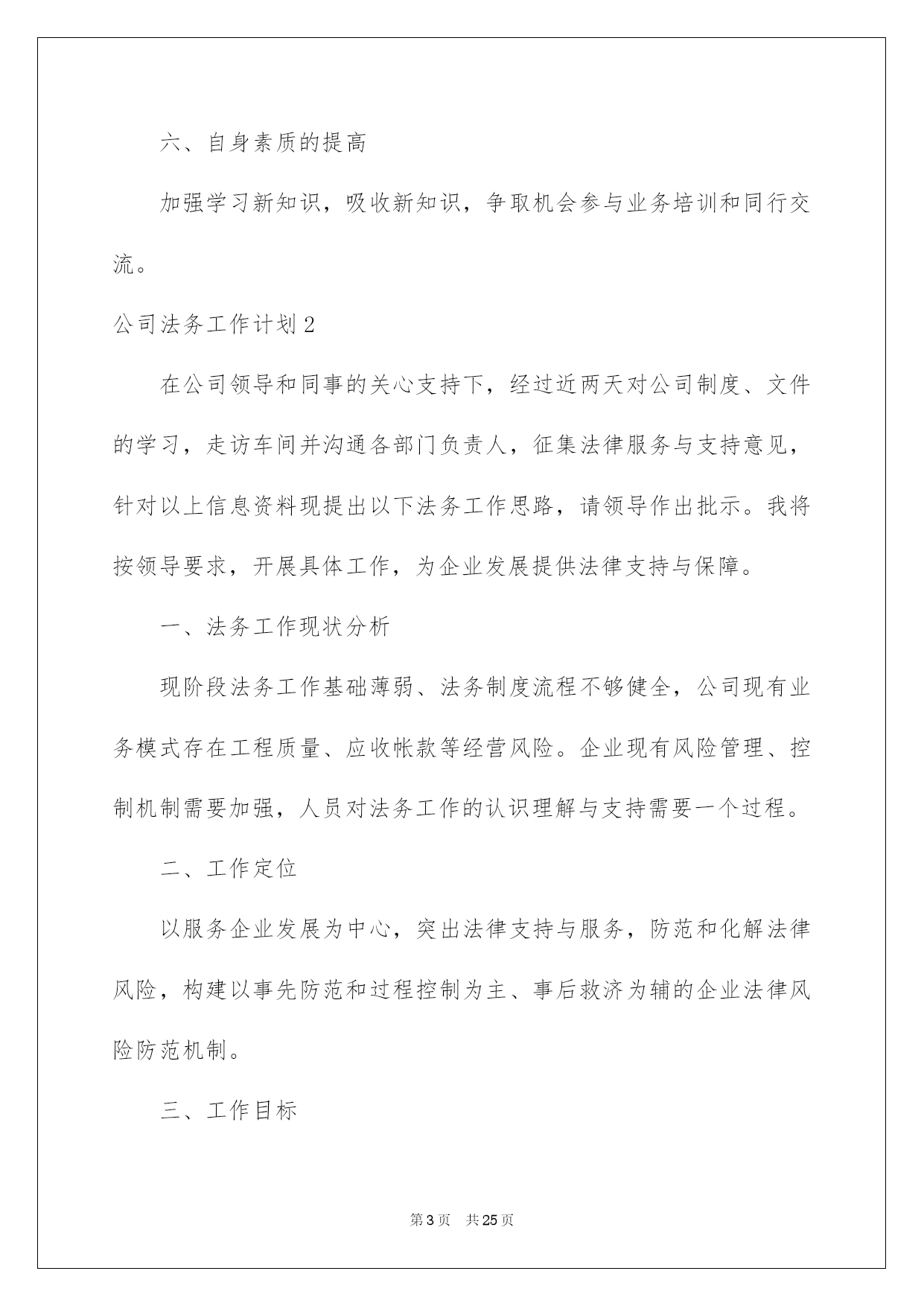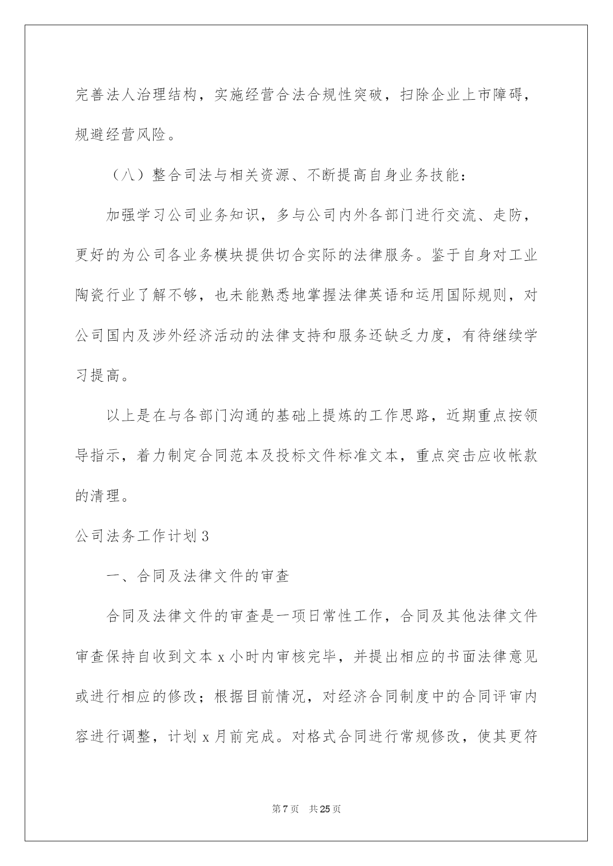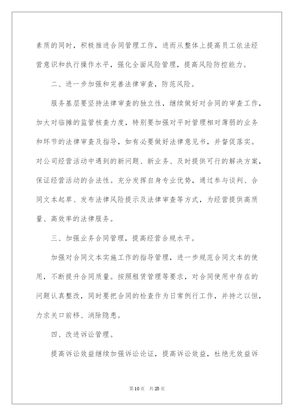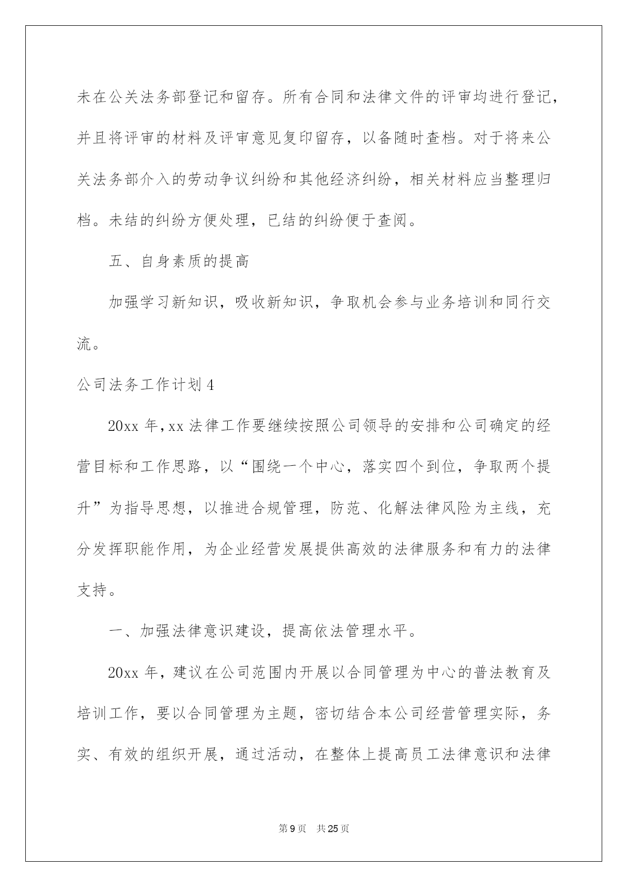 第PAGE\*Arabic\*MERGEFORMAT25页共NUMPAGES\*Arabic\*MERGEFORMAT25页第PAGE\*MERGEFORMAT25页共NUMPAGES\*MERGEFORMAT25页第PAGE\*MERGEFORMAT25页共NUMPAGES\*MERGEFORMAT25页第PAGE\*MERGEFORMAT25页共NUMPAGES\*MERGEFORMAT25页第PAGE\*MERGEFORMAT25页共NUMPAGES\*MERGEFORMAT25页第PAGE\*MERGEFORMAT25页共NUMPAGES\*MERGEFORMAT25页第PAGE\*MERGEFORMAT25页共NUMPAGES\*MERGEFORMAT25页第PAGE\*MERGEFORMAT25页共NUMPAGES\*MERGEFORMAT25页第PAGE\*MERGEFORMAT25页共NUMPAGES\*MERGEFORMAT25页第PAGE\*MERGEFORMAT25页共NUMPAGES\*MERGEFORMAT25页第PAGE\*MERGEFORMAT25页共NUMPAGES\*MERGEFORMAT25页2022公司法务工作计划公司法务工作计划日子在弹指一挥间就毫无声息的流逝,相信大家对即将到来的工作生活满心期待吧!该好好计划一下接下来的工作了!什么样的计划才是好的计划呢?以下是我收集整理的公司法务工作计划,欢迎阅读与收藏。公司法务工作计划1一、合同及法律文件的审查合同及法律文件的审查是一项日常性工作,合同及其他法律文件审查保持自收到文本x小时内审核完毕,并提出相应的书面法律意见或进行相应的修改;根据目前情况,对经济合同制度中的合同评审内容进行调整,计划20xx年x月前完成。对格式合同进行常规修改,使其更符合实际操作和公司利益。在第二季度内完成。二、法律咨询与培训工作时间内随时接受各部门的法律咨询,并及时给予答复。对于咨询情况予以登记。计划与信息部联系,开通一个专门的法律咨询邮箱,方便公司员工就工作内或工作外相关法律问题的咨询。与人力资源培训部配合,做好公司法律培训工作。根据公司情况,拟重点就合同法、劳动合同法、产品质量法、消费者权益保*、知识产权法、不正当竞争法、税法以及其他新颁布的与公司经营相关的法律进行培训。每个季度培训一次,可以根据需求增加培训内容和次数。三、法律纠纷的处理公关法务部协助公司有关管理部门及业务部门对公司债权进行清理和催收,在清理和催收中,发现重*律问题立即向相关部门提出警示,同时向公司报告相关案情。按公司规定由公关法务部介入的劳动仲裁纠纷或各类经济纠纷,应当及时收集各类证据材料,做好诉讼准备,诉讼应当认真负责。四、法务工作档案的建立目前法务工作档案制度没有建立,所有合同和法律文件的评审均未在公关法务部登记和留存。20xx年始所有合同和法律文件的评审均进行登记,并且将评审的材料及评审意见复印留存,以备随时查档。对于将来公关法务部介入的劳动争议纠纷和其他经济纠纷,相关材料应当整理归档。未结的纠纷方便处理,已结的纠纷便于查阅。六、自身素质的提高加强学习新知识,吸收新知识,争取机会参与业务培训和同行交流。公司法务工作计划2在公司领导和同事的关心支持下,经过近两天对公司制度、文件的学习,走访车间并沟通各部门负责人,征集法律服务与支持意见,针对以上信息资料现提出以下法务工作思路,请领导作出批示。我将按领导要求,开展具体工作,为企业发展提供法律支持与保障。一、法务工作现状分析现阶段法务工作基础薄弱、法务制度流程不够健全,公司现有业务模式存在工程质量、应收帐款等经营风险。企业现有风险管理、控制机制需要加强,人员对法务工作的认识理解与支持需要一个过程。二、工作定位以服务企业发展为中心,突出法律支持与服务,防范和化解法律风险,构建以事先防范和过程控制为主、事后救济为辅的企业法律风险防范机制。三、工作目标(一)三个月打基础。制定日常经营用合同范本,对应收帐款进行分析、区别不同情况进行法律清收,对工程招投标文件及产品销售、业务运作模式进行分析,提交风险防范意见。(二)一年搭框架。法律模块管理制度、流程制定,建立比较符合现状的法务管理职责、权限,通过建立内控制度明确各部门、关键岗位在风险管理中的职责,将风险管理纳入各项管理流程,完善企业法人治理、法律事务管理,法务工作框架体系基本形成。(三)两年成体系。拓展法律服务领域、法务工作不断创新与完善,构建支撑企业战略的法务工作体系。四、法务工作具体业务模块工作思路(一)法务管理思路:修订制度、明确职责、狠抓