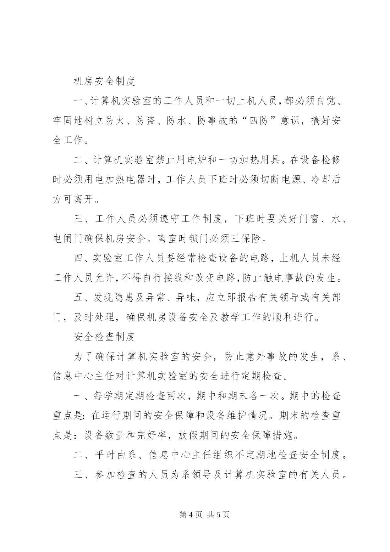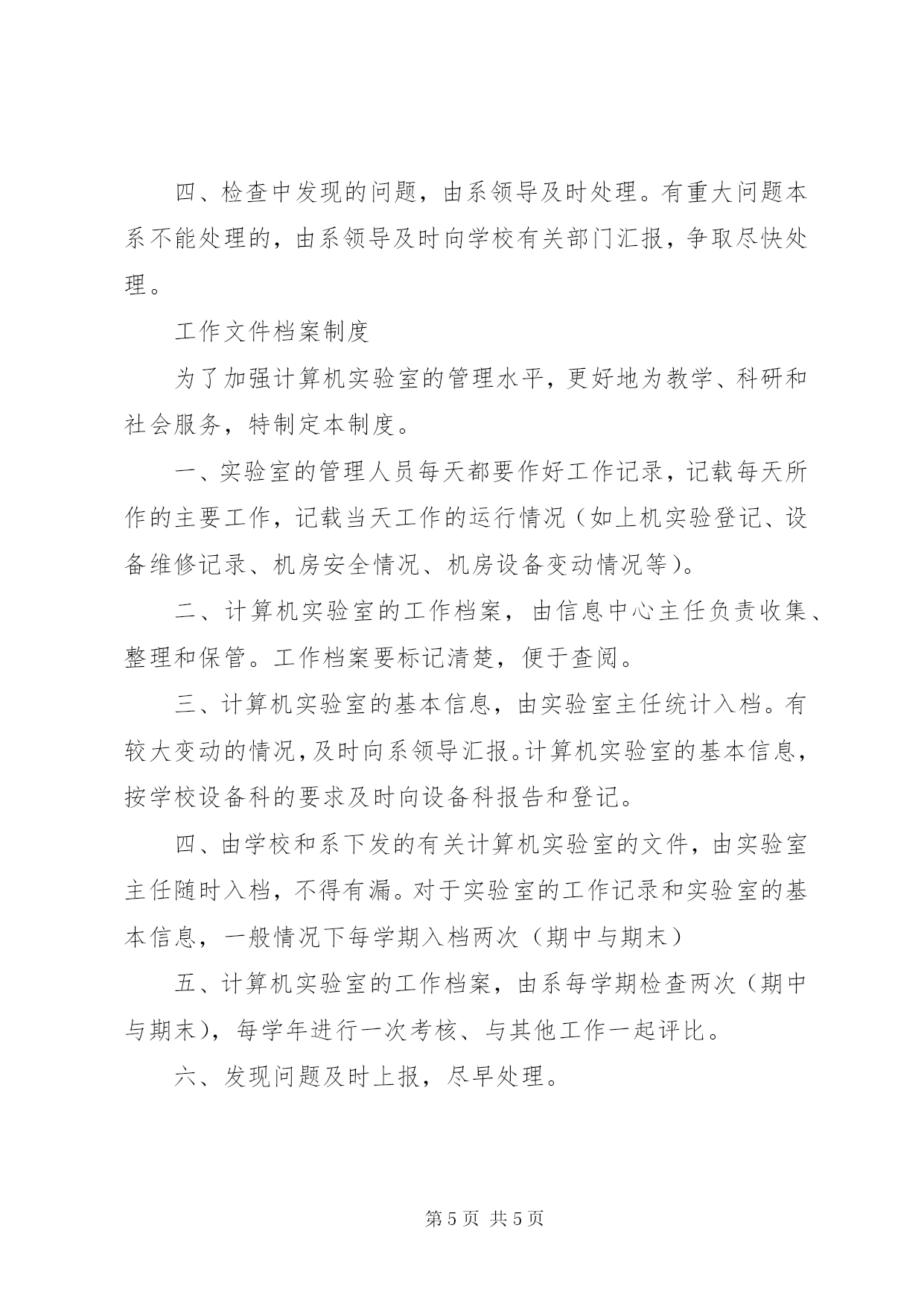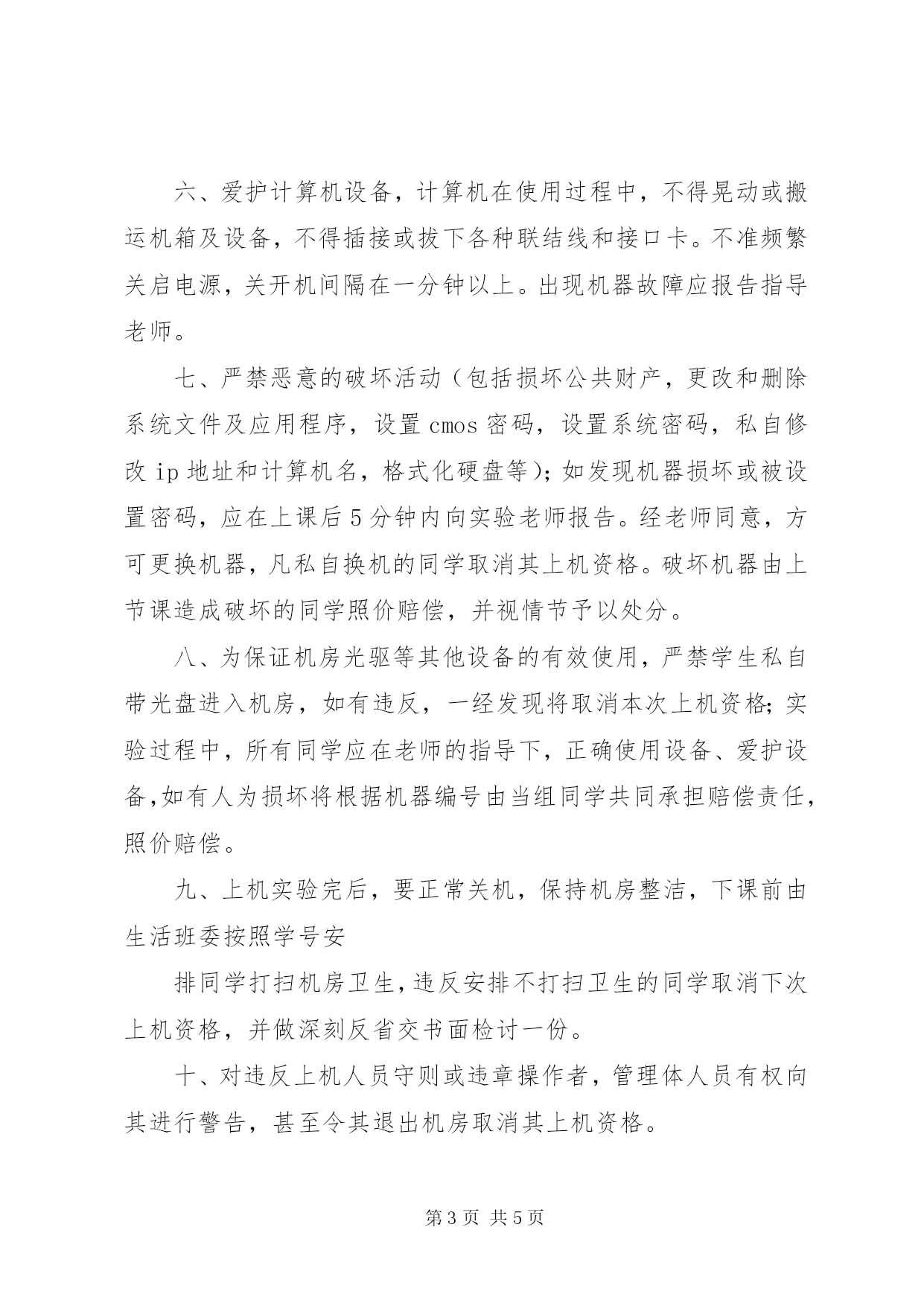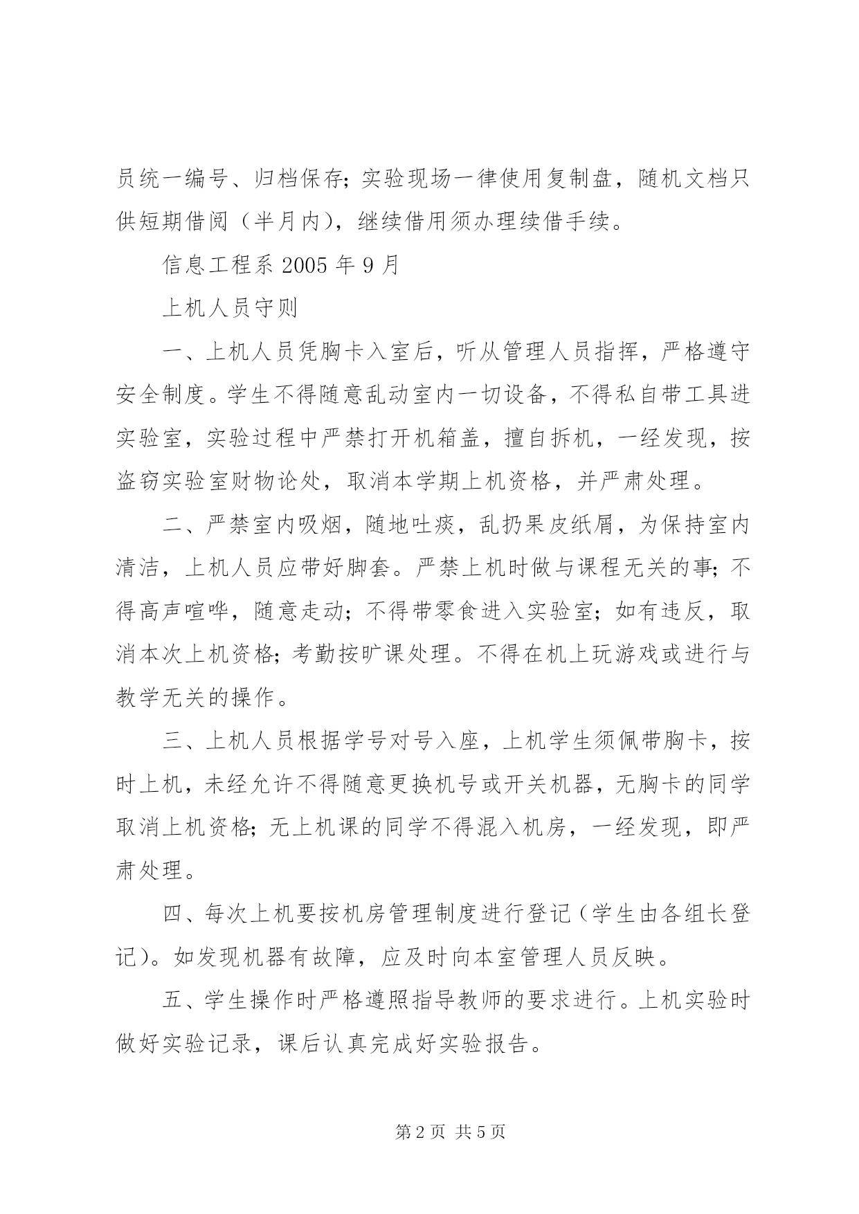 第PAGE\*Arabic\*MERGEFORMAT5页共NUMPAGES\*MERGEFORMAT5页计算机房管理使用制度机房管理制度一、本室设备均由本室工作人员管理,未经本室工作人员允许不得擅自入室,更不能随意动用本室设备。二、学生教学计划内用计算机,由系根据教学计划和实验项目统计表,统一安排、确定时间,并每次上机实验时要进行登记。三、教师因教学或科研需要用计算机时,由本人提出申请,经系领导批准,由本室管理人员安排时间方可用机,同时要进行登记。四、除本室工作人员外,未经系领导批准任何人不准使用本实验室的计算机设备。五、未经允许,本室计算机严禁拆机、装机。擅自拆机、装机造成零部件损坏要查明原因,由当事人负责赔偿80%,本室实践课负责人承担管理责任赔偿20%。六、对因未按规定要求造成计算机及设备损坏的,要查明原因,追究管理人员责任,照价赔偿。七、严格考勤,并记录学生上机情况及设备使用情况。八、实验完毕后,打扫室内卫生,检查计算机外部部件的数量并作记录。要关好门窗,检查设备电源、电灯、窗帘,做好安全防范工作。九、所有随机文档、驱动程序光(软)盘原盘由实验室资料员统一编号、归档保存;实验现场一律使用复制盘,随机文档只供短期借阅(半月内),继续借用须办理续借手续。信息工程系2005年9月上机人员守则一、上机人员凭胸卡入室后,听从管理人员指挥,严格遵守安全制度。学生不得随意乱动室内一切设备,不得私自带工具进实验室,实验过程中严禁打开机箱盖,擅自拆机,一经发现,按盗窃实验室财物论处,取消本学期上机资格,并严肃处理。二、严禁室内吸烟,随地吐痰,乱扔果皮纸屑,为保持室内清洁,上机人员应带好脚套。严禁上机时做与课程无关的事;不得高声喧哗,随意走动;不得带零食进入实验室;如有违反,取消本次上机资格;考勤按旷课处理。不得在机上玩游戏或进行与教学无关的操作。三、上机人员根据学号对号入座,上机学生须佩带胸卡,按时上机,未经允许不得随意更换机号或开关机器,无胸卡的同学取消上机资格;无上机课的同学不得混入机房,一经发现,即严肃处理。四、每次上机要按机房管理制度进行登记(学生由各组长登记)。如发现机器有故障,应及时向本室管理人员反映。五、学生操作时严格遵照指导教师的要求进行。上机实验时做好实验记录,课后认真完成好实验报告。六、爱护计算机设备,计算机在使用过程中,不得晃动或搬运机箱及设备,不得插接或拔下各种联结线和接口卡。不准频繁关启电源,关开机间隔在一分钟以上。出现机器故障应报告指导老师。七、严禁恶意的破坏活动(包括损坏公共财产,更改和删除系统文件及应用程序,设置cmos密码,设置系统密码,私自修改ip地址和计算机名,格式化硬盘等);如发现机器损坏或被设置密码,应在上课后5分钟内向实验老师报告。经老师同意,方可更换机器,凡私自换机的同学取消其上机资格。破坏机器由上节课造成破坏的同学照价赔偿,并视情节予以处分。八、为保证机房光驱等其他设备的有效使用,严禁学生私自带光盘进入机房,如有违反,一经发现将取消本次上机资格;实验过程中,所有同学应在老师的指导下,正确使用设备、爱护设备,如有人为损坏将根据机器编号由当组同学共同承担赔偿责任,照价赔偿。九、上机实验完后,要正常关机,保持机房整洁,下课前由生活班委按照学号安排同学打扫机房卫生,违反安排不打扫卫生的同学取消下次上机资格,并做深刻反省交书面检讨一份。十、对违反上机人员守则或违章操作者,管理体人员有权向其进行警告,甚至令其退出机房取消其上机资格。机房安全制度一、计算机实验室的工作人员和一切上机人员,都必须自觉、牢固地树立防火、防盗、防水、防事故的“四防”意识,搞好安全工作。二、计算机实验室禁止用电炉和一切加热用具。在设备检修时必须用电加热电器时,工作人员下班时必须切断电源、冷却后方可离开。三、工作人员必须遵守工作制度,下班时要关好门窗、水、电闸门确保机房安全。离室时锁门必须三保险。四、实验室工作人员要经常检查设备的电路,上机人员未经工作人员允许,不得自行接线和改变电路,防止触电事故的发生。五、发现隐患及异常、异味,应立即报告有关领导或有关部门,及时处理,确保机房设备安全及教学工作的顺利进行。安全检查制度为了确保计算机实验室的安全,防止意外事故的发生,系、信息中心主任对计算机实验室的安全进行定期检查。一、每学期定期检查两次,期中和期末各一次。期中的检查重点是:在运行期间的安全保障和设备维护情况。期末的检查重点是:设备数量和完好率,放假期间的安全保障措施。二、平时由系、信息中心主任组织不定期地检查安全制度。三、参加检查的人员为系领导及计算机实验室的有关人员。四、检查中发现的问题,由系领导及时处理。有重大问题本系不能处理的,由系领导及时向学校有关部门汇报,争取尽快处理。工作文件档案制度为了加强计