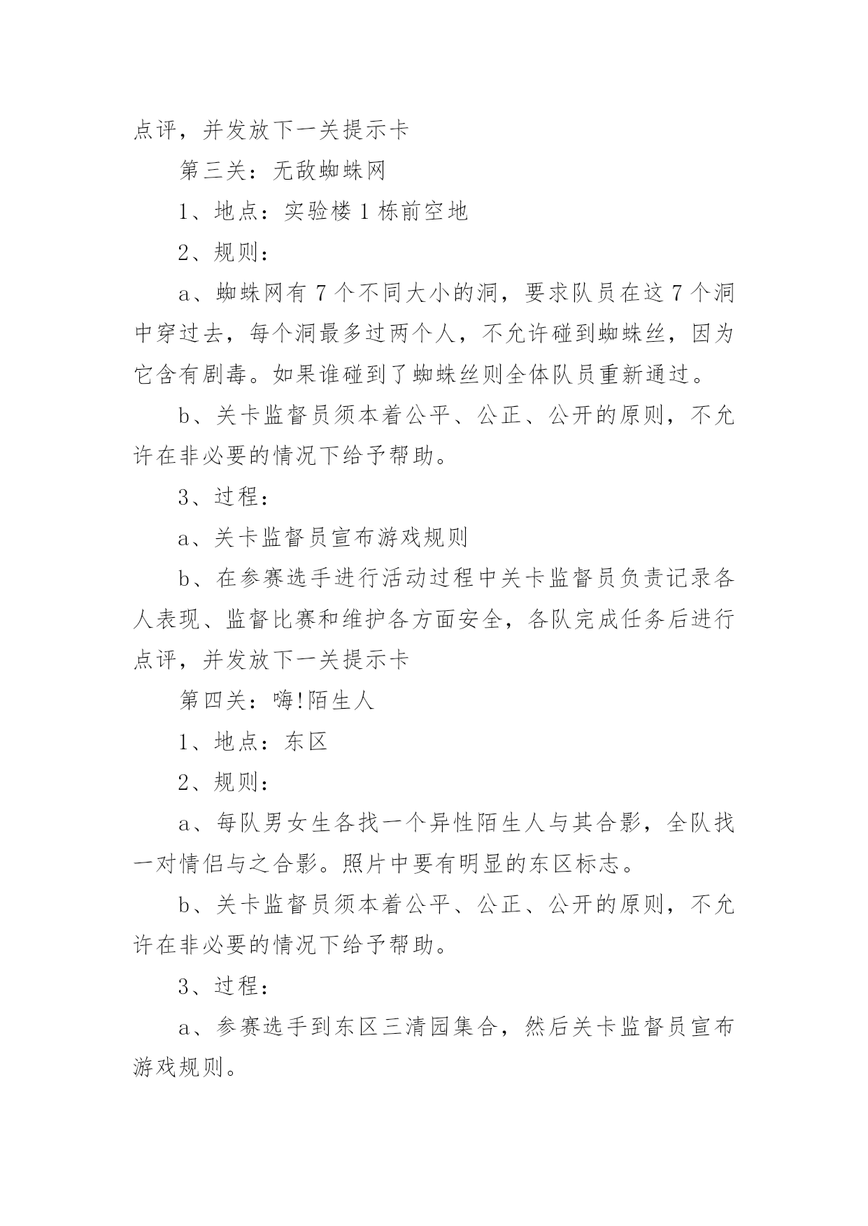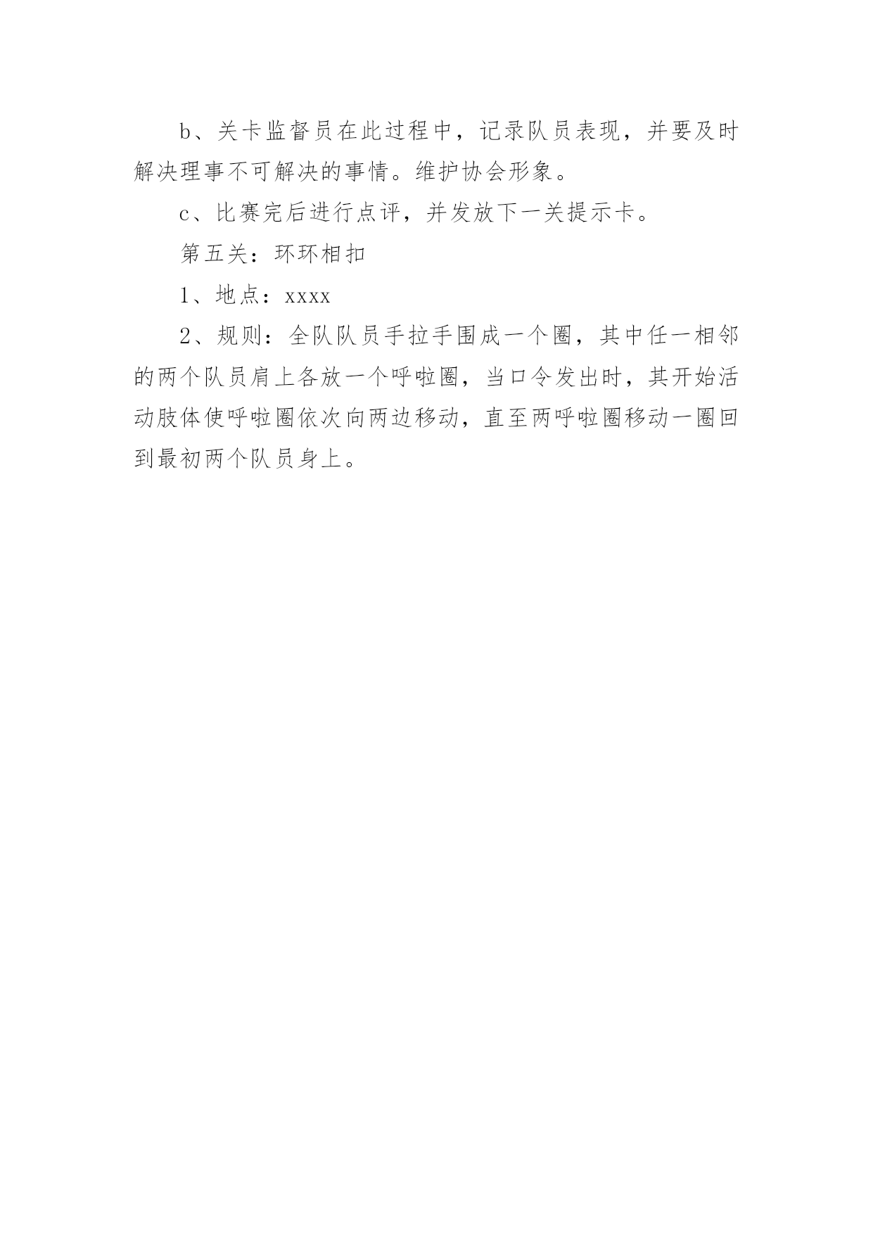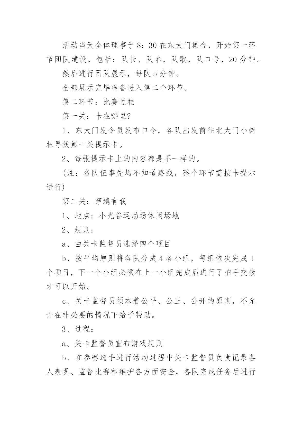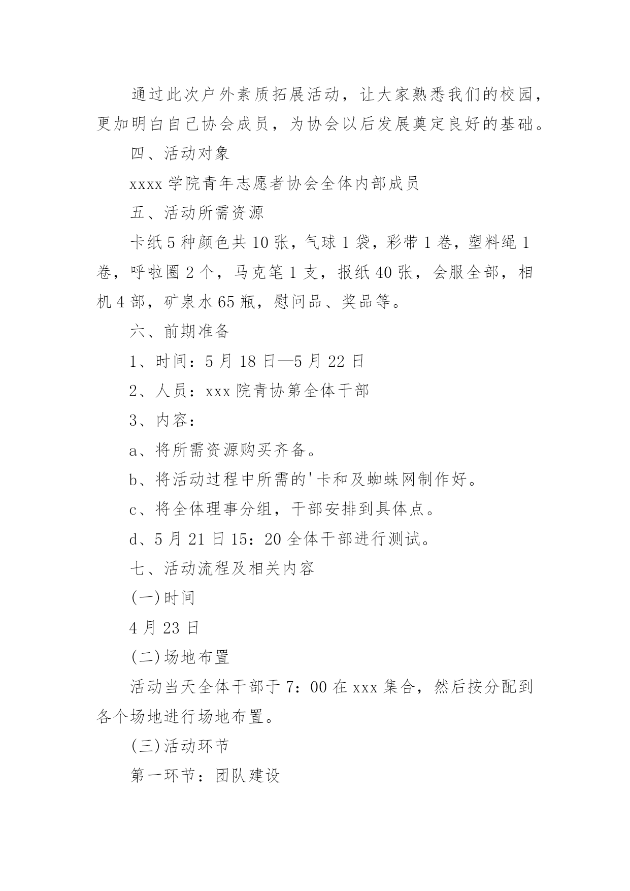 户外拓展活动方案户外拓展活动方案为了保障事情或工作顺利、圆满进行,常常需要预先制定方案,方案一般包括指导思想、主要目标、工作重点、实施步骤、政策措施、具体要求等项目。那么制定方案需要注意哪些问题呢?下面是小编整理的户外拓展活动方案,希望对大家有所帮助。一、活动背景在这个春意盎然,春夏交接之际,你是否感觉到体力有一股想要外出走走看看的冲动呢?你是否常听别人夸赞你所在的学校——xxx学院是个美丽的地方呢?你是否觉得身在xxx学院青年志愿者协会却由于自己的羞怯或者有事未参与活动而少于与他人接触呢?二、活动目的1、培育xxx院青协内部成员的团队协作精神,锻炼其团队的协作能力,加强团队凝聚力。2、加强管院青协成员的沟通,提升人际交往能力。3、锻炼身体,加强抵抗力。4、熟悉校园,感受校园里春天的气息。5、为xxx院青协成员创造一个美好的`回忆。三、活动意义通过此次户外素质拓展活动,让大家熟悉我们的校园,更加明白自己协会成员,为协会以后发展奠定良好的基础。四、活动对象xxxx学院青年志愿者协会全体内部成员五、活动所需资源卡纸5种颜色共10张,气球1袋,彩带1卷,塑料绳1卷,呼啦圈2个,马克笔1支,报纸40张,会服全部,相机4部,矿泉水65瓶,慰问品、奖品等。六、前期准备1、时间:5月18日—5月22日2、人员:xxx院青协第全体干部3、内容:a、将所需资源购买齐备。b、将活动过程中所需的'卡和及蜘蛛网制作好。c、将全体理事分组,干部安排到具体点。d、5月21日15:20全体干部进行测试。七、活动流程及相关内容(一)时间4月23日(二)场地布置活动当天全体干部于7:00在xxx集合,然后按分配到各个场地进行场地布置。(三)活动环节第一环节:团队建设活动当天全体理事于8:30在东大门集合,开始第一环节团队建设,包括:队长、队名,队歌,队口号,20分钟。然后进行团队展示,每队5分钟。全部展示完毕准备进入第二个环节。第二环节:比赛过程第一关:卡在哪里?1、东大门发令员发布口令,各队出发前往北大门小树林寻找第一关提示卡。2、每张提示卡上的内容都是不一样的。(注:各队伍事先均不知道路线,整个环节需按卡提示进行)第二关:穿越有我1、地点:小光谷运动场休闲场地2、规则:a、由关卡监督员选择四个项目b、按平均原则将各队分成4各小组,每组依次完成1个项目,下一个小组必须在上一小组完成后进行了拍手交接才可以开始。c、关卡监督员须本着公平、公正、公开的原则,不允许在非必要的情况下给予帮助。3、过程:a、关卡监督员宣布游戏规则b、在参赛选手进行活动过程中关卡监督员负责记录各人表现、监督比赛和维护各方面安全,各队完成任务后进行点评,并发放下一关提示卡第三关:无敌蜘蛛网1、地点:实验楼1栋前空地2、规则:a、蜘蛛网有7个不同大小的洞,要求队员在这7个洞中穿过去,每个洞最多过两个人,不允许碰到蜘蛛丝,因为它含有剧毒。如果谁碰到了蜘蛛丝则全体队员重新通过。b、关卡监督员须本着公平、公正、公开的原则,不允许在非必要的情况下给予帮助。3、过程:a、关卡监督员宣布游戏规则b、在参赛选手进行活动过程中关卡监督员负责记录各人表现、监督比赛和维护各方面安全,各队完成任务后进行点评,并发放下一关提示卡第四关:嗨!陌生人1、地点:东区2、规则:a、每队男女生各找一个异性陌生人与其合影,全队找一对情侣与之合影。照片中要有明显的东区标志。b、关卡监督员须本着公平、公正、公开的原则,不允许在非必要的情况下给予帮助。3、过程:a、参赛选手到东区三清园集合,然后关卡监督员宣布游戏规则。b、关卡监督员在此过程中,记录队员表现,并要及时解决理事不可解决的事情。维护协会形象。c、比赛完后进行点评,并发放下一关提示卡。第五关:环环相扣1、地点:xxxx2、规则:全队队员手拉手围成一个圈,其中任一相邻的两个队员肩上各放一个呼啦圈,当口令发出时,其开始活动肢体使呼啦圈依次向两边移动,直至两呼啦圈移动一圈回到最初两个队员身上。