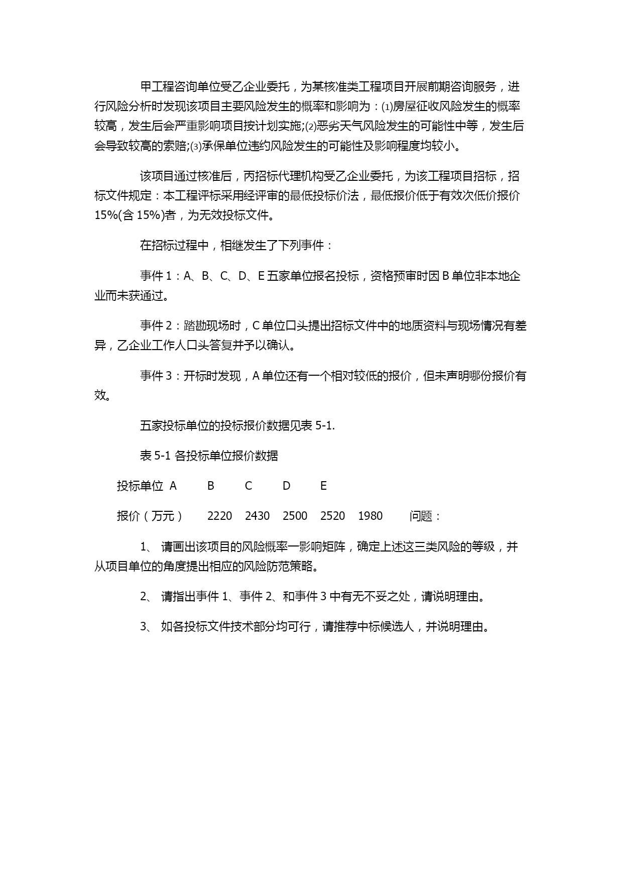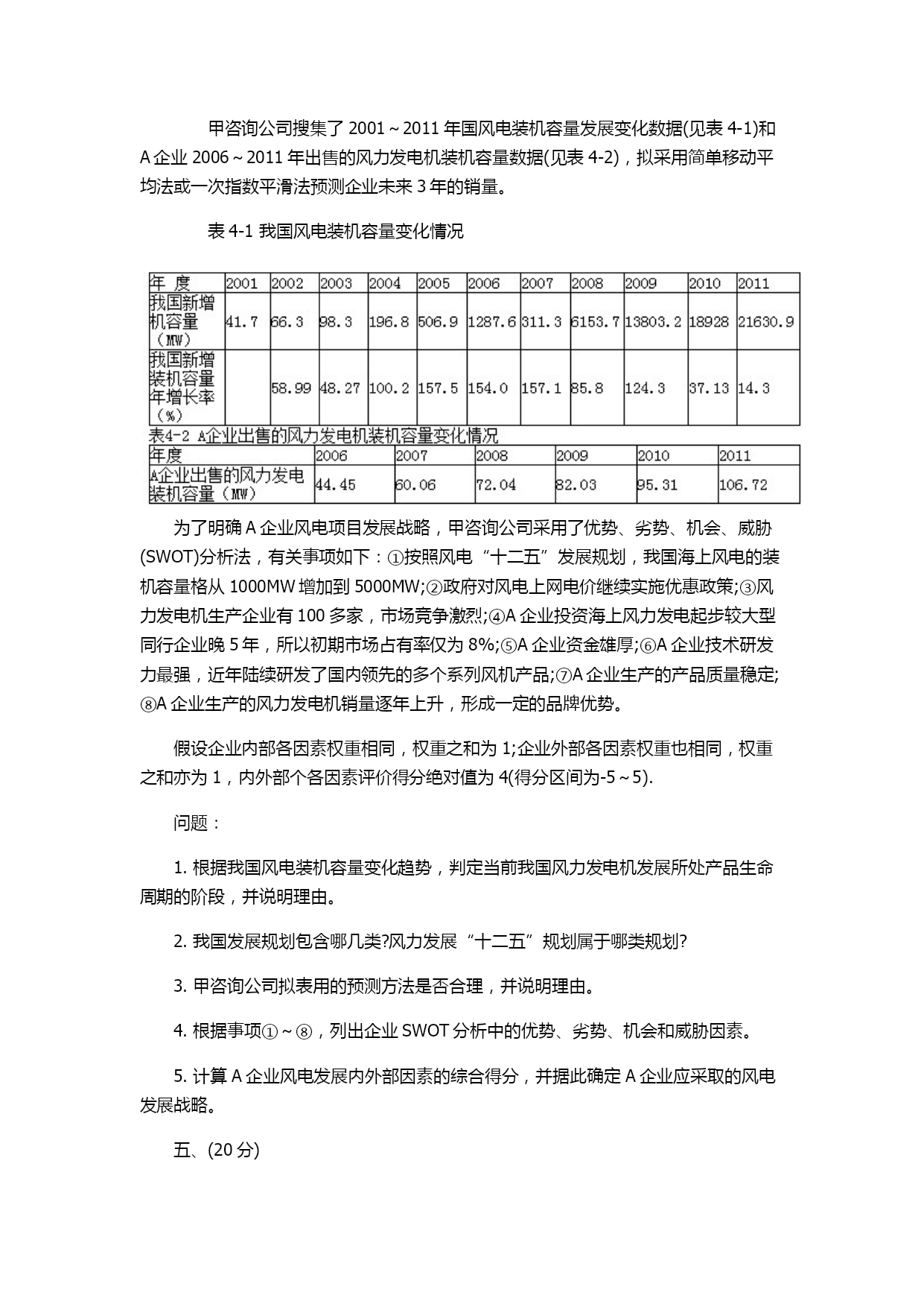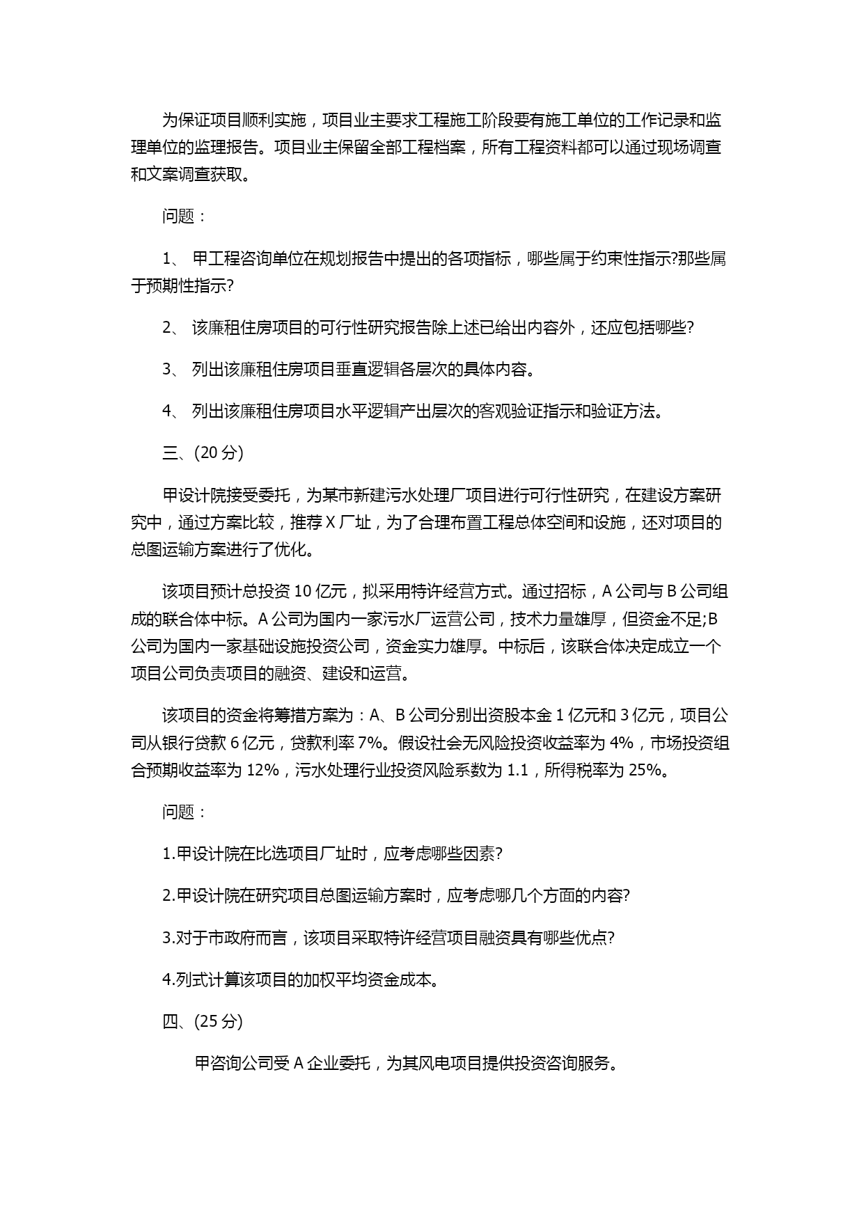 2013年咨询工程师方法与实务考试真题-文字版一、(20分)某市为提高“十二五”期末服务业增加值比重,提出建设快速公交走廊工程、垃圾处理场、农贸市场等一子投资计划,以提高公共服务水平,促进当地服务业快捷发展。该统计覆盖的建设项目将影响全市3个区3个乡镇(街道)的5个村/社区,其他包括1个少数民族聚居区。需要征收180市集体土地和城镇居民房屋31700平方米,影响259户共994人:拆迁商业店铺50个,总建筑面积2800平方米。项目单位从项目实施的必要性、有效性和经济性角度,自行对拟建项目社会稳定风险分析报告进行了评估论证,并提出了低风险的结论。同时,要求将征地拆迁及移民安置方案分析、社会稳定风险分析作为项目可行性研究报告的独立篇章。问题:1、该投资计划所项目的土地,房屋征用及移民安置方案分析应重点关注哪些内容?2、列出该投资计划所含项目可能影响社会稳定的三个主要风险因素。3、项目单位有关社会稳定风险评估的做法是否正确?说明理由。二、(25分)甲工程咨询单位接受委托,为某市编制国民经济和社会发展规划,提出了国内生产总值、九年制义务教育巩固率、耕地保有量、城镇登记失业率、城镇居民人均可支配收入、城镇保障性安居工程建设量等规划指示。该市政府为了落实城镇保障性安居工程规划,改善低收入群体的居住条件,计划2013年建设10万平方米的廉租住房小区,以及小区道路和绿地等配套设施,解决2000户低收入居民的住房问题。建设资金主要来源于中央政府投资补助和地方政府配套资金。项目建设工作的主要内容包括:可行性研究、勘察设计、工程招标、工程施工、工程监理、竣工验收等。甲工程咨询单位编制了该项目的可行性研究报告,内容包括:项目需求及目标定位、项目建设方案、项目实施方案、风险评价等。并采用逻辑框架法对项目进行了总体分析。为保证项目顺利实施,项目业主要求工程施工阶段要有施工单位的工作记录和监理单位的监理报告。项目业主保留全部工程档案,所有工程资料都可以通过现场调查和文案调查获取。问题:1、甲工程咨询单位在规划报告中提出的各项指标,哪些属于约束性指示?那些属于预期性指示?2、该廉租住房项目的可行性研究报告除上述已给出内容外,还应包括哪些?3、列出该廉租住房项目垂直逻辑各层次的具体内容。4、列出该廉租住房项目水平逻辑产出层次的客观验证指示和验证方法。三、(20分)甲设计院接受委托,为某市新建污水处理厂项目进行可行性研究,在建设方案研究中,通过方案比较,推荐X厂址,为了合理布置工程总体空间和设施,还对项目的总图运输方案进行了优化。该项目预计总投资10亿元,拟采用特许经营方式。通过招标,A公司与B公司组成的联合体中标。A公司为国内一家污水厂运营公司,技术力量雄厚,但资金不足;B公司为国内一家基础设施投资公司,资金实力雄厚。中标后,该联合体决定成立一个项目公司负责项目的融资、建设和运营。该项目的资金将筹措方案为:A、B公司分别出资股本金1亿元和3亿元,项目公司从银行贷款6亿元,贷款利率7%。假设社会无风险投资收益率为4%,市场投资组合预期收益率为12%,污水处理行业投资风险系数为1.1,所得税率为25%。问题:1.甲设计院在比选项目厂址时,应考虑哪些因素?2.甲设计院在研究项目总图运输方案时,应考虑哪几个方面的内容?3.对于市政府而言,该项目采取特许经营项目融资具有哪些优点?4.列式计算该项目的加权平均资金成本。四、(25分)甲咨询公司受A企业委托,为其风电项目提供投资咨询服务。甲咨询公司搜集了2001~2011年国风电装机容量发展变化数据(见表4-1)和A企业2006~2011年出售的风力发电机装机容量数据(见表4-2),拟采用简单移动平均法或一次指数平滑法预测企业未来3年的销量。表4-1我国风电装机容量变化情况为了明确A企业风电项目发展战略,甲咨询公司采用了优势、劣势、机会、威胁(SWOT)分析法,有关事项如下:①按照风电“十二五”发展规划,我国海上风电的装机容量格从1000MW增加到5000MW;②政府对风电上网电价继续实施优惠政策;③风力发电机生产企业有100多家,市场竞争激烈;④A企业投资海上风力发电起步较大型同行企业晚5年,所以初期市场占有率仅为8%;⑤A企业资金雄厚;⑥A企业技术研发力最强,近年陆续研发了国内领先的多个系列风机产品;⑦A企业生产的产品质量稳定;⑧A企业生产的风力发电机销量逐年上升,形成一定的品牌优势。假设企业内部各因素权重相同,权重之和为1;企业外部各因素权重也相同,权重之和亦为1,内外部个各因素评价得分绝对值为4(得分区间为-5~5).问题:1.根据我国风电装机容量变化趋势,判定当前我国风力发电机发展所处产品生命周期的阶段,并说明理由。2.我国发展规划包含哪几类