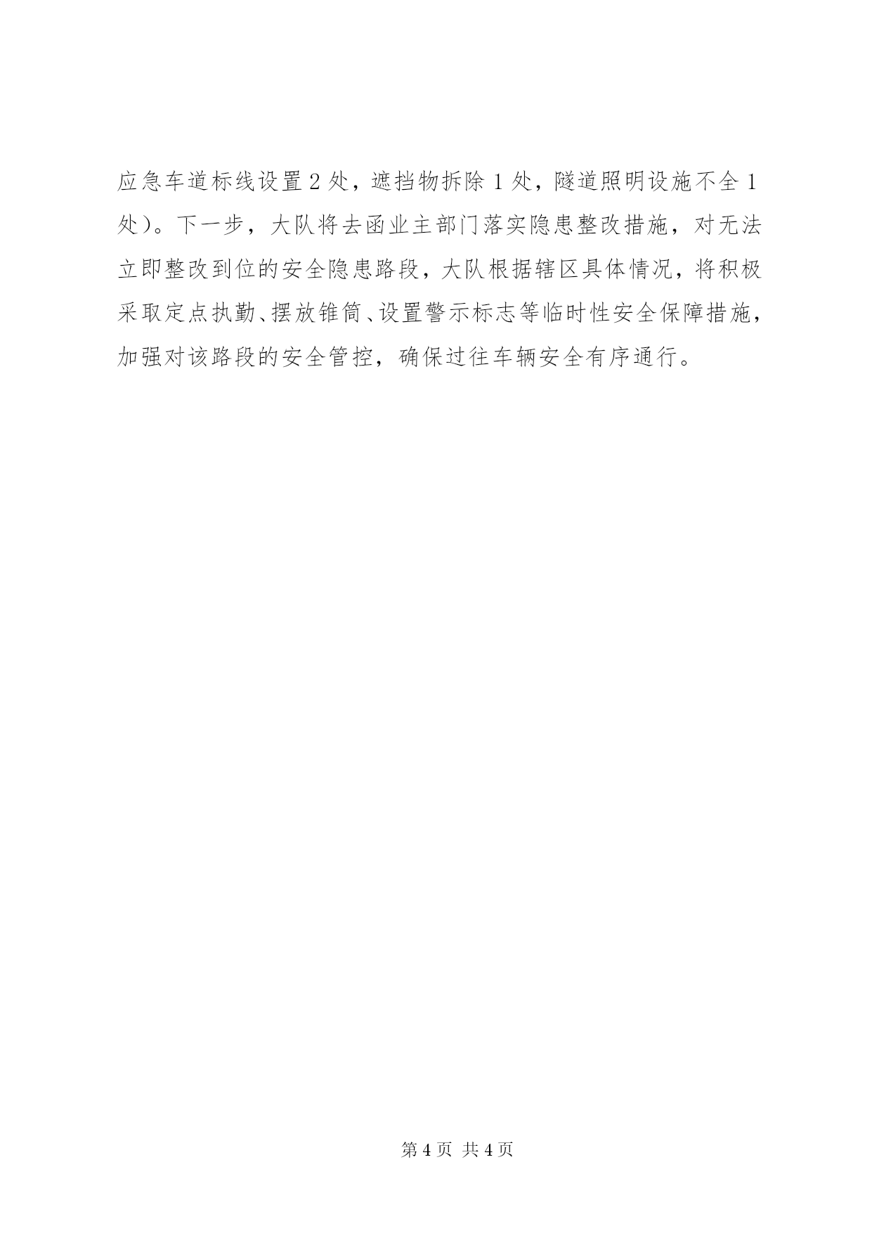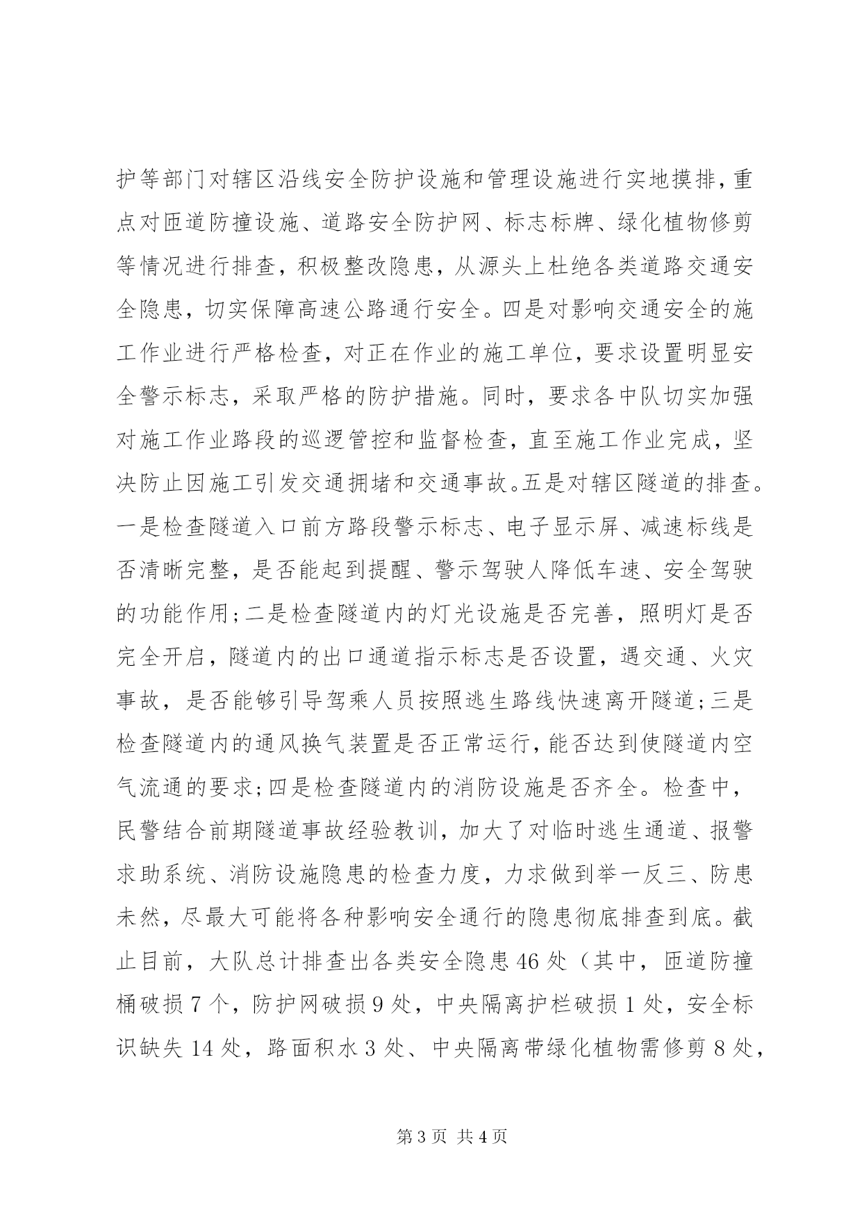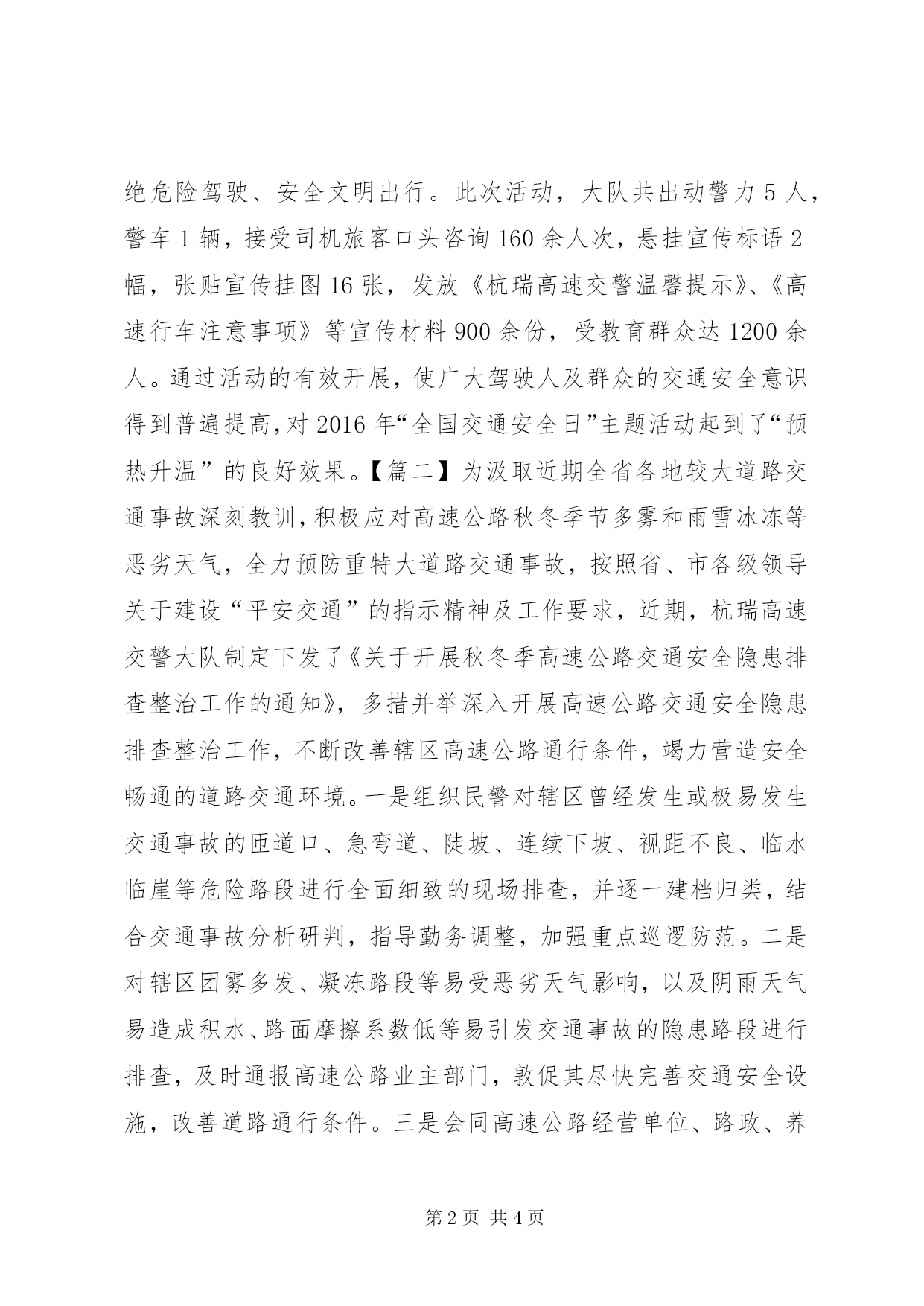 第PAGE\*Arabic\*MERGEFORMAT4页共NUMPAGES\*MERGEFORMAT4页XX年交通安全宣传活动简报【篇一】为认真贯彻落实《XX省2016年“全国交通安全日”主题活动工作方案》要求,推动“文明交通行动计划”深入实施,保障人民群众生命财产安全,确保岁末年终客运车辆安全、有序,11月20日,杭瑞高速交警大队联合xx县路政大队,走进xx县客运站开展交通安全宣传活动。活动中,宣传民警首先在xx县客运站候车大厅悬挂宣传横幅、粘贴宣传海报、发放宣传单等方式,积极营造浓厚的宣传氛围。随后,民警走进候车厅,向客运站驾驶员和旅客细心讲解了冬季要注意的交通安全问题。教育驾驶员牢固树立交通安全意识和法治意识,自觉遵守交通法律法规,文明驾驶、安全出行;告诉旅客要拒绝搭乘安全隐患车辆,敢于揭发客车超员,坚决不坐超员车;要求司机旅客与高速交警协作配合,共同创造安全有序、文明畅通的交通环境。为确保冬季交通安全工作“不留死角”,宣传民警还向驾驶员介绍了大队近期开展“营转非”大客车等五类重点车辆检验率和报废率专项行动的基本情况,主动了解驾驶员对冬季道路交通事故预防工作的建议和看法。最后,宣传民警、路政大队工作人员一起走进客车站台,现场对将要出站的客车的制动、灯光及灭火设备、反光三角牌等安全设施进行临检,督促车站安全管理员和驾驶员加强检查,不让一辆“病车”上路,教育广大驾驶员要认真汲取交通事故的惨痛教训,驾车不超速、不超员、不疲劳驾驶、不违法停车,拒绝危险驾驶、安全文明出行。此次活动,大队共出动警力5人,警车1辆,接受司机旅客口头咨询160余人次,悬挂宣传标语2幅,张贴宣传挂图16张,发放《杭瑞高速交警温馨提示》、《高速行车注意事项》等宣传材料900余份,受教育群众达1200余人。通过活动的有效开展,使广大驾驶人及群众的交通安全意识得到普遍提高,对2016年“全国交通安全日”主题活动起到了“预热升温”的良好效果。【篇二】为汲取近期全省各地较大道路交通事故深刻教训,积极应对高速公路秋冬季节多雾和雨雪冰冻等恶劣天气,全力预防重特大道路交通事故,按照省、市各级领导关于建设“平安交通”的指示精神及工作要求,近期,杭瑞高速交警大队制定下发了《关于开展秋冬季高速公路交通安全隐患排查整治工作的通知》,多措并举深入开展高速公路交通安全隐患排查整治工作,不断改善辖区高速公路通行条件,竭力营造安全畅通的道路交通环境。一是组织民警对辖区曾经发生或极易发生交通事故的匝道口、急弯道、陡坡、连续下坡、视距不良、临水临崖等危险路段进行全面细致的现场排查,并逐一建档归类,结合交通事故分析研判,指导勤务调整,加强重点巡逻防范。二是对辖区团雾多发、凝冻路段等易受恶劣天气影响,以及阴雨天气易造成积水、路面摩擦系数低等易引发交通事故的隐患路段进行排查,及时通报高速公路业主部门,敦促其尽快完善交通安全设施,改善道路通行条件。三是会同高速公路经营单位、路政、养护等部门对辖区沿线安全防护设施和管理设施进行实地摸排,重点对匝道防撞设施、道路安全防护网、标志标牌、绿化植物修剪等情况进行排查,积极整改隐患,从源头上杜绝各类道路交通安全隐患,切实保障高速公路通行安全。四是对影响交通安全的施工作业进行严格检查,对正在作业的施工单位,要求设置明显安全警示标志,采取严格的防护措施。同时,要求各中队切实加强对施工作业路段的巡逻管控和监督检查,直至施工作业完成,坚决防止因施工引发交通拥堵和交通事故。五是对辖区隧道的排查。一是检查隧道入口前方路段警示标志、电子显示屏、减速标线是否清晰完整,是否能起到提醒、警示驾驶人降低车速、安全驾驶的功能作用;二是检查隧道内的灯光设施是否完善,照明灯是否完全开启,隧道内的出口通道指示标志是否设置,遇交通、火灾事故,是否能够引导驾乘人员按照逃生路线快速离开隧道;三是检查隧道内的通风换气装置是否正常运行,能否达到使隧道内空气流通的要求;四是检查隧道内的消防设施是否齐全。检查中,民警结合前期隧道事故经验教训,加大了对临时逃生通道、报警求助系统、消防设施隐患的检查力度,力求做到举一反三、防患未然,尽最大可能将各种影响安全通行的隐患彻底排查到底。截止目前,大队总计排查出各类安全隐患46处(其中,匝道防撞桶破损7个,防护网破损9处,中央隔离护栏破损1处,安全标识缺失14处,路面积水3处、中央隔离带绿化植物需修剪8处,应急车道标线设置2处,遮挡物拆除1处,隧道照明设施不全1处)。下一步,大队将去函业主部门落实隐患整改措施,对无法立即整改到位的安全隐患路段,大队根据辖区具体情况,将积极采取定点执勤、摆放锥筒、设置警示标志等临时性安全保障措施,加强对该路段的安全管控,确保过往车辆安全有序通行。