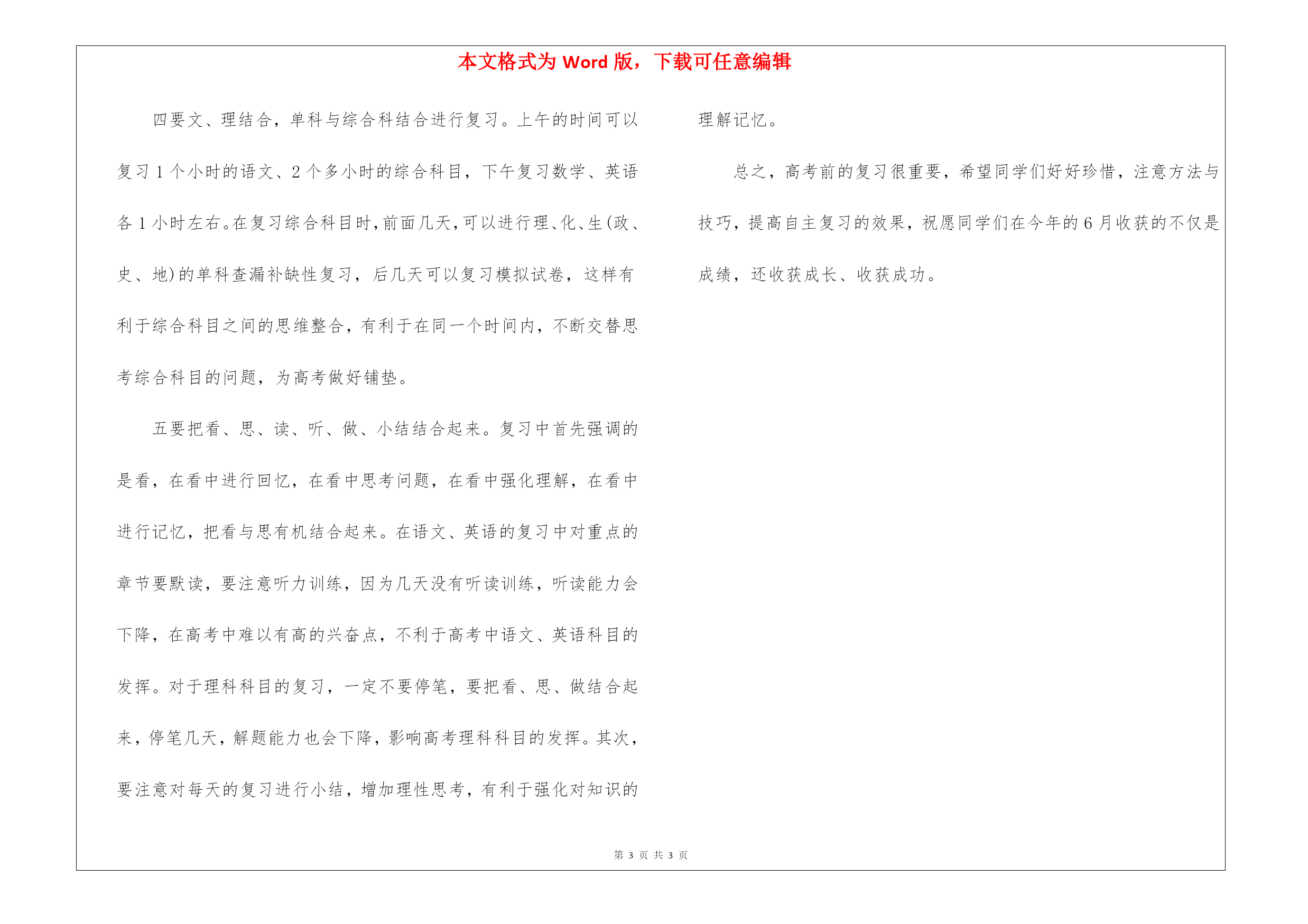 本文格式为Word版,下载可任意编辑第PAGE\*MERGEFORMAT3页共NUMPAGES\*MERGEFORMAT3页高考前如何自主复习高考前如何自主复习自主复习在学校更好经过多年的实践和对比实验,我发现,高考前的自主复习在学校复习效果更好。一是高考前的复习,最好不要改变学习环境,高三1年上课均在学校,考生已经比较适应学校的环境,能够自然地过渡到高考,心态比较平稳,有利于高考的正常发挥。二是在学校复习,当遇到问题时,能够问老师与同学,及时解决复习中存在的问题,在解决问题的过程中提高自信心,有利于精神状态的调整,这对高考大有好处。三是在学校复习,有很多同学在一起学习、一起努力、一起前进。同学之间又存在竞争心理,有利于个人兴奋点和学习效率的提高。四是在学校复习,时间上有规律,生活上有节奏,可以适当参加一些体育活动,还会有来自老师的鼓励与安慰,感觉踏实,有良好的积极进取的心态,利于提升复习效果。因此,建议同学们还是在学校复习。各科复习时间要与考时同步这段时间要很好地调节生物钟,要注意把学习与休息有机结合起来。因高考7日上午考语文,下午考数学,8日上午考综合,下午考英语,所以这段自主学习的.时间最好是上午复习语文与综合,下午复习数学与英语,这样有利于在相应的时间对相应的科目产生兴趣,提高兴奋点,利于高考生物钟的调整。晚上可以进行调节性复习,可以以综合科目与数学为主。但每天要保证8小时睡眠,保证1小时适度的体育锻炼,这样精力充沛,有利于复习效果的提升。偏科生全面复习好偏科生在这段时间内,应该以提高高考总分为出发点进行复习。偏科所形成的弱势科目,已是冰冻三尺,非一日之寒,向弱势科目倾斜大量的时间是得不偿失的,应该对6个科目进行全面有重点的复习。复习主要以看一模以来的模拟试卷、学校自主开发的复习资料为主,还要根据考试说明中所列的知识点进行回忆,在回忆过程中发现问题,带着问题看教材,这样可以提高看书的针对性。在复习中要把看、思、做、小结结合起来,反对死记硬背,提倡多动脑,多问几个为什么?提高运用已有的学科知识来解决具体问题的能力,要相信,带进高考考场的不仅是知识,更是能力和智慧。复习重“四基”高考试题中有容易题、中等难度题与难题,但以中等难度题为主。容易题与中等难度题要占到80%左右,这些题都是基础题,真正的难题只占到20%。高考前的自主复习重在复习基础与查漏补缺,解决难题的能力不是一时能提高的和下降的,这是一个能力积淀的过程,高考能不能考出理想成绩,关键是基础题做得怎么样。因此,高考前的复习,反对好高骛远,提倡脚踏实地。基本概念、基本规律、基本公式、基本实验、答题技巧、解题格式,是复习中要特别注意的问题,考前复习一定要回归基础、回归书本、回归基本题。如何提高复习效果一要提高时间效能。把事情很快地做完,叫做效率;把事情很快又很对地做完,叫做效能。花时间在计划上才是最节省时间的作法,因此,考前的自主复习要制定学习计划,按计划办事,是提高时间效能的有效方法。二要提高信心指数。要对自己充满信心,要把握机遇。信心是成功的前提,是取得高考前复习效果的关键,要自己鼓气,精神愉悦地去复习。三要抓关键与重点。不要平均使用力量,要学会抓关键与重点。注意学科的主干知识、核心知识;注意老师强调的重点与关键;注意近来试卷上经常出现的问题;注意自己经常出错误的问题;注意寻找自己的缺漏。四要文、理结合,单科与综合科结合进行复习。上午的时间可以复习1个小时的语文、2个多小时的综合科目,下午复习数学、英语各1小时左右。在复习综合科目时,前面几天,可以进行理、化、生(政、史、地)的单科查漏补缺性复习,后几天可以复习模拟试卷,这样有利于综合科目之间的思维整合,有利于在同一个时间内,不断交替思考综合科目的问题,为高考做好铺垫。五要把看、思、读、听、做、小结结合起来。复习中首先强调的是看,在看中进行回忆,在看中思考问题,在看中强化理解,在看中进行记忆,把看与思有机结合起来。在语文、英语的复习中对重点的章节要默读,要注意听力训练,因为几天没有听读训练,听读能力会下降,在高考中难以有高的兴奋点,不利于高考中语文、英语科目的发挥。对于理科科目的复习,一定不要停笔,要把看、思、做结合起来,停笔几天,解题能力也会下降,影响高考理科科目的发挥。其次,要注意对每天的复习进行小结,增加理性思考,有利于强化对知识的理解记忆。总之,高考前的复习很重要,希望同学们好好珍惜,注意方法与技巧,提高自主复习的效果,祝愿同学们在今年的6月收获的不仅是成绩,还收获成长、收获成功。
