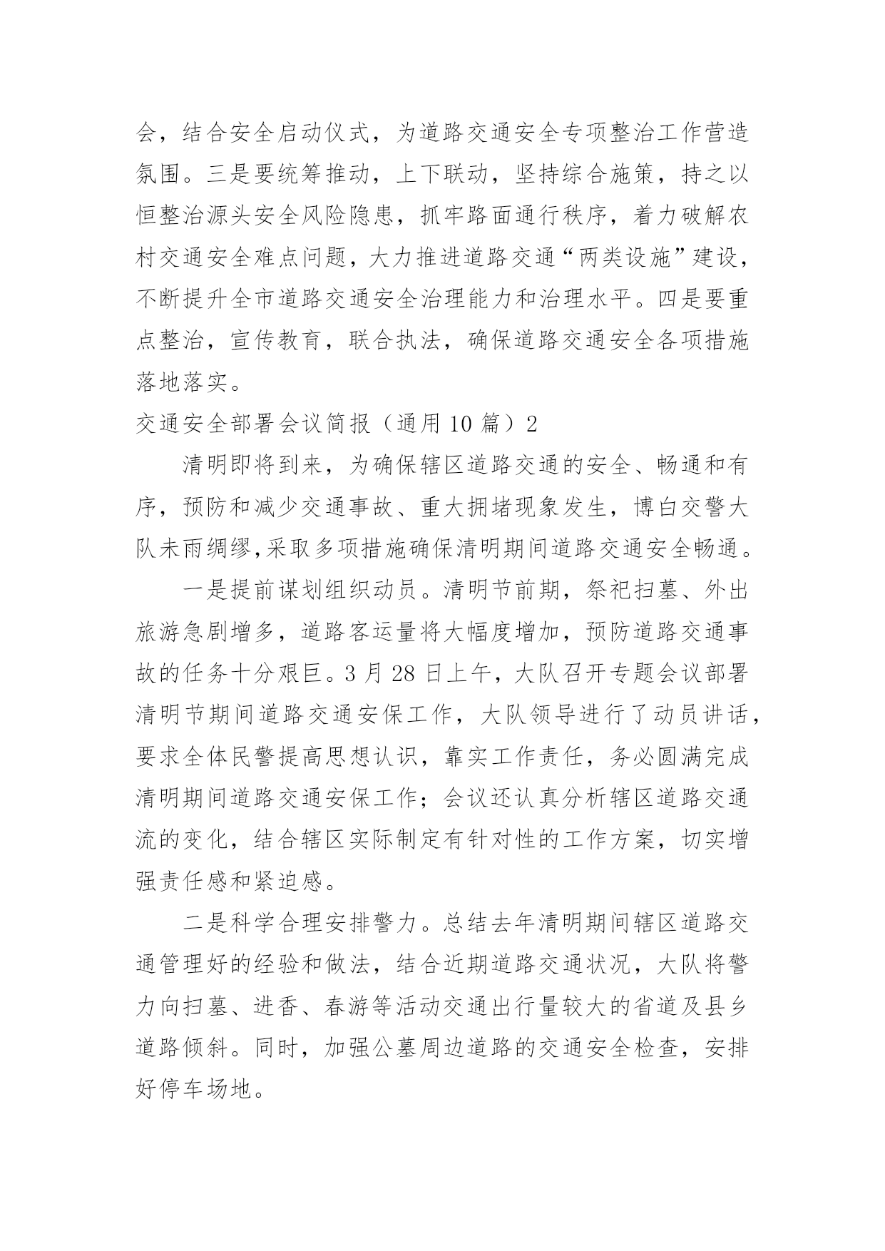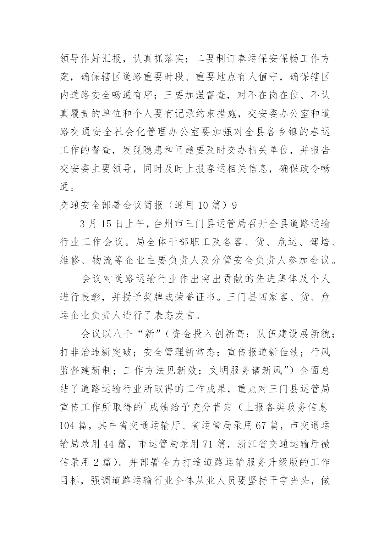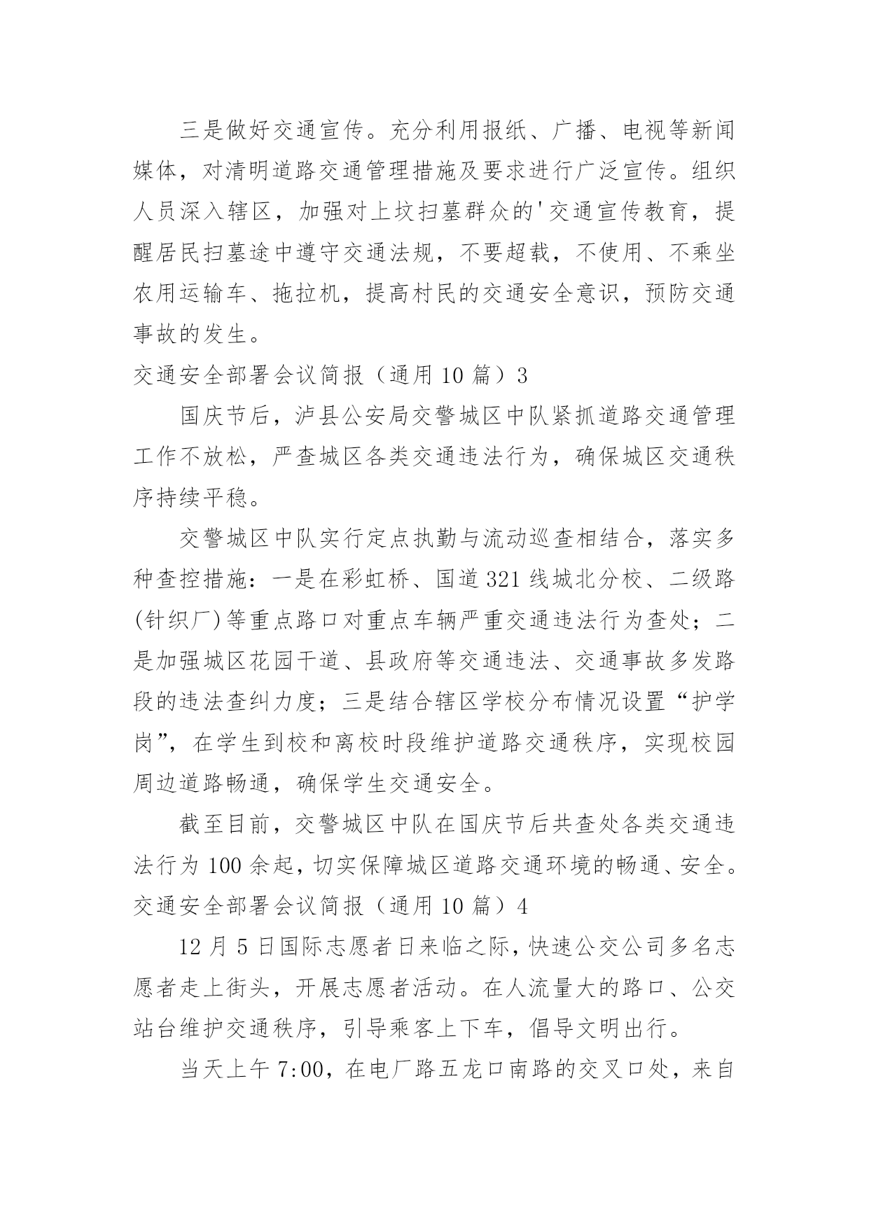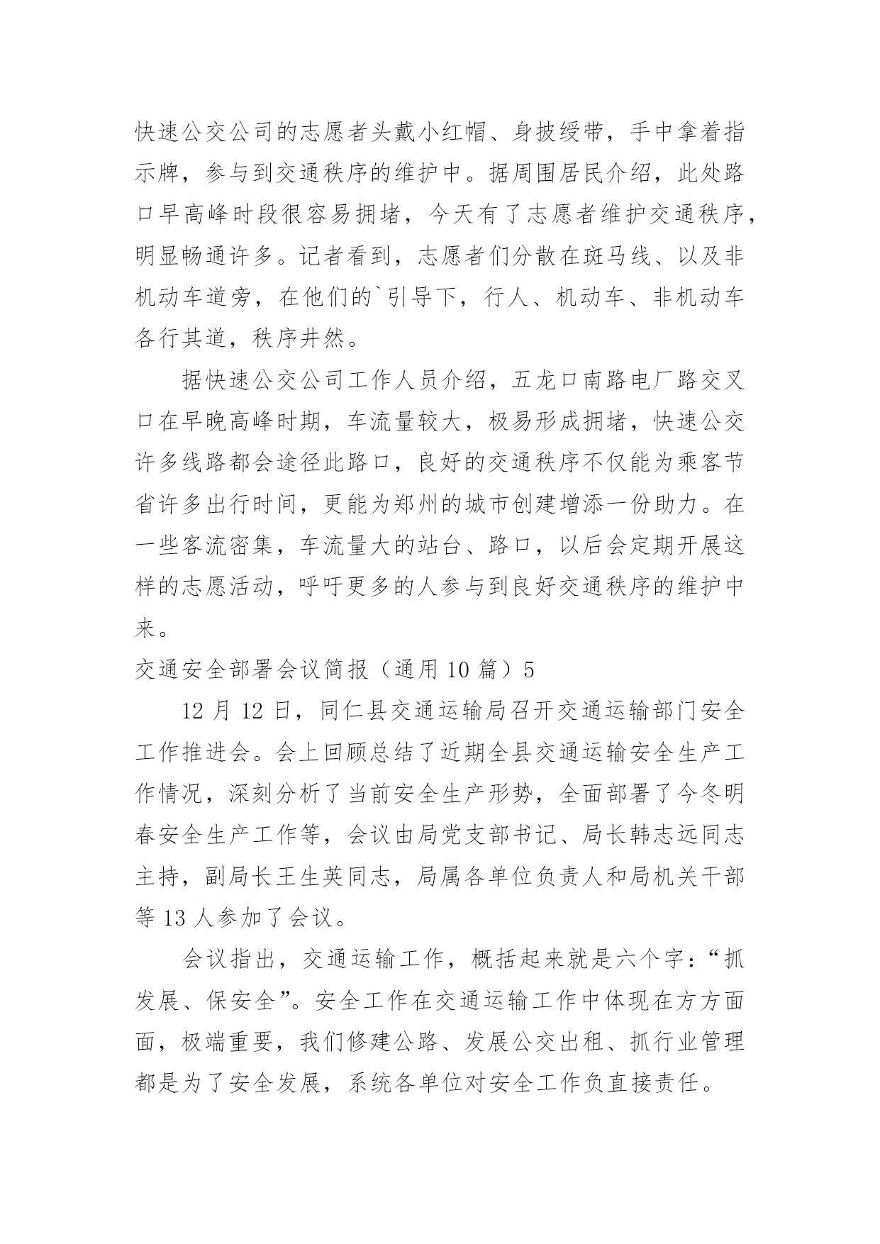 交通安全部署会议简报交通安全部署会议简报(通用10篇)在我们平凡的日常里,简报使用的频率越来越高,简报的写作既不同于文字作品,也不同于评论文章。你所见过的简报是什么样的呢?以下是小编收集整理的交通安全部署会议简报(通用10篇),希望对大家有所帮助。交通安全部署会议简报(通用10篇)14月19号,宣威市召开道路交通安全专题工作会议,总结20xx年一季度全市道路交通安全工作,分析研判当前形势,安排部署下一步工作。宣威市委副书记、市长许韶发主持会议并讲话。宣威市人民政府副市长、市公安局局长周东暄,副市长王斌鸿,市交安委办主要负责人参加会议。许韶发强调:道路交通安全是公共安全的重要组成部分,各部门要进一步提高政治站位,清醒认识道路交通安全工作面临的风险隐患,从执法、管理、服务等各方面综合发力,不断提升道路交通安全管理水平,为党的二十大胜利召开创造安全畅通的`交通环境。许韶发要求:一是要完善好一个方案。以云南省交通运输文化建设“十百千”工程为抓手,制定出《宣威市道路交通安全专项整治方案》,形成专班统筹协调各项工作。二是要开好一个会议。组织召开道路交通安全专项整治工作动员会,结合安全启动仪式,为道路交通安全专项整治工作营造氛围。三是要统筹推动,上下联动,坚持综合施策,持之以恒整治源头安全风险隐患,抓牢路面通行秩序,着力破解农村交通安全难点问题,大力推进道路交通“两类设施”建设,不断提升全市道路交通安全治理能力和治理水平。四是要重点整治,宣传教育,联合执法,确保道路交通安全各项措施落地落实。交通安全部署会议简报(通用10篇)2清明即将到来,为确保辖区道路交通的安全、畅通和有序,预防和减少交通事故、重大拥堵现象发生,博白交警大队未雨绸缪,采取多项措施确保清明期间道路交通安全畅通。一是提前谋划组织动员。清明节前期,祭祀扫墓、外出旅游急剧增多,道路客运量将大幅度增加,预防道路交通事故的任务十分艰巨。3月28日上午,大队召开专题会议部署清明节期间道路交通安保工作,大队领导进行了动员讲话,要求全体民警提高思想认识,靠实工作责任,务必圆满完成清明期间道路交通安保工作;会议还认真分析辖区道路交通流的变化,结合辖区实际制定有针对性的工作方案,切实增强责任感和紧迫感。二是科学合理安排警力。总结去年清明期间辖区道路交通管理好的经验和做法,结合近期道路交通状况,大队将警力向扫墓、进香、春游等活动交通出行量较大的省道及县乡道路倾斜。同时,加强公墓周边道路的交通安全检查,安排好停车场地。三是做好交通宣传。充分利用报纸、广播、电视等新闻媒体,对清明道路交通管理措施及要求进行广泛宣传。组织人员深入辖区,加强对上坟扫墓群众的'交通宣传教育,提醒居民扫墓途中遵守交通法规,不要超载,不使用、不乘坐农用运输车、拖拉机,提高村民的交通安全意识,预防交通事故的发生。交通安全部署会议简报(通用10篇)3国庆节后,泸县公安局交警城区中队紧抓道路交通管理工作不放松,严查城区各类交通违法行为,确保城区交通秩序持续平稳。交警城区中队实行定点执勤与流动巡查相结合,落实多种查控措施:一是在彩虹桥、国道321线城北分校、二级路(针织厂)等重点路口对重点车辆严重交通违法行为查处;二是加强城区花园干道、县政府等交通违法、交通事故多发路段的违法查纠力度;三是结合辖区学校分布情况设置“护学岗”,在学生到校和离校时段维护道路交通秩序,实现校园周边道路畅通,确保学生交通安全。截至目前,交警城区中队在国庆节后共查处各类交通违法行为100余起,切实保障城区道路交通环境的畅通、安全。交通安全部署会议简报(通用10篇)412月5日国际志愿者日来临之际,快速公交公司多名志愿者走上街头,开展志愿者活动。在人流量大的路口、公交站台维护交通秩序,引导乘客上下车,倡导文明出行。当天上午7:00,在电厂路五龙口南路的交叉口处,来自快速公交公司的志愿者头戴小红帽、身披绶带,手中拿着指示牌,参与到交通秩序的维护中。据周围居民介绍,此处路口早高峰时段很容易拥堵,今天有了志愿者维护交通秩序,明显畅通许多。记者看到,志愿者们分散在斑马线、以及非机动车道旁,在他们的`引导下,行人、机动车、非机动车各行其道,秩序井然。据快速公交公司工作人员介绍,五龙口南路电厂路交叉口在早晚高峰时期,车流量较大,极易形成拥堵,快速公交许多线路都会途径此路口,良好的交通秩序不仅能为乘客节省许多出行时间,更能为郑州的城市创建增添一份助力。在一些客流密集,车流量大的站台、路口,以后会定期开展这样的志愿活动,呼吁更多的人参与到良好交通秩序的维护中来。交通安全部署会议简报(通用10篇)512月12日,同仁县交通运输局召开交通运输部门安全工作推进会。会上回顾总结了近期全县交通运输安全生产工作情况,深刻分析了当前安全生产形势,全面部署了今冬明春安全生产工作等,会议由局党