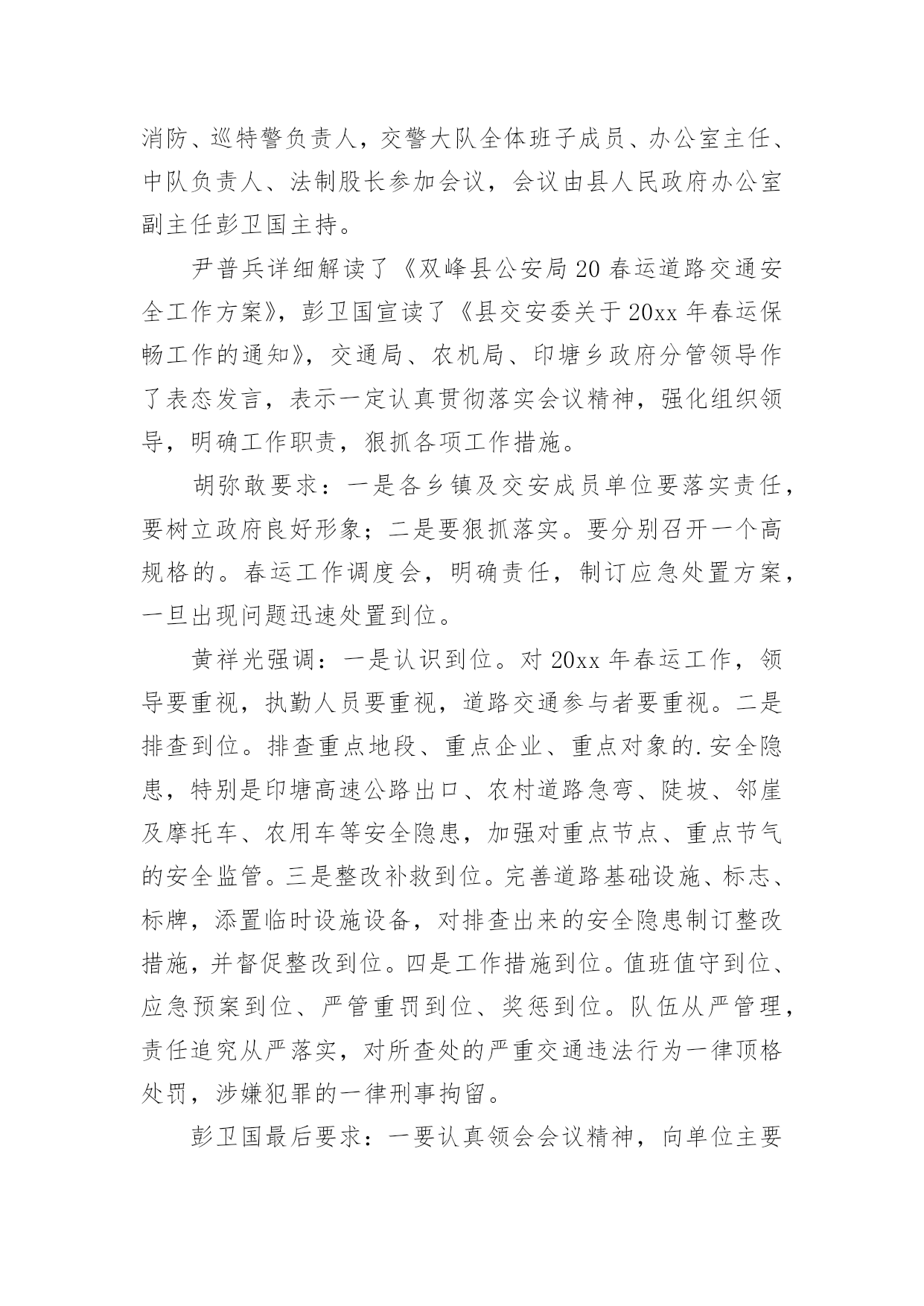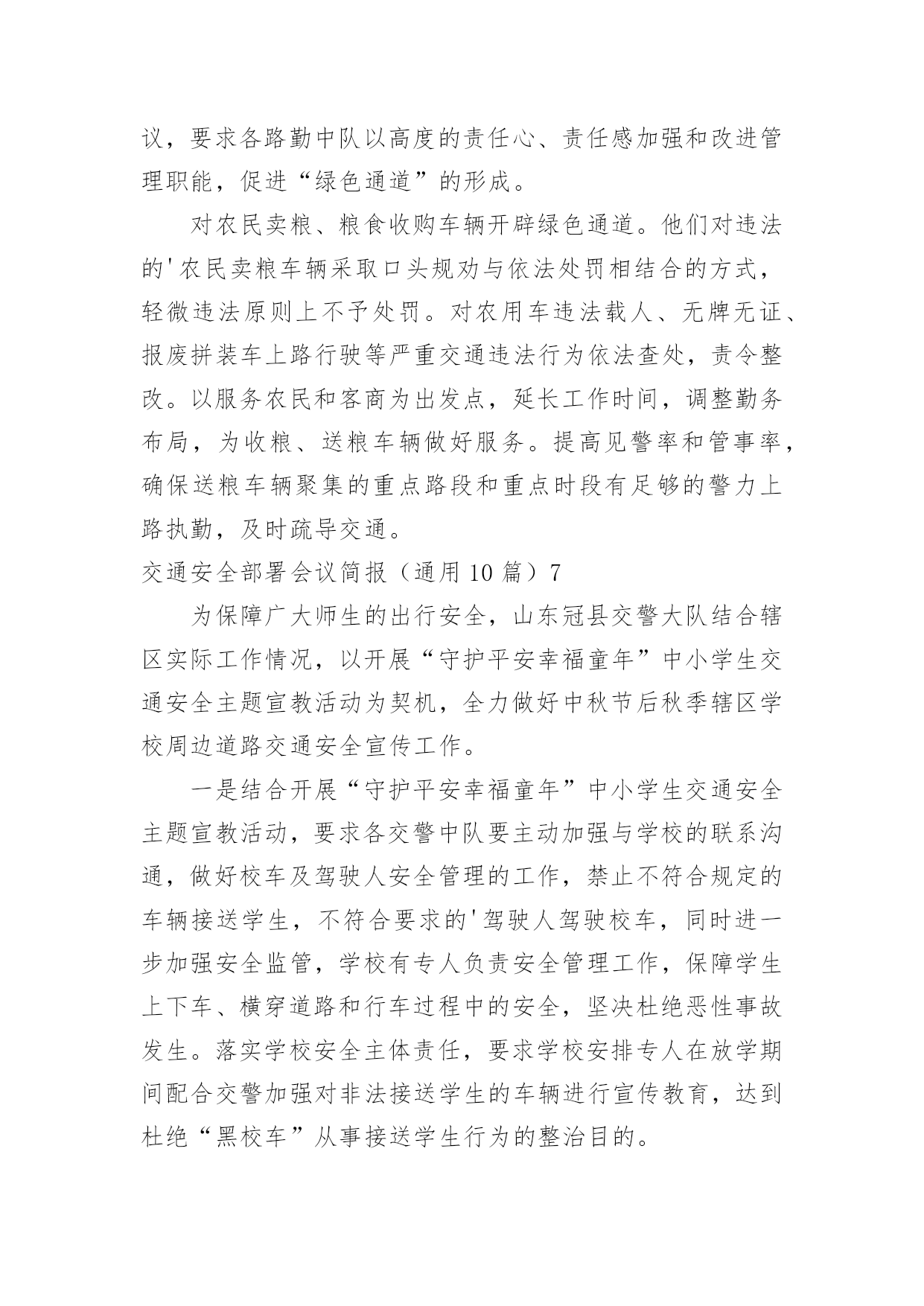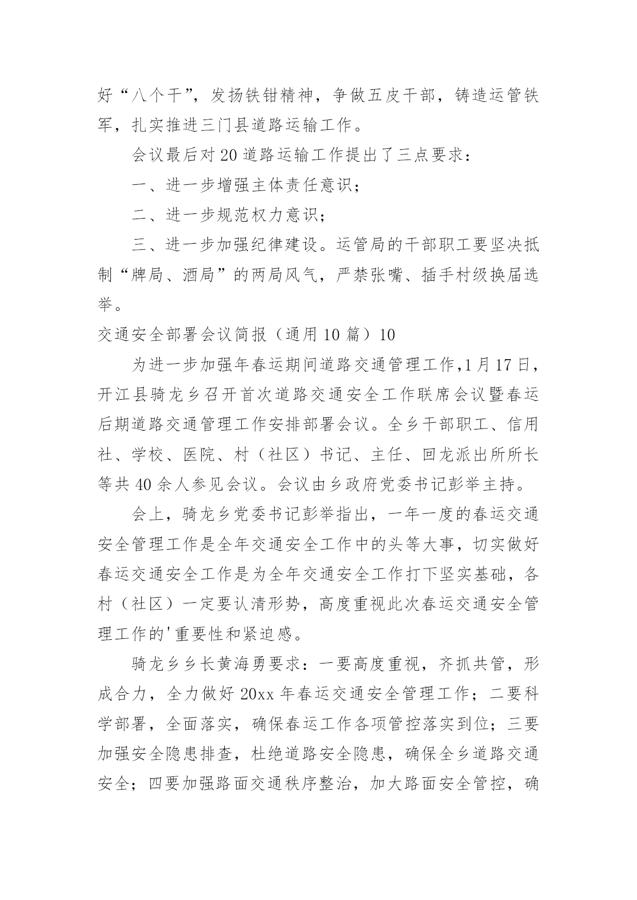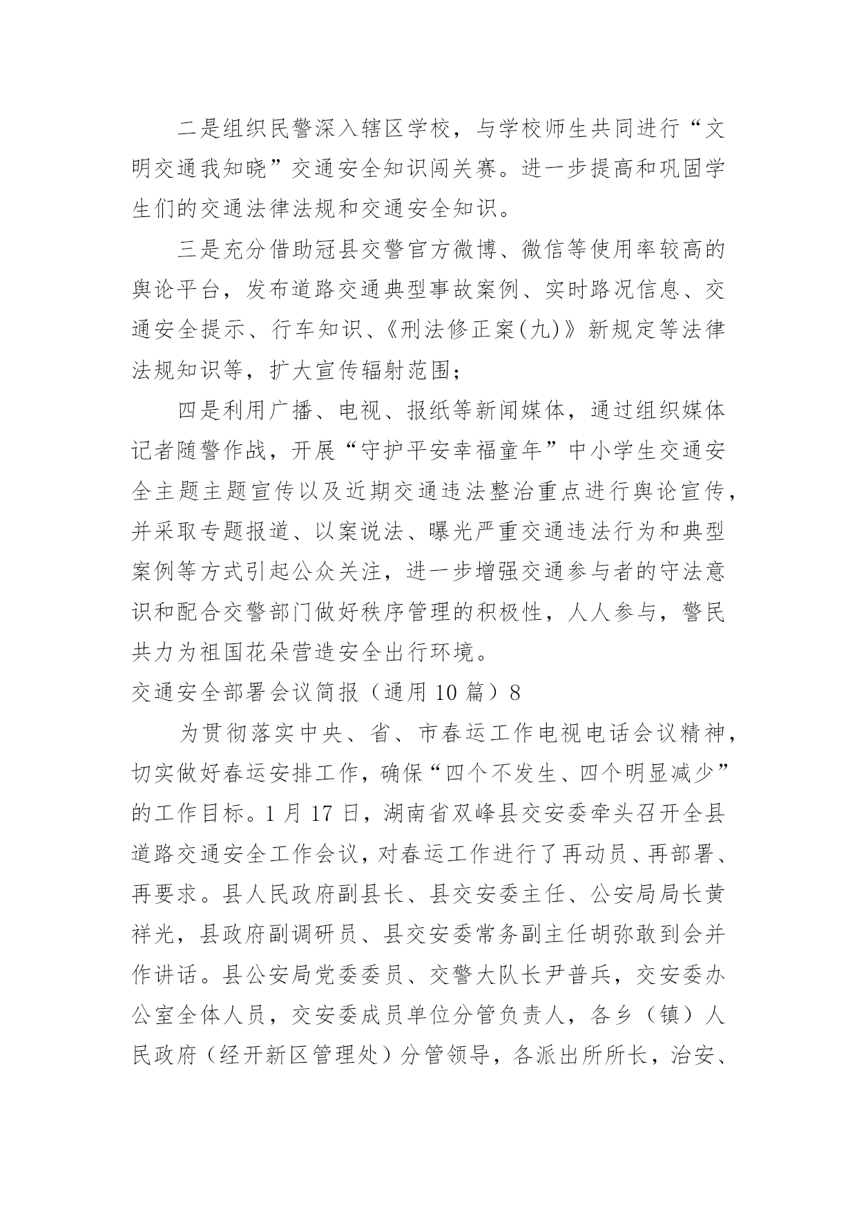 交通安全部署会议简报交通安全部署会议简报(通用10篇)在我们平凡的日常里,简报使用的频率越来越高,简报的写作既不同于文字作品,也不同于评论文章。你所见过的简报是什么样的呢?以下是小编收集整理的交通安全部署会议简报(通用10篇),希望对大家有所帮助。交通安全部署会议简报(通用10篇)14月19号,宣威市召开道路交通安全专题工作会议,总结20xx年一季度全市道路交通安全工作,分析研判当前形势,安排部署下一步工作。宣威市委副书记、市长许韶发主持会议并讲话。宣威市人民政府副市长、市公安局局长周东暄,副市长王斌鸿,市交安委办主要负责人参加会议。许韶发强调:道路交通安全是公共安全的重要组成部分,各部门要进一步提高政治站位,清醒认识道路交通安全工作面临的风险隐患,从执法、管理、服务等各方面综合发力,不断提升道路交通安全管理水平,为党的二十大胜利召开创造安全畅通的`交通环境。许韶发要求:一是要完善好一个方案。以云南省交通运输文化建设“十百千”工程为抓手,制定出《宣威市道路交通安全专项整治方案》,形成专班统筹协调各项工作。二是要开好一个会议。组织召开道路交通安全专项整治工作动员会,结合安全启动仪式,为道路交通安全专项整治工作营造氛围。三是要统筹推动,上下联动,坚持综合施策,持之以恒整治源头安全风险隐患,抓牢路面通行秩序,着力破解农村交通安全难点问题,大力推进道路交通“两类设施”建设,不断提升全市道路交通安全治理能力和治理水平。四是要重点整治,宣传教育,联合执法,确保道路交通安全各项措施落地落实。交通安全部署会议简报(通用10篇)2清明即将到来,为确保辖区道路交通的安全、畅通和有序,预防和减少交通事故、重大拥堵现象发生,博白交警大队未雨绸缪,采取多项措施确保清明期间道路交通安全畅通。一是提前谋划组织动员。清明节前期,祭祀扫墓、外出旅游急剧增多,道路客运量将大幅度增加,预防道路交通事故的任务十分艰巨。3月28日上午,大队召开专题会议部署清明节期间道路交通安保工作,大队领导进行了动员讲话,要求全体民警提高思想认识,靠实工作责任,务必圆满完成清明期间道路交通安保工作;会议还认真分析辖区道路交通流的变化,结合辖区实际制定有针对性的工作方案,切实增强责任感和紧迫感。二是科学合理安排警力。总结去年清明期间辖区道路交通管理好的经验和做法,结合近期道路交通状况,大队将警力向扫墓、进香、春游等活动交通出行量较大的省道及县乡道路倾斜。同时,加强公墓周边道路的交通安全检查,安排好停车场地。三是做好交通宣传。充分利用报纸、广播、电视等新闻媒体,对清明道路交通管理措施及要求进行广泛宣传。组织人员深入辖区,加强对上坟扫墓群众的'交通宣传教育,提醒居民扫墓途中遵守交通法规,不要超载,不使用、不乘坐农用运输车、拖拉机,提高村民的交通安全意识,预防交通事故的发生。交通安全部署会议简报(通用10篇)3国庆节后,泸县公安局交警城区中队紧抓道路交通管理工作不放松,严查城区各类交通违法行为,确保城区交通秩序持续平稳。交警城区中队实行定点执勤与流动巡查相结合,落实多种查控措施:一是在彩虹桥、国道321线城北分校、二级路(针织厂)等重点路口对重点车辆严重交通违法行为查处;二是加强城区花园干道、县政府等交通违法、交通事故多发路段的违法查纠力度;三是结合辖区学校分布情况设置“护学岗”,在学生到校和离校时段维护道路交通秩序,实现校园周边道路畅通,确保学生交通安全。截至目前,交警城区中队在国庆节后共查处各类交通违法行为100余起,切实保障城区道路交通环境的畅通、安全。交通安全部署会议简报(通用10篇)412月5日国际志愿者日来临之际,快速公交公司多名志愿者走上街头,开展志愿者活动。在人流量大的路口、公交站台维护交通秩序,引导乘客上下车,倡导文明出行。当天上午7:00,在电厂路五龙口南路的交叉口处,来自快速公交公司的志愿者头戴小红帽、身披绶带,手中拿着指示牌,参与到交通秩序的维护中。据周围居民介绍,此处路口早高峰时段很容易拥堵,今天有了志愿者维护交通秩序,明显畅通许多。记者看到,志愿者们分散在斑马线、以及非机动车道旁,在他们的`引导下,行人、机动车、非机动车各行其道,秩序井然。据快速公交公司工作人员介绍,五龙口南路电厂路交叉口在早晚高峰时期,车流量较大,极易形成拥堵,快速公交许多线路都会途径此路口,良好的交通秩序不仅能为乘客节省许多出行时间,更能为郑州的城市创建增添一份助力。在一些客流密集,车流量大的站台、路口,以后会定期开展这样的志愿活动,呼吁更多的人参与到良好交通秩序的维护中来。交通安全部署会议简报(通用10篇)512月12日,同仁县交通运输局召开交通运输部门安全工作推进会。会上回顾总结了近期全县交通运输安全生产工作情况,深刻分析了当前安全生产形势,全面部署了今冬明春安全生产工作等,会议由局党