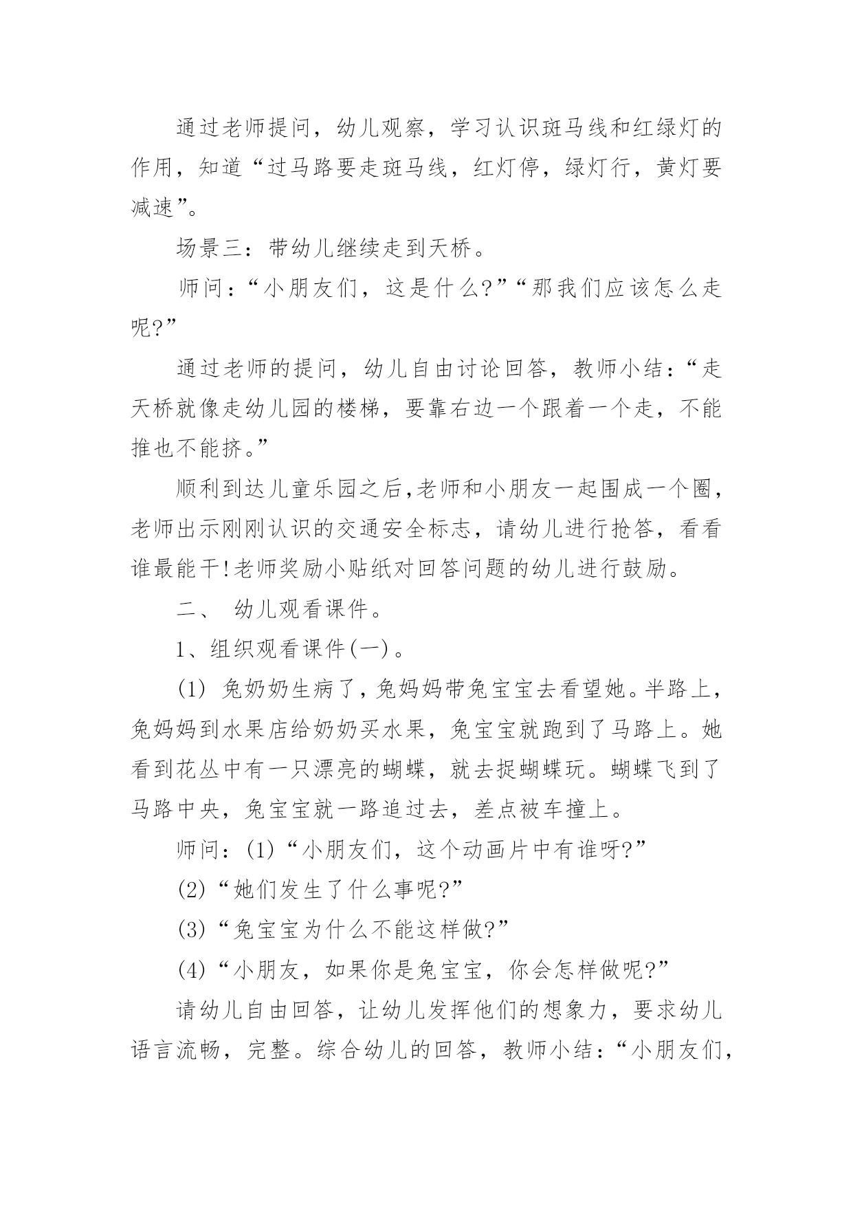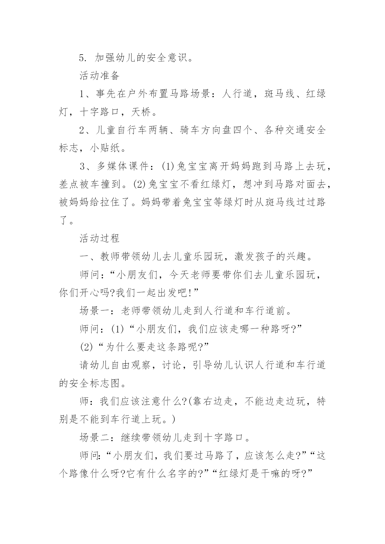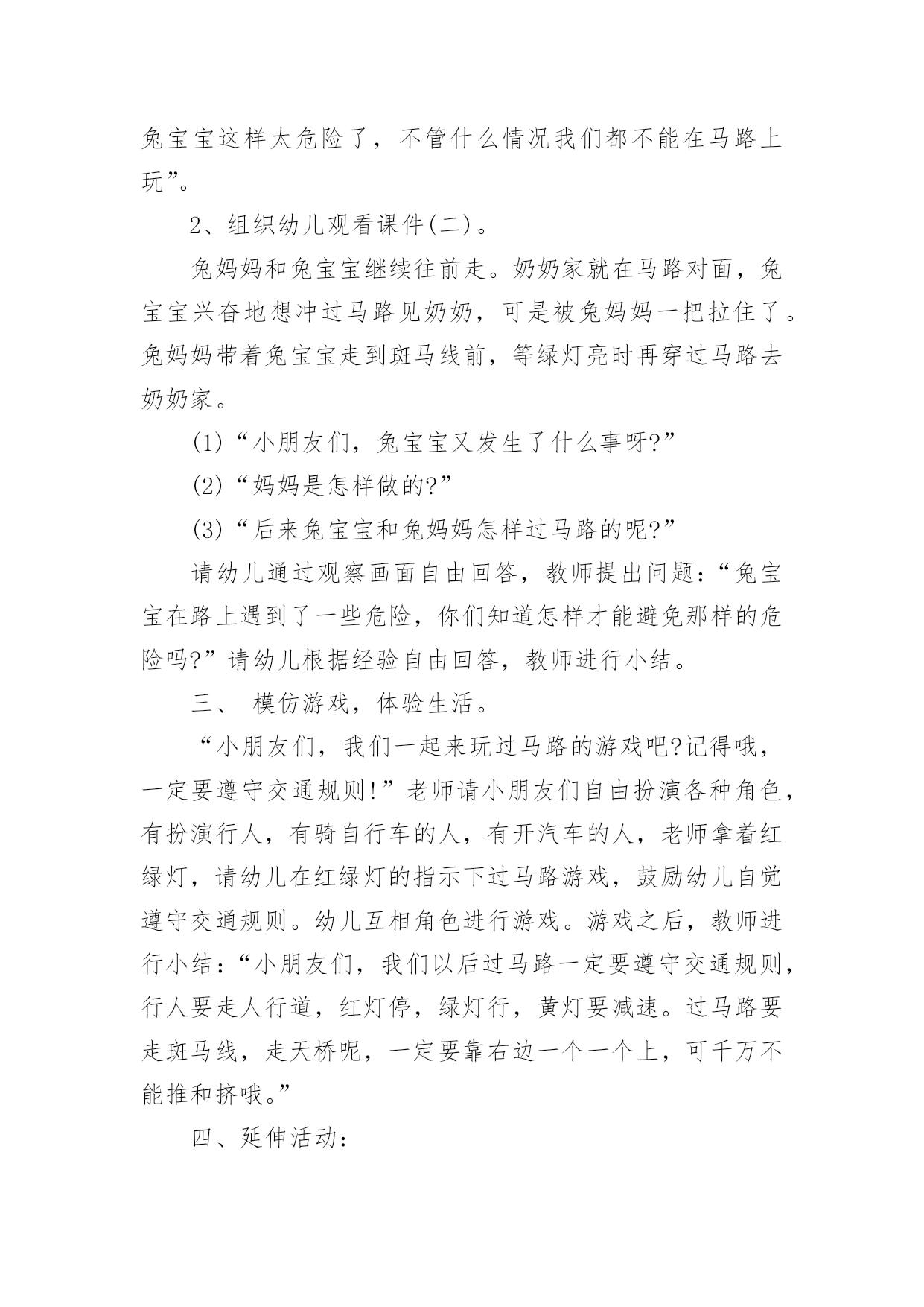 中班安全教案:《注意交通安全》作为一名教师,时常需要编写教案,教案是教学蓝图,可以有效提高教学效率。教案要怎么写呢?以下是小编整理的中班安全教案:《注意交通安全》,欢迎阅读与收藏。中班安全教案:《注意交通安全》1设计意图城市交通的不断发展促使我们加强交通安全教育,让幼儿了解一些危险因素,知道遵守交通规则的重要性,懂得如何保护自己。《新纲要》中指出:“幼儿园必须把保护幼儿的生命和促进幼儿的健康放在工作的首位”。从小让幼儿懂得交通安全知识,养成自觉遵守交通安全的好习惯,对孩子来说可以受益终生。这也符合《新纲要》所提到的“选择的教育内容既贴进幼儿的生活,符合幼儿的.现实需要,又有利于其长远发展,为所有在园幼儿的健康成长服务。”为此我设计了这个中班的安全教育活动。活动目标1.让幼儿初步懂得遵守交通安全的重要性,养成自觉遵守交通规则的好习惯。2.让幼儿认识交通安全标志,培养一定的自我保护意识和能力。3.培养幼儿敏锐的观察能力。4.探索、发现生活中的多样性及特征。5.加强幼儿的安全意识。活动准备1、事先在户外布置马路场景:人行道,斑马线、红绿灯,十字路口,天桥。2、儿童自行车两辆、骑车方向盘四个、各种交通安全标志,小贴纸。3、多媒体课件:(1)兔宝宝离开妈妈跑到马路上去玩,差点被车撞到。(2)兔宝宝不看红绿灯,想冲到马路对面去,被妈妈给拉住了。妈妈带着兔宝宝等绿灯时从斑马线过过路了。活动过程一、教师带领幼儿去儿童乐园玩,激发孩子的兴趣。师问:“小朋友们,今天老师要带你们去儿童乐园玩,你们开心吗?我们一起出发吧!”场景一:老师带领幼儿走到人行道和车行道前。师问:(1)“小朋友们,我们应该走哪一种路呀?”(2)“为什么要走这条路呢?”请幼儿自由观察,讨论,引导幼儿认识人行道和车行道的安全标志图。师:我们应该注意什么?(靠右边走,不能边走边玩,特别是不能到车行道上玩。)场景二:继续带领幼儿走到十字路口。师问:“小朋友们,我们要过马路了,应该怎么走?”“这个路像什么呀?它有什么名字的?”“红绿灯是干嘛的呀?”通过老师提问,幼儿观察,学习认识斑马线和红绿灯的作用,知道“过马路要走斑马线,红灯停,绿灯行,黄灯要减速”。场景三:带幼儿继续走到天桥。师问:“小朋友们,这是什么?”“那我们应该怎么走呢?”通过老师的提问,幼儿自由讨论回答,教师小结:“走天桥就像走幼儿园的楼梯,要靠右边一个跟着一个走,不能推也不能挤。”顺利到达儿童乐园之后,老师和小朋友一起围成一个圈,老师出示刚刚认识的交通安全标志,请幼儿进行抢答,看看谁最能干!老师奖励小贴纸对回答问题的幼儿进行鼓励。二、幼儿观看课件。1、组织观看课件(一)。(1)兔奶奶生病了,兔妈妈带兔宝宝去看望她。半路上,兔妈妈到水果店给奶奶买水果,兔宝宝就跑到了马路上。她看到花丛中有一只漂亮的蝴蝶,就去捉蝴蝶玩。蝴蝶飞到了马路中央,兔宝宝就一路追过去,差点被车撞上。师问:(1)“小朋友们,这个动画片中有谁呀?”(2)“她们发生了什么事呢?”(3)“兔宝宝为什么不能这样做?”(4)“小朋友,如果你是兔宝宝,你会怎样做呢?”请幼儿自由回答,让幼儿发挥他们的想象力,要求幼儿语言流畅,完整。综合幼儿的回答,教师小结:“小朋友们,兔宝宝这样太危险了,不管什么情况我们都不能在马路上玩”。2、组织幼儿观看课件(二)。兔妈妈和兔宝宝继续往前走。奶奶家就在马路对面,兔宝宝兴奋地想冲过马路见奶奶,可是被兔妈妈一把拉住了。兔妈妈带着兔宝宝走到斑马线前,等绿灯亮时再穿过马路去奶奶家。(1)“小朋友们,兔宝宝又发生了什么事呀?”(2)“妈妈是怎样做的?”(3)“后来兔宝宝和兔妈妈怎样过马路的呢?”请幼儿通过观察画面自由回答,教师提出问题:“兔宝宝在路上遇到了一些危险,你们知道怎样才能避免那样的危险吗?”请幼儿根据经验自由回答,教师进行小结。三、模仿游戏,体验生活。“小朋友们,我们一起来玩过马路的游戏吧?记得哦,一定要遵守交通规则!”老师请小朋友们自由扮演各种角色,有扮演行人,有骑自行车的人,有开汽车的人,老师拿着红绿灯,请幼儿在红绿灯的指示下过马路游戏,鼓励幼儿自觉遵守交通规则。幼儿互相角色进行游戏。游戏之后,教师进行小结:“小朋友们,我们以后过马路一定要遵守交通规则,行人要走人行道,红灯停,绿灯行,黄灯要减速。过马路要走斑马线,走天桥呢,一定要靠右边一个一个上,可千万不能推和挤哦。”四、延伸活动:(1)教师课后将交通场景放在区域中,让幼儿自由游戏,(2)请家长利用适当时机对幼儿进行遵守交通规则的教育,并处处以身作则影响孩子。课后反思:本次活动通过丰富的教学方法激发了孩子的学习兴趣,让孩子在游戏中提高了交通安全意识,知道遵守交通规则的重要性。让孩子在玩中学。这次活动对孩子来说教育意义很大,也体现了活动的重要性。本次活动课堂气氛非常活跃,体现