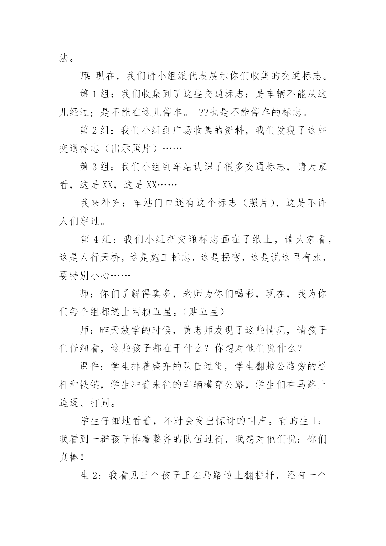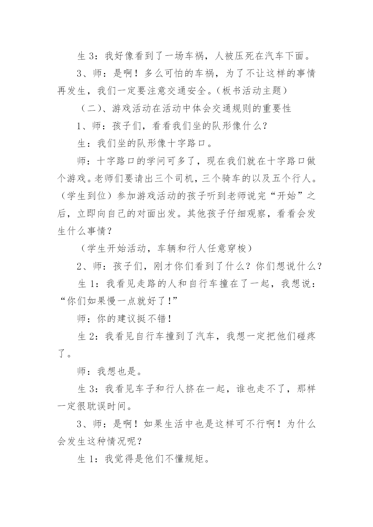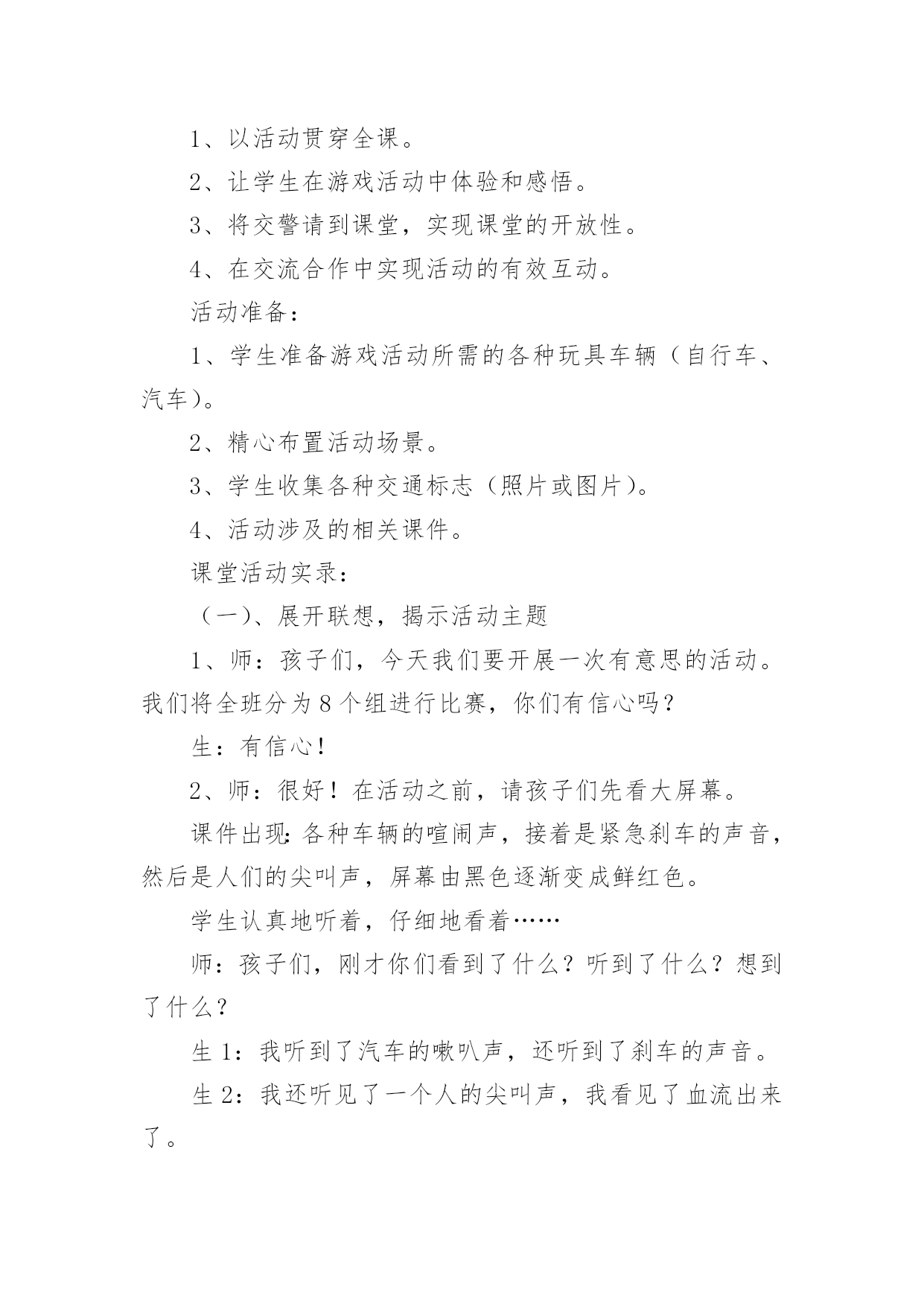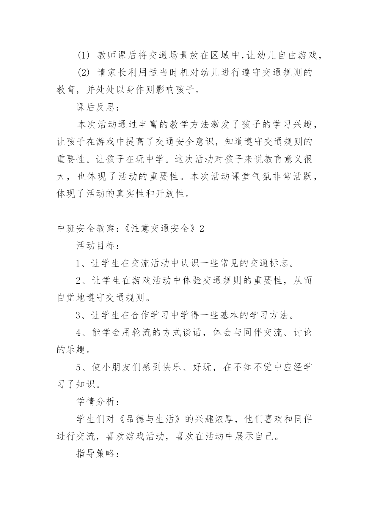 中班安全教案:《注意交通安全》作为一名教师,时常需要编写教案,教案是教学蓝图,可以有效提高教学效率。教案要怎么写呢?以下是小编整理的中班安全教案:《注意交通安全》,欢迎阅读与收藏。中班安全教案:《注意交通安全》1设计意图城市交通的不断发展促使我们加强交通安全教育,让幼儿了解一些危险因素,知道遵守交通规则的重要性,懂得如何保护自己。《新纲要》中指出:“幼儿园必须把保护幼儿的生命和促进幼儿的健康放在工作的首位”。从小让幼儿懂得交通安全知识,养成自觉遵守交通安全的好习惯,对孩子来说可以受益终生。这也符合《新纲要》所提到的“选择的教育内容既贴进幼儿的生活,符合幼儿的.现实需要,又有利于其长远发展,为所有在园幼儿的健康成长服务。”为此我设计了这个中班的安全教育活动。活动目标1.让幼儿初步懂得遵守交通安全的重要性,养成自觉遵守交通规则的好习惯。2.让幼儿认识交通安全标志,培养一定的自我保护意识和能力。3.培养幼儿敏锐的观察能力。4.探索、发现生活中的多样性及特征。5.加强幼儿的安全意识。活动准备1、事先在户外布置马路场景:人行道,斑马线、红绿灯,十字路口,天桥。2、儿童自行车两辆、骑车方向盘四个、各种交通安全标志,小贴纸。3、多媒体课件:(1)兔宝宝离开妈妈跑到马路上去玩,差点被车撞到。(2)兔宝宝不看红绿灯,想冲到马路对面去,被妈妈给拉住了。妈妈带着兔宝宝等绿灯时从斑马线过过路了。活动过程一、教师带领幼儿去儿童乐园玩,激发孩子的兴趣。师问:“小朋友们,今天老师要带你们去儿童乐园玩,你们开心吗?我们一起出发吧!”场景一:老师带领幼儿走到人行道和车行道前。师问:(1)“小朋友们,我们应该走哪一种路呀?”(2)“为什么要走这条路呢?”请幼儿自由观察,讨论,引导幼儿认识人行道和车行道的安全标志图。师:我们应该注意什么?(靠右边走,不能边走边玩,特别是不能到车行道上玩。)场景二:继续带领幼儿走到十字路口。师问:“小朋友们,我们要过马路了,应该怎么走?”“这个路像什么呀?它有什么名字的?”“红绿灯是干嘛的呀?”通过老师提问,幼儿观察,学习认识斑马线和红绿灯的作用,知道“过马路要走斑马线,红灯停,绿灯行,黄灯要减速”。场景三:带幼儿继续走到天桥。师问:“小朋友们,这是什么?”“那我们应该怎么走呢?”通过老师的提问,幼儿自由讨论回答,教师小结:“走天桥就像走幼儿园的楼梯,要靠右边一个跟着一个走,不能推也不能挤。”顺利到达儿童乐园之后,老师和小朋友一起围成一个圈,老师出示刚刚认识的交通安全标志,请幼儿进行抢答,看看谁最能干!老师奖励小贴纸对回答问题的幼儿进行鼓励。二、幼儿观看课件。1、组织观看课件(一)。(1)兔奶奶生病了,兔妈妈带兔宝宝去看望她。半路上,兔妈妈到水果店给奶奶买水果,兔宝宝就跑到了马路上。她看到花丛中有一只漂亮的蝴蝶,就去捉蝴蝶玩。蝴蝶飞到了马路中央,兔宝宝就一路追过去,差点被车撞上。师问:(1)“小朋友们,这个动画片中有谁呀?”(2)“她们发生了什么事呢?”(3)“兔宝宝为什么不能这样做?”(4)“小朋友,如果你是兔宝宝,你会怎样做呢?”请幼儿自由回答,让幼儿发挥他们的想象力,要求幼儿语言流畅,完整。综合幼儿的回答,教师小结:“小朋友们,兔宝宝这样太危险了,不管什么情况我们都不能在马路上玩”。2、组织幼儿观看课件(二)。兔妈妈和兔宝宝继续往前走。奶奶家就在马路对面,兔宝宝兴奋地想冲过马路见奶奶,可是被兔妈妈一把拉住了。兔妈妈带着兔宝宝走到斑马线前,等绿灯亮时再穿过马路去奶奶家。(1)“小朋友们,兔宝宝又发生了什么事呀?”(2)“妈妈是怎样做的?”(3)“后来兔宝宝和兔妈妈怎样过马路的呢?”请幼儿通过观察画面自由回答,教师提出问题:“兔宝宝在路上遇到了一些危险,你们知道怎样才能避免那样的危险吗?”请幼儿根据经验自由回答,教师进行小结。三、模仿游戏,体验生活。“小朋友们,我们一起来玩过马路的游戏吧?记得哦,一定要遵守交通规则!”老师请小朋友们自由扮演各种角色,有扮演行人,有骑自行车的人,有开汽车的人,老师拿着红绿灯,请幼儿在红绿灯的指示下过马路游戏,鼓励幼儿自觉遵守交通规则。幼儿互相角色进行游戏。游戏之后,教师进行小结:“小朋友们,我们以后过马路一定要遵守交通规则,行人要走人行道,红灯停,绿灯行,黄灯要减速。过马路要走斑马线,走天桥呢,一定要靠右边一个一个上,可千万不能推和挤哦。”四、延伸活动:(1)教师课后将交通场景放在区域中,让幼儿自由游戏,(2)请家长利用适当时机对幼儿进行遵守交通规则的教育,并处处以身作则影响孩子。课后反思:本次活动通过丰富的教学方法激发了孩子的学习兴趣,让孩子在游戏中提高了交通安全意识,知道遵守交通规则的重要性。让孩子在玩中学。这次活动对孩子来说教育意义很大,也体现了活动的重要性。本次活动课堂气氛非常活跃,体现