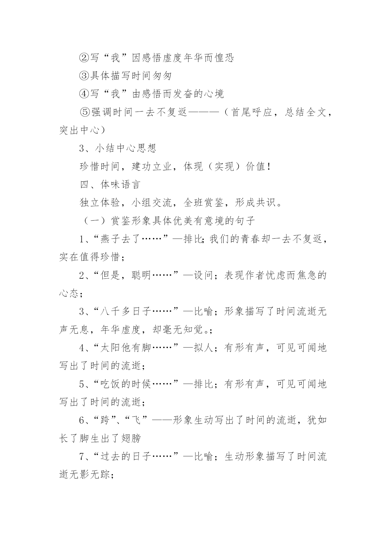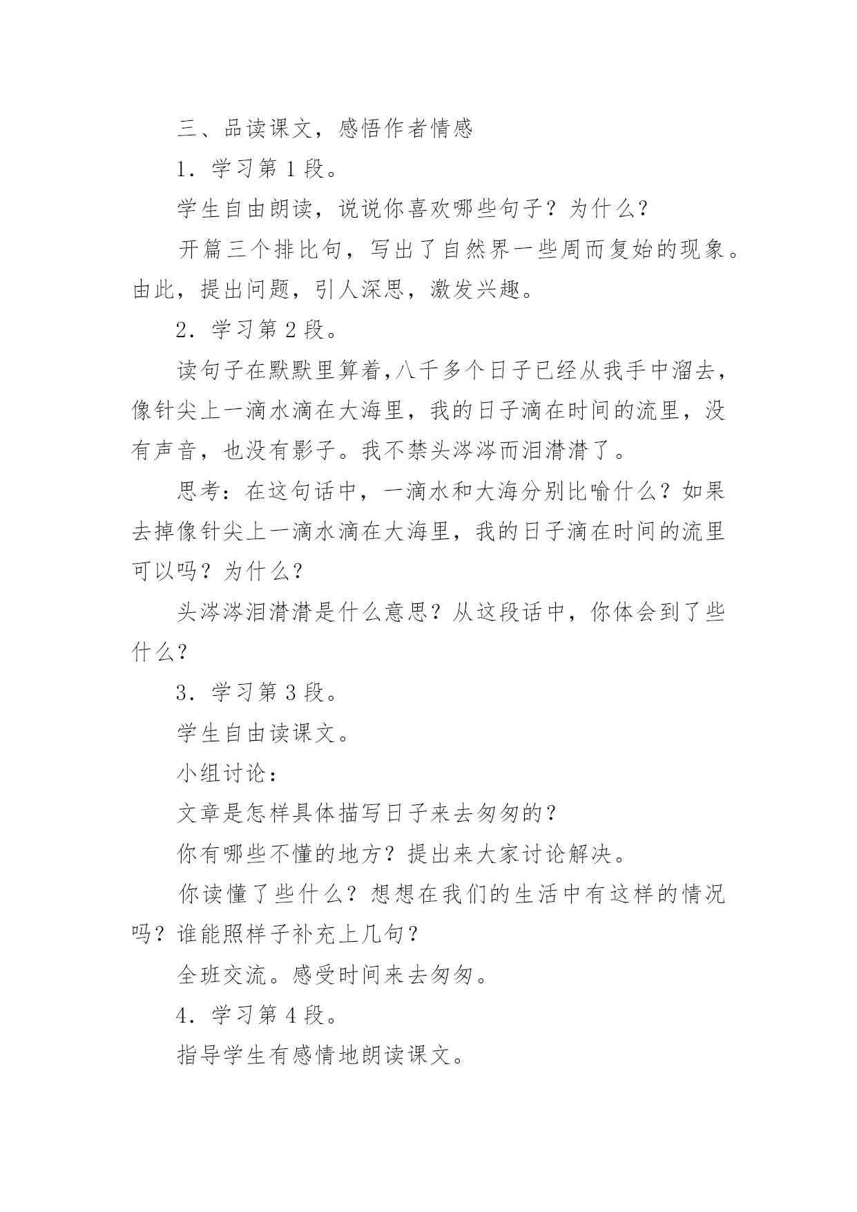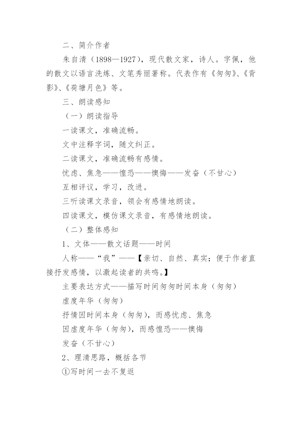 《匆匆》教学设计《匆匆》人教版教学设计在教学工作者开展教学活动前,常常需要准备教学设计,借助教学设计可使学生在单位时间内能够学到更多的知识。优秀的教学设计都具备一些什么特点呢?以下是小编整理的《匆匆》人教版教学设计,希望能够帮助到大家。《匆匆》教学设计1教学目标1、掌握生字难词。2、整体感知文章主要内容。3、准确流畅有感情地朗读。4、体会散文常见写法及语言特点。5、学会“描摹形象阅读法”。6、感受时间的宝贵。教学重难点有感情地朗读,分析文章主要内容及写法。教学课时2课时教学过程一、导入课题以《青春之歌》“太阳下山明朝还会爬上来,花儿谢了还会再开,我的青春小鸟飞走不回来……”引出学习的主要内容——我们的青春会一去不复返,实在值得珍惜。二、简介作者朱自清(1898—1927),现代散文家,诗人。字佩,他的散文以语言洗炼、文笔秀丽著称。代表作有《匆匆》、《背影》、《荷塘月色》等。三、朗读感知(一)朗读指导一读课文,准确流畅。文中注释字词,随文纠正。二读课文,准确流畅有感情。忧虑、焦急——惶恐——懊悔——发奋(不甘心)互相评议,学习,改进。三听读课文录音,领会有感情地朗读。四读课文,模仿课文录音,有感情地朗读。(二)整体感知1、文体——散文话题——时间人称——“我”——【亲切、自然、真实;便于作者直接抒发感情,以激起读者的共鸣。】主要表达方式——描写时间匆匆时间本身(匆匆)虚度年华(匆匆)抒情因时间本身(匆匆),而感忧虑、焦急因虚度年华(匆匆),而感惶恐——懊悔发奋(不甘心)2、理清思路,概括各节①写时间一去不复返②写“我”因感悟虚度年华而惶恐③具体描写时间匆匆④写“我”由感悟而发奋的心境⑤强调时间一去不复返———(首尾呼应,总结全文,突出中心)3、小结中心思想珍惜时间,建功立业,体现(实现)价值!四、体味语言独立体验,小组交流,全班赏鉴,形成共识。(一)赏鉴形象具体优美有意境的句子1、“燕子去了……”—排比;我们的青春却一去不复返,实在值得珍惜;2、“但是,聪明……”—设问;表现作者忧虑而焦急的心态;3、“八千多日子……”—比喻;形象描写了时间流逝无声无息,年华虚度,却毫无知觉。;4、“太阳他有脚……”—拟人;有形有声,可见可闻地写出了时间的流逝;5、“吃饭的时候……”—排比;有形有声,可见可闻地写出了时间的流逝;6、“跨”、“飞”——形象生动写出了时间的流逝,犹如长了脚生出了翅膀7、“过去的日子……”—比喻;生动形象描写了时间流逝无影无踪;8、“我何曾留着像游丝样的痕迹呢?————为什么偏要白白走这一遭?”反问;催人猛醒,发人深思,加强感情的抒发;抒发了作者奋发有为,追求事业的情怀。(二)赏鉴有含义的词语1、他们——指代时间;2、去的——过去的时间;来的——将来的时间;去来的中间——现在;3、赤裸裸———前者指人来到世上“一无所有”;后者指人离开世上“没有在世界上留下什么东西”即虚度年华,没有作为。五、反复诵读积累文中优美语句,并熟读成诵六、小结本文1、语言富于文采。(运用多种修辞;词语准确凝练;善用叠音词)2、情真意切,真实感人。七、“描摹形象阅读法”运用词语对所描写的对象进行概括的描摹充分理解文章内容。八、布置作业1、熟读课文2、阅读练习(另见)3、以《“今”》《匆匆》为例,思考分析议论文和抒情散文在写法上有什么不同?课题文体表达方式主要内容目的《“今”》议论文议论鲜明阐述观点以理服人《匆匆》散文描写抒情形象描写强烈抒情点明题旨,突出中心以情动人《匆匆》教学设计2教学目标1.学会本课生字新词。2.读懂含义深刻的句子,感悟作者表达的思想感情,懂得珍惜时间的道理。3.有感情地朗读课文,背诵课文第三段。教学准备1.课前查找有关朱自清生平事迹的介绍。2.搜集有关珍惜时间的名人名言、故事。教学过程一、释题导入,质疑导学1.出示课题,释题。匆匆是什么意思?2.根据课题,你能提出哪些问题?如课文中讲的是什么匆匆?是怎样的匆匆?等等。3.把课题匆匆扩展成一个完整的句子。二、初读课文,理清文章脉络1.自由读课文,想想每一段分别讲了什么内容。2.小组讨论交流,概括出每一段的主要内容。3.全班交流,理清文章结构。三、品读课文,感悟作者情感1.学习第1段。学生自由朗读,说说你喜欢哪些句子?为什么?开篇三个排比句,写出了自然界一些周而复始的现象。由此,提出问题,引人深思,激发兴趣。2.学习第2段。读句子在默默里算着,八千多个日子已经从我手中溜去,像针尖上一滴水滴在大海里,我的日子滴在时间的流里,没有声音,也没有影子。我不禁头涔涔而泪潸潸了。思考:在这句话中,一滴水和大海分别比喻什么?如果去掉像针尖上一滴水滴在大海里,我的日子滴在时间的流里可以吗?为什么?头涔涔泪潸潸是什么意思?从这段话中,你体会到了些什么?3.学习第3段。学生自由读课文。小组讨论: