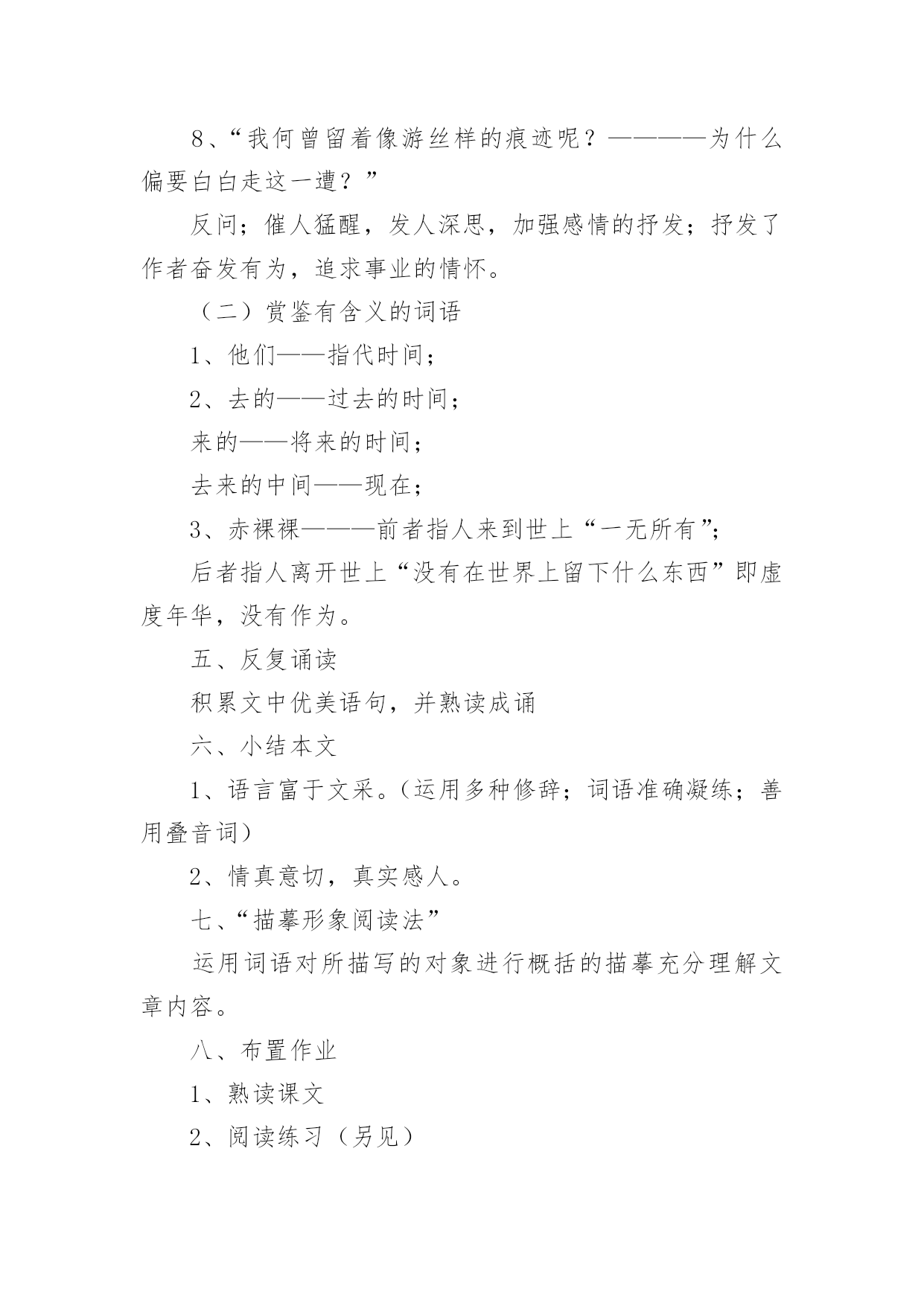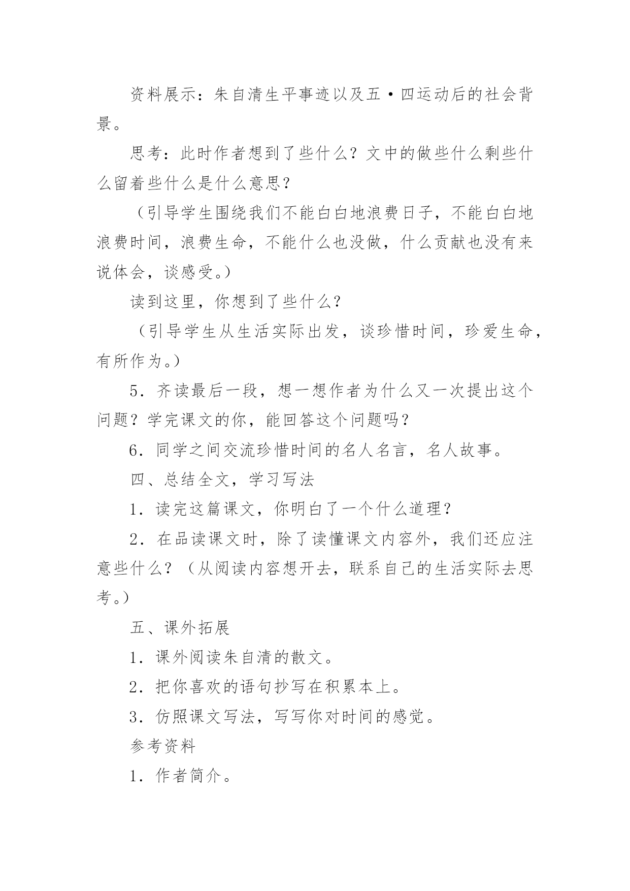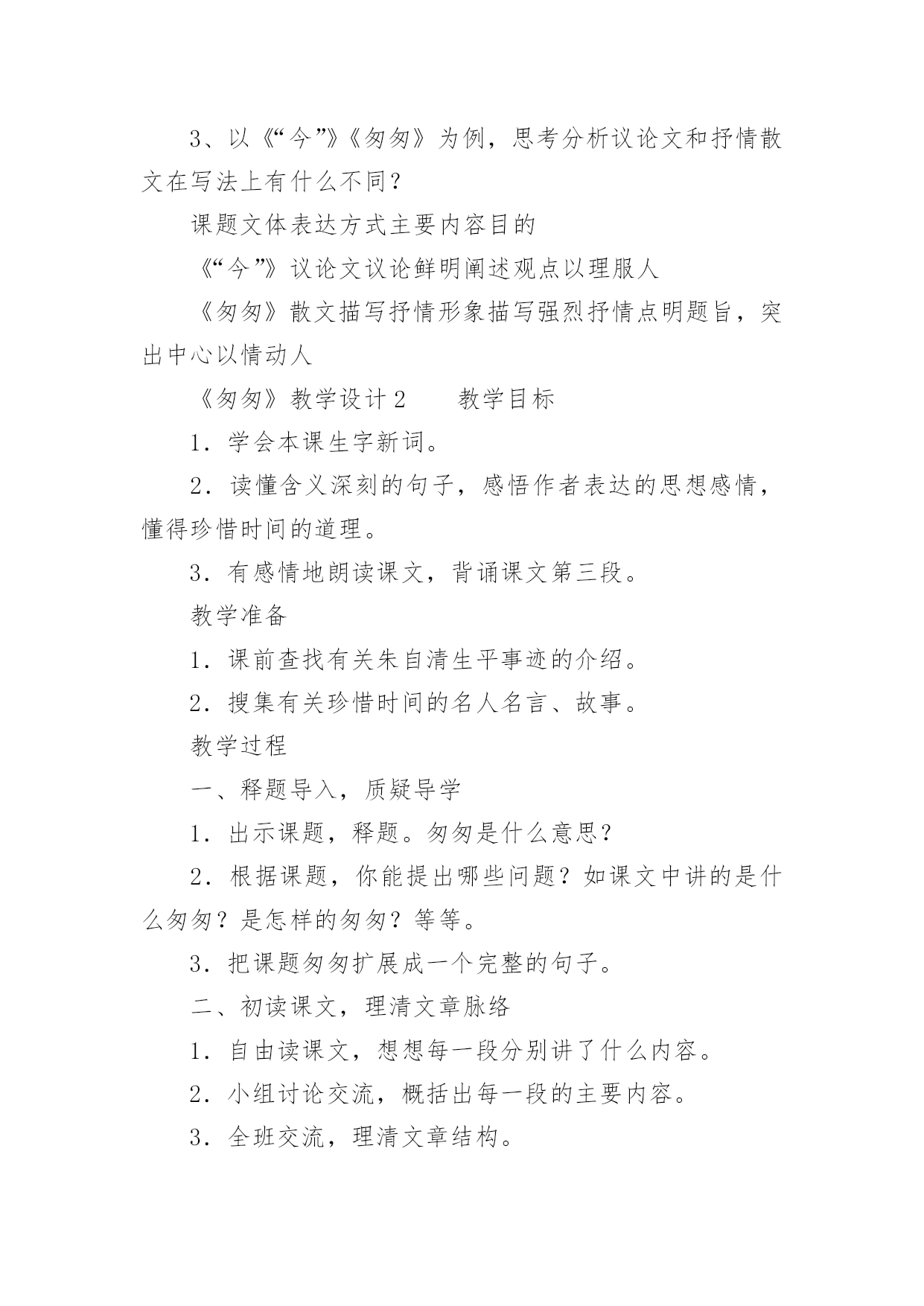 《匆匆》教学设计《匆匆》人教版教学设计在教学工作者开展教学活动前,常常需要准备教学设计,借助教学设计可使学生在单位时间内能够学到更多的知识。优秀的教学设计都具备一些什么特点呢?以下是小编整理的《匆匆》人教版教学设计,希望能够帮助到大家。《匆匆》教学设计1教学目标1、掌握生字难词。2、整体感知文章主要内容。3、准确流畅有感情地朗读。4、体会散文常见写法及语言特点。5、学会“描摹形象阅读法”。6、感受时间的宝贵。教学重难点有感情地朗读,分析文章主要内容及写法。教学课时2课时教学过程一、导入课题以《青春之歌》“太阳下山明朝还会爬上来,花儿谢了还会再开,我的青春小鸟飞走不回来……”引出学习的主要内容——我们的青春会一去不复返,实在值得珍惜。二、简介作者朱自清(1898—1927),现代散文家,诗人。字佩,他的散文以语言洗炼、文笔秀丽著称。代表作有《匆匆》、《背影》、《荷塘月色》等。三、朗读感知(一)朗读指导一读课文,准确流畅。文中注释字词,随文纠正。二读课文,准确流畅有感情。忧虑、焦急——惶恐——懊悔——发奋(不甘心)互相评议,学习,改进。三听读课文录音,领会有感情地朗读。四读课文,模仿课文录音,有感情地朗读。(二)整体感知1、文体——散文话题——时间人称——“我”——【亲切、自然、真实;便于作者直接抒发感情,以激起读者的共鸣。】主要表达方式——描写时间匆匆时间本身(匆匆)虚度年华(匆匆)抒情因时间本身(匆匆),而感忧虑、焦急因虚度年华(匆匆),而感惶恐——懊悔发奋(不甘心)2、理清思路,概括各节①写时间一去不复返②写“我”因感悟虚度年华而惶恐③具体描写时间匆匆④写“我”由感悟而发奋的心境⑤强调时间一去不复返———(首尾呼应,总结全文,突出中心)3、小结中心思想珍惜时间,建功立业,体现(实现)价值!四、体味语言独立体验,小组交流,全班赏鉴,形成共识。(一)赏鉴形象具体优美有意境的句子1、“燕子去了……”—排比;我们的青春却一去不复返,实在值得珍惜;2、“但是,聪明……”—设问;表现作者忧虑而焦急的心态;3、“八千多日子……”—比喻;形象描写了时间流逝无声无息,年华虚度,却毫无知觉。;4、“太阳他有脚……”—拟人;有形有声,可见可闻地写出了时间的流逝;5、“吃饭的时候……”—排比;有形有声,可见可闻地写出了时间的流逝;6、“跨”、“飞”——形象生动写出了时间的流逝,犹如长了脚生出了翅膀7、“过去的日子……”—比喻;生动形象描写了时间流逝无影无踪;8、“我何曾留着像游丝样的痕迹呢?————为什么偏要白白走这一遭?”反问;催人猛醒,发人深思,加强感情的抒发;抒发了作者奋发有为,追求事业的情怀。(二)赏鉴有含义的词语1、他们——指代时间;2、去的——过去的时间;来的——将来的时间;去来的中间——现在;3、赤裸裸———前者指人来到世上“一无所有”;后者指人离开世上“没有在世界上留下什么东西”即虚度年华,没有作为。五、反复诵读积累文中优美语句,并熟读成诵六、小结本文1、语言富于文采。(运用多种修辞;词语准确凝练;善用叠音词)2、情真意切,真实感人。七、“描摹形象阅读法”运用词语对所描写的对象进行概括的描摹充分理解文章内容。八、布置作业1、熟读课文2、阅读练习(另见)3、以《“今”》《匆匆》为例,思考分析议论文和抒情散文在写法上有什么不同?课题文体表达方式主要内容目的《“今”》议论文议论鲜明阐述观点以理服人《匆匆》散文描写抒情形象描写强烈抒情点明题旨,突出中心以情动人《匆匆》教学设计2教学目标1.学会本课生字新词。2.读懂含义深刻的句子,感悟作者表达的思想感情,懂得珍惜时间的道理。3.有感情地朗读课文,背诵课文第三段。教学准备1.课前查找有关朱自清生平事迹的介绍。2.搜集有关珍惜时间的名人名言、故事。教学过程一、释题导入,质疑导学1.出示课题,释题。匆匆是什么意思?2.根据课题,你能提出哪些问题?如课文中讲的是什么匆匆?是怎样的匆匆?等等。3.把课题匆匆扩展成一个完整的句子。二、初读课文,理清文章脉络1.自由读课文,想想每一段分别讲了什么内容。2.小组讨论交流,概括出每一段的主要内容。3.全班交流,理清文章结构。三、品读课文,感悟作者情感1.学习第1段。学生自由朗读,说说你喜欢哪些句子?为什么?开篇三个排比句,写出了自然界一些周而复始的现象。由此,提出问题,引人深思,激发兴趣。2.学习第2段。读句子在默默里算着,八千多个日子已经从我手中溜去,像针尖上一滴水滴在大海里,我的日子滴在时间的流里,没有声音,也没有影子。我不禁头涔涔而泪潸潸了。思考:在这句话中,一滴水和大海分别比喻什么?如果去掉像针尖上一滴水滴在大海里,我的日子滴在时间的流里可以吗?为什么?头涔涔泪潸潸是什么意思?从这段话中,你体会到了些什么?3.学习第3段。学生自由读课文。小组讨论: