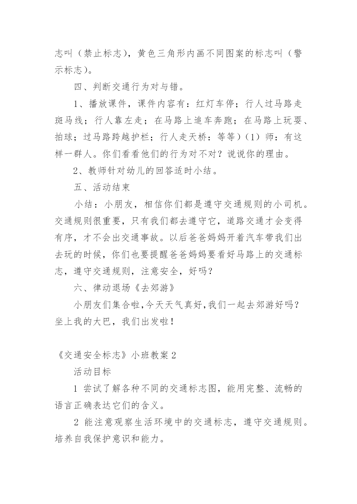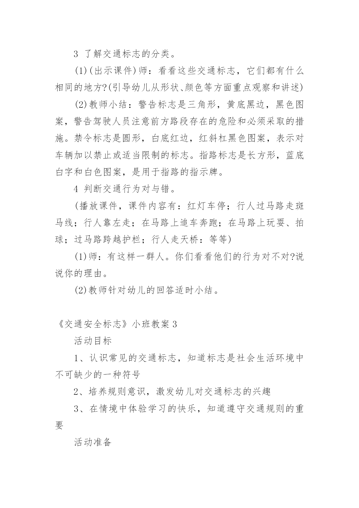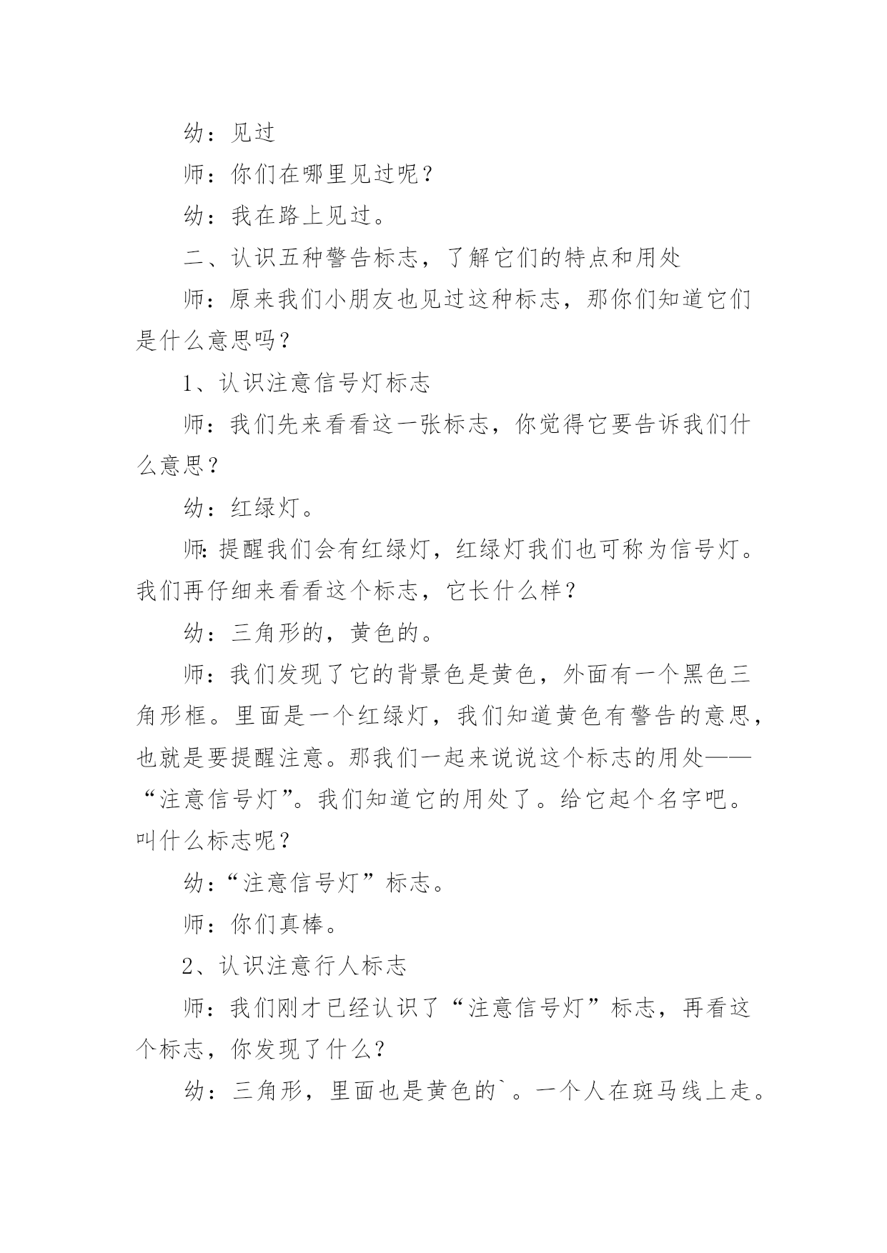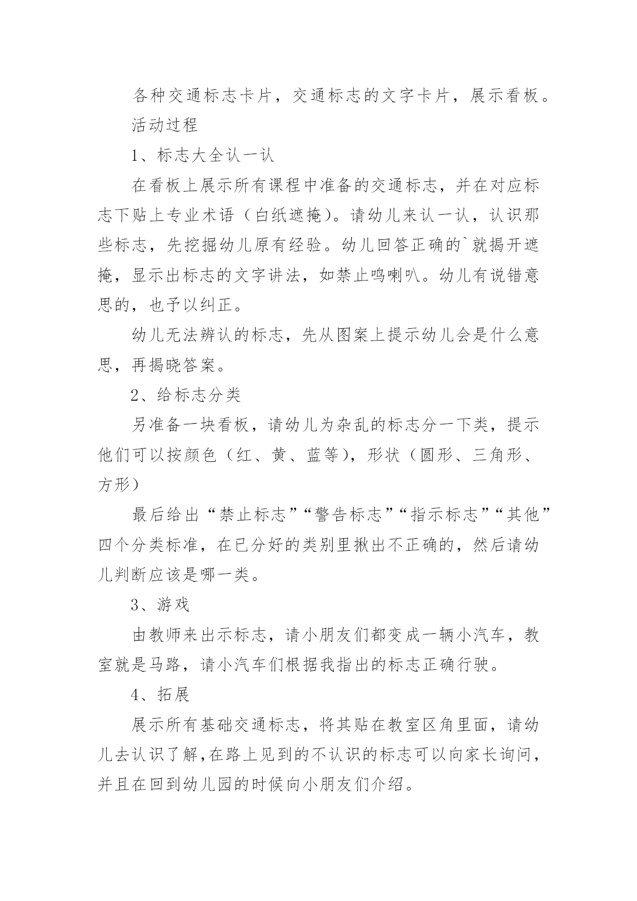 《交通安全标志》小班教案作为一位无私奉献的人民教师,通常需要用到教案来辅助教学,教案是教学蓝图,可以有效提高教学效率。那么优秀的教案是什么样的呢?以下是小编精心整理的《交通安全标志》小班教案,欢迎大家借鉴与参考,希望对大家有所帮助。《交通安全标志》小班教案1活动目标:1、尝试了解一些简单的交通标志,能用完整的语言正确表达它们的含义。2、尝试按标志的不同特征进行分类。3、乐意参与游戏,激发对交通标志的兴趣,培养遵守交通安全的意识。活动准备:1、收集各种交通标志(或图片)2、制作PPT3、交通事故的动画视频4、小标志若干活动过程:一、视频引入1、视频导入,引发探究欲望2、播放交通事故的动画视频。师:刚才你们看到了什么?发生了一件什么事情?(引导幼儿用完整的语言讲述)3、师:为什么会发生这样的事情呢?二、播放课件,解读交通标志,我们应该遵守交通规则,让我们从认识交通标志开始学习交通规则。1、认识红绿灯(播放红绿灯图片)。师:马路上最重要的标志就是信号灯,你们在哪些地方看见过红绿灯?红灯表示什么?绿灯表示什么?2、认识其他交通标志(播放交通标志课件)。三、了解交通标志的分类。1、(出示课件)师:看看这些交通标志,它们都有什么相同的地方?(引导幼儿从形状、颜色等方面重点观察和讲述)归纳:2、指示标志:在蓝底色上画着不同的白色图案,是指示车辆和行人通行的,它们有一个共同的名字叫:指示标志,就告诉人们可以做的事情。3、禁止标志:在红色圆圈里画着不同画面或符号,有一条明显的红斜线,是禁止车辆和行人通行的,它们共同的名字叫:禁止标志。禁止标志就告诉人们不能做的事情。4、警示标志:在黄色三角形里画着不同的画面,用来提示人们对某些不安全因素要高度注意,这叫警示标志,警示标志就告诉人们此处危险要注意,要远离。5、出示三种标志,进行归纳总结。师:小朋友今天我们认识了常见的三种交通标志,蓝色白图案的'标志叫(指示标志),红色圆圈内画有不同图案,还有一条红斜线的标志叫(禁止标志),黄色三角形内画不同图案的标志叫(警示标志)。四、判断交通行为对与错。1、播放课件,课件内容有:红灯车停;行人过马路走斑马线;行人靠左走;在马路上追车奔跑;在马路上玩耍、拍球;过马路跨越护栏;行人走天桥:等等)(1)师:有这样一群人。你们看看他们的行为对不对?说说你的理由。2、教师针对幼儿的回答适时小结。五、活动结束小结:小朋友,相信你们都是遵守交通规则的小司机。交通规则很重要,只有我们都去遵守它,道路交通才会变得有序,才不会出交通事故。以后爸爸妈妈开着汽车带我们出去玩的时候,你们也要提醒爸爸妈妈要看好马路上的交通标志,遵守交通规则,注意安全,好吗?六、律动退场《去郊游》小朋友们集合啦,今天天气真好,我们一起去郊游好吗?坐上我的大巴,我们出发啦!《交通安全标志》小班教案2活动目标1尝试了解各种不同的交通标志图,能用完整、流畅的语言正确表达它们的含义。2能注意观察生活环境中的交通标志,遵守交通规则。培养自我保护意识和能力。3乐意参加交通游戏棋活动,学会与同伴商量、制定游戏规则,并在活动中遵守游戏规则。4遵守社会行为规则,不做“禁止”的事。5探索、发现生活中的多样性及特征。活动准备孩子和家长共同收集、了解交通标志;教师收集各种交通标志(或图片),制作教学课件,交通事故的.动画视频,自制游戏棋盘4幅、小标志若干、游戏骰子4个、棋子若干(红、黄、蓝、绿汽车4组)等,“文明小司机”奖状若干。活动过程(一)视频导入,引发探究欲望1播放交通事故的动画视频。师:刚才你们看到了什么?发生了一件什么事情?(引导幼儿用完整的语言讲述)2师:为什么会发生这样的事情呢?(二)播放课件,解读交通标志图师:为了不让刚才看到的惨剧在我们的身边发生,我们应该遵守交通规则。让我们从认识交通标志开始学习交通规则。1认识红绿灯(播放红绿灯图片)。师:马路上最重要的标志就是信号灯,你们在哪些地方看见过红绿灯?红灯表示什么?绿灯表示什么?2认识其他交通标志(播放交通标志课件)。师:你在马路上和爸爸妈妈找到了哪些标志?师:老师也找到了一些标志,你们认识吗?这些标志告诉我们什么呢?3了解交通标志的分类。(1)(出示课件)师:看看这些交通标志,它们都有什么相同的地方?(引导幼儿从形状、颜色等方面重点观察和讲述)(2)教师小结:警告标志是三角形,黄底黑边,黑色图案,警告驾驶人员注意前方路段存在的危险和必须采取的措施。禁令标志是圆形,白底红边,红斜杠黑色图案,表示对车辆加以禁止或适当限制的标志。指路标志是长方形,蓝底白字和白色图案,是用于指路的指示牌。4判断交通行为对与错。(播放课件,课件内容有:红灯车停;行人过马路走斑马线;行人靠左走;在马路上追车奔跑;在马路上玩耍、拍球;过马路跨越护栏;行人走天桥:等等)(1)师:有这样一群人
