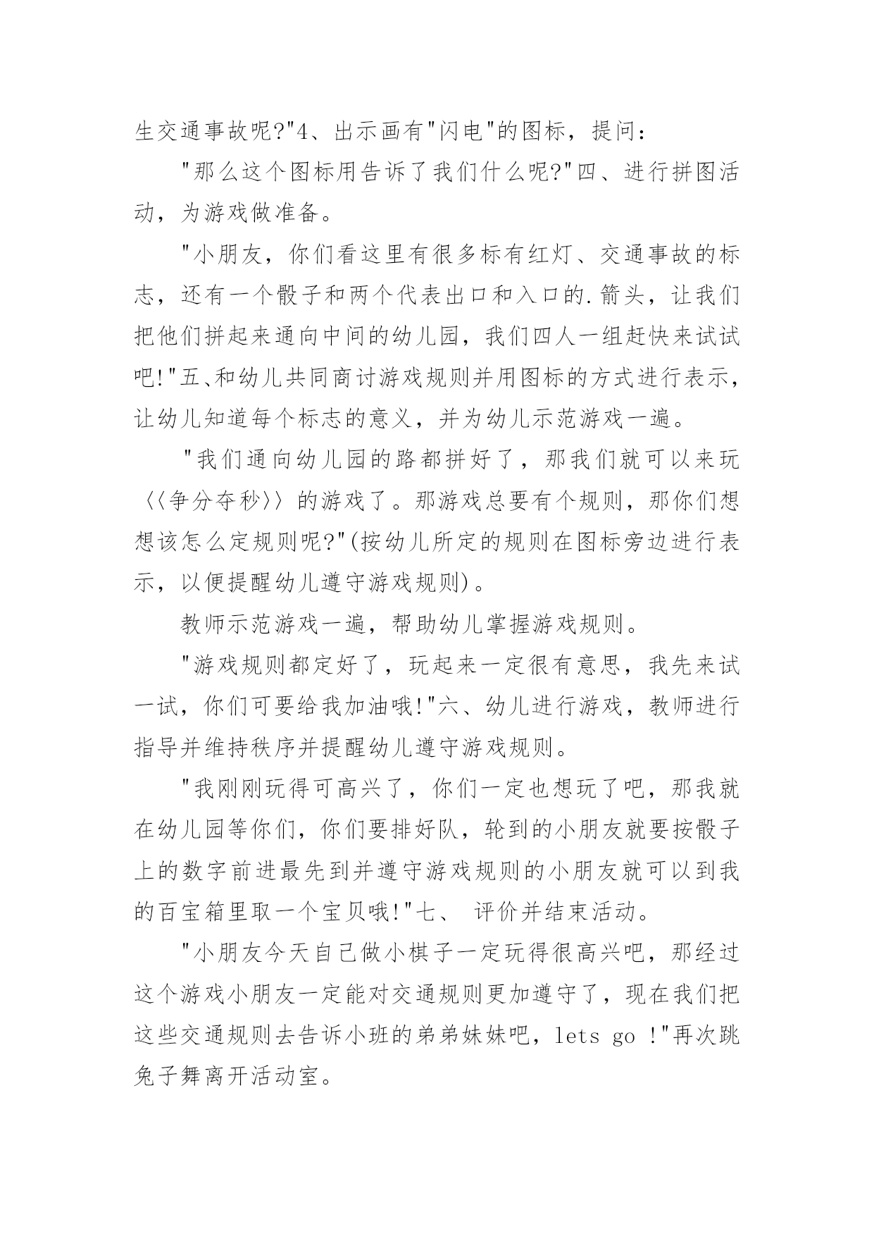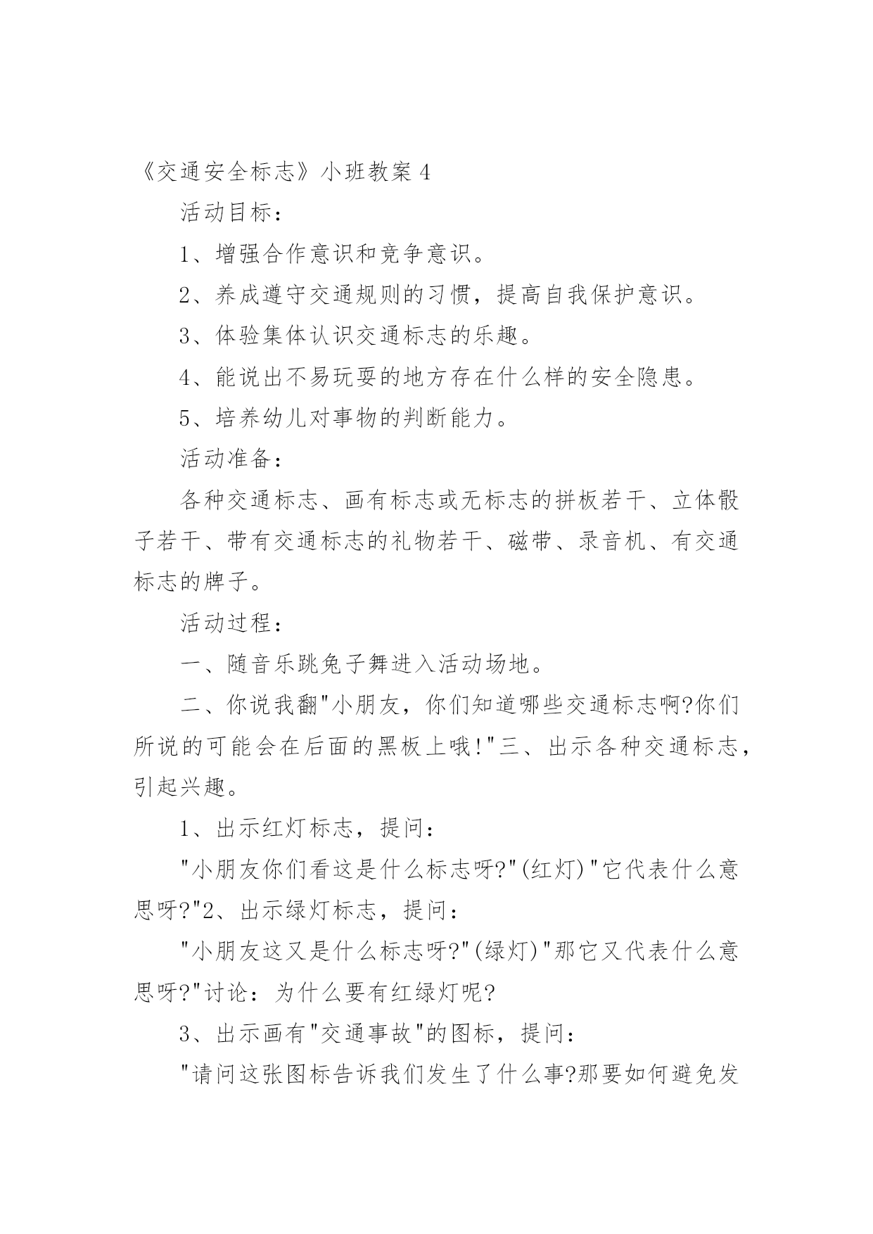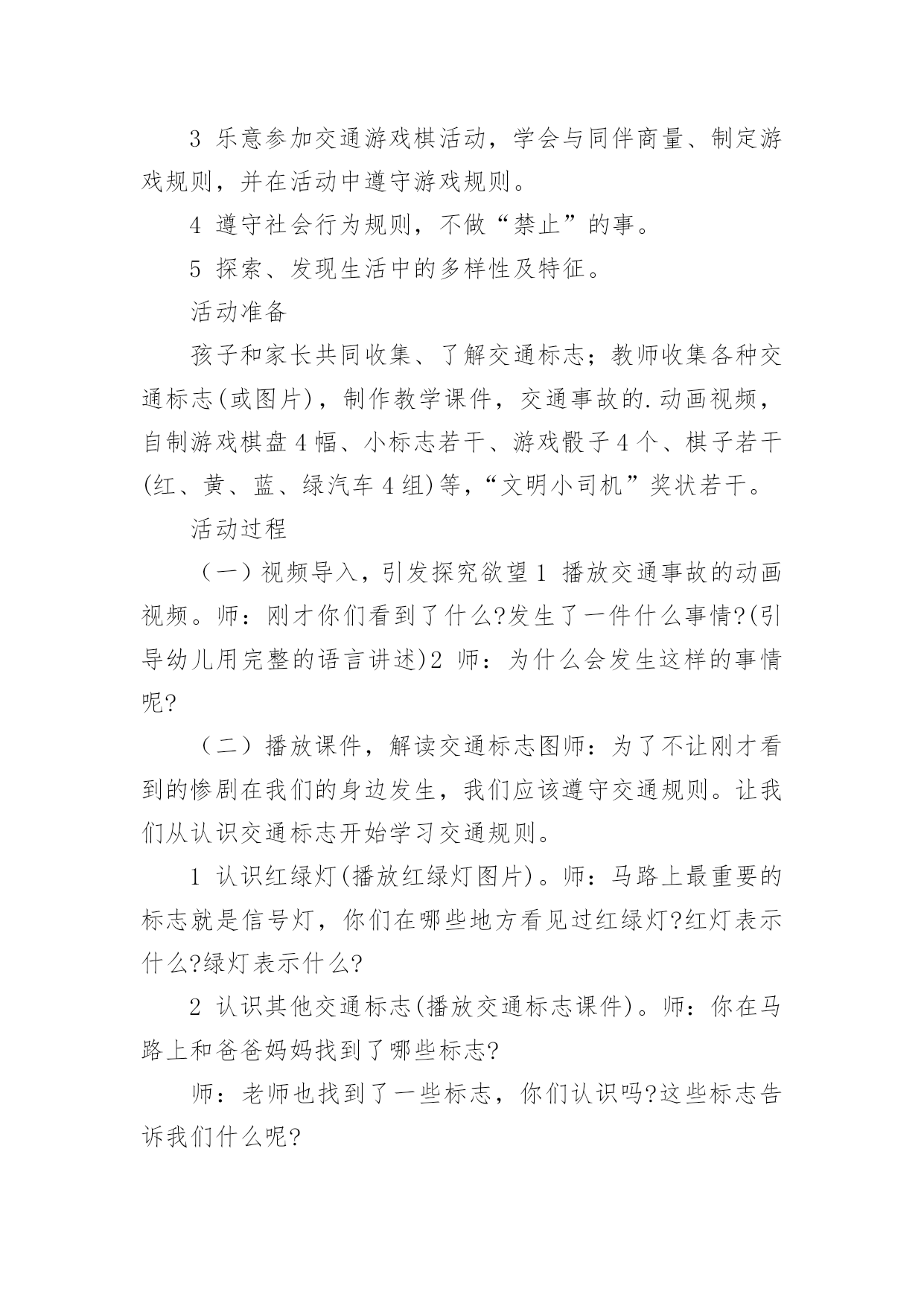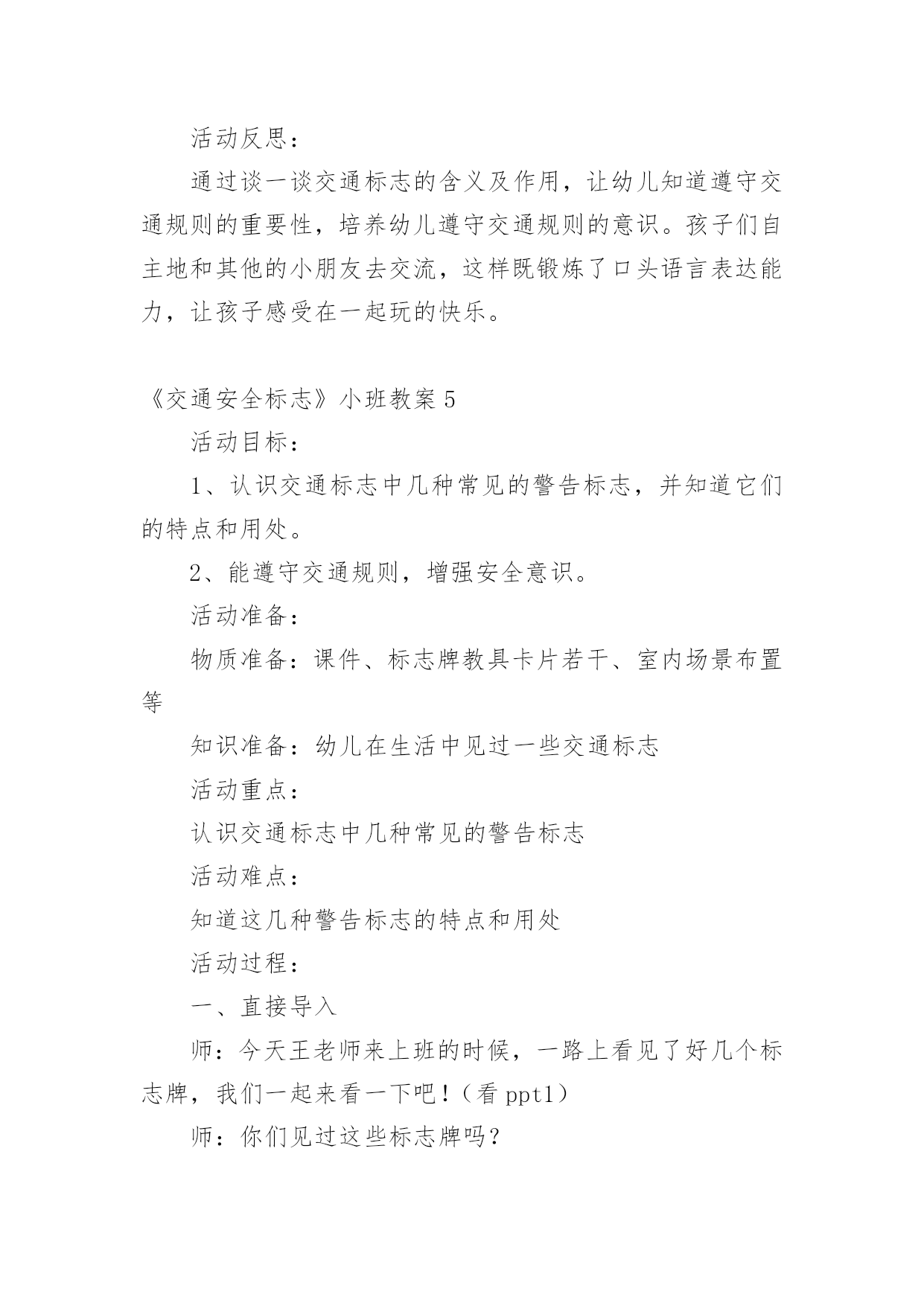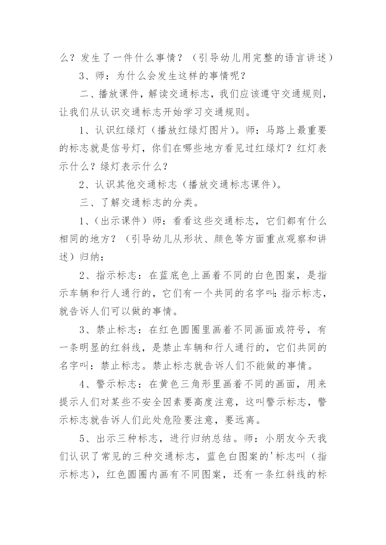 《交通安全标志》小班教案作为一位无私奉献的人民教师,通常需要用到教案来辅助教学,教案是教学蓝图,可以有效提高教学效率。那么优秀的教案是什么样的呢?以下是小编精心整理的《交通安全标志》小班教案,欢迎大家借鉴与参考,希望对大家有所帮助。《交通安全标志》小班教案1活动目标:1、尝试了解一些简单的交通标志,能用完整的语言正确表达它们的含义。2、尝试按标志的不同特征进行分类。3、乐意参与游戏,激发对交通标志的兴趣,培养遵守交通安全的意识。活动准备:1、收集各种交通标志(或图片)2、制作PPT3、交通事故的动画视频4、小标志若干活动过程:一、视频引入1、视频导入,引发探究欲望2、播放交通事故的动画视频。师:刚才你们看到了什么?发生了一件什么事情?(引导幼儿用完整的语言讲述)3、师:为什么会发生这样的事情呢?二、播放课件,解读交通标志,我们应该遵守交通规则,让我们从认识交通标志开始学习交通规则。1、认识红绿灯(播放红绿灯图片)。师:马路上最重要的标志就是信号灯,你们在哪些地方看见过红绿灯?红灯表示什么?绿灯表示什么?2、认识其他交通标志(播放交通标志课件)。三、了解交通标志的分类。1、(出示课件)师:看看这些交通标志,它们都有什么相同的地方?(引导幼儿从形状、颜色等方面重点观察和讲述)归纳:2、指示标志:在蓝底色上画着不同的白色图案,是指示车辆和行人通行的,它们有一个共同的名字叫:指示标志,就告诉人们可以做的事情。3、禁止标志:在红色圆圈里画着不同画面或符号,有一条明显的红斜线,是禁止车辆和行人通行的,它们共同的名字叫:禁止标志。禁止标志就告诉人们不能做的事情。4、警示标志:在黄色三角形里画着不同的画面,用来提示人们对某些不安全因素要高度注意,这叫警示标志,警示标志就告诉人们此处危险要注意,要远离。5、出示三种标志,进行归纳总结。师:小朋友今天我们认识了常见的三种交通标志,蓝色白图案的'标志叫(指示标志),红色圆圈内画有不同图案,还有一条红斜线的标志叫(禁止标志),黄色三角形内画不同图案的标志叫(警示标志)。四、判断交通行为对与错。1、播放课件,课件内容有:红灯车停;行人过马路走斑马线;行人靠左走;在马路上追车奔跑;在马路上玩耍、拍球;过马路跨越护栏;行人走天桥:等等)(1)师:有这样一群人。你们看看他们的行为对不对?说说你的理由。2、教师针对幼儿的回答适时小结。五、活动结束小结:小朋友,相信你们都是遵守交通规则的小司机。交通规则很重要,只有我们都去遵守它,道路交通才会变得有序,才不会出交通事故。以后爸爸妈妈开着汽车带我们出去玩的时候,你们也要提醒爸爸妈妈要看好马路上的交通标志,遵守交通规则,注意安全,好吗?六、律动退场《去郊游》小朋友们集合啦,今天天气真好,我们一起去郊游好吗?坐上我的大巴,我们出发啦!《交通安全标志》小班教案2活动目标1尝试了解各种不同的交通标志图,能用完整、流畅的语言正确表达它们的含义。2能注意观察生活环境中的交通标志,遵守交通规则。培养自我保护意识和能力。3乐意参加交通游戏棋活动,学会与同伴商量、制定游戏规则,并在活动中遵守游戏规则。4遵守社会行为规则,不做“禁止”的事。5探索、发现生活中的多样性及特征。活动准备孩子和家长共同收集、了解交通标志;教师收集各种交通标志(或图片),制作教学课件,交通事故的.动画视频,自制游戏棋盘4幅、小标志若干、游戏骰子4个、棋子若干(红、黄、蓝、绿汽车4组)等,“文明小司机”奖状若干。活动过程(一)视频导入,引发探究欲望1播放交通事故的动画视频。师:刚才你们看到了什么?发生了一件什么事情?(引导幼儿用完整的语言讲述)2师:为什么会发生这样的事情呢?(二)播放课件,解读交通标志图师:为了不让刚才看到的惨剧在我们的身边发生,我们应该遵守交通规则。让我们从认识交通标志开始学习交通规则。1认识红绿灯(播放红绿灯图片)。师:马路上最重要的标志就是信号灯,你们在哪些地方看见过红绿灯?红灯表示什么?绿灯表示什么?2认识其他交通标志(播放交通标志课件)。师:你在马路上和爸爸妈妈找到了哪些标志?师:老师也找到了一些标志,你们认识吗?这些标志告诉我们什么呢?3了解交通标志的分类。(1)(出示课件)师:看看这些交通标志,它们都有什么相同的地方?(引导幼儿从形状、颜色等方面重点观察和讲述)(2)教师小结:警告标志是三角形,黄底黑边,黑色图案,警告驾驶人员注意前方路段存在的危险和必须采取的措施。禁令标志是圆形,白底红边,红斜杠黑色图案,表示对车辆加以禁止或适当限制的标志。指路标志是长方形,蓝底白字和白色图案,是用于指路的指示牌。4判断交通行为对与错。(播放课件,课件内容有:红灯车停;行人过马路走斑马线;行人靠左走;在马路上追车奔跑;在马路上玩耍、拍球;过马路跨越护栏;行人走天桥:等等)(1)师:有这样一群人