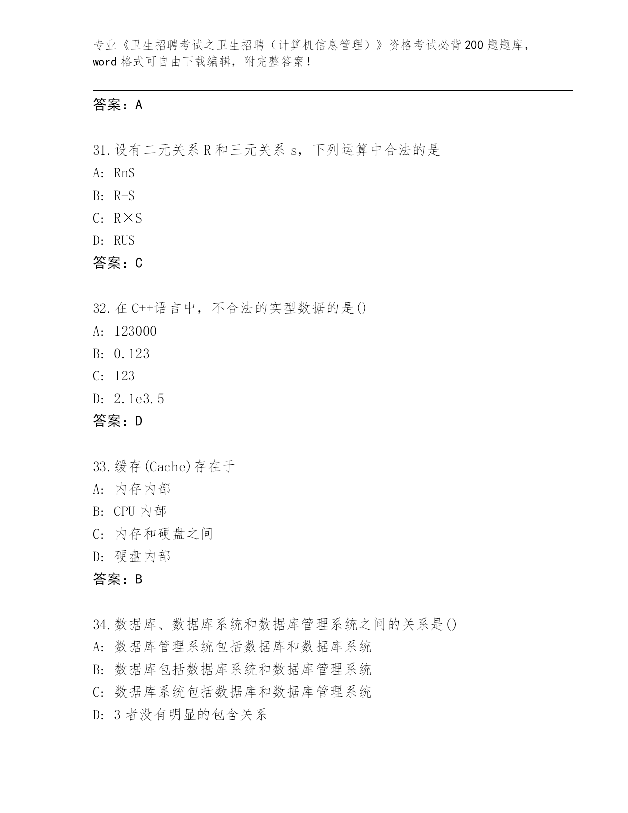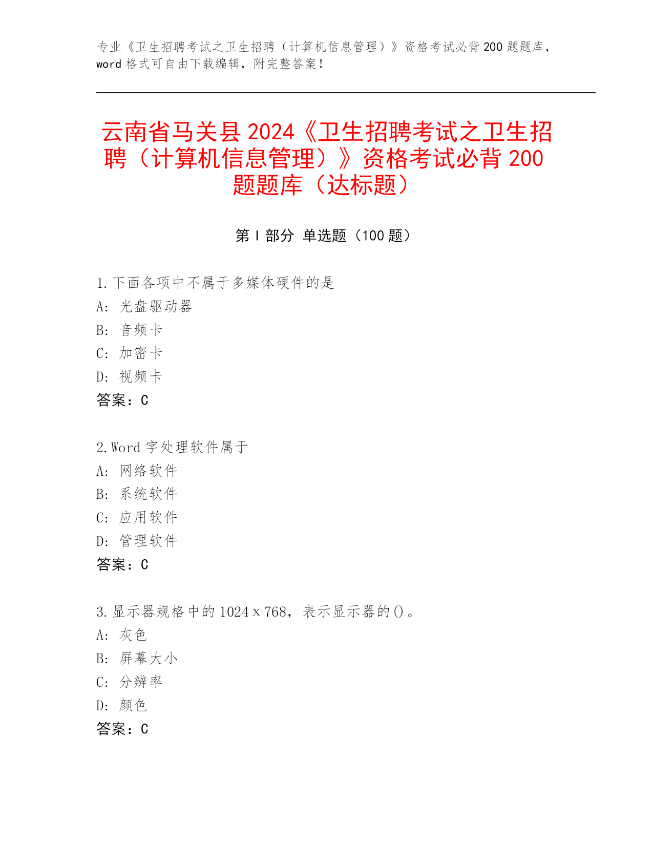 云南省马关县2024《卫生招聘考试之卫生招聘(计算机信息管理)》资格考试必背200题题库(达标题)