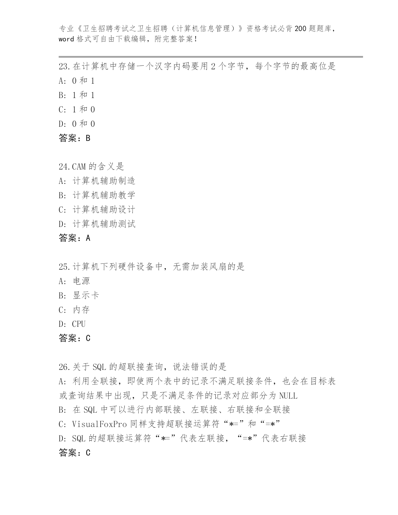 云南省2024年《卫生招聘考试之卫生招聘(计算机信息管理)》资格考试必背200题题库及答案【新】