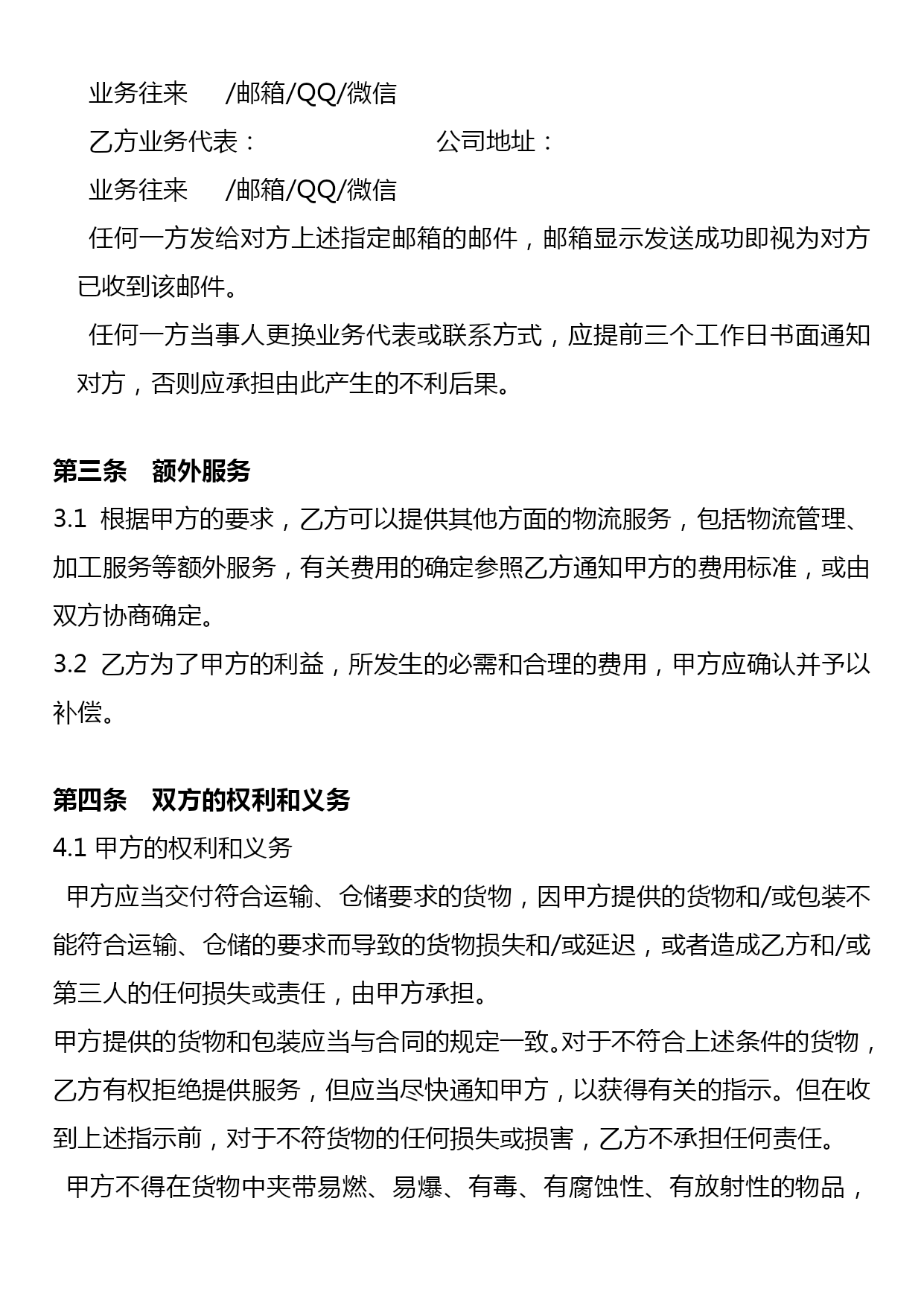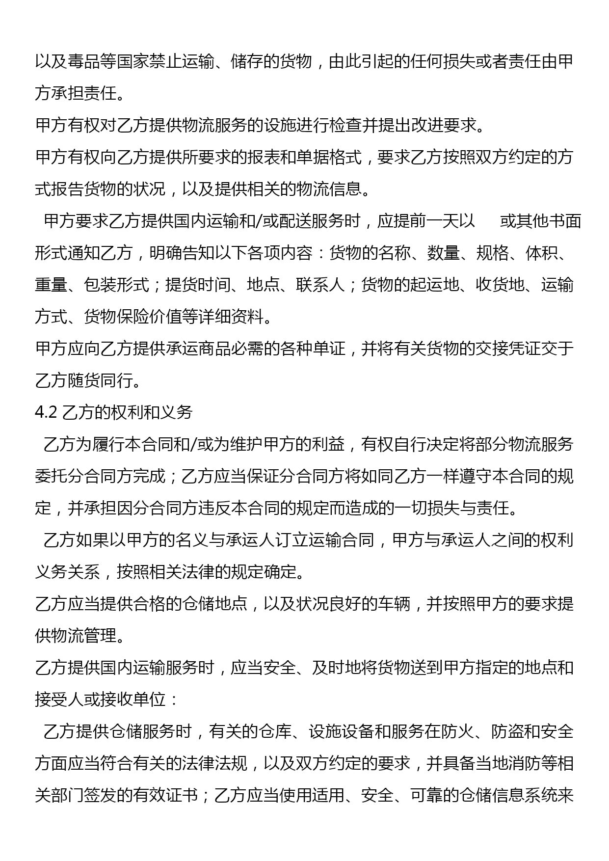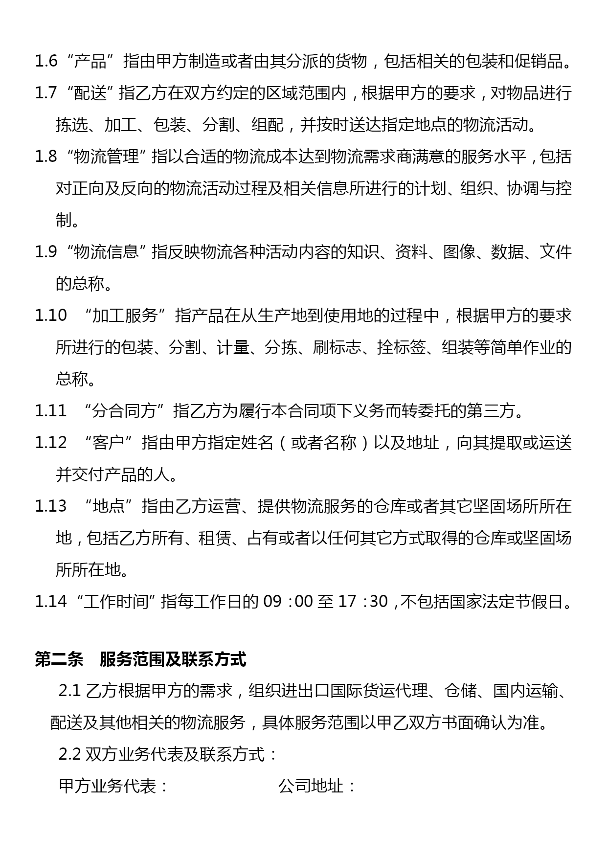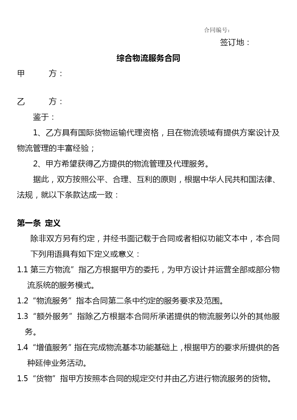 综合物流业务合同(完整版)资料(可以直接使用,可编辑优秀版资料,欢迎下载)合同编号:签订地:综合物流服务合同甲方:乙方:鉴于:1、乙方具有国际货物运输代理资格,且在物流领域有提供方案设计及物流管理的丰富经验;2、甲方希望获得乙方提供的物流管理及代理服务。据此,双方按照公平、合理、互利的原则,根据中华人民共和国法律、法规,就以下条款达成一致:第一条定义除非双方另有约定,并经书面记载于合同或者相似功能文本中,本合同下列用语具有如下定义或意义:1.1第三方物流”指乙方根据甲方的委托,为甲方设计并运营全部或部分物流系统的服务模式。1.2“物流服务”指本合同第二条中约定的服务要求及范围。1.3“额外服务”指除乙方根据本合同所承诺提供的物流服务以外的其他服务。1.4“增值服务”指在完成物流基本功能基础上,根据甲方的要求所提供的各种延伸业务活动。1.5“货物”指甲方按照本合同的规定交付并由乙方进行物流服务的货物。1.6“产品”指由甲方制造或者由其分派的货物,包括相关的包装和促销品。1.7“配送”指乙方在双方约定的区域范围内,根据甲方的要求,对物品进行拣选、加工、包装、分割、组配,并按时送达指定地点的物流活动。1.8“物流管理”指以合适的物流成本达到物流需求商满意的服务水平,包括对正向及反向的物流活动过程及相关信息所进行的计划、组织、协调与控制。1.9“物流信息”指反映物流各种活动内容的知识、资料、图像、数据、文件的总称。1.10“加工服务”指产品在从生产地到使用地的过程中,根据甲方的要求所进行的包装、分割、计量、分拣、刷标志、拴标签、组装等简单作业的总称。1.11“分合同方”指乙方为履行本合同项下义务而转委托的第三方。1.12“客户”指由甲方指定姓名(或者名称)以及地址,向其提取或运送并交付产品的人。1.13“地点”指由乙方运营、提供物流服务的仓库或者其它坚固场所所在地,包括乙方所有、租赁、占有或者以任何其它方式取得的仓库或坚固场所所在地。1.14“工作时间”指每工作日的09:00至17:30,不包括国家法定节假日。第二条服务范围及联系方式2.1乙方根据甲方的需求,组织进出口国际货运代理、仓储、国内运输、配送及其他相关的物流服务,具体服务范围以甲乙双方书面确认为准。2.2双方业务代表及联系方式:甲方业务代表:公司地址:业务往来/邮箱/QQ/微信乙方业务代表:公司地址:业务往来/邮箱/QQ/微信任何一方发给对方上述指定邮箱的邮件,邮箱显示发送成功即视为对方已收到该邮件。任何一方当事人更换业务代表或联系方式,应提前三个工作日书面通知对方,否则应承担由此产生的不利后果。第三条额外服务3.1根据甲方的要求,乙方可以提供其他方面的物流服务,包括物流管理、加工服务等额外服务,有关费用的确定参照乙方通知甲方的费用标准,或由双方协商确定。3.2乙方为了甲方的利益,所发生的必需和合理的费用,甲方应确认并予以补偿。第四条双方的权利和义务4.1甲方的权利和义务甲方应当交付符合运输、仓储要求的货物,因甲方提供的货物和/或包装不能符合运输、仓储的要求而导致的货物损失和/或延迟,或者造成乙方和/或第三人的任何损失或责任,由甲方承担。甲方提供的货物和包装应当与合同的规定一致。对于不符合上述条件的货物,乙方有权拒绝提供服务,但应当尽快通知甲方,以获得有关的指示。但在收到上述指示前,对于不符货物的任何损失或损害,乙方不承担任何责任。甲方不得在货物中夹带易燃、易爆、有毒、有腐蚀性、有放射性的物品,以及毒品等国家禁止运输、储存的货物,由此引起的任何损失或者责任由甲方承担责任。甲方有权对乙方提供物流服务的设施进行检查并提出改进要求。甲方有权向乙方提供所要求的报表和单据格式,要求乙方按照双方约定的方式报告货物的状况,以及提供相关的物流信息。甲方要求乙方提供国内运输和/或配送服务时,应提前一天以或其他书面形式通知乙方,明确告知以下各项内容:货物的名称、数量、规格、体积、重量、包装形式;提货时间、地点、联系人;货物的起运地、收货地、运输方式、货物保险价值等详细资料。甲方应向乙方提供承运商品必需的各种单证,并将有关货物的交接凭证交于乙方随货同行。4.2乙方的权利和义务乙方为履行本合同和/或为维护甲方的利益,有权自行决定将部分物流服务委托分合同方完成;乙方应当保证分合同方将如同乙方一样遵守本合同的规定,并承担因分合同方违反本合同的规定而造成的一切损失与责任。乙方如果以甲方的名义与承运人订立运输合同,甲方与承运人之间的权利义务关系,按照相关法律的规定确定。乙方应当提供合格的仓储地点,以及状况良好的车辆,并按照甲方的要求提供物流管理。乙方提供国内运输服务时,应当安全、及时地将货物送