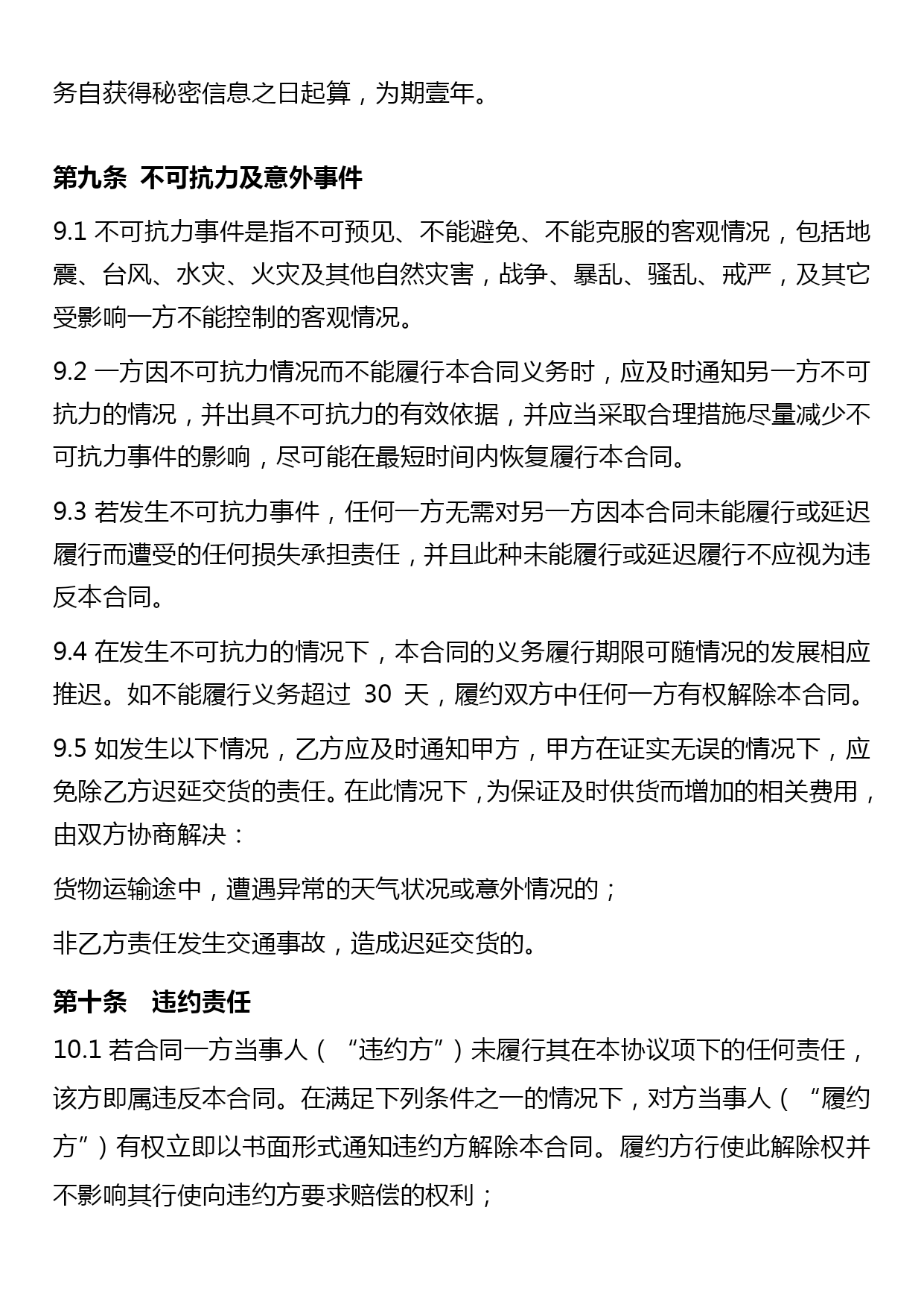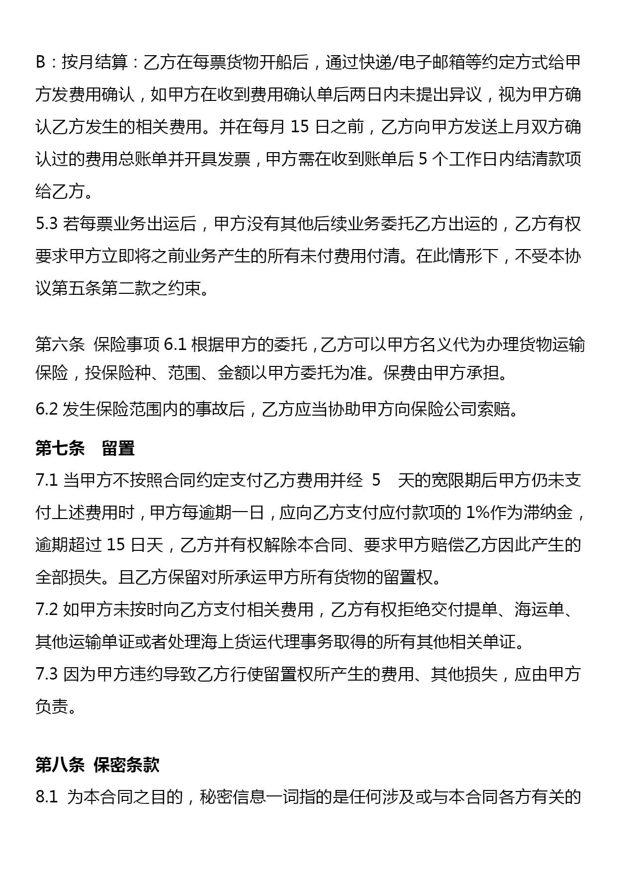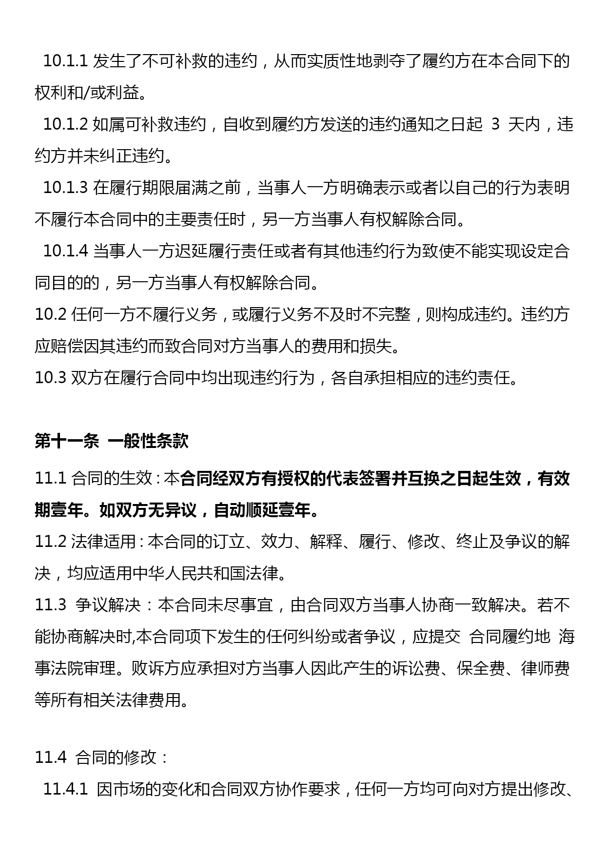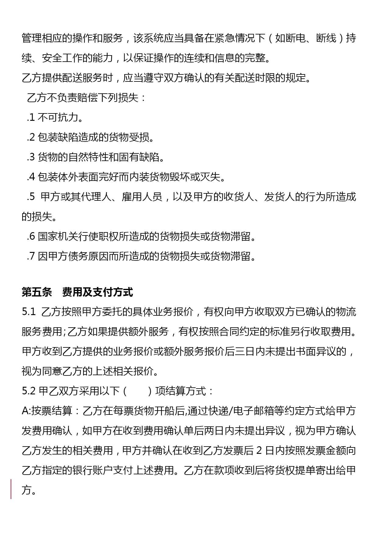 综合物流业务合同(完整版)资料(可以直接使用,可编辑优秀版资料,欢迎下载)合同编号:签订地:综合物流服务合同甲方:乙方:鉴于:1、乙方具有国际货物运输代理资格,且在物流领域有提供方案设计及物流管理的丰富经验;2、甲方希望获得乙方提供的物流管理及代理服务。据此,双方按照公平、合理、互利的原则,根据中华人民共和国法律、法规,就以下条款达成一致:第一条定义除非双方另有约定,并经书面记载于合同或者相似功能文本中,本合同下列用语具有如下定义或意义:1.1第三方物流”指乙方根据甲方的委托,为甲方设计并运营全部或部分物流系统的服务模式。1.2“物流服务”指本合同第二条中约定的服务要求及范围。1.3“额外服务”指除乙方根据本合同所承诺提供的物流服务以外的其他服务。1.4“增值服务”指在完成物流基本功能基础上,根据甲方的要求所提供的各种延伸业务活动。1.5“货物”指甲方按照本合同的规定交付并由乙方进行物流服务的货物。1.6“产品”指由甲方制造或者由其分派的货物,包括相关的包装和促销品。1.7“配送”指乙方在双方约定的区域范围内,根据甲方的要求,对物品进行拣选、加工、包装、分割、组配,并按时送达指定地点的物流活动。1.8“物流管理”指以合适的物流成本达到物流需求商满意的服务水平,包括对正向及反向的物流活动过程及相关信息所进行的计划、组织、协调与控制。1.9“物流信息”指反映物流各种活动内容的知识、资料、图像、数据、文件的总称。1.10“加工服务”指产品在从生产地到使用地的过程中,根据甲方的要求所进行的包装、分割、计量、分拣、刷标志、拴标签、组装等简单作业的总称。1.11“分合同方”指乙方为履行本合同项下义务而转委托的第三方。1.12“客户”指由甲方指定姓名(或者名称)以及地址,向其提取或运送并交付产品的人。1.13“地点”指由乙方运营、提供物流服务的仓库或者其它坚固场所所在地,包括乙方所有、租赁、占有或者以任何其它方式取得的仓库或坚固场所所在地。1.14“工作时间”指每工作日的09:00至17:30,不包括国家法定节假日。第二条服务范围及联系方式2.1乙方根据甲方的需求,组织进出口国际货运代理、仓储、国内运输、配送及其他相关的物流服务,具体服务范围以甲乙双方书面确认为准。2.2双方业务代表及联系方式:甲方业务代表:公司地址:业务往来/邮箱/QQ/微信乙方业务代表:公司地址:业务往来/邮箱/QQ/微信任何一方发给对方上述指定邮箱的邮件,邮箱显示发送成功即视为对方已收到该邮件。任何一方当事人更换业务代表或联系方式,应提前三个工作日书面通知对方,否则应承担由此产生的不利后果。第三条额外服务3.1根据甲方的要求,乙方可以提供其他方面的物流服务,包括物流管理、加工服务等额外服务,有关费用的确定参照乙方通知甲方的费用标准,或由双方协商确定。3.2乙方为了甲方的利益,所发生的必需和合理的费用,甲方应确认并予以补偿。第四条双方的权利和义务4.1甲方的权利和义务甲方应当交付符合运输、仓储要求的货物,因甲方提供的货物和/或包装不能符合运输、仓储的要求而导致的货物损失和/或延迟,或者造成乙方和/或第三人的任何损失或责任,由甲方承担。甲方提供的货物和包装应当与合同的规定一致。对于不符合上述条件的货物,乙方有权拒绝提供服务,但应当尽快通知甲方,以获得有关的指示。但在收到上述指示前,对于不符货物的任何损失或损害,乙方不承担任何责任。甲方不得在货物中夹带易燃、易爆、有毒、有腐蚀性、有放射性的物品,以及毒品等国家禁止运输、储存的货物,由此引起的任何损失或者责任由甲方承担责任。甲方有权对乙方提供物流服务的设施进行检查并提出改进要求。甲方有权向乙方提供所要求的报表和单据格式,要求乙方按照双方约定的方式报告货物的状况,以及提供相关的物流信息。甲方要求乙方提供国内运输和/或配送服务时,应提前一天以或其他书面形式通知乙方,明确告知以下各项内容:货物的名称、数量、规格、体积、重量、包装形式;提货时间、地点、联系人;货物的起运地、收货地、运输方式、货物保险价值等详细资料。甲方应向乙方提供承运商品必需的各种单证,并将有关货物的交接凭证交于乙方随货同行。4.2乙方的权利和义务乙方为履行本合同和/或为维护甲方的利益,有权自行决定将部分物流服务委托分合同方完成;乙方应当保证分合同方将如同乙方一样遵守本合同的规定,并承担因分合同方违反本合同的规定而造成的一切损失与责任。乙方如果以甲方的名义与承运人订立运输合同,甲方与承运人之间的权利义务关系,按照相关法律的规定确定。乙方应当提供合格的仓储地点,以及状况良好的车辆,并按照甲方的要求提供物流管理。乙方提供国内运输服务时,应当安全、及时地将货物送