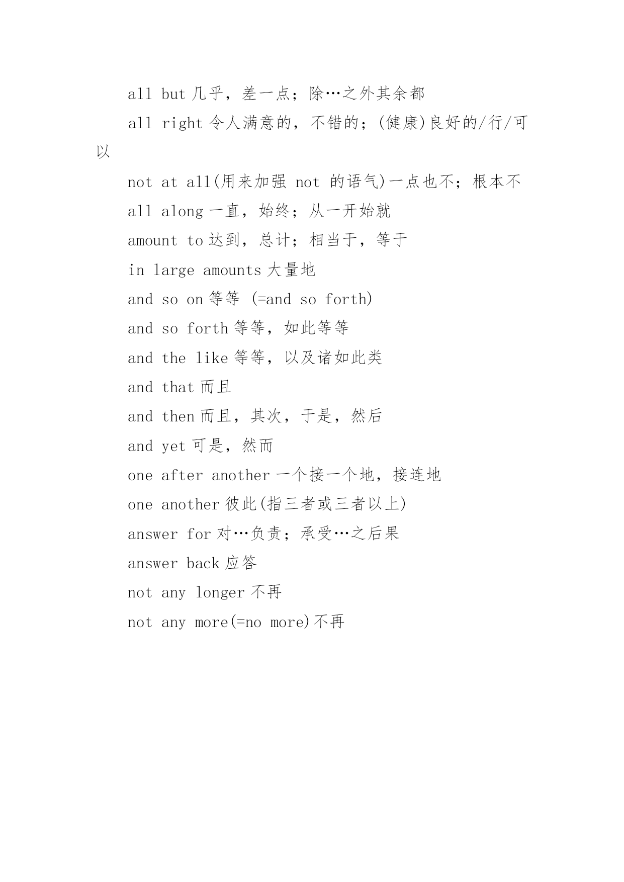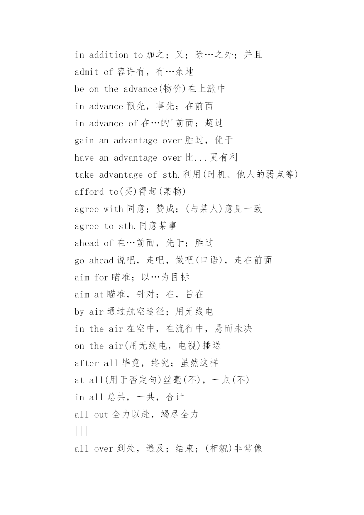 公共英语五级考试重点短语语句公共英语五级考试重点短语语句beabletodo能够,会beabouttodo刚要,即将aboveall首先,首要,尤其是beabsorbedinsth.专心致力于…beabsorbedindoingsth.专心致力于…beabundantin…富于,…丰富byaccident偶然,碰巧(=bychance)inaccordancewith依照,根据,与…一致accordingtoprep.据/照…(所说、所写);按…,视…accusesb.ofsth.控告(某人某事)beaccustomedto习惯于,惯常的actas(临时)担任,充当,起…作用acton遵照…行动,奉行;作用于,影响putsth.intoaction付诸实施putsth.outofaction使……停止工作或活动takeaction采取行动;开始工作adaptto适应addup加起来;说得通|||inadditionconj.另外,加之inadditionto加之;又;除…之外;并且admitof容许有,有…余地beontheadvance(物价)在上涨中inadvance预先,事先;在前面inadvanceof在…的'前面;超过gainanadvantageover胜过,优于haveanadvantageover比...更有利takeadvantageofsth.利用(时机、他人的弱点等)affordto(买)得起(某物)agreewith同意;赞成;(与某人)意见一致agreetosth.同意某事aheadof在…前面,先于;胜过goahead说吧,走吧,做吧(口语),走在前面aimfor瞄准;以…为目标aimat瞄准,针对;在,旨在byair通过航空途径;用无线电intheair在空中,在流行中,悬而未决ontheair(用无线电,电视)播送afterall毕竟,终究;虽然这样atall(用于否定句)丝毫(不),一点(不)inall总共,一共,合计allout全力以赴,竭尽全力|||allover到处,遍及;结束;(相貌)非常像allbut几乎,差一点;除…之外其余都allright令人满意的,不错的;(健康)良好的/行/可以notatall(用来加强not的语气)一点也不;根本不allalong一直,始终;从一开始就amountto达到,总计;相当于,等于inlargeamounts大量地andsoon等等(=andsoforth)andsoforth等等,如此等等andthelike等等,以及诸如此类andthat而且andthen而且,其次,于是,然后andyet可是,然而oneafteranother一个接一个地,接连地oneanother彼此(指三者或三者以上)answerfor对…负责;承受…之后果answerback应答notanylonger不再notanymore(=nomore)不再