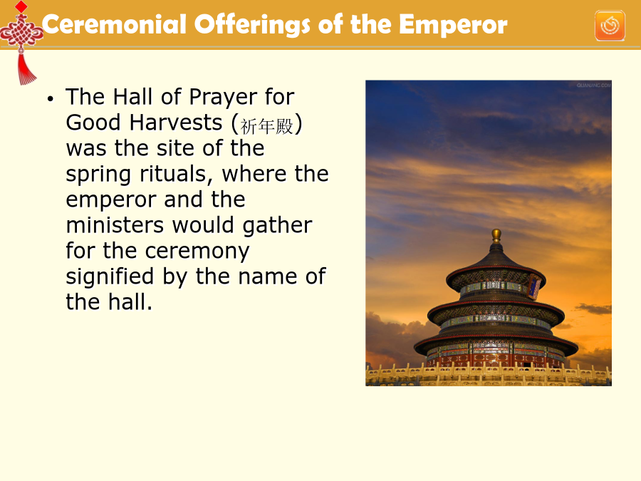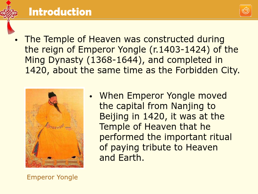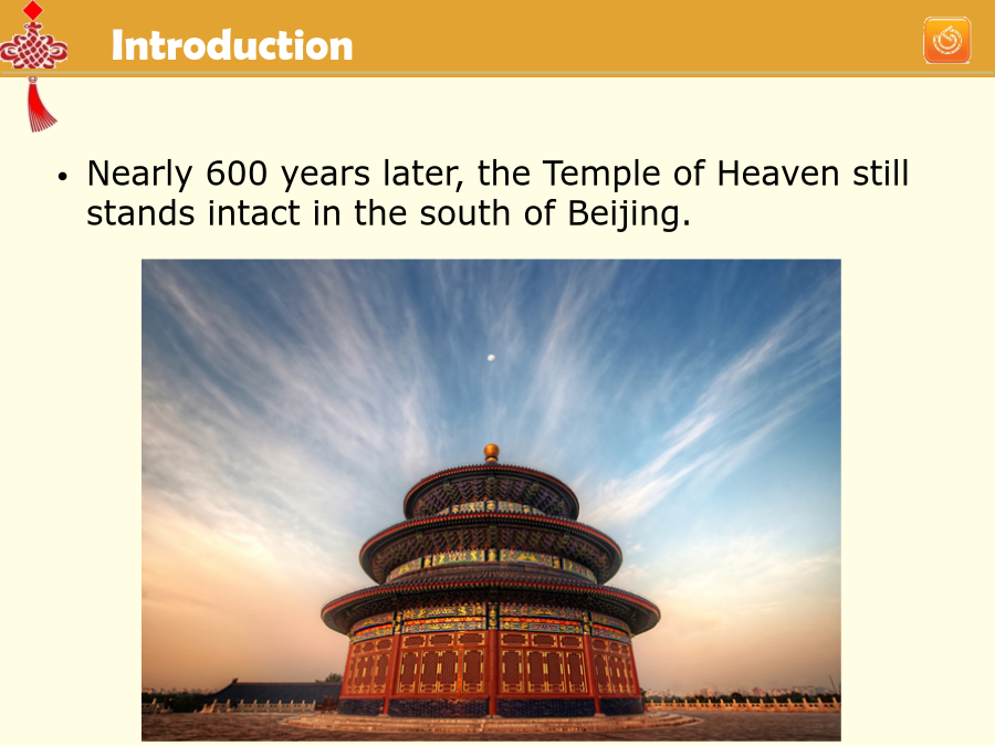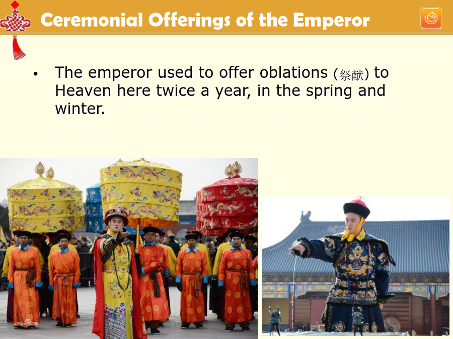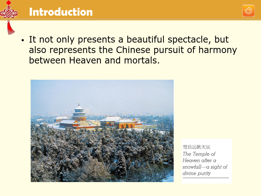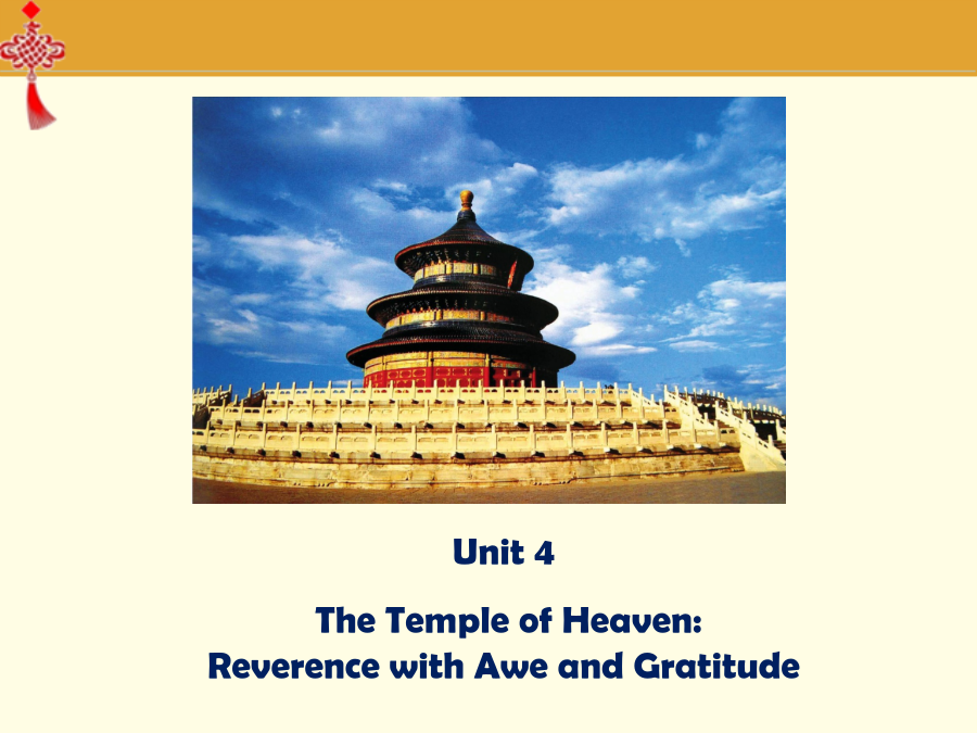 IntroductionIntroductionTheHallofPrayerforGoodHarvests(祈年殿)wasthesiteofthespringrituals,wheretheemperorandtheministerswouldgatherfortheceremonysignifiedbythenameofthehall.CeremonialOfferingsoftheEmperorOntheWinterSolstice(冬至),theywouldmakeofferingsattheCircularMoundAltar(圜丘坛),toshowtheirgratitudeforthegreatcompassion(同情)ofHeaventowardthehumanworld.Note:圜丘坛为每年冬至日祭天处,为汉白玉石砌的三层露天圆坛,围绕着石雕栏杆。Intimesofdroughtorflood,theemperorwouldcometheCircularMoundAltarwithcivilandmilitaryofficialstoprayforassistancefromHeaven.OnlytheemperorcouldprayattheTempleofHeaven.Ordinarypeoplewerenotallowedaccess.YettheideaofshowingaweandrespecttoHeavenwasnotreservedfortheemperoralone,butwassharedbythepeopleaswell.TheworshipofHeavenamongtheChinesedatesbacktoover3,000yearsago.TraditionalChineseviewonheavenInthesecondyearofthereignofEmperorGuangxu(r.1875-1908),theHallofPrayerforGoodHarvestswasburneddowninabigfire.Theemperorlosthiscomposure(镇静)atthenewsandalltheministersturnedashen,believingthedisastertobeabadomen(预兆)fromHeaven.TotheancientChinese,however,Heavenwasmoreinclinedtowardloveandtolerance,punishingpeopleonlyoccasionally.Thus,ourforebearswerealwaysgratefultoHeaven.IfyoustandontheHeavenlyHeartStoneontheCircularMoundAltar,youcanhearyourvoicerisefromunderneathyourfeetandechobackfromthewallaroundtheAltar.Theresoundingecho,accordingtothedesigners,representsHeaven'sreplytowhateverthespeakerasksfor.WhenyoustandinsidetheouterwalloftheImperialVaultofHeaven,andspeakintothewall,afriendatapointfartherawayalongthewallcanhearyourvoice;itresemblesmakingaphonecalltosomeone.Echowall1.Readthepassagecarefullyandfillinthefollowingblankswiththemissinginformation.4)TotheChinesepeople,____________________arequalitiesofHeaven.1)triple-terraced6)altarThefollowingisatourguidetotheTempleofHeaven.Theparagraphsaregiveninthewrongorder.Youarerequiredtoreorganizetheseparagraphsintoacoherentpassage.Themapbelowisforyourreference.CommunicationCThankYou!