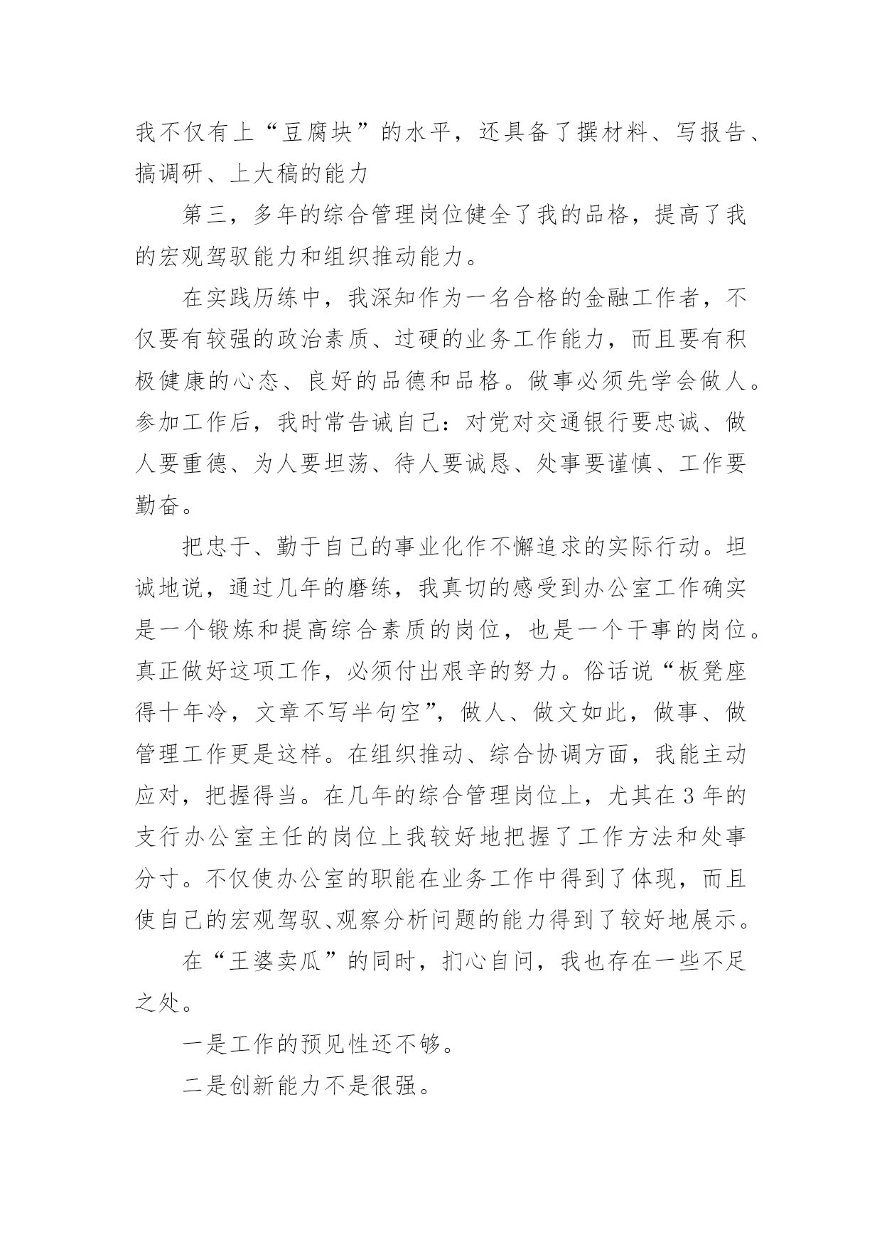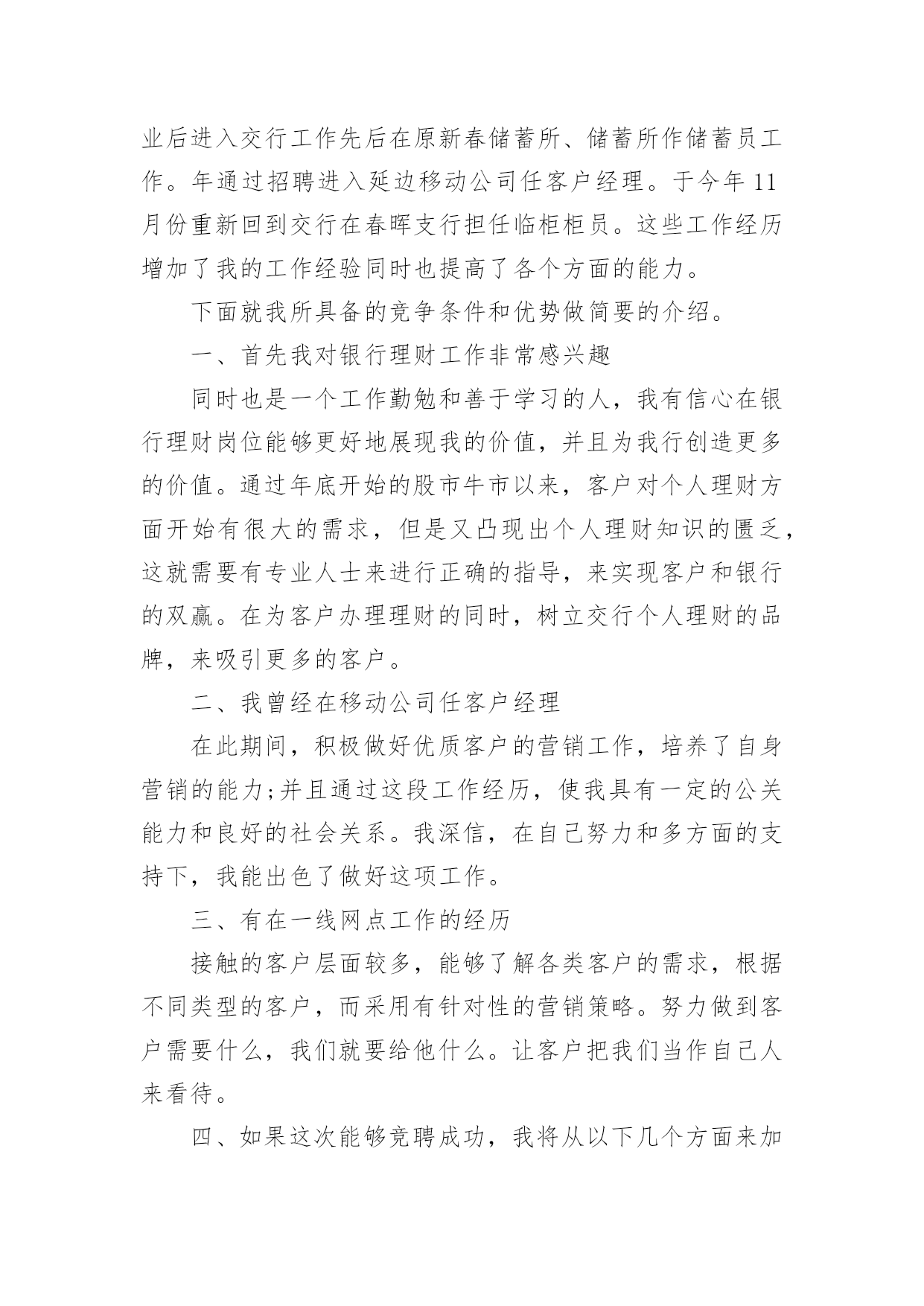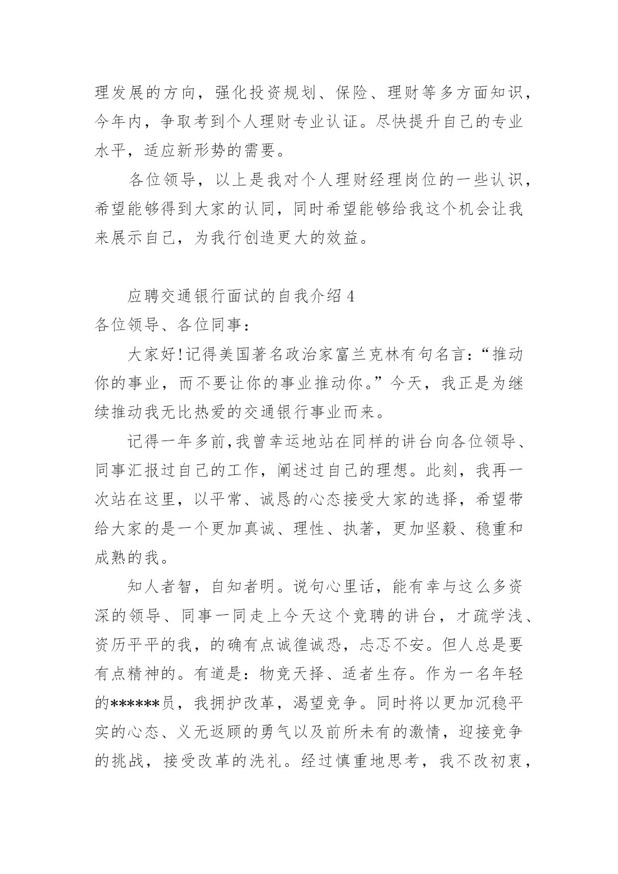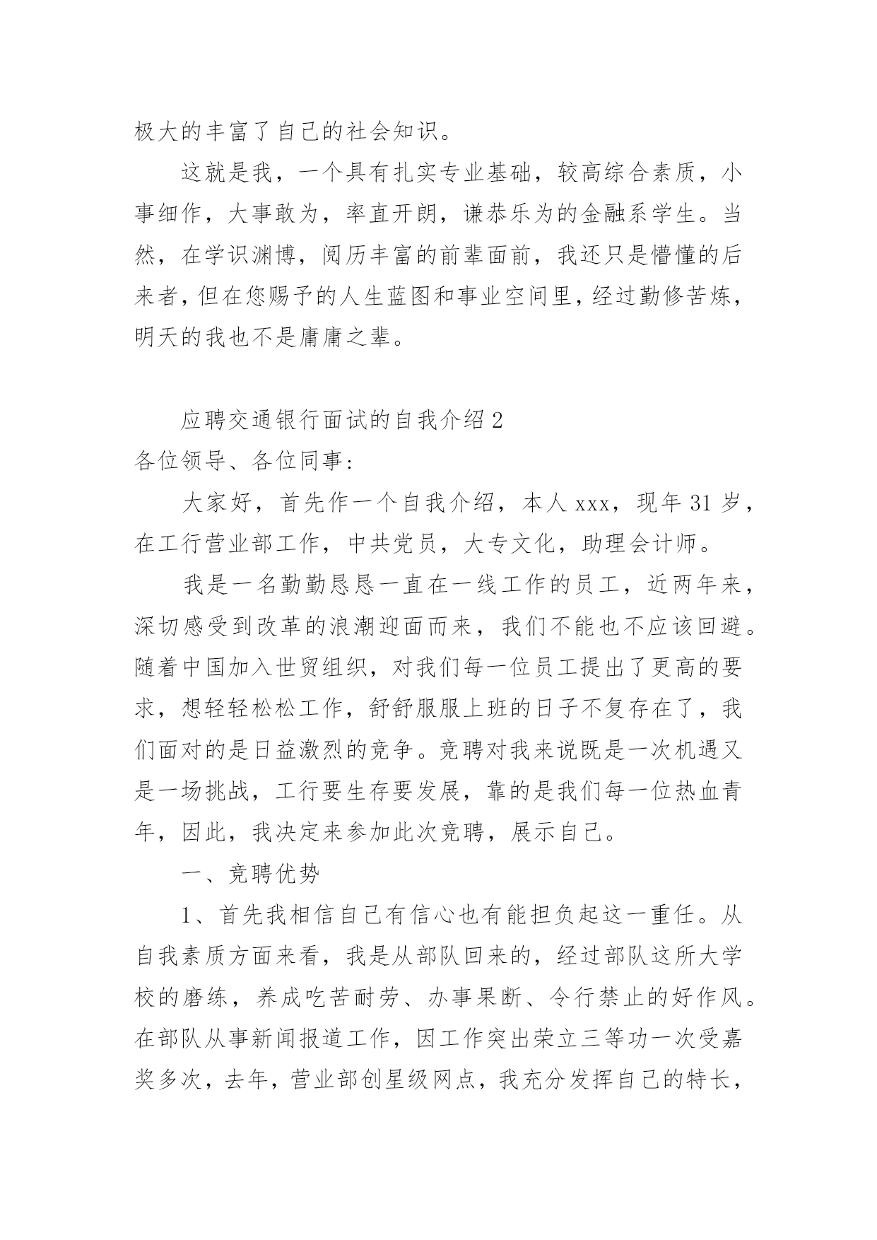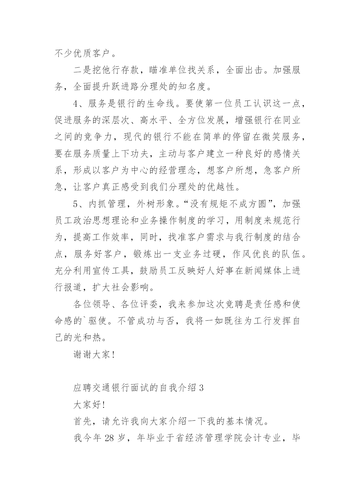 应聘交通银行面试的自我介绍应聘交通银行面试的自我介绍范文当来到一个新环境时,通常需要我们进行自我介绍,自我介绍可以满足我们渴望得到尊重的心理。但是自我介绍有什么要求呢?下面是小编帮大家整理的应聘交通银行面试的自我介绍范文,仅供参考,欢迎大家阅读。应聘交通银行面试的自我介绍1我叫XX,是南京财经大学金融系金融专业10届毕业生,在求学生涯的四年大学学习过程中,经历过失败和挫折,经历过成功与幸福,我孜孜以求,不惜奋斗,而正所谓“一份耕耘,一份收获”,我的付出有了回报。通过大学四年专业课的学习,能掌握并熟练运用国际金融、货币银行学、中央银行、保险学、财产保险、人寿保险、西方金融理论、金融市场学、金融营销学业、银行会计、商业银行、西方经济学等专业知识和技能,并掌握了计算机初级,中级知识,能熟练运用WINDOWS操作系统,熟练掌握internet,能用WPS、MicrosoftWord等进行文档编辑及操作,并能运用Photoshop等工具软件进行图像设计,掌握了MicrosoftVisualFoxPro数据库的制作。在学习上刻苦认真,渴望上进,努力学习每一门课程,并通过了国家二级计算机考试,。在实践生活中,我把自己放在现实社会中学习社会知识,参与了很多社会实践活动,极大的丰富了自己的社会知识。这就是我,一个具有扎实专业基础,较高综合素质,小事细作,大事敢为,率直开朗,谦恭乐为的金融系学生。当然,在学识渊博,阅历丰富的前辈面前,我还只是懵懂的后来者,但在您赐予的人生蓝图和事业空间里,经过勤修苦炼,明天的我也不是庸庸之辈。应聘交通银行面试的自我介绍2各位领导、各位同事:大家好,首先作一个自我介绍,本人xxx,现年31岁,在工行营业部工作,中共党员,大专文化,助理会计师。我是一名勤勤恳恳一直在一线工作的员工,近两年来,深切感受到改革的浪潮迎面而来,我们不能也不应该回避。随着中国加入世贸组织,对我们每一位员工提出了更高的要求,想轻轻松松工作,舒舒服服上班的日子不复存在了,我们面对的是日益激烈的竞争。竞聘对我来说既是一次机遇又是一场挑战,工行要生存要发展,靠的是我们每一位热血青年,因此,我决定来参加此次竞聘,展示自己。一、竞聘优势1、首先我相信自己有信心也有能担负起这一重任。从自我素质方面来看,我是从部队回来的,经过部队这所大学校的磨练,养成吃苦耐劳、办事果断、令行禁止的好作风。在部队从事新闻报道工作,因工作突出荣立三等功一次受嘉奖多次,去年,营业部创星级网点,我充分发挥自己的特长,在《如皋日报》对营业部进行的宣传,取得了良好的效果。进行以来,能不断完善和提升自我,认真学习各项业务知识,尽快适应银行工作。95年通过全国成人高考并取得江苏省财经高等学校大专学历,目前正向本科进军,98年通过江苏省英语、计算机等级考试,20XX年通过国家人事部考试,被聘为助理会计师。2、有着较强工作责任心和进取心。进行以来先后从事出纳、会计等岗位的工作,做到干一行爱一行,对待工作认真负责,出纳点钞获省行级能手,所办理业务无一重大差错,98年被评为支行“优秀行员”。我总觉得作为年青人总该有点追求,更何况面对日趋激烈的竞争,想逃避是不可能的。历史的重任已经落在我们肩上,我们只有迎难而上,苦干实干,全面奉献自己。3、我深刻懂得这一岗位的重要性。将西门储蓄所升格为分理处,充分体现了行党委、行长室对该分理处的高度重视和对其寄予无限的厚望。作为新建分理处主任要一种吃苦耐劳和开拓精神,瞄准目标、不负众望,确保任务实现。4、能够看到自己的弱点。业务水平有待进一步提高,储蓄业务没有接触过,但我相信我有能力尽快适应。管理对我来说是个全新的课题,在今后工作中,我将不断地调整自己,虚心请教,加强学习,与时俱进,超越自我。二、目标和任务这次竞聘如果成功,我将进一步解放思想,带领各位同事提高结算质量,搞好优质服务,挖掘市场潜力,争取优质客户源,开创分理处新局面,全面超额完成行党委、行长室交办的各项任务,将分理处创办成三星级网点。三、具体措施作为新建分理处要确保目标任务实现,我认为主要要做好以下几方面工作:1、思想总揽全局,做好表率。作一个带头人要有全局观念,要从多方面考虑问题,协调各方面关系,在行党委、行长室的领导下,向目标任务冲刺。在内务管理方面同样要兼顾全面,如制度执行、安全保卫、环境卫生等。管理对我来说是一个全新的课题,熟话说得好,正人先正已,自己要做好表率,从各方面严格要求自己,吃苦在前,享受在后。2、统一思想,发挥团队作战精神。以绩效考核为动力,充分调动员工的积极性。借分理处升格的东风,利用新业务系统的先进的硬件多渠道、全方位开展揽存增存工作。鼓励员工找关系、拉关系、抓关系,献计献策,建立完善揽存信息网络,捕捉每条信息。作为我本人更要主动出击,寻找客户源、存款源。3、挖掘优质客户源,