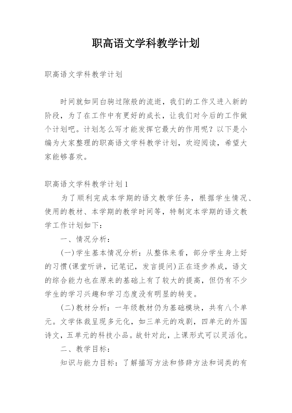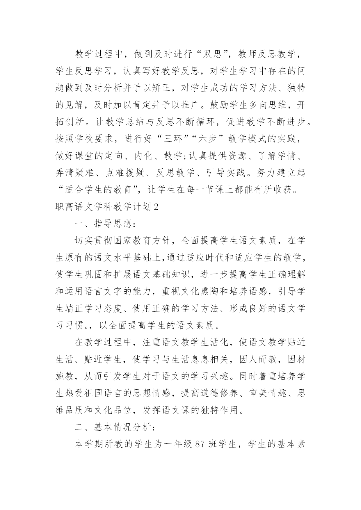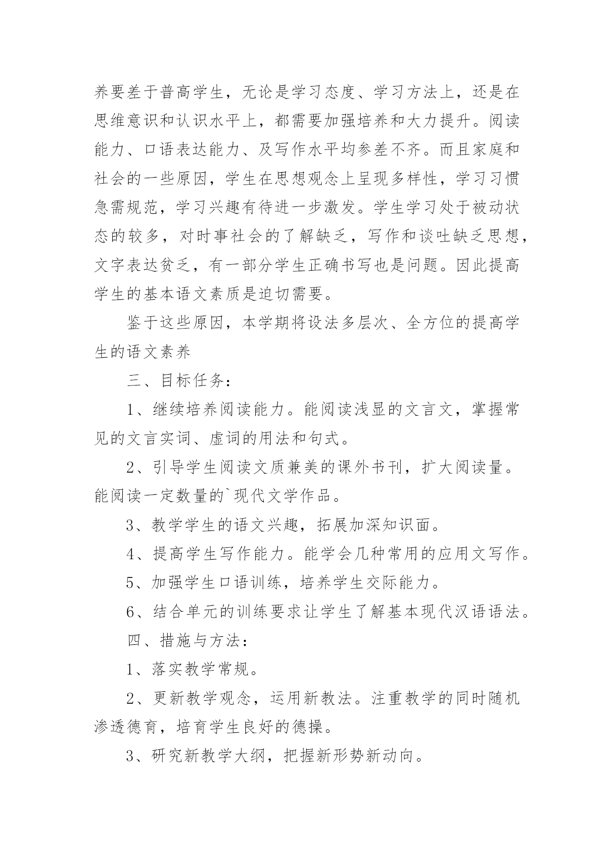 职高语文学科教学计划职高语文学科教学计划时间就如同白驹过隙般的流逝,我们的工作又进入新的阶段,为了在工作中有更好的成长,让我们对今后的工作做个计划吧。计划怎么写才能发挥它最大的作用呢?以下是小编为大家整理的职高语文学科教学计划,欢迎阅读,希望大家能够喜欢。职高语文学科教学计划1为了顺利完成本学期的语文教学任务,根据学生情况、使用的教材、本学期的教学时间等,特制定本学期的语文教学工作计划如下:一、情况分析:(一)学生基本情况分析:从整体来看,部分学生身上好的习惯(课堂听讲,记笔记,发言提问)正在逐步养成,语文的综合能力也在原来的基础上有了较大的提高,但仍有不少学生的学习兴趣和学习态度没有明显的转变。(二)教材分析:一年级教材仍为基础模块,共有八个单元。文学体裁呈现多元化,如三单元的戏剧,四单元的外国诗文,五单元的科技小品。故针对此,上课形式可以灵活化。二、教学目标:知识与能力目标:了解描写方法和修辞方法和词类的有关知识,熟记课文中出现的生字生词的音形义。能领会词句在语言环境中的含义和作用,理解思想内容和文章的思路,了解基本写法,具有一定的语言感受能力,初步掌握精读略读的方法,培养默读的习惯,提高阅读速度,能用普通话正确流利地朗读课文,背诵基本课文中的一些精彩片段,初步具有欣赏文学作品的能力,读文言文课文,要了解内容,背诵一些基本篇目,熟练使用常用字典词典,养成读书看报的习惯。过程与方法目标:初步学会在日常生活中能正确运用语言文字来进行口语交际,把课本中感受学习到的有关人的语文素质的东西灵活运用到生活中,从而提高自己的文化品位,例如待人接物的仪态,为人处事的心理,读书看报看电视的习惯等。情感与价值观目标:在语文教学过程中,进一步培养学生的爱国主义精神,激发学生热爱祖国语言文字的感情,努力开拓学生的视野,注重培养创新精神和创造能力,教学学生的智力,培养学生健康的.审美情趣,提高学生的文化品位。教学健康个性,逐步形成健全人格。三、教学措施:1、认真落实“小组合作学习”的教学形式,认真探索、实践其它新的教学模式。2、从语文学科的特点和社会教学对语文的新要求出发,使学生在潜移默化中,提高思想认识,陶冶道德情操,培养审美情趣,做到既教书又育人。3、语文教学中,要加强综合,简化头绪,突出重点,重视积累、感悟、熏陶和培养语感,致力于语文素养的整体提高。4、重视学生思维能力的教学。指导学生运用比较、分析、归纳等方法,教学他们的观察、记忆、思考、联想和想象的能力,尤其要重视培养学生的创造性思维。5、教学过程应突出学生的实践活动,指导学生主动地获取知识,科学地训练技能,全面提高语文能力。精心备课,尤其要备好学生,突出重点和难点。要提倡灵活多样的教学方式,尤其是启发式和讨论式,鼓励运用探究性的学习方式。6、重视创设语文学习的环境,沟通课本内外、课堂内外、学校内外的联系,拓宽学习渠道,增加学生语文实践的机会。7、作文教学,贴近生活实际,富有生活气息,把握中考方向,多写小作文片段作文,统一安排,尝试互批共批,以改促写,有效提高作文水平。8、优化作业管理,培养学生自主学习、自我管理,加强课代表,小组长的模范带头作用和监督作用,避免欠交作业。作业的布置和批改要有所区别,要因人而异。充分照顾到不同学生的特点。9、利用多种多样的教学形式,开展丰富多彩的读书报告会、演讲会、小辩论,锻炼能力,提高兴趣、培养思维及口头表达和语文知识的运用。四、教学总结及反思教学过程中,做到及时进行“双思”,教师反思教学,学生反思学习,认真写好教学反思,对学生学习中存在的问题做到及时分析并予以矫正,对学生成功的学习方法、独特的见解,及时加以肯定并予以推广。鼓励学生多向思维,开拓创新。让教学总结与反思不断循环,促进教学不断进步。按照学校要求,进行好“三环”“六步”教学模式的实践,做好课堂的定向、内化、教学;认真提供资源、了解学情、弄清疑难、点难拨疑、反思教学、引导实践。努力建立起“适合学生的教育”,让学生在每一节课上都能有所收获。职高语文学科教学计划2一、指导思想:切实贯彻国家教育方针,全面提高学生语文素质,在学生原有的语文水平基础上,通过适应时代和适应学生的教学,使学生巩固和扩展语文基础知识,进一步提高学生正确理解和运用语言文字的能力,重视文化熏陶和培养语感,引导学生端正学习态度、使用正确的学习方法、形成良好的语文学习习惯。,以全面提高学生的语文素质。在教学过程中,注重语文教学生活化,使语文教学贴近生活、贴近学生,使学习与生活息息相关,因人而教,因材施教,从而引发学生对于语文的学习兴趣。同时着重培养学生热爱祖国语言的思想情感,提高道德修养、审美情趣、思维品质和文化品位,发挥语文课的独特作用。二、基本情况分析:本学期所教的学生为一年级87班学生,学生的基本素养要差于普高学生,无论是学习