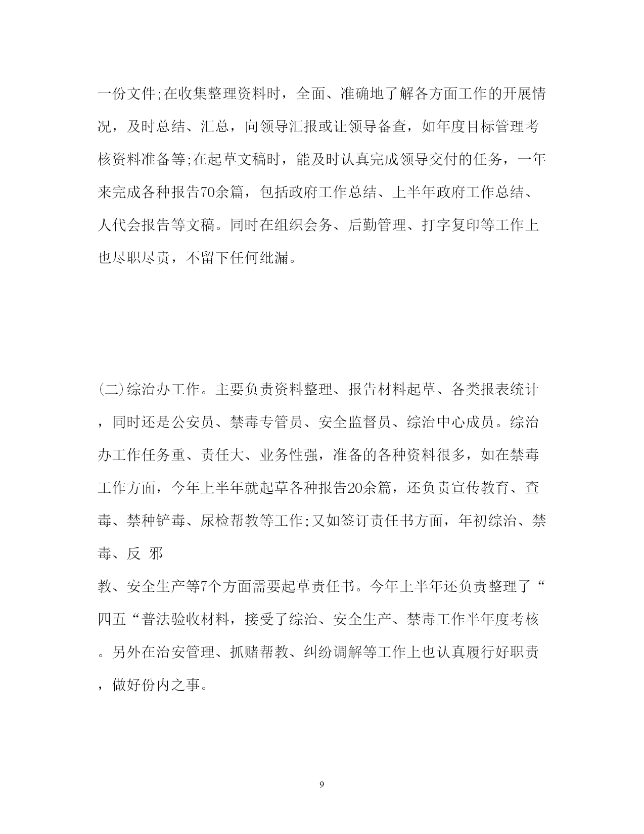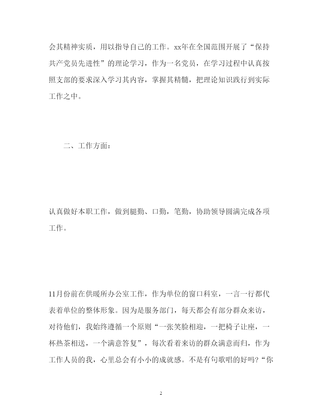此资料由网络收集而来,如有侵权请告知上传者立即删除。资料共分享,我们负责传递知识。PAGEPAGE10公务员年度个人工作总结「」公务员年度个人工作总结「精选」在本年度的工作当中,我始终勤奋学习、积极进取,努力提高自我,始终勤奋工作,认真完成任务,履行好岗位职责,下面是小编搜集整理的公务员年度个人工作总结,欢迎阅读。公务员年度个人工作总结一一、思想方面:重视理论学习,坚定政治信念,积极参加局机关组织的各项活动,能够针对自身工作特点,学习有关文件、报告和辅导材料,通过深刻领会其精神实质,用以指导自己的工作。xx年在全国范围开展了“保持共产党员先进性”的理论学习,作为一名党员,在学习过程中认真按照支部的要求深入学习其内容,掌握其精髓,把理论知识践行到实际工作之中。二、工作方面:认真做好本职工作,做到腿勤、口勤,笔勤,协助领导圆满完成各项工作。11月份前在供暖所办公室工作,作为单位的窗口科室,一言一行都代表着单位的整体形象。因为是服务部门,每天都会有部分群众来访,对待他们,我始终遵循一个原则“一张笑脸相迎,一把椅子让座,一杯热茶相送,一个满意答复”,每次看着来访的群众满意而归,作为工作人员的我,心里总会有小小的成就感。不是有句歌唱的好吗?“你快乐所以我快乐”,小我之后要成就大我,“群众满意”,我们的价值也就得到了体现。同时负责各类总结的撰写,收集信息,及时了解单位发生的事情,及时向领导汇报,努力做好领导的参谋助手。11月份借调到政工科,主要负责党务这块工作,记得刚踏进这间屋子的时候,感觉挺微妙的,不绝于耳的键盘声,每个人埋头工作的热情,深深的感染着我,心里暗暗的给自己鼓劲加油。工作角色的转变,使自己意识到工作水平较其他的同志差距离还很大,为了缩短差距,自己定指标下任务,坚持()每天学习,紧紧围绕本职工作的特点,努力做到融汇贯通,现具体工作主要包括党务方面的收发文、撰写党务文章、掌握全委党员、入党积极分子、转正党员基本情况,以及党务其他方面的工作。在实际工作中,把理论和实践相结合起来,把工作和创新结合起来,拓宽思路,努力适应新形势下对本职工作的要求,通过近段时间的学习,理论水平有了明显的提高,工作逐步走向正轨,这两个月共上报下发各类总结、通知11份。同时来到这个新集体,总的感觉“团结,友爱,互助”是这个科室最大的特点,作为新同志的我,每天都会有这样那样的不懂,每名同志都会用心热情的“知无不言,言无不尽”,在这样的一个大集体中工作,我会更加倍努力工作,也许会有一些的辛苦,但人不常说吗?辛苦是一种磨炼,何况是我们大家一起同甘共苦,在辛苦中,才会锻炼自己的能力;在辛苦中,才会充实的体现着自己人生。三、存在不足一是政治理论学习不够,虽有一定的进步,但在深度和广度上还需继续下功夫。二是工作中不够大胆,创新理论不强。为了把xx年工作做的更出色,制定工作学习目标,加强个人修养、理论学习,以此提高工作水平,并适应新形势下本职工作的要求,扬长避短,以饱满的精神状态来迎接新的挑战。取长补短,向其他同志相互交流好的工作经验,争取xx年的工作更上一个新台阶。公务员年度个人工作总结二在本年度的工作当中,我始终勤奋学习、积极进取,努力提高自我,始终勤奋工作,认真完成任务,履行好岗位职责,较好的完成了各项工作任务。现将本年度工作情况总结汇报如下:一、严于律己,自觉加强党性锻炼,政治思想觉悟得到提高。一年来,始终坚持运用马克思列宁主义的立场、观点和方法论,坚持正确的世界观、人生观、价值观,并用以指导自己的学习、工作和生活实践。热爱祖国、热爱党、热爱社会主义,坚定共产主义信念,与党组织保持高度一致。认真贯彻执行党的路线、方针、政策,工作积极主动,勤奋努力,不畏艰难,尽职尽责,任劳任怨,在平凡的工作岗位上作出力所能及的贡献。二、强化理论和业务学习,不断提高自身综合素质。作为一名刚踏入社会的大学毕业生,我清醒地看到人生舞台已发生转变,自己又缺乏工作经验,所以只有不断加强学习,积累充实自我,才能锻炼好为人民服务的本领。这一年来,始终坚持一边工作一边学习,不断提高了自身综合素质水平。一是认真学习党的十八大精神,深刻领会其科学内涵。尤其是保持共产党员先进性教育活动中,认真系统地学习了党的基本知识和各种理论著作,进一步夯实了理论基础,提高了党性认识和思想道德素质。二是认真学习业务知识,始终保持虚心好学的态度对待业务知识的学习。一年来,在指导老师的带领下,走村入户,参加村民代表会议、座谈会等各种会议,到生产、建筑实地考察,学习了许多农村工作方法,更是直接与群众直接接触,真正做到深入到群众中去。平时,多看、多问、多想,主动向领导、向群众请教问题