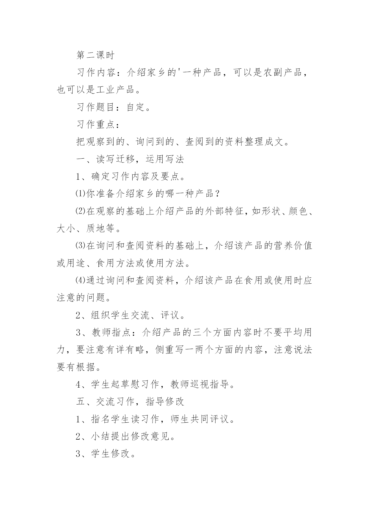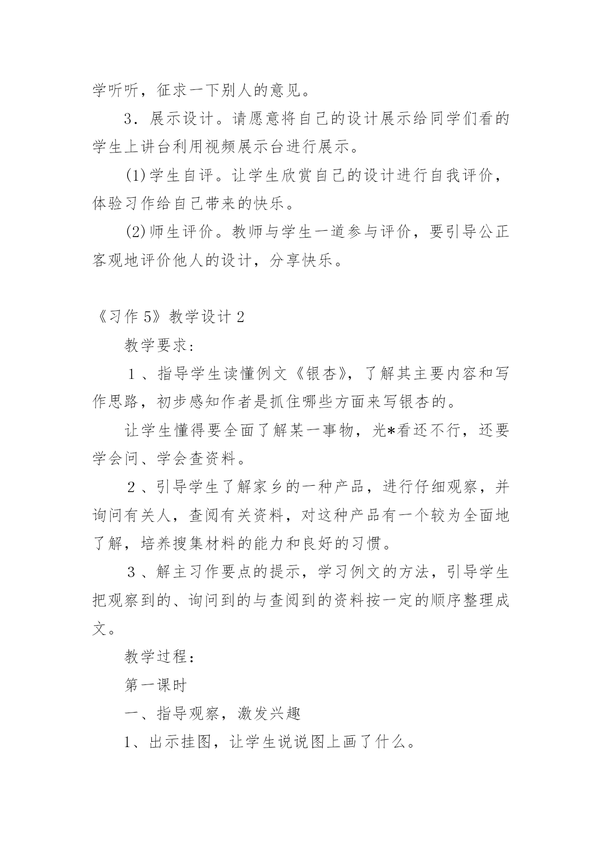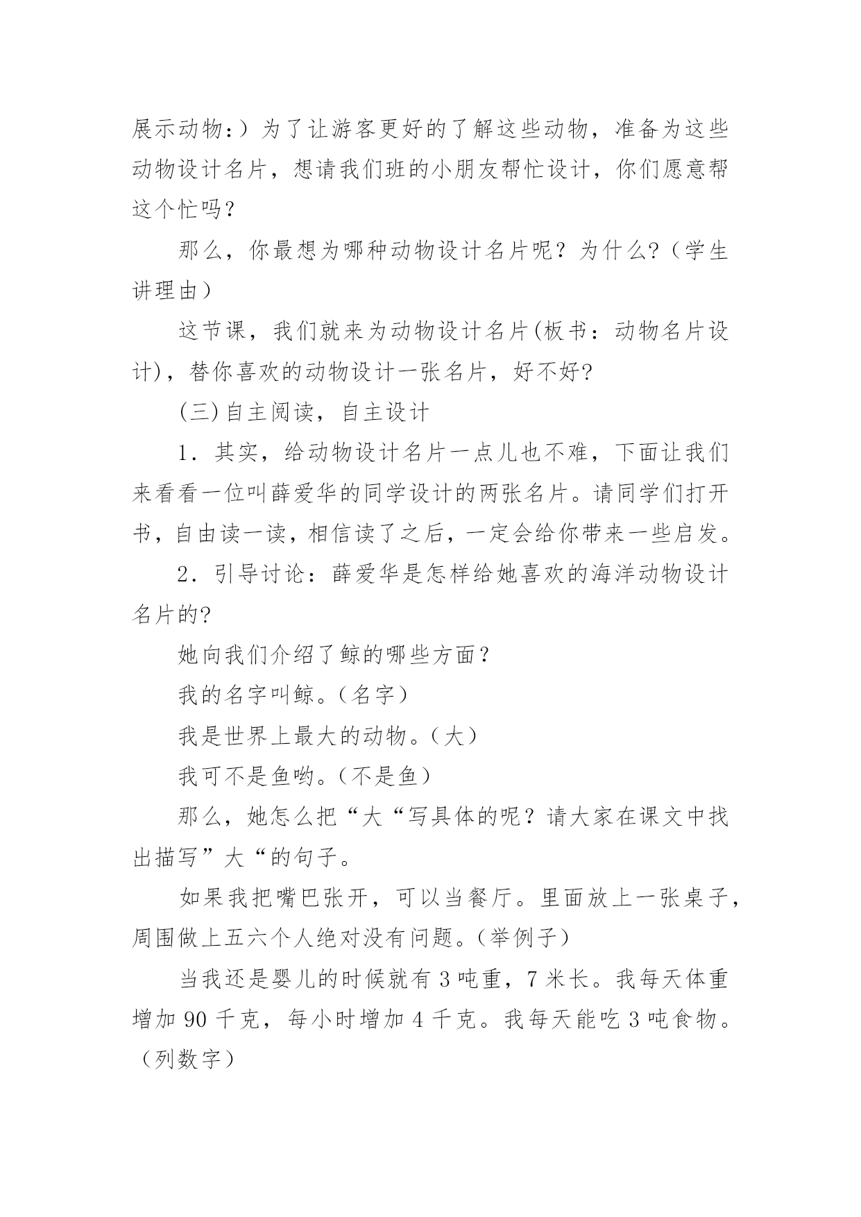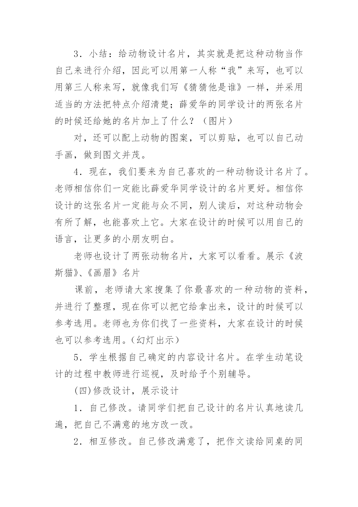 《习作5》教学设计作为一位兢兢业业的人民教师,编写教学设计是必不可少的,借助教学设计可以更好地组织教学活动。那要怎么写好教学设计呢?下面是小编帮大家整理的《习作5》教学设计,欢迎阅读与收藏。《习作5》教学设计1一、课前准备搜集喜欢的一种动物的相关资料,并进行整理。二、教学流程及设计意图(一)猜谜导入,激情引趣1.同学们,你们喜欢猜谜吗?我们一起来猜几个谜语,好吗?(用幻灯出示谜面)(1)头戴翡翠花帽,身穿锦绣缎袍,常把扇子展开,夸耀自己美貌。(出示孔雀图片)(2)黑毛黑,白毛白,圆圆胖胖惹人爱,攀得高,爬得快,嫩竹野果当饭菜。(熊猫)2.请同学们小声读一读,边读边想,看看谜底分别是什么。3.同学们真聪明,很快就把谜底给猜出来了。看来,同学们对动物很感兴趣,一定很喜欢它们,是不是这样的?(二)创设情境,诱发动机最近,海南东山野生动物园要引进一批动物,(用幻灯展示动物:)为了让游客更好的了解这些动物,准备为这些动物设计名片,想请我们班的小朋友帮忙设计,你们愿意帮这个忙吗?那么,你最想为哪种动物设计名片呢?为什么?(学生讲理由)这节课,我们就来为动物设计名片(板书:动物名片设计),替你喜欢的动物设计一张名片,好不好?(三)自主阅读,自主设计1.其实,给动物设计名片一点儿也不难,下面让我们来看看一位叫薛爱华的同学设计的两张名片。请同学们打开书,自由读一读,相信读了之后,一定会给你带来一些启发。2.引导讨论:薛爱华是怎样给她喜欢的海洋动物设计名片的?她向我们介绍了鲸的哪些方面?我的名字叫鲸。(名字)我是世界上最大的动物。(大)我可不是鱼哟。(不是鱼)那么,她怎么把“大“写具体的呢?请大家在课文中找出描写”大“的句子。如果我把嘴巴张开,可以当餐厅。里面放上一张桌子,周围做上五六个人绝对没有问题。(举例子)当我还是婴儿的时候就有3吨重,7米长。我每天体重增加90千克,每小时增加4千克。我每天能吃3吨食物。(列数字)3.小结:给动物设计名片,其实就是把这种动物当作自己来进行介绍,因此可以用第一人称“我”来写,也可以用第三人称来写,就像我们写《猜猜他是谁》一样,并采用适当的方法把特点介绍清楚;薛爱华的同学设计的两张名片的时候还给她的名片加上了什么?(图片)对,还可以配上动物的图案,可以剪贴,也可以自己动手画,做到图文并茂。4.现在,我们要来为自己喜欢的一种动物设计名片了。老师相信你们一定能比薛爱华同学设计的名片更好。相信你设计的这张名片一定能与众不同,别人读后,对这种动物会有所了解,也能喜欢上它。大家在设计的时候可以用自己的语言,让更多的小朋友明白。老师也设计了两张动物名片,大家可以看看。展示《波斯猫》、《画眉》名片课前,老师请大家搜集了你最喜欢的一种动物的资料,并进行了整理,现在你可以把它给拿出来,设计的时候可以参考选用。老师也为你们找了一些资料,大家在设计的时候也可以参考选用。(幻灯出示)5.学生根据自己确定的内容设计名片。在学生动笔设计的过程中教师进行巡视,及时给予个别辅导。(四)修改设计,展示设计1.自己修改。请同学们把自己设计的名片认真地读几遍,把自己不满意的地方改一改。2.相互修改。自己修改满意了,把作文读给同桌的同学听听,征求一下别人的意见。3.展示设计。请愿意将自己的设计展示给同学们看的学生上讲台利用视频展示台进行展示。(1)学生自评。让学生欣赏自己的设计进行自我评价,体验习作给自己带来的快乐。(2)师生评价。教师与学生一道参与评价,要引导公正客观地评价他人的设计,分享快乐。《习作5》教学设计2教学要求:1、指导学生读懂例文《银杏》,了解其主要内容和写作思路,初步感知作者是抓住哪些方面来写银杏的。让学生懂得要全面了解某一事物,光*看还不行,还要学会问、学会查资料。2、引导学生了解家乡的一种产品,进行仔细观察,并询问有关人,查阅有关资料,对这种产品有一个较为全面地了解,培养搜集材料的能力和良好的习惯。3、解主习作要点的提示,学习例文的方法,引导学生把观察到的、询问到的与查阅到的资料按一定的顺序整理成文。教学过程:第一课时一、指导观察,激发兴趣1、出示挂图,让学生说说图上画了什么。2、谈话:刚才同学们观察了这幅画,说了自己观察到的内容,如果我们就这样写下去,不仅显得零乱,而且也不够形象、逼真。沈平平同学根据金老师的要求写了这棵银杏,写得很好,下面我们就来向她学习,看看她是怎么写的。二、初读例文,感知内容1、学生自由轻读例文,思考:这篇例文先写了什么,后写了什么?用“—”画出来。2、讨论交流。3、小结:这篇例文先写了银杏的枝干、叶、花、果的特点,再写银杏的价值,最后写出人们为什么称银杏为“活化石”。三、再读例文,讨论写法1、学生自读,思考:沈平平是如何一步一步地按照金老师的要求完成《银杏》这篇习作的。2、交流讨论。小结:⑴在仔细观