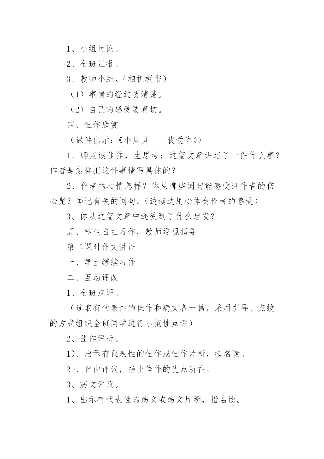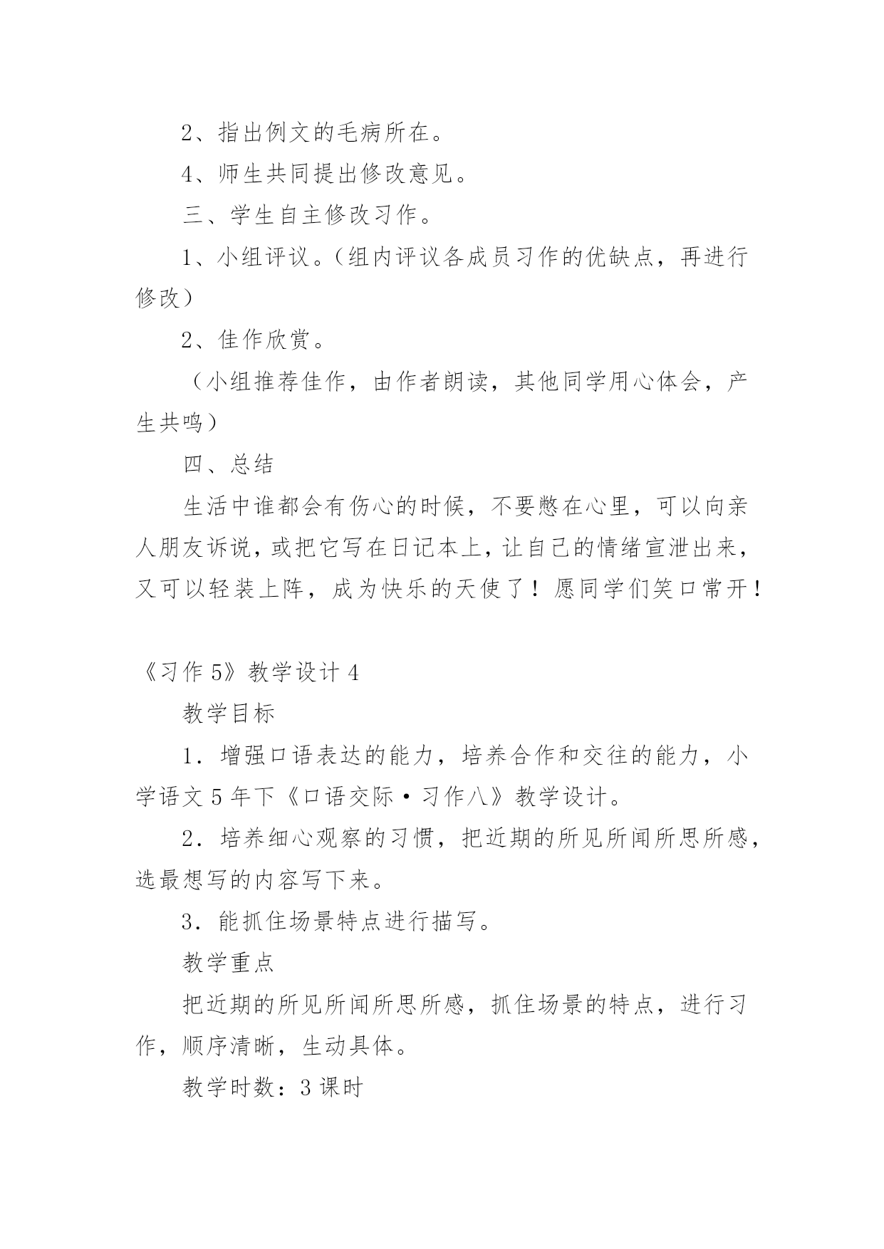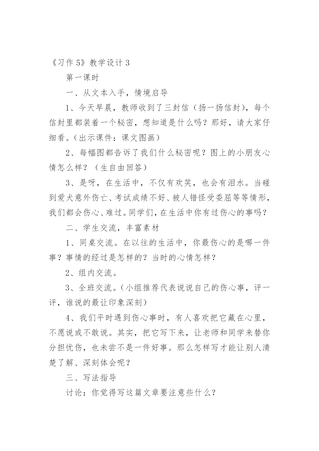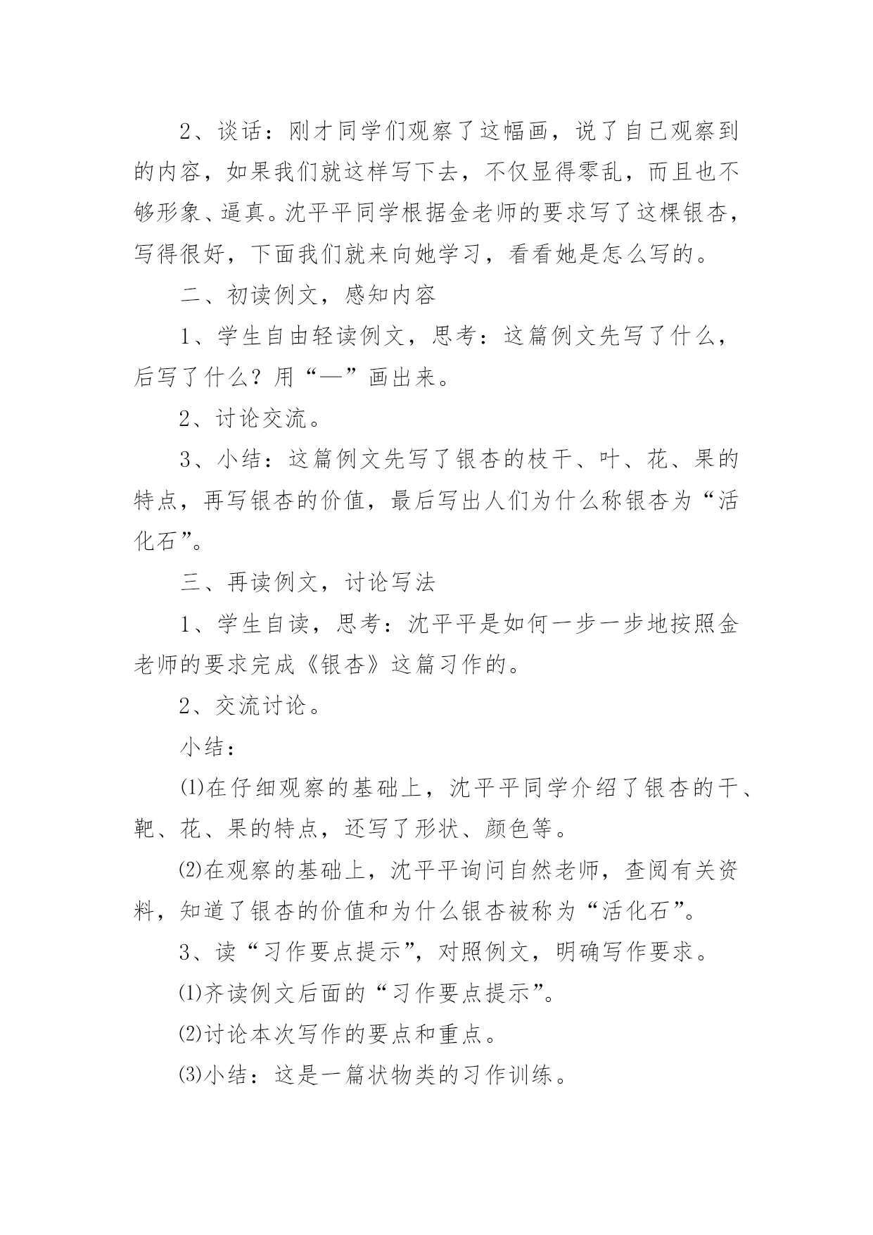 《习作5》教学设计作为一位兢兢业业的人民教师,编写教学设计是必不可少的,借助教学设计可以更好地组织教学活动。那要怎么写好教学设计呢?下面是小编帮大家整理的《习作5》教学设计,欢迎阅读与收藏。《习作5》教学设计1一、课前准备搜集喜欢的一种动物的相关资料,并进行整理。二、教学流程及设计意图(一)猜谜导入,激情引趣1.同学们,你们喜欢猜谜吗?我们一起来猜几个谜语,好吗?(用幻灯出示谜面)(1)头戴翡翠花帽,身穿锦绣缎袍,常把扇子展开,夸耀自己美貌。(出示孔雀图片)(2)黑毛黑,白毛白,圆圆胖胖惹人爱,攀得高,爬得快,嫩竹野果当饭菜。(熊猫)2.请同学们小声读一读,边读边想,看看谜底分别是什么。3.同学们真聪明,很快就把谜底给猜出来了。看来,同学们对动物很感兴趣,一定很喜欢它们,是不是这样的?(二)创设情境,诱发动机最近,海南东山野生动物园要引进一批动物,(用幻灯展示动物:)为了让游客更好的了解这些动物,准备为这些动物设计名片,想请我们班的小朋友帮忙设计,你们愿意帮这个忙吗?那么,你最想为哪种动物设计名片呢?为什么?(学生讲理由)这节课,我们就来为动物设计名片(板书:动物名片设计),替你喜欢的动物设计一张名片,好不好?(三)自主阅读,自主设计1.其实,给动物设计名片一点儿也不难,下面让我们来看看一位叫薛爱华的同学设计的两张名片。请同学们打开书,自由读一读,相信读了之后,一定会给你带来一些启发。2.引导讨论:薛爱华是怎样给她喜欢的海洋动物设计名片的?她向我们介绍了鲸的哪些方面?我的名字叫鲸。(名字)我是世界上最大的动物。(大)我可不是鱼哟。(不是鱼)那么,她怎么把“大“写具体的呢?请大家在课文中找出描写”大“的句子。如果我把嘴巴张开,可以当餐厅。里面放上一张桌子,周围做上五六个人绝对没有问题。(举例子)当我还是婴儿的时候就有3吨重,7米长。我每天体重增加90千克,每小时增加4千克。我每天能吃3吨食物。(列数字)3.小结:给动物设计名片,其实就是把这种动物当作自己来进行介绍,因此可以用第一人称“我”来写,也可以用第三人称来写,就像我们写《猜猜他是谁》一样,并采用适当的方法把特点介绍清楚;薛爱华的同学设计的两张名片的时候还给她的名片加上了什么?(图片)对,还可以配上动物的图案,可以剪贴,也可以自己动手画,做到图文并茂。4.现在,我们要来为自己喜欢的一种动物设计名片了。老师相信你们一定能比薛爱华同学设计的名片更好。相信你设计的这张名片一定能与众不同,别人读后,对这种动物会有所了解,也能喜欢上它。大家在设计的时候可以用自己的语言,让更多的小朋友明白。老师也设计了两张动物名片,大家可以看看。展示《波斯猫》、《画眉》名片课前,老师请大家搜集了你最喜欢的一种动物的资料,并进行了整理,现在你可以把它给拿出来,设计的时候可以参考选用。老师也为你们找了一些资料,大家在设计的时候也可以参考选用。(幻灯出示)5.学生根据自己确定的内容设计名片。在学生动笔设计的过程中教师进行巡视,及时给予个别辅导。(四)修改设计,展示设计1.自己修改。请同学们把自己设计的名片认真地读几遍,把自己不满意的地方改一改。2.相互修改。自己修改满意了,把作文读给同桌的同学听听,征求一下别人的意见。3.展示设计。请愿意将自己的设计展示给同学们看的学生上讲台利用视频展示台进行展示。(1)学生自评。让学生欣赏自己的设计进行自我评价,体验习作给自己带来的快乐。(2)师生评价。教师与学生一道参与评价,要引导公正客观地评价他人的设计,分享快乐。《习作5》教学设计2教学要求:1、指导学生读懂例文《银杏》,了解其主要内容和写作思路,初步感知作者是抓住哪些方面来写银杏的。让学生懂得要全面了解某一事物,光*看还不行,还要学会问、学会查资料。2、引导学生了解家乡的一种产品,进行仔细观察,并询问有关人,查阅有关资料,对这种产品有一个较为全面地了解,培养搜集材料的能力和良好的习惯。3、解主习作要点的提示,学习例文的方法,引导学生把观察到的、询问到的与查阅到的资料按一定的顺序整理成文。教学过程:第一课时一、指导观察,激发兴趣1、出示挂图,让学生说说图上画了什么。2、谈话:刚才同学们观察了这幅画,说了自己观察到的内容,如果我们就这样写下去,不仅显得零乱,而且也不够形象、逼真。沈平平同学根据金老师的要求写了这棵银杏,写得很好,下面我们就来向她学习,看看她是怎么写的。二、初读例文,感知内容1、学生自由轻读例文,思考:这篇例文先写了什么,后写了什么?用“—”画出来。2、讨论交流。3、小结:这篇例文先写了银杏的枝干、叶、花、果的特点,再写银杏的价值,最后写出人们为什么称银杏为“活化石”。三、再读例文,讨论写法1、学生自读,思考:沈平平是如何一步一步地按照金老师的要求完成《银杏》这篇习作的。2、交流讨论。小结:⑴在仔细观