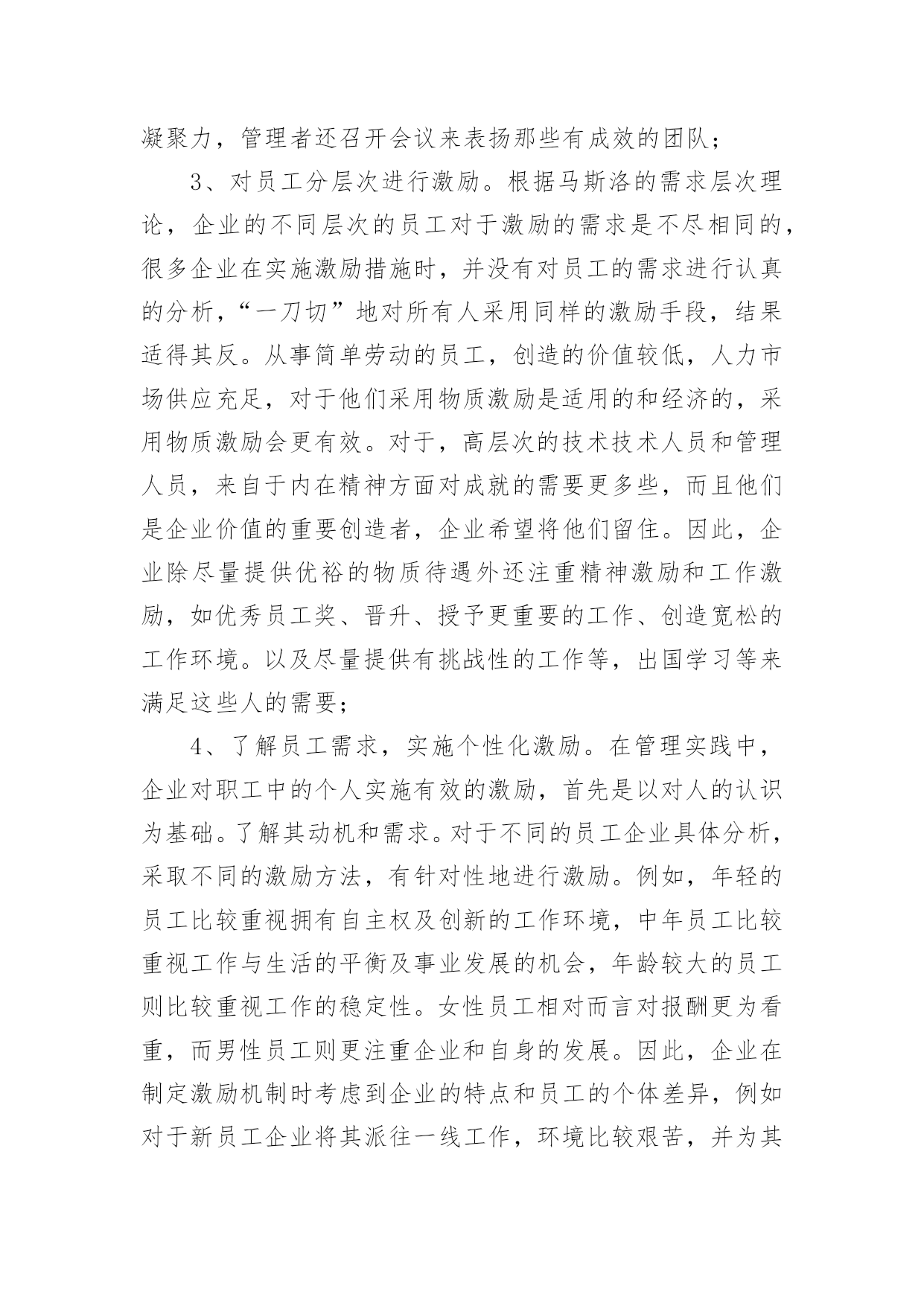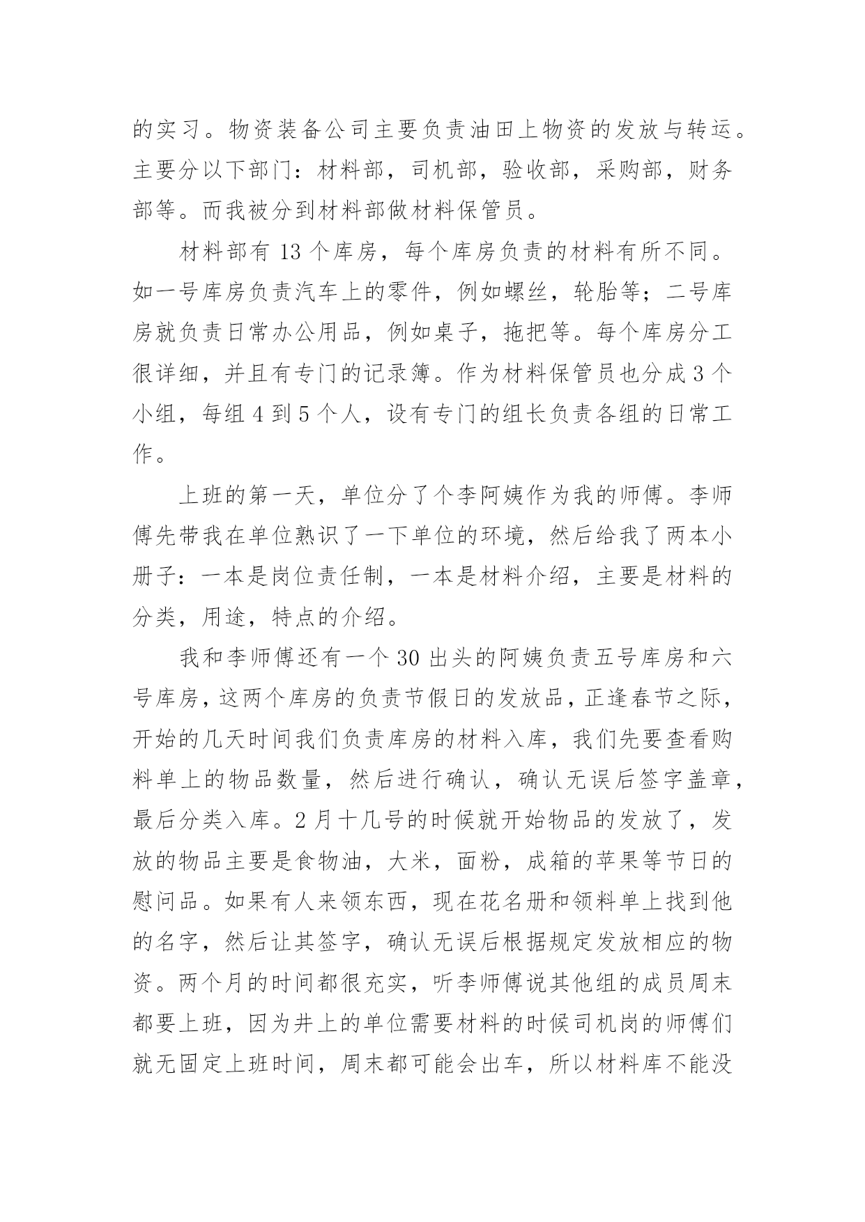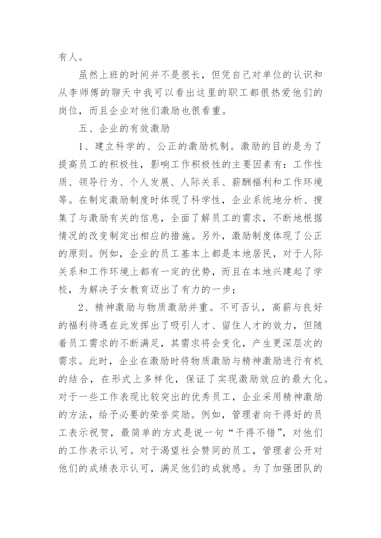 工商管理专业实习报告工商管理专业实习报告(15篇)在经济飞速发展的今天,报告的适用范围越来越广泛,我们在写报告的时候要避免篇幅过长。我敢肯定,大部分人都对写报告很是头疼的,下面是小编整理的工商管理专业实习报告,仅供参考,希望能够帮助到大家。工商管理专业实习报告1一、实习目的1、深入地了解国企的运营环境,并且将学到的知识应用于实际工作中;2、在实践中掌握自己的不足,测试自己的能力,进而更好地提高自我;3、结合理论与实际,更好的完成毕业论文。二、实习岗位材料保管员三、xx公司背景xx位于柴达木盆地西北缘,被xx、xx、xx所环抱。xx勘探从1954年开始,截止20xx年底,xx累计发现地面构造140个,找到不同圈闭、多种储集类型油气田22个,其中油田16个,气田6个。四、实习过程20xx年2,3月,我在xx物资装备公进行了为期两个月的实习。物资装备公司主要负责油田上物资的发放与转运。主要分以下部门:材料部,司机部,验收部,采购部,财务部等。而我被分到材料部做材料保管员。材料部有13个库房,每个库房负责的材料有所不同。如一号库房负责汽车上的零件,例如螺丝,轮胎等;二号库房就负责日常办公用品,例如桌子,拖把等。每个库房分工很详细,并且有专门的记录簿。作为材料保管员也分成3个小组,每组4到5个人,设有专门的组长负责各组的日常工作。上班的第一天,单位分了个李阿姨作为我的师傅。李师傅先带我在单位熟识了一下单位的环境,然后给我了两本小册子:一本是岗位责任制,一本是材料介绍,主要是材料的分类,用途,特点的介绍。我和李师傅还有一个30出头的阿姨负责五号库房和六号库房,这两个库房的负责节假日的发放品,正逢春节之际,开始的几天时间我们负责库房的材料入库,我们先要查看购料单上的物品数量,然后进行确认,确认无误后签字盖章,最后分类入库。2月十几号的时候就开始物品的发放了,发放的物品主要是食物油,大米,面粉,成箱的苹果等节日的慰问品。如果有人来领东西,现在花名册和领料单上找到他的名字,然后让其签字,确认无误后根据规定发放相应的物资。两个月的时间都很充实,听李师傅说其他组的成员周末都要上班,因为井上的单位需要材料的时候司机岗的师傅们就无固定上班时间,周末都可能会出车,所以材料库不能没有人。虽然上班的时间并不是很长,但凭自己对单位的认识和从李师傅的聊天中我可以看出这里的职工都很热爱他们的岗位,而且企业对他们激励也很看重。五、企业的有效激励1、建立科学的、公正的激励机制。激励的目的是为了提高员工的积极性,影响工作积极性的主要因素有:工作性质、领导行为、个人发展、人际关系、薪酬福利和工作环境等。在制定激励制度时体现了科学性,企业系统地分析、搜集了与激励有关的信息,全面了解员工的需求,不断地根据情况的改变制定出相应的措施。另外,激励制度体现了公正的原则。例如,企业的员工基本上都是本地居民,对于人际关系和工作环境上都有一定的优势,而且在本地兴建起了学校,为解决子女教育迈出了有力的一步;2、精神激励与物质激励并重。不可否认,高薪与良好的福利待遇在此发挥出了吸引人才、留住人才的效力,但随着员工需求的不断满足,其需求将会变化,产生更深层次的需求。此时,企业在激励时将物质激励与精神激励进行有机的结合,在形式上多样化,保证了实现激励效应的最大化。对于一些工作表现比较突出的优秀员工,企业采用精神激励的方法,给予必要的荣誉奖励。例如,管理者向干得好的员工表示祝贺,最简单的方式是说一句“干得不错”,对他们的工作表示认可。对于渴望社会赞同的员工,管理者公开对他们的成绩表示认可,满足他们的成就感。为了加强团队的凝聚力,管理者还召开会议来表扬那些有成效的团队;3、对员工分层次进行激励。根据马斯洛的需求层次理论,企业的不同层次的员工对于激励的需求是不尽相同的,很多企业在实施激励措施时,并没有对员工的需求进行认真的分析,“一刀切”地对所有人采用同样的激励手段,结果适得其反。从事简单劳动的员工,创造的价值较低,人力市场供应充足,对于他们采用物质激励是适用的和经济的,采用物质激励会更有效。对于,高层次的技术技术人员和管理人员,来自于内在精神方面对成就的需要更多些,而且他们是企业价值的重要创造者,企业希望将他们留住。因此,企业除尽量提供优裕的物质待遇外还注重精神激励和工作激励,如优秀员工奖、晋升、授予更重要的工作、创造宽松的工作环境。以及尽量提供有挑战性的工作等,出国学习等来满足这些人的需要;4、了解员工需求,实施个性化激励。在管理实践中,企业对职工中的个人实施有效的激励,首先是以对人的认识为基础。了解其动机和需求。对于不同的员工企业具体分析,采取不同的激励方法,有针对性地进行激励。例如,年轻的员工比较重视拥有自主权及创新的工作环境,中年员工比较重视工作与生活的平衡及事业发展的机会,年龄较大的员