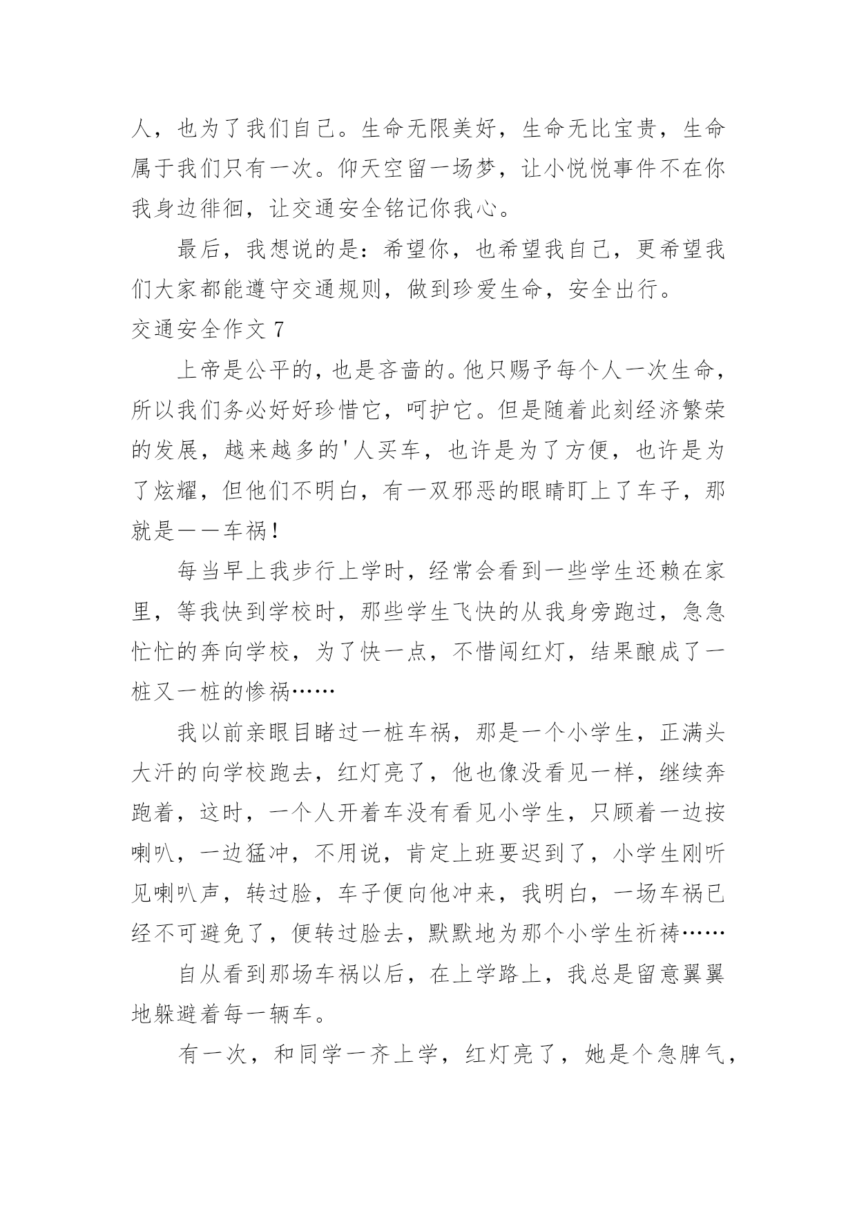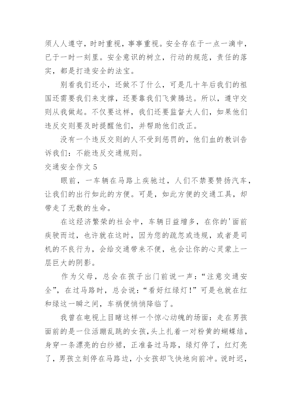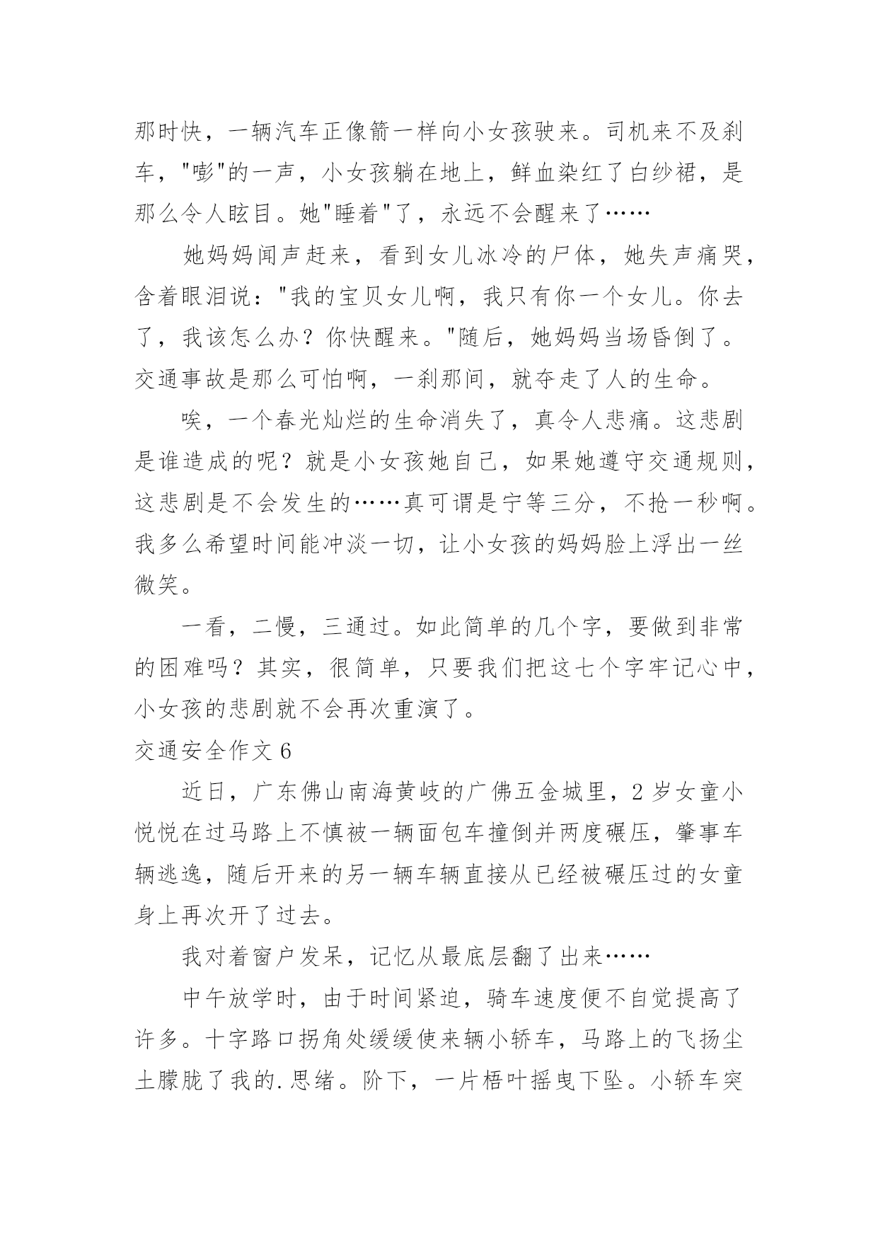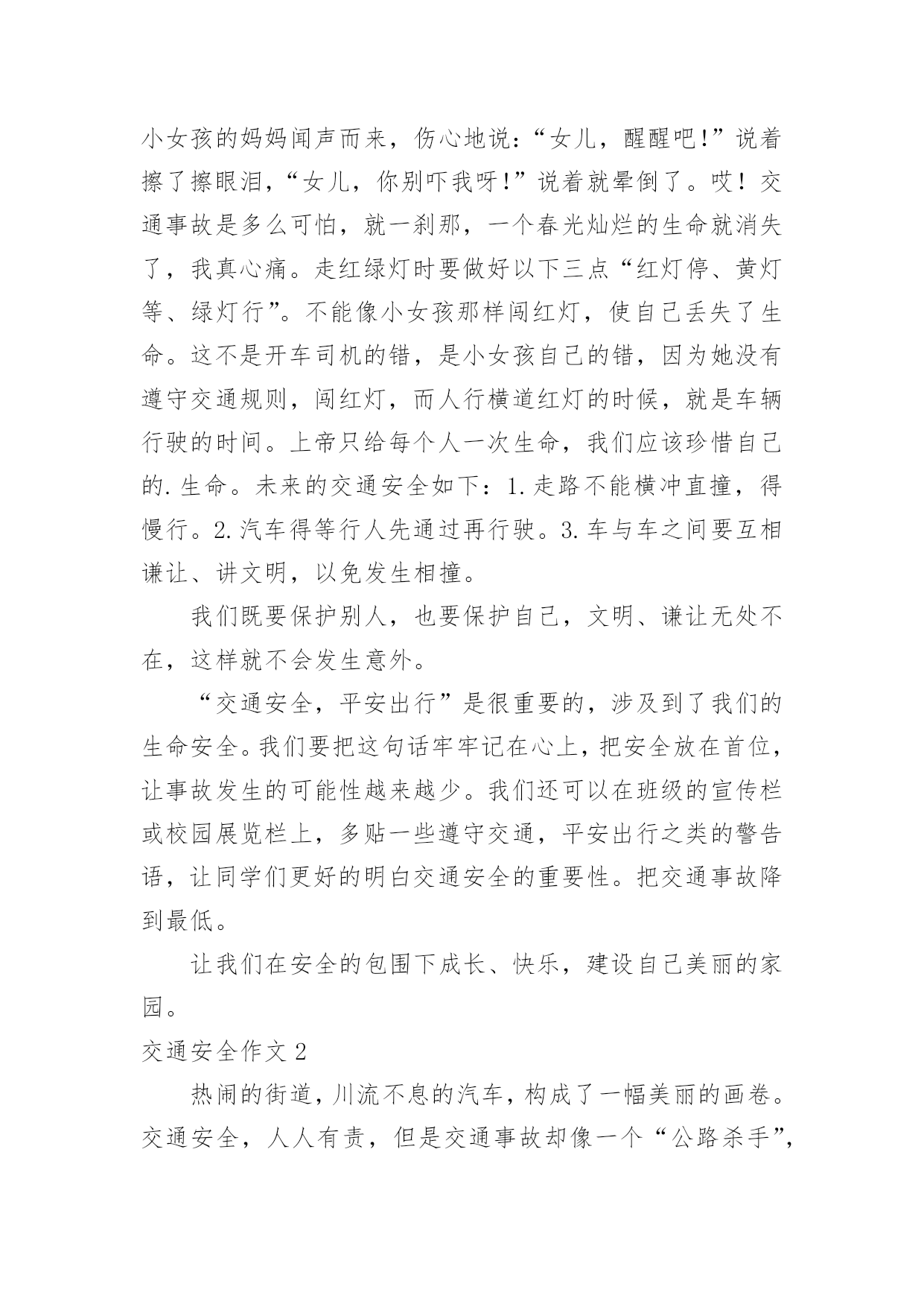 交通安全作文交通安全作文15篇【优秀】在平时的学习、工作或生活中,大家一定都接触过作文吧,借助作文可以提高我们的语言组织能力。那么问题来了,到底应如何写一篇优秀的作文呢?下面是小编帮大家整理的交通安全作文,供大家参考借鉴,希望可以帮助到有需要的朋友。交通安全作文1说到交通安全知识,大家都很熟悉,可是大家没记在心上。随着社会不断的发展,科技发达,汽车成了人们主要的交通工具,它给我们带来了方便、快捷,同时也给我们带来了灾难,一个个活生生的生命消失在车轮之下,让人悲痛万分。所以我们要遵守交通规则。交通事故像一颗威力十足的炸弹,一时不在意,它就会爆炸,让家庭碎裂、让人心痛。最近,我在报纸上看到了惊心动魄的一幕:在男孩的面前是一位美丽、善良的小女孩,她穿着白纱裙,笑容满面。正当绿灯转变成红灯时,男孩立刻止住脚步,想等红灯变成绿灯再行走。而女孩呢?却不知“红灯停,绿灯行”这句话,盲目的擅闯红灯,当她在宽阔的人行横道奔跑时,一辆汽车飞快的驶来,还没等司机来得及刹车,一个鲜活的生命消失了,一切都沉浸于死寂之中,小女孩的妈妈闻声而来,伤心地说:“女儿,醒醒吧!”说着擦了擦眼泪,“女儿,你别吓我呀!”说着就晕倒了。哎!交通事故是多么可怕,就一刹那,一个春光灿烂的生命就消失了,我真心痛。走红绿灯时要做好以下三点“红灯停、黄灯等、绿灯行”。不能像小女孩那样闯红灯,使自己丢失了生命。这不是开车司机的错,是小女孩自己的错,因为她没有遵守交通规则,闯红灯,而人行横道红灯的时候,就是车辆行驶的时间。上帝只给每个人一次生命,我们应该珍惜自己的.生命。未来的交通安全如下:1.走路不能横冲直撞,得慢行。2.汽车得等行人先通过再行驶。3.车与车之间要互相谦让、讲文明,以免发生相撞。我们既要保护别人,也要保护自己,文明、谦让无处不在,这样就不会发生意外。“交通安全,平安出行”是很重要的,涉及到了我们的生命安全。我们要把这句话牢牢记在心上,把安全放在首位,让事故发生的可能性越来越少。我们还可以在班级的宣传栏或校园展览栏上,多贴一些遵守交通,平安出行之类的警告语,让同学们更好的明白交通安全的重要性。把交通事故降到最低。让我们在安全的包围下成长、快乐,建设自己美丽的家园。交通安全作文2热闹的街道,川流不息的汽车,构成了一幅美丽的画卷。交通安全,人人有责,但是交通事故却像一个“公路杀手”,悄悄摸进了我们的生活,打破了我们这个美满而又平静的'生活。三叉路口,一辆红色的小轿车飞驰而来。一个20出头,蛮“靓”的“后生仔”端坐在驾驶室内,一手把着方向盘,一手拿着手机,正谈笑风生地说着什么。红灯亮了,小轿车还一如既往地向前奔着。“公路杀手”摇身一变,一辆载着西瓜的货车稳稳地向轿车驶去。“砰”的一声,一幅惨不忍睹的悲剧发生了。“公路杀手”嘿嘿地冷笑了几声,化作一股黑烟飞身离去。马路边,一幢五层楼房规模初成,一大堆石头,霸占了三分之一的路面。远方,一个不戴头盔又载着两个人的年轻小伙子骑着摩托车疾驰而来。“公路杀手”瞅见了,鬼计又生,它化成一阵狂风,狠狠地对那摩托车使了使劲,终于使它把握不住,一头栽向那个石头堆。殷红的鲜血汩汩流出,一幕人仰马翻的惨剧又发生了。“公路杀手”看着它的杰作,得意地摇了摇身子。不远处,传来了一阵清脆悦耳的歌声。原来是一个十多岁的少年正一边骑着自行车,一边唱着歌谣悠然地来了。瞧,他多快乐呀!一会儿在马路上跳“S”舞,一会儿来个单放手,一会儿又摇头晃脑地东瞅瞅西看看。“公路杀手”觉得这孩子实在太可爱了,决心捉弄他一下,于是“鬼点子”又上来了。它摇身一变,一个满头白发、拄着拐仗的老头儿在路边颤巍巍地走着。少年毫不提防路边猛然冒出个老爷爷,心慌之下,一个急刹车,却又把握不住,连车带人摔倒在地上,歌声瞬间成了呻吟声。朋友们,交通安全和我们息息相关。多少人,因为一时的粗心大意,疏忽了交通安全的重要性,不但车毁人亡,也带给了别人无法弥补的伤害。这些血淋淋、惨不忍睹的车祸,处处可见,造成了多少家庭的悲哀啊!“交通安全,人人有责”,我们一定要时刻警惕“公路杀手”的侵犯,处处注意交通安全,使我们的生活更快乐,更幸福。交通安全作文3随着社会的经济发展水平不断提高,各种汽车也不断的更新生产出来,看看马路上川流不息形形色色的车辆就知道了,如今的车子品种之繁多足以让你看得眼花缭乱目不暇接。因此我们小朋友更应该自觉遵守交通规则,从小培养良好的习惯!爸爸妈妈经常会对我不厌其烦地在我耳边叮咛:过马路一定要走横行道,红灯停,绿灯行等等一些基本的常识,可是生性顽皮的我根本不放在心里,总是右耳进,左耳出,当作耳边风。直到有一天发生了这样一件事情,才让我彻底改变了以往的态度和坏习惯。记得那是一个天气晴朗的星期天,我和妈妈一起去逛天一广场。过马路的时候,我没有听妈妈的阻止,只是兴奋地在马路中间蹦蹦跳跳,早